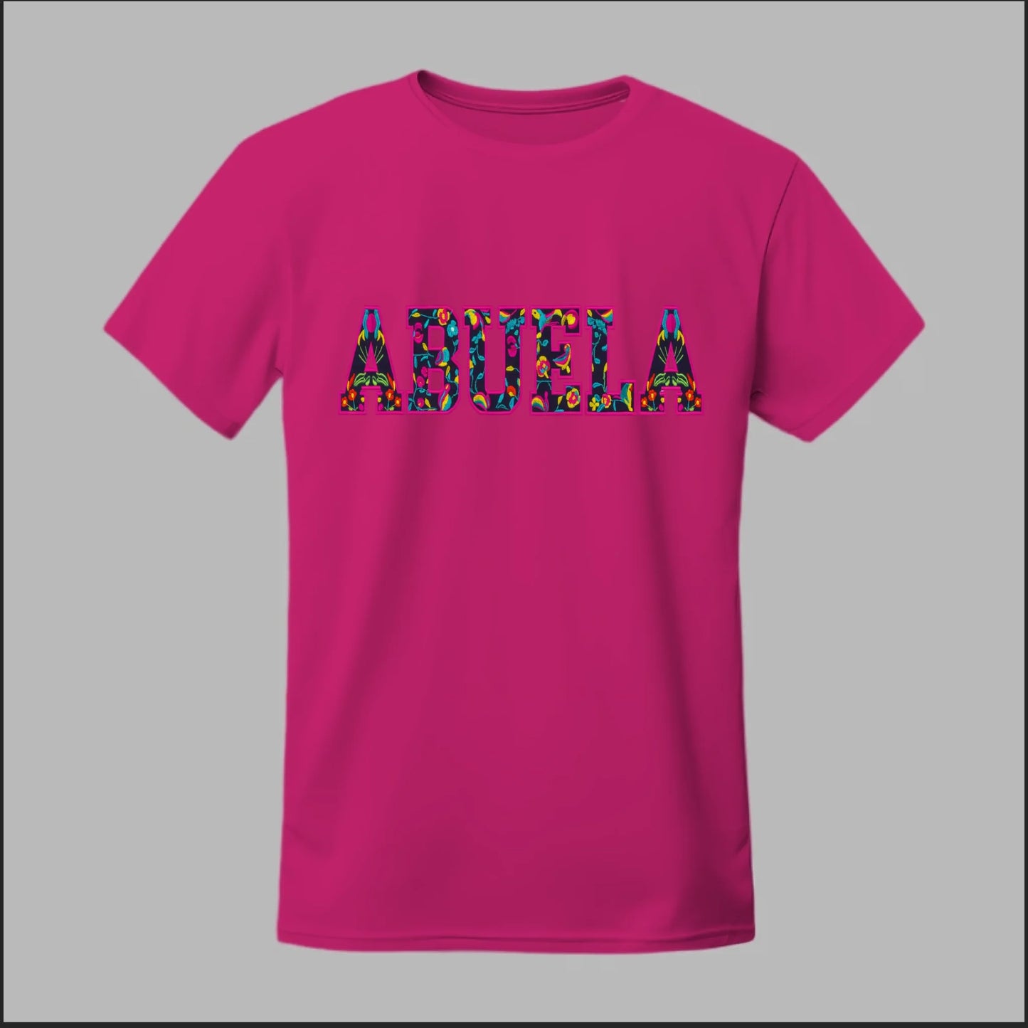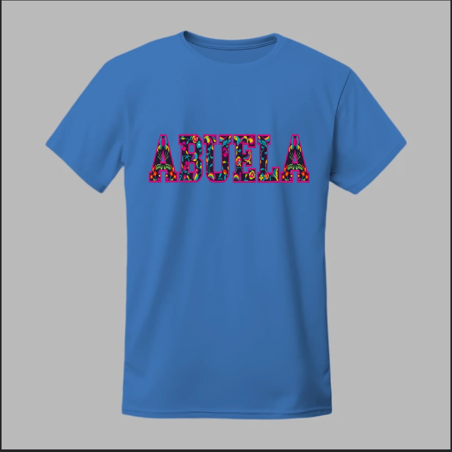 Celebrate your Abuela in style with this vibrant floral design. The bold embroidered-look letters in navy with colorful flowers and birds are outlined in hot pink, making it a standout piece. Perfect for everyday wear, this shirt is a heartfelt way to honor the love and strength of grandmothers everywhere.