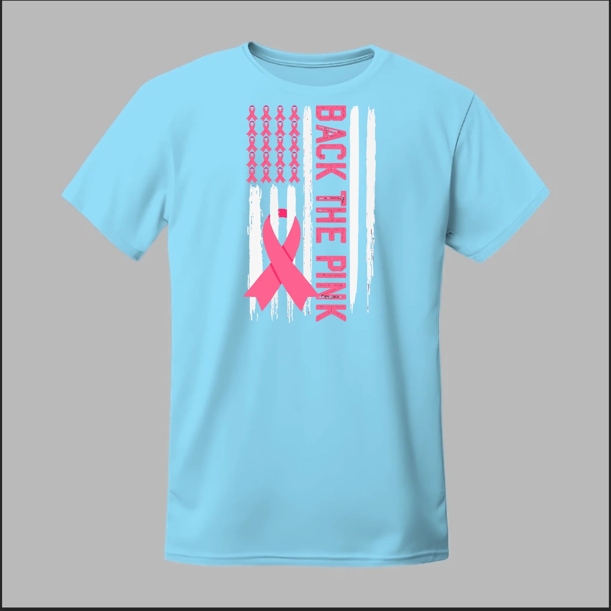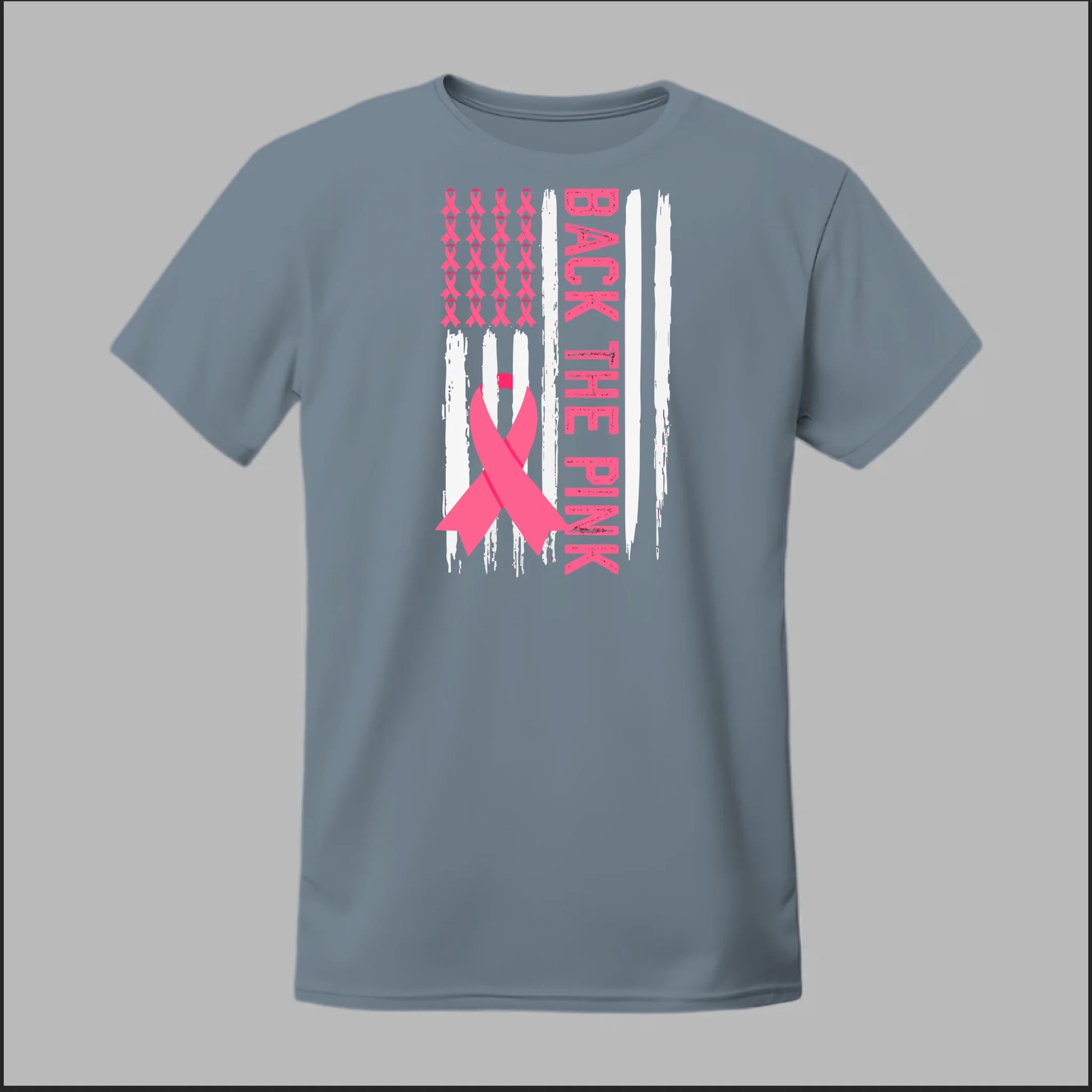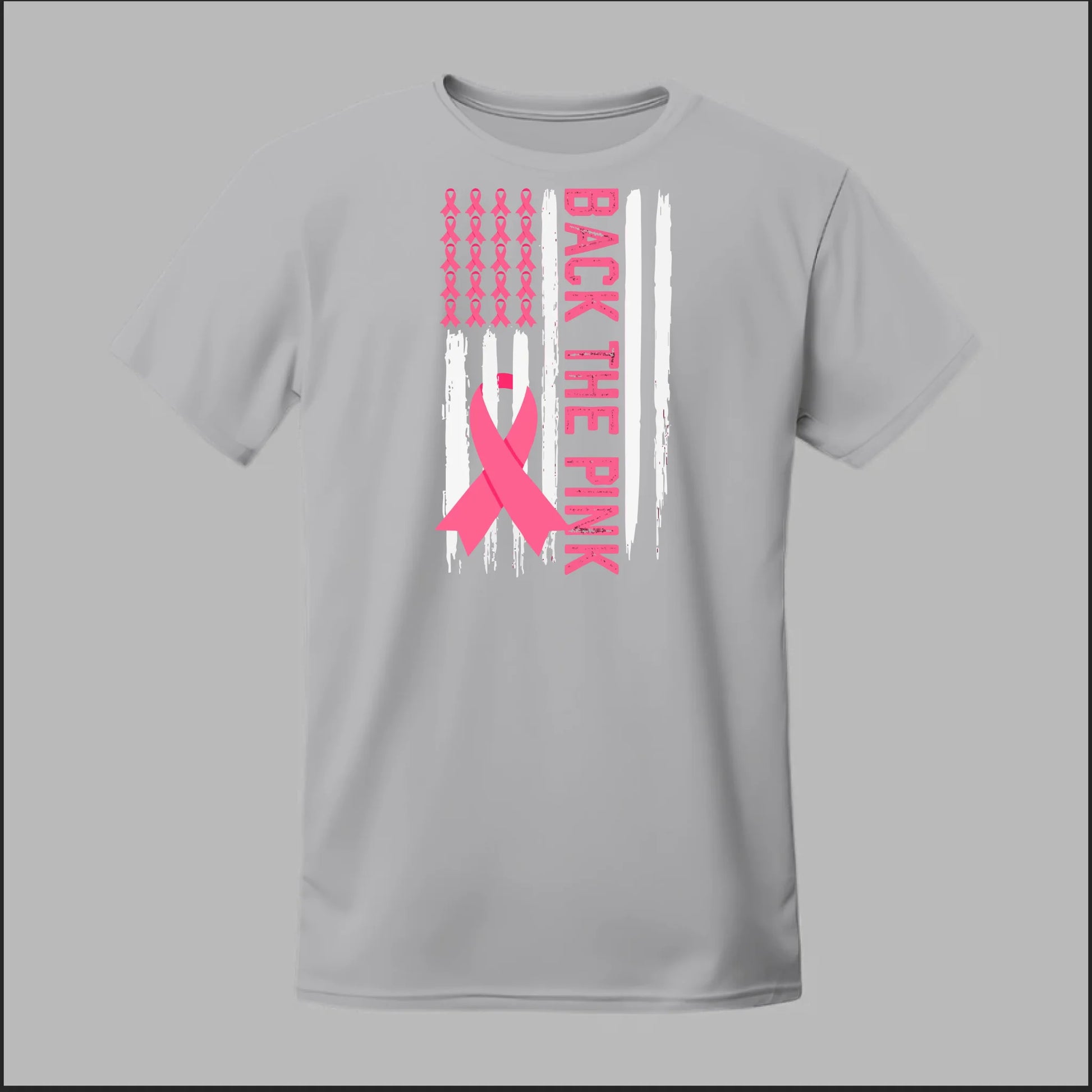 The Back the Pink Flag Tee proudly showcases a bold black-and-white distressed flag design accented with powerful pink awareness ribbons. With "Back the Pink" running vertically down the side, this shirt makes a strong statement of solidarity and support for breast cancer awareness. A perfect way to show your commitment to the fight and honor those affected.
