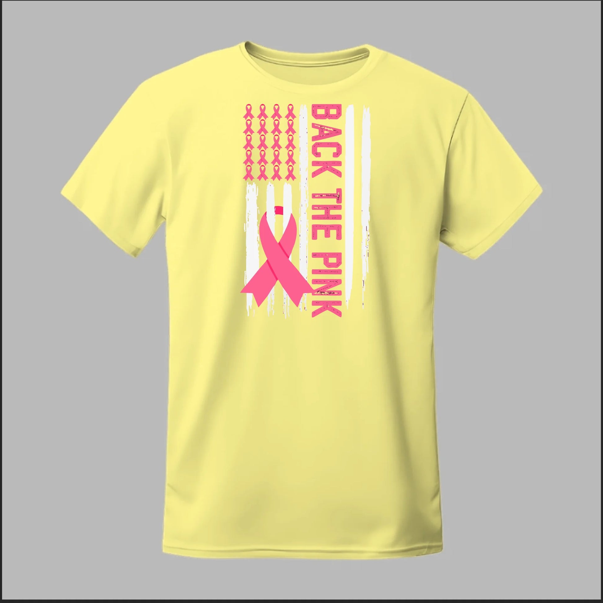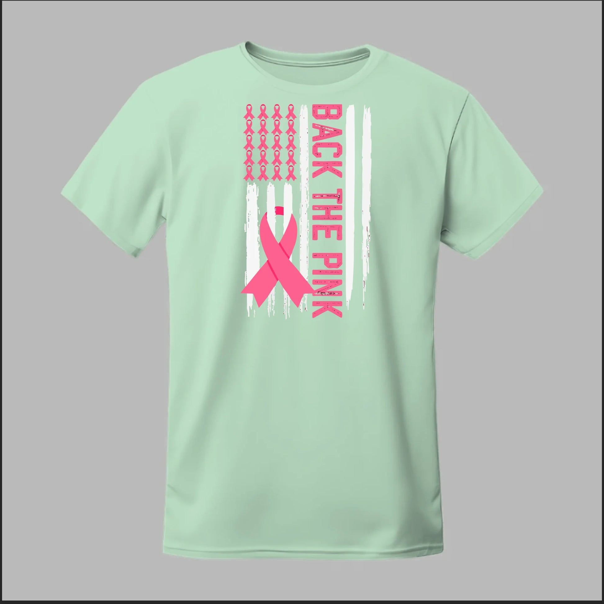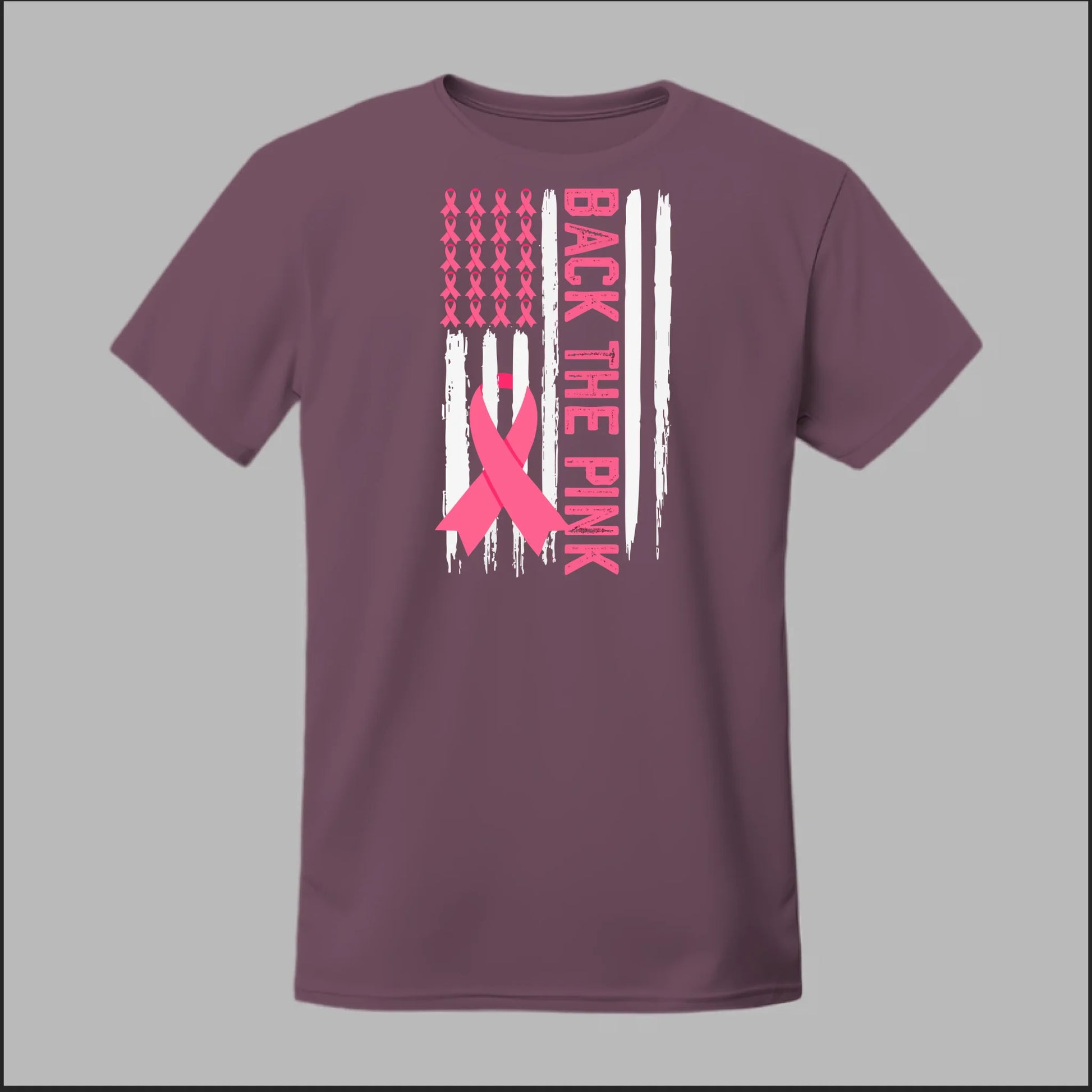The Back the Pink Flag Tee proudly showcases a bold black-and-white distressed flag design accented with powerful pink awareness ribbons. With "Back the Pink" running vertically down the side, this shirt makes a strong statement of solidarity and support for breast cancer awareness. A perfect way to show your commitment to the fight and honor those affected.