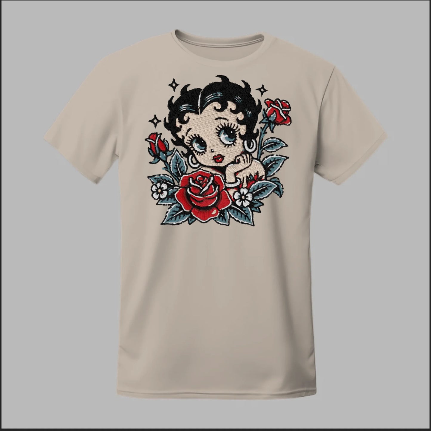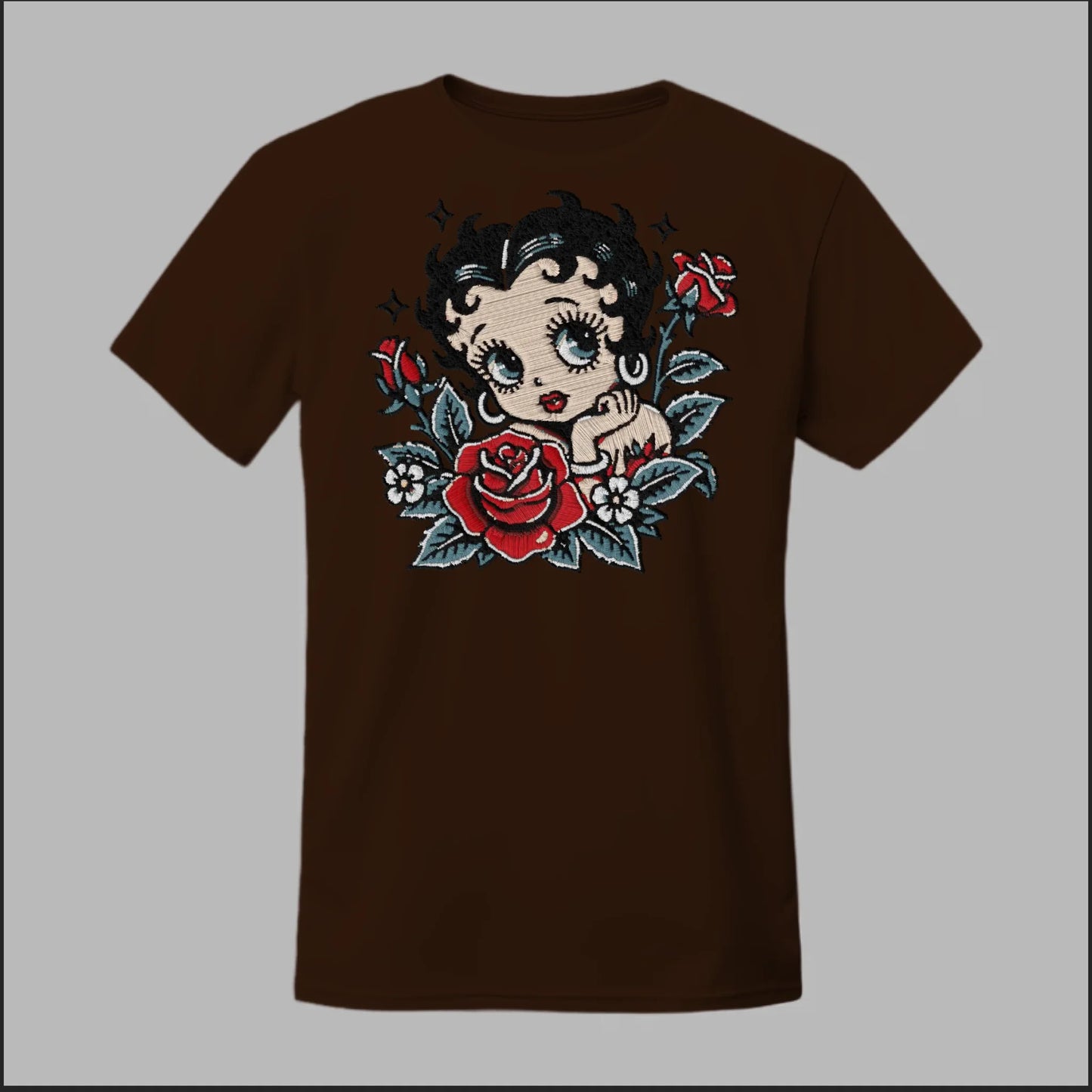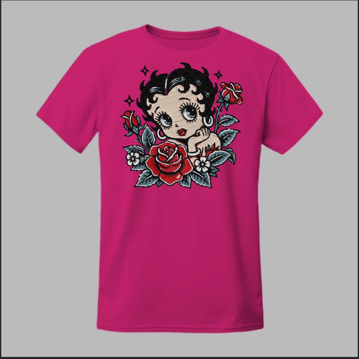 Turn heads with classic retro charm in this Betty Boop tee! Featuring Betty framed by vibrant red roses and embroidered-style details, this design is both playful and iconic. Perfect for casual outfits or adding a nostalgic twist to your wardrobe.