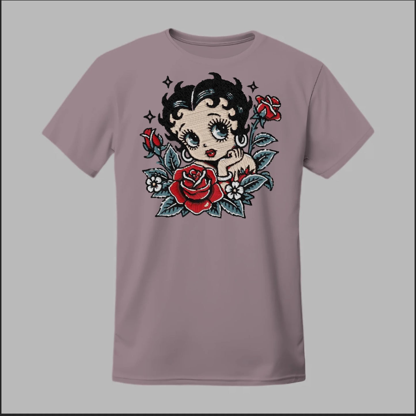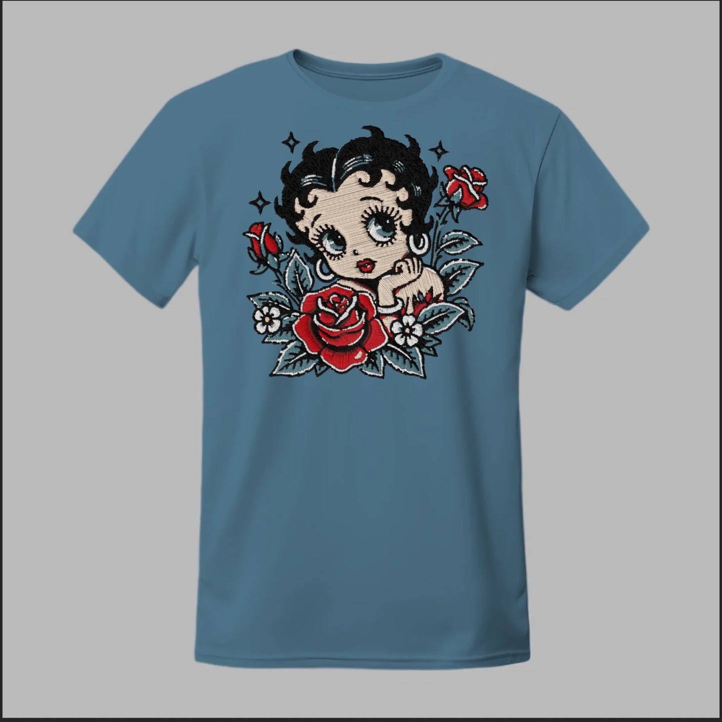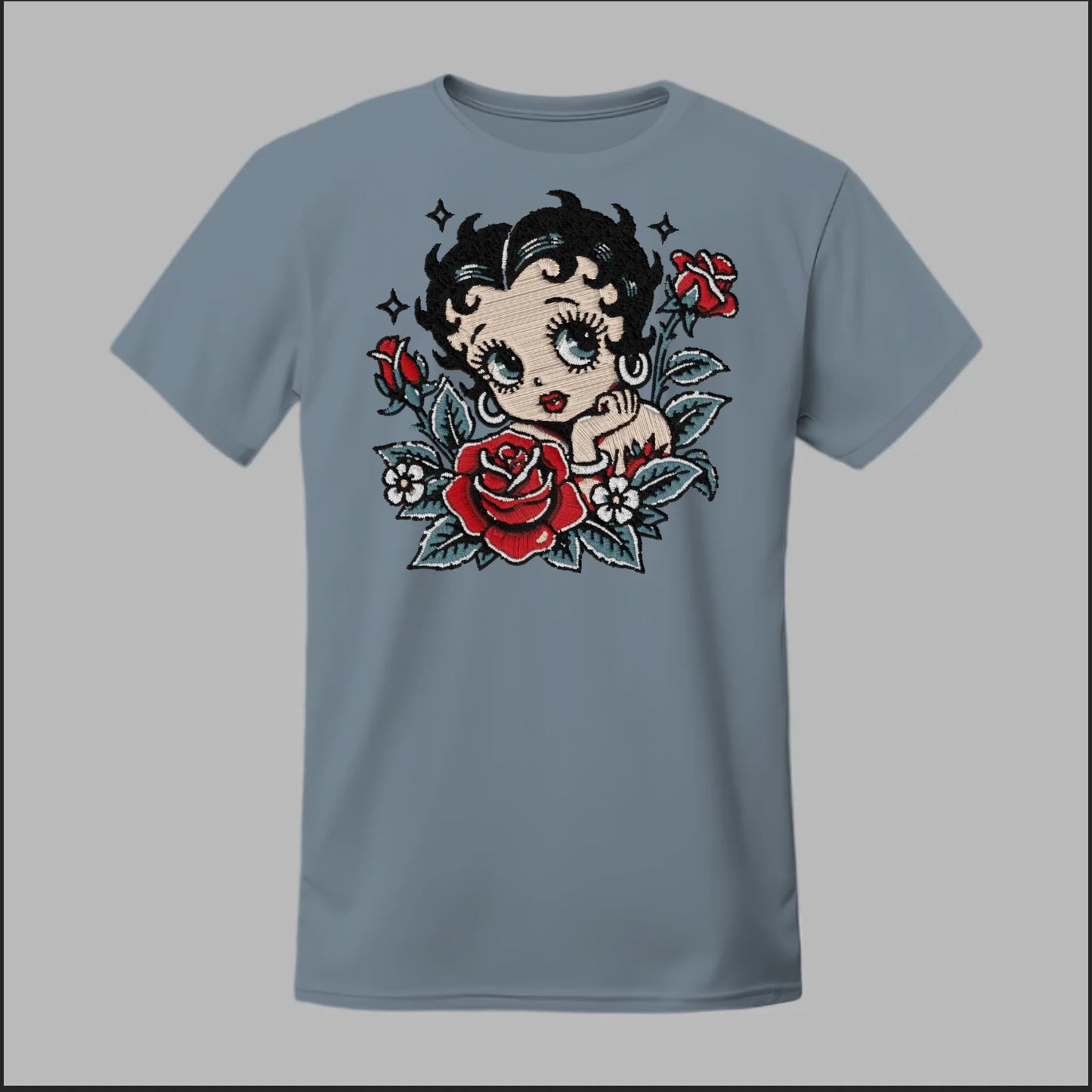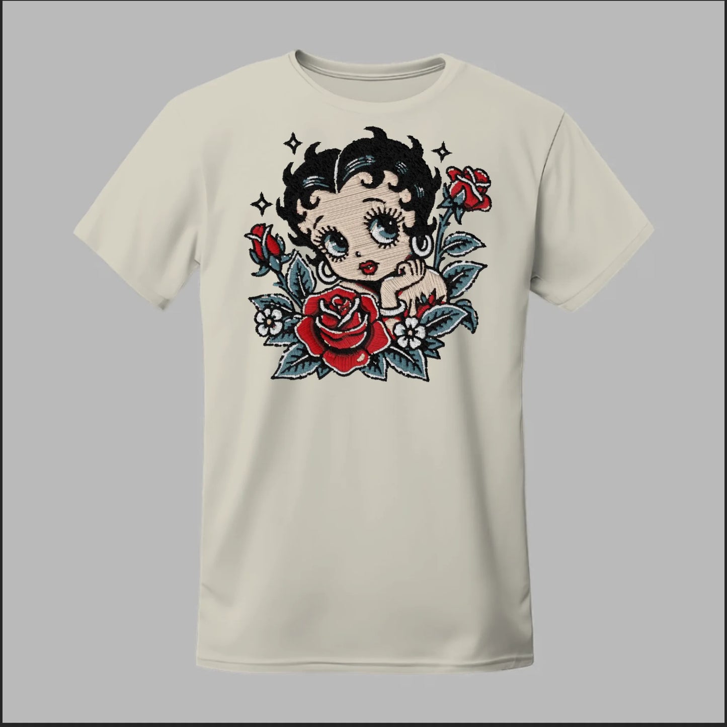 Turn heads with classic retro charm in this Betty Boop tee! Featuring Betty framed by vibrant red roses and embroidered-style details, this design is both playful and iconic. Perfect for casual outfits or adding a nostalgic twist to your wardrobe.