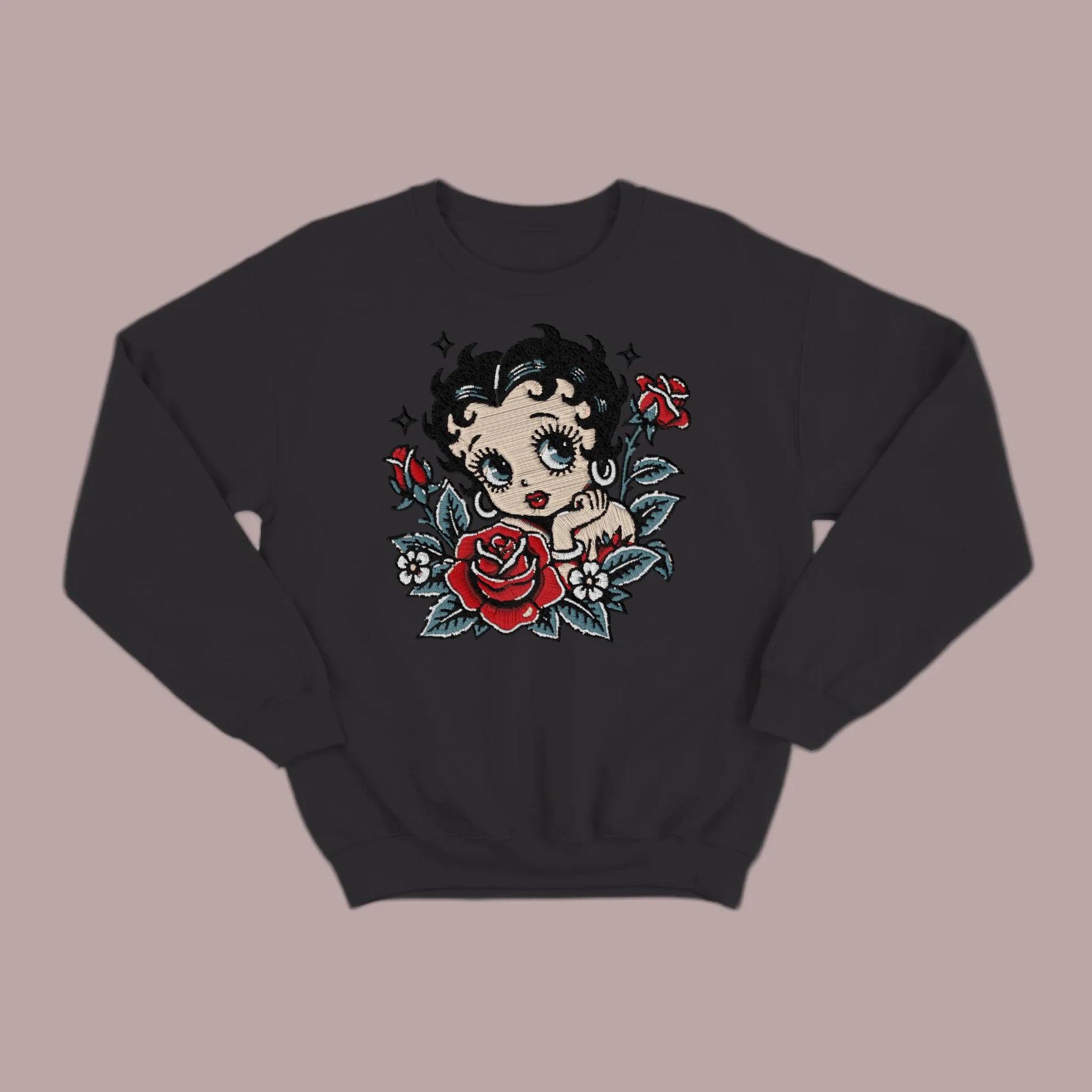 Stay cozy while rocking retro vibes with this Betty Boop sweatshirt. With embroidered-look roses and Betty’s signature sass, this design pops perfectly against the warm, comfy fabric. Ideal for cooler days, lounging, or layering with your favorite casual fits.