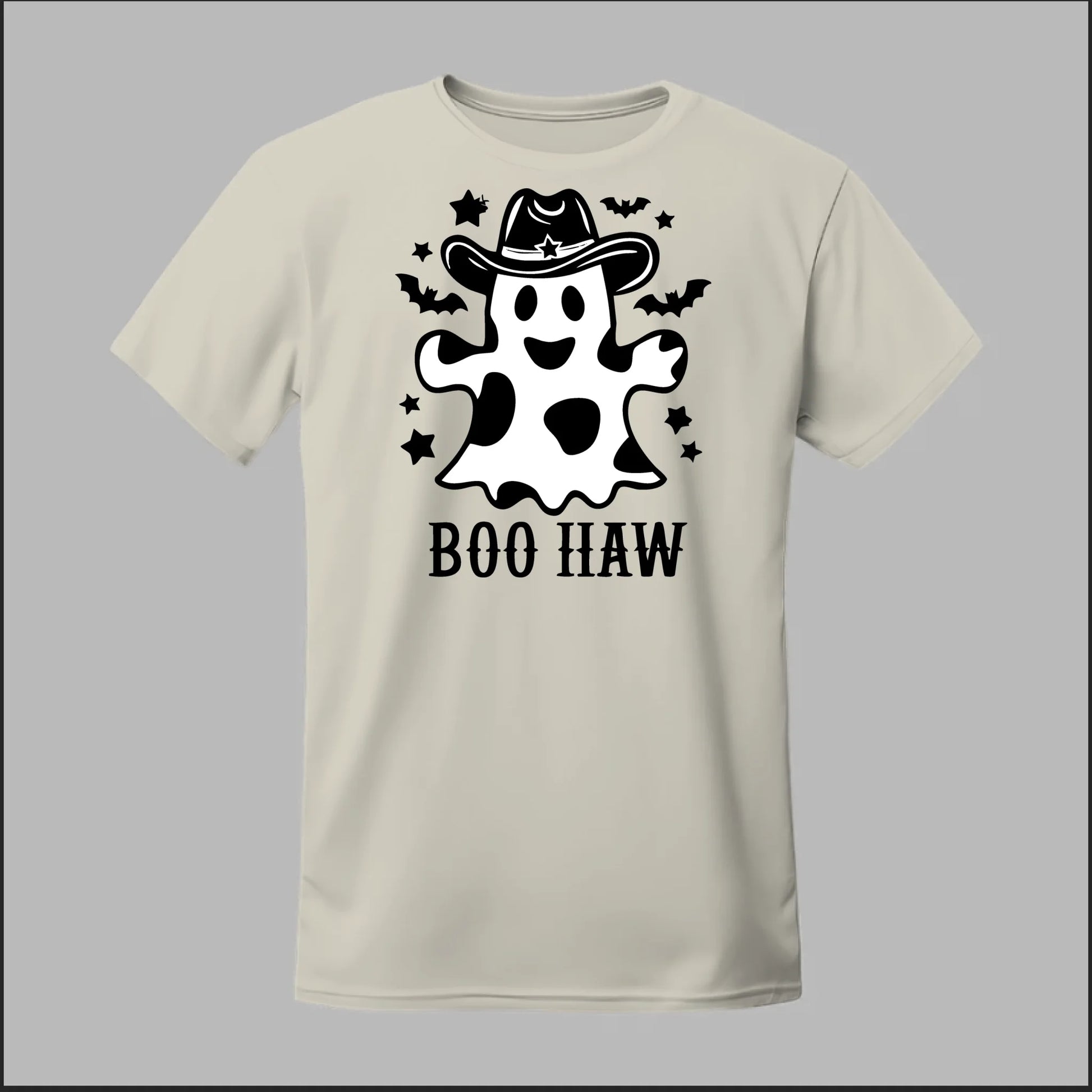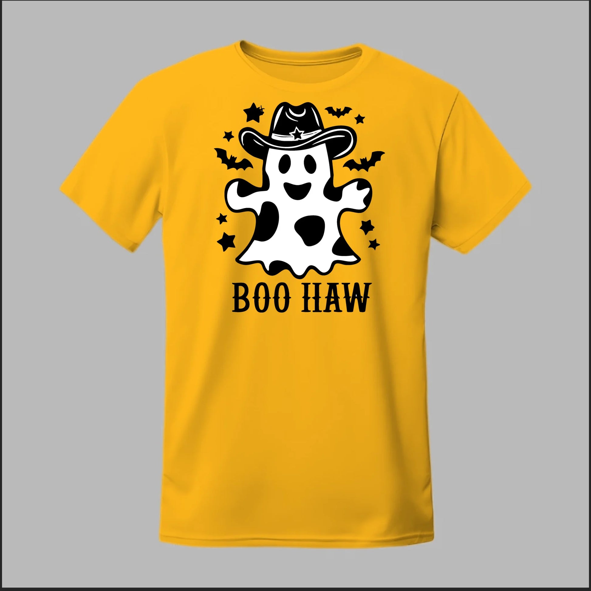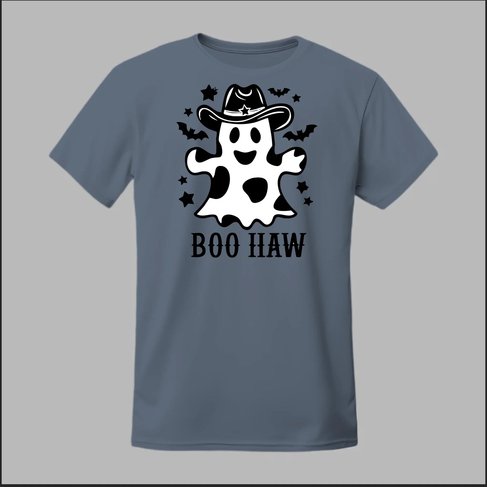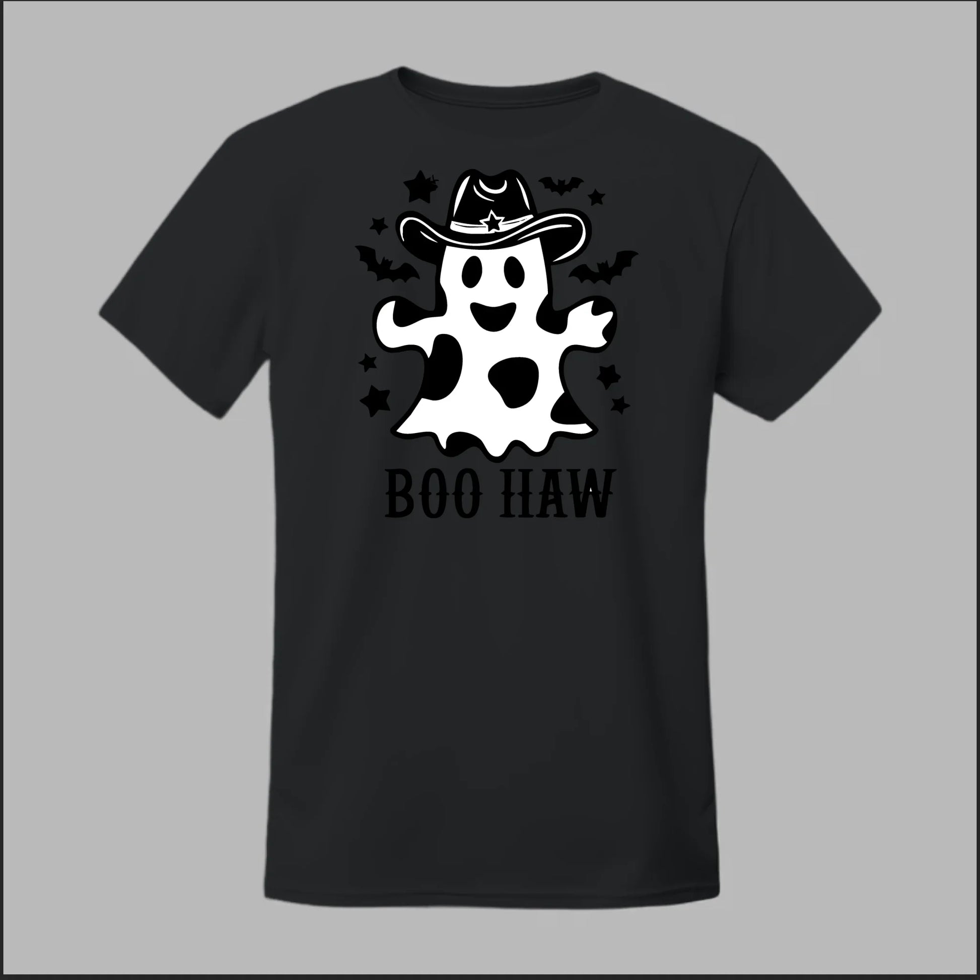 Yeehaw meets spooky season! Our Boo Haw Tee is the perfect blend of Halloween fun and country charm. Featuring a playful cowboy ghost in a western hat, this shirt brings ghostly giggles to any outfit. A Fun Halloween design with a country twist.
