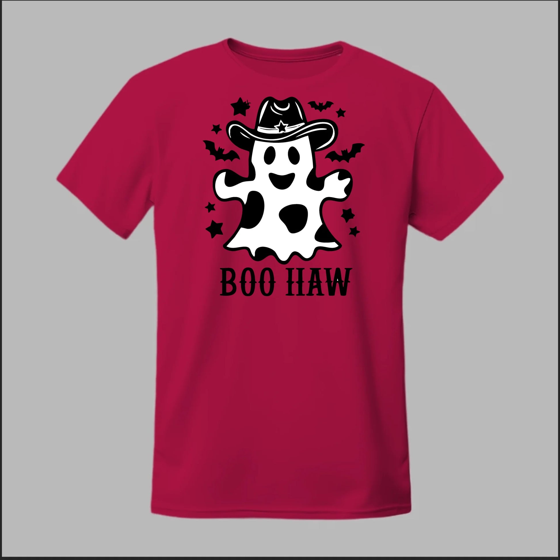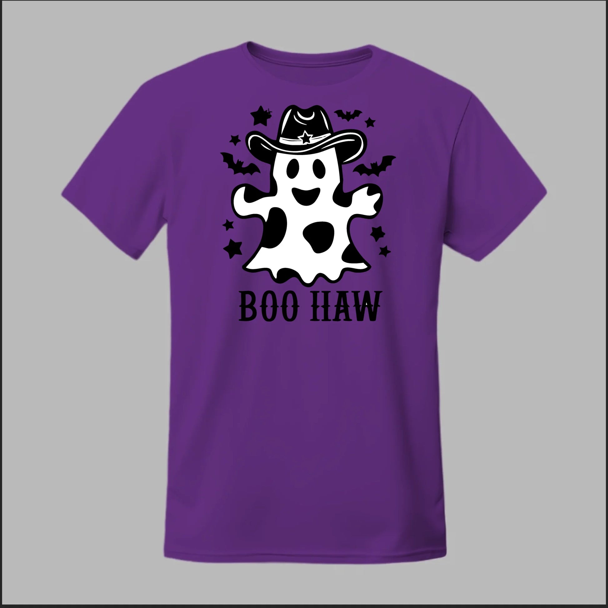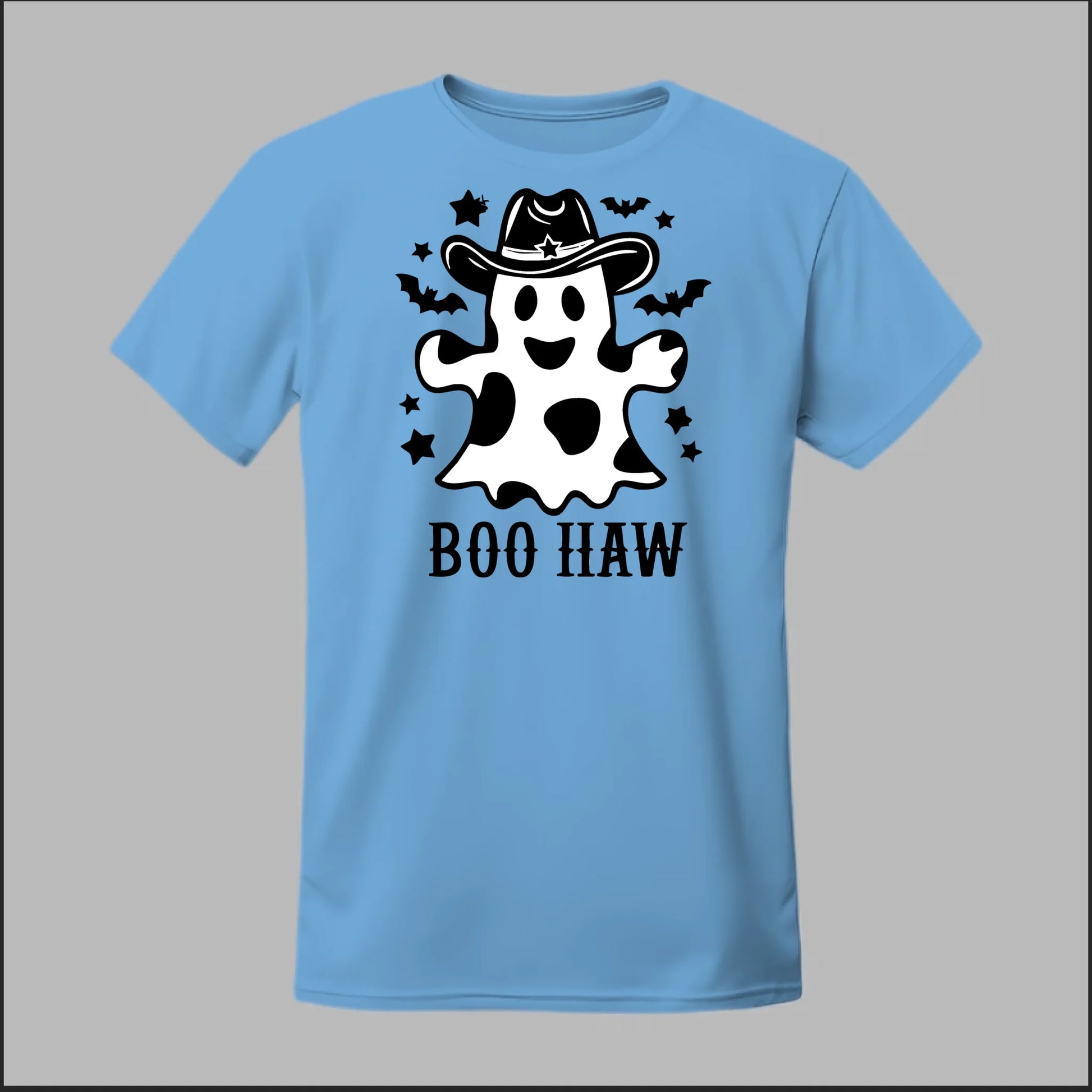 Yeehaw meets spooky season! Our Boo Haw Tee is the perfect blend of Halloween fun and country charm. Featuring a playful cowboy ghost in a western hat, this shirt brings ghostly giggles to any outfit. A Fun Halloween design with a country twist.