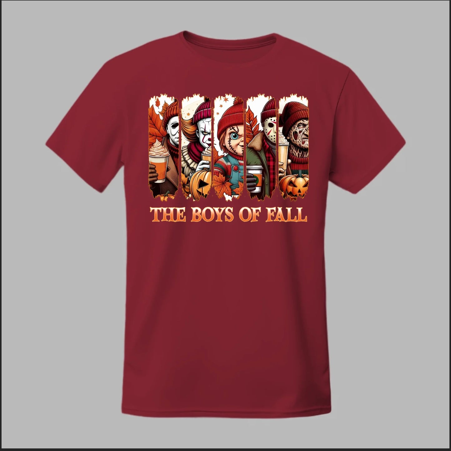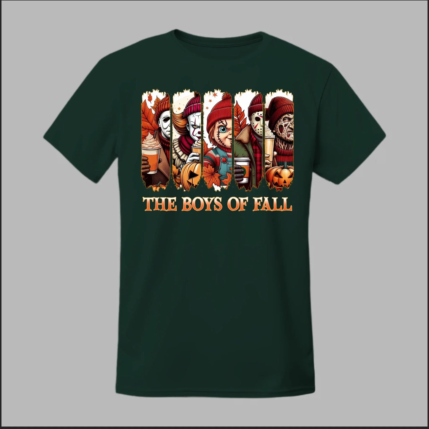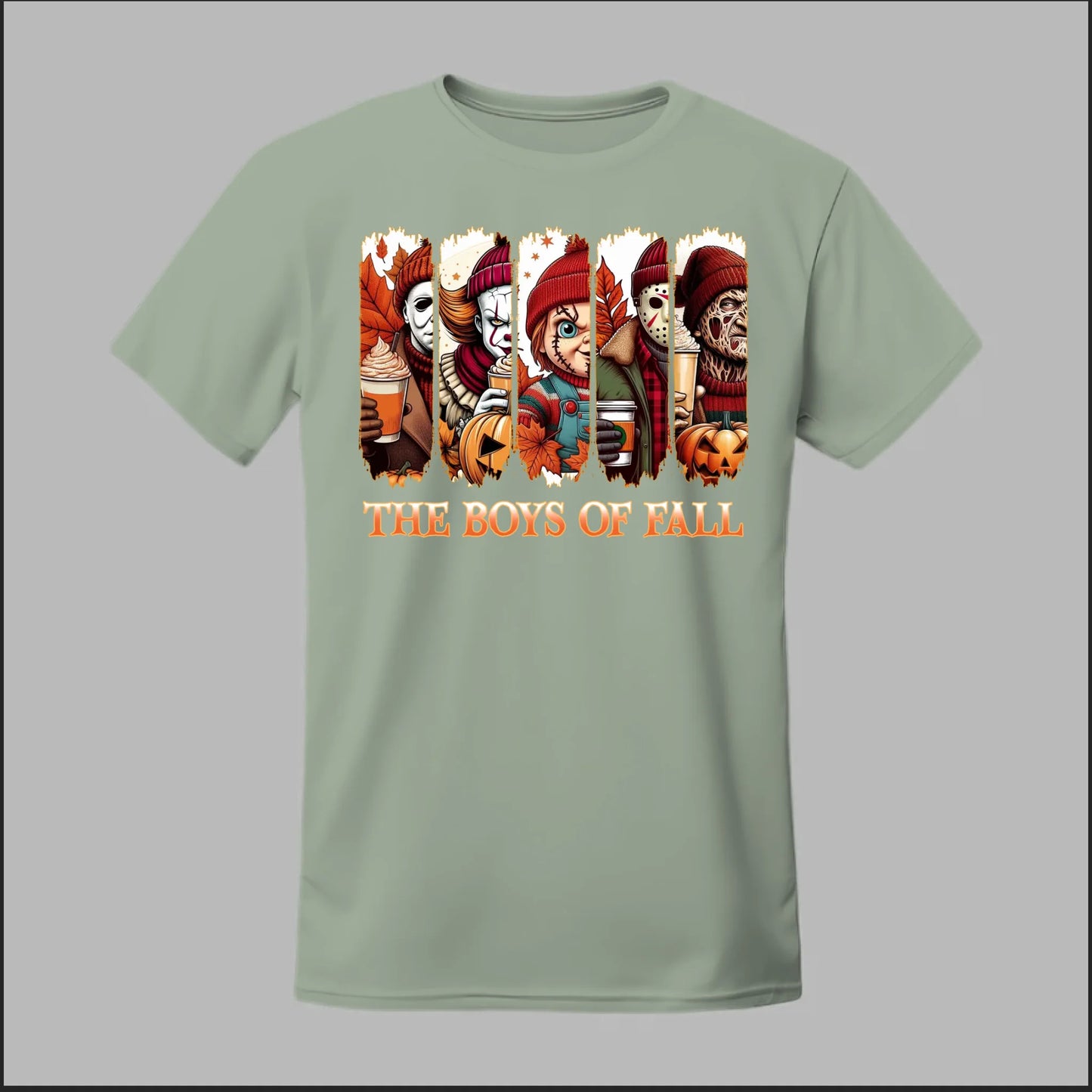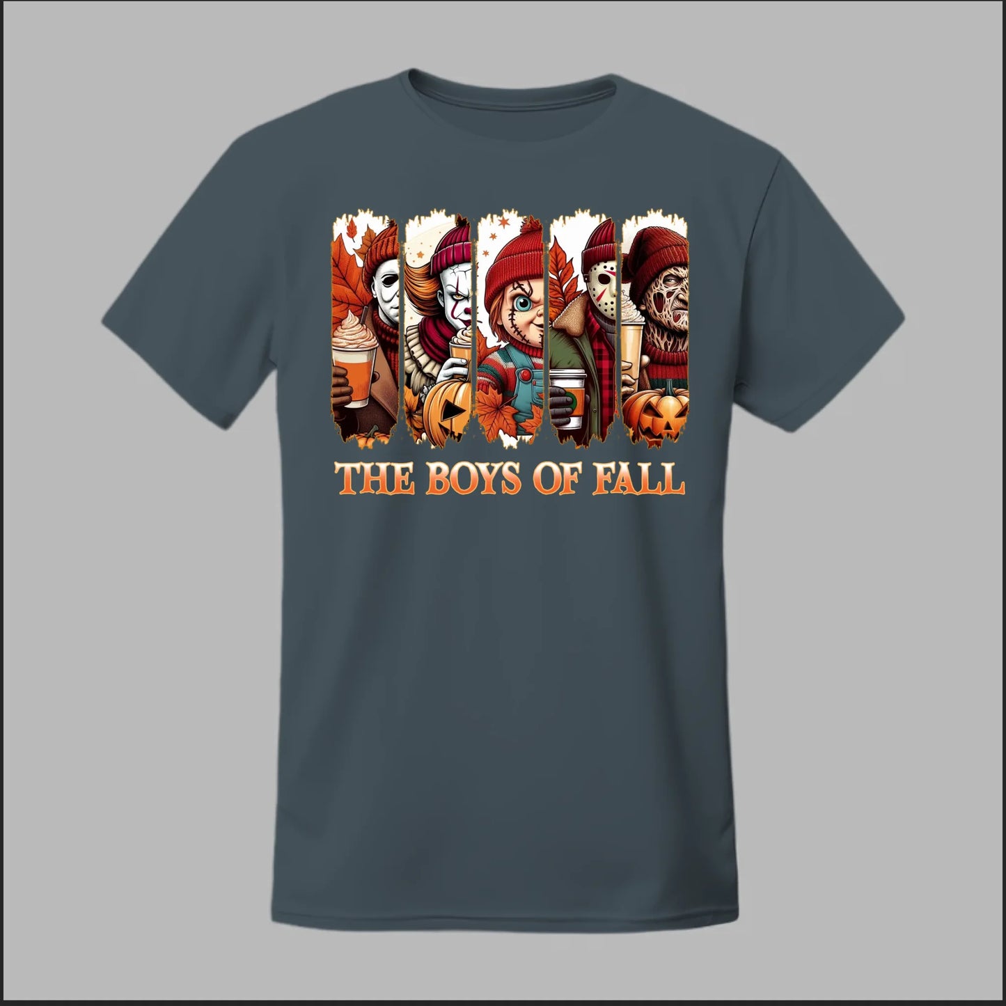 Your favorite horror icons are trading in knives for lattes! This fall-ready design features Michael, Pennywise, Chucky, Jason, and Freddy decked out in cozy autumn gear—pumpkin spice in hand and leaves all around. Equal parts creepy and cozy, it’s the perfect shirt for horror fans who live for spooky season and pumpkin spice vibes.