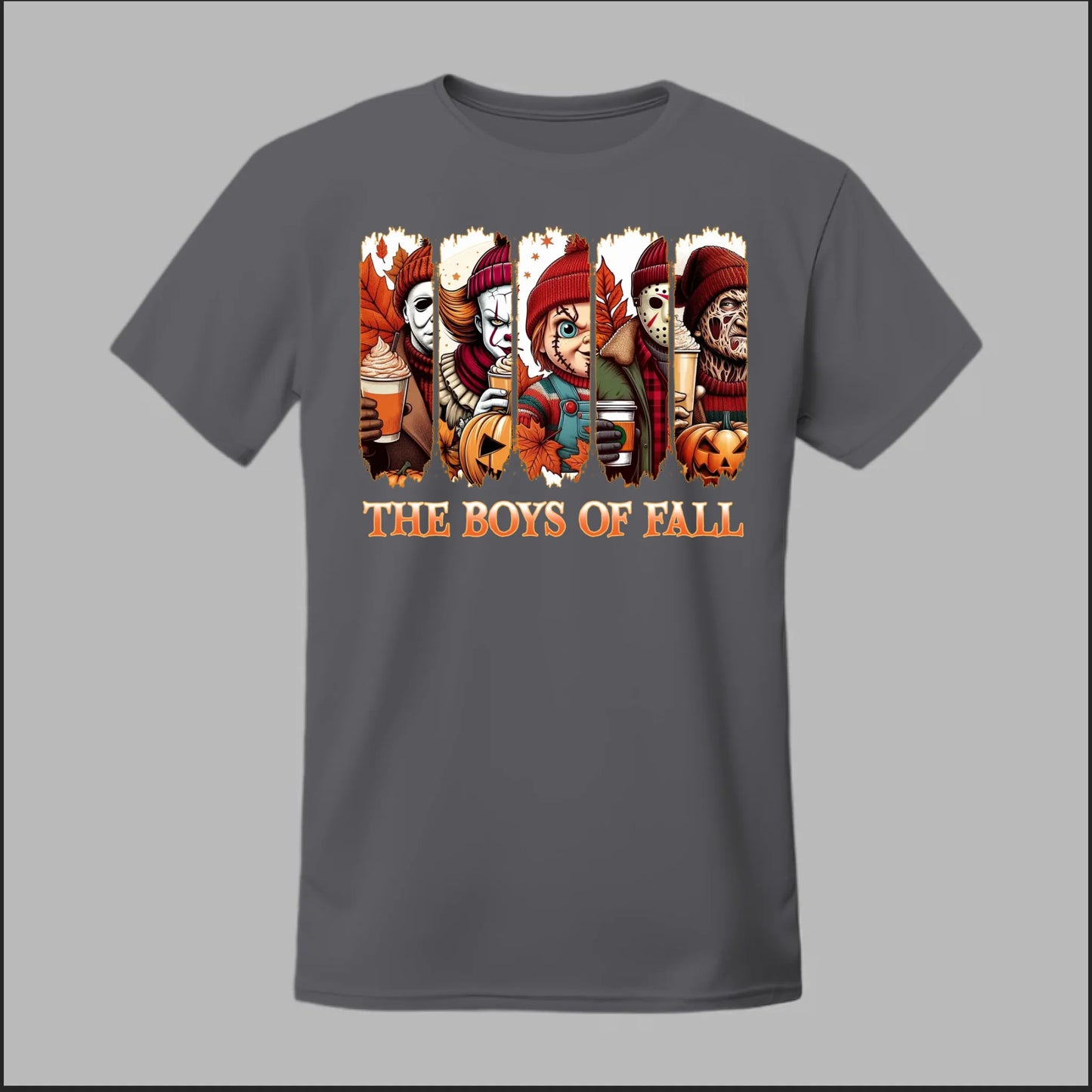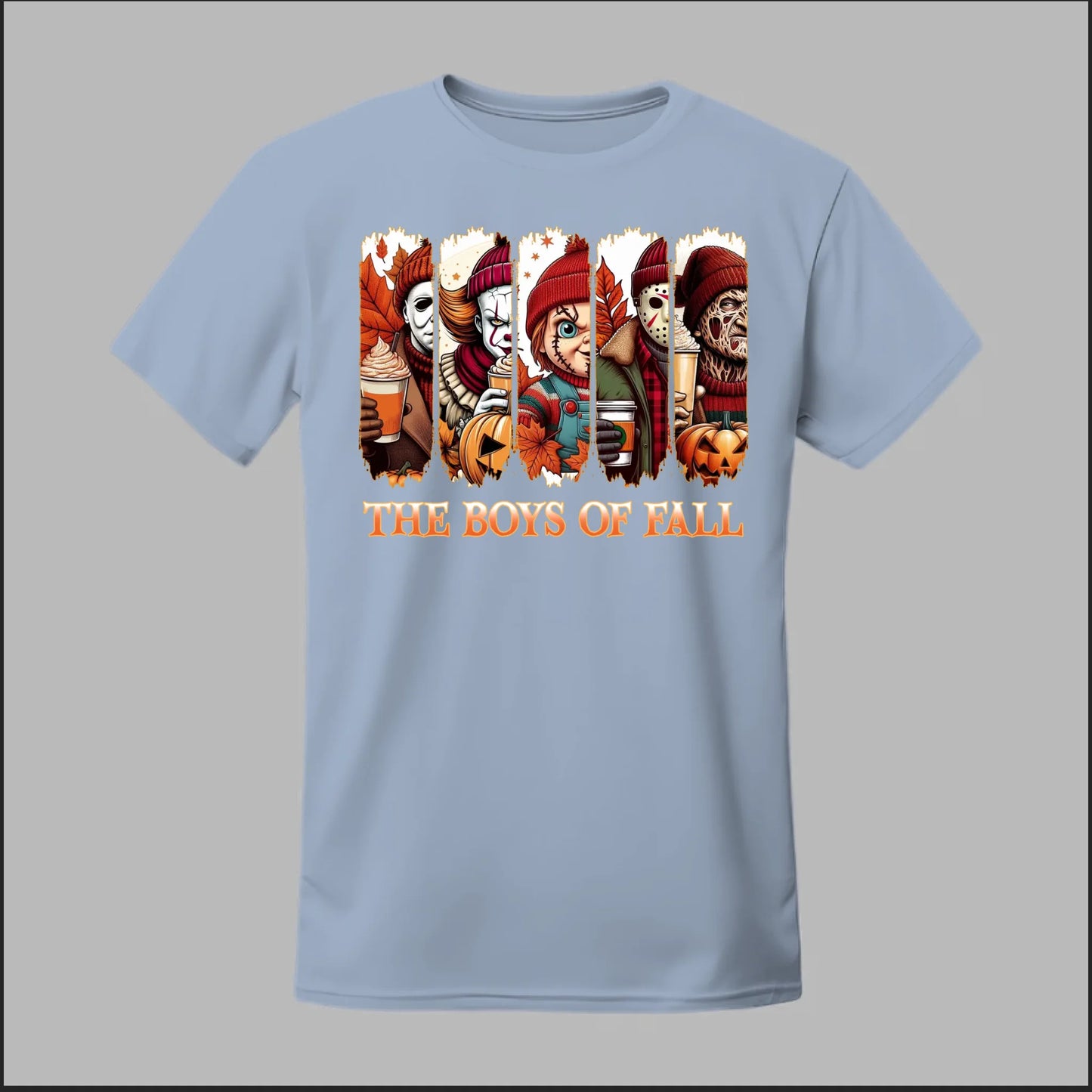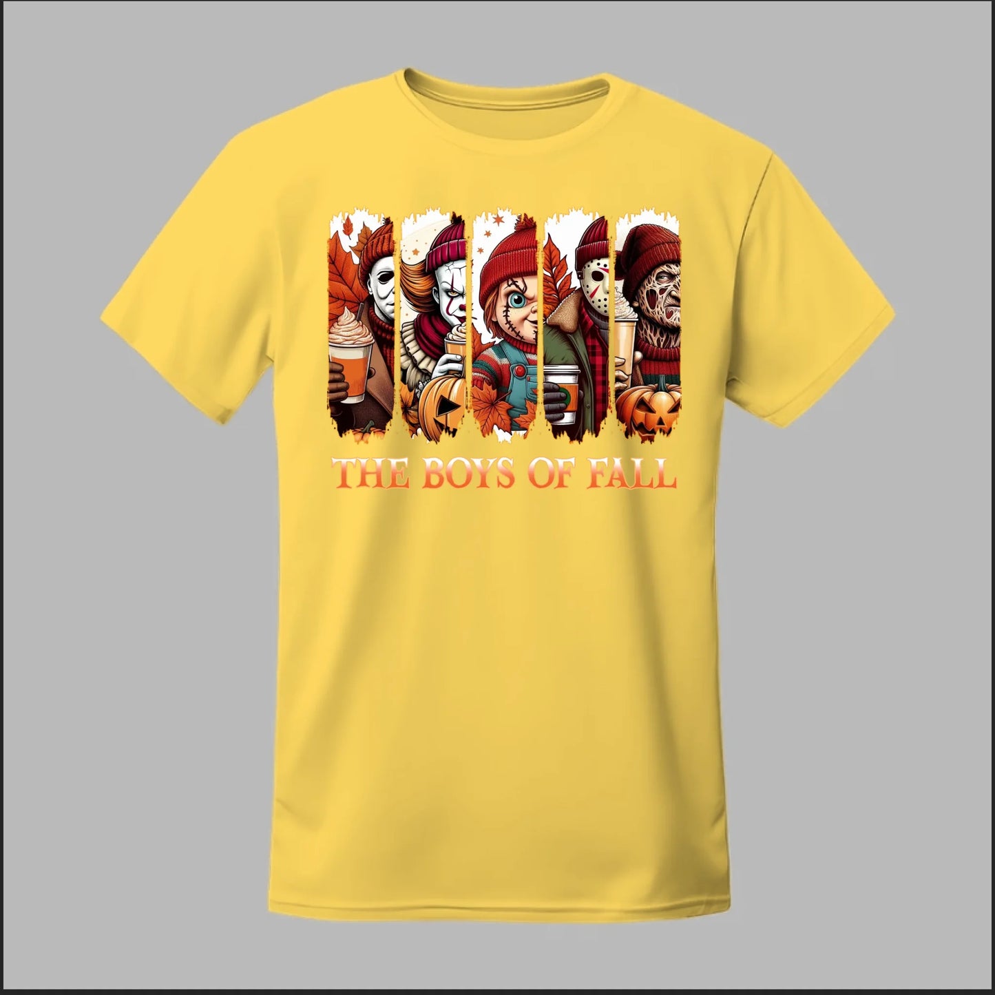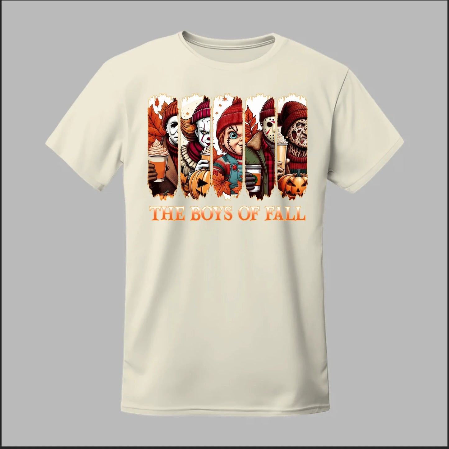 Your favorite horror icons are trading in knives for lattes! This fall-ready design features Michael, Pennywise, Chucky, Jason, and Freddy decked out in cozy autumn gear—pumpkin spice in hand and leaves all around. Equal parts creepy and cozy, it’s the perfect shirt for horror fans who live for spooky season and pumpkin spice vibes.