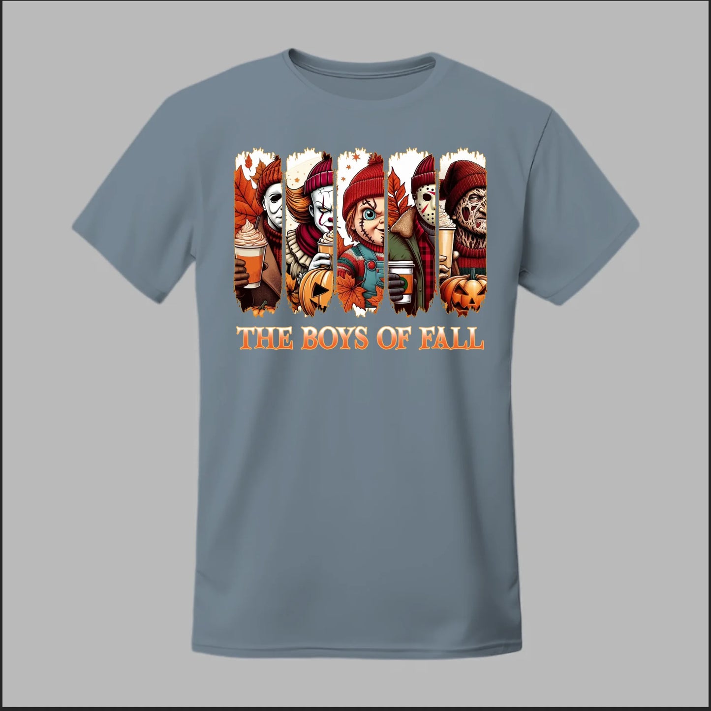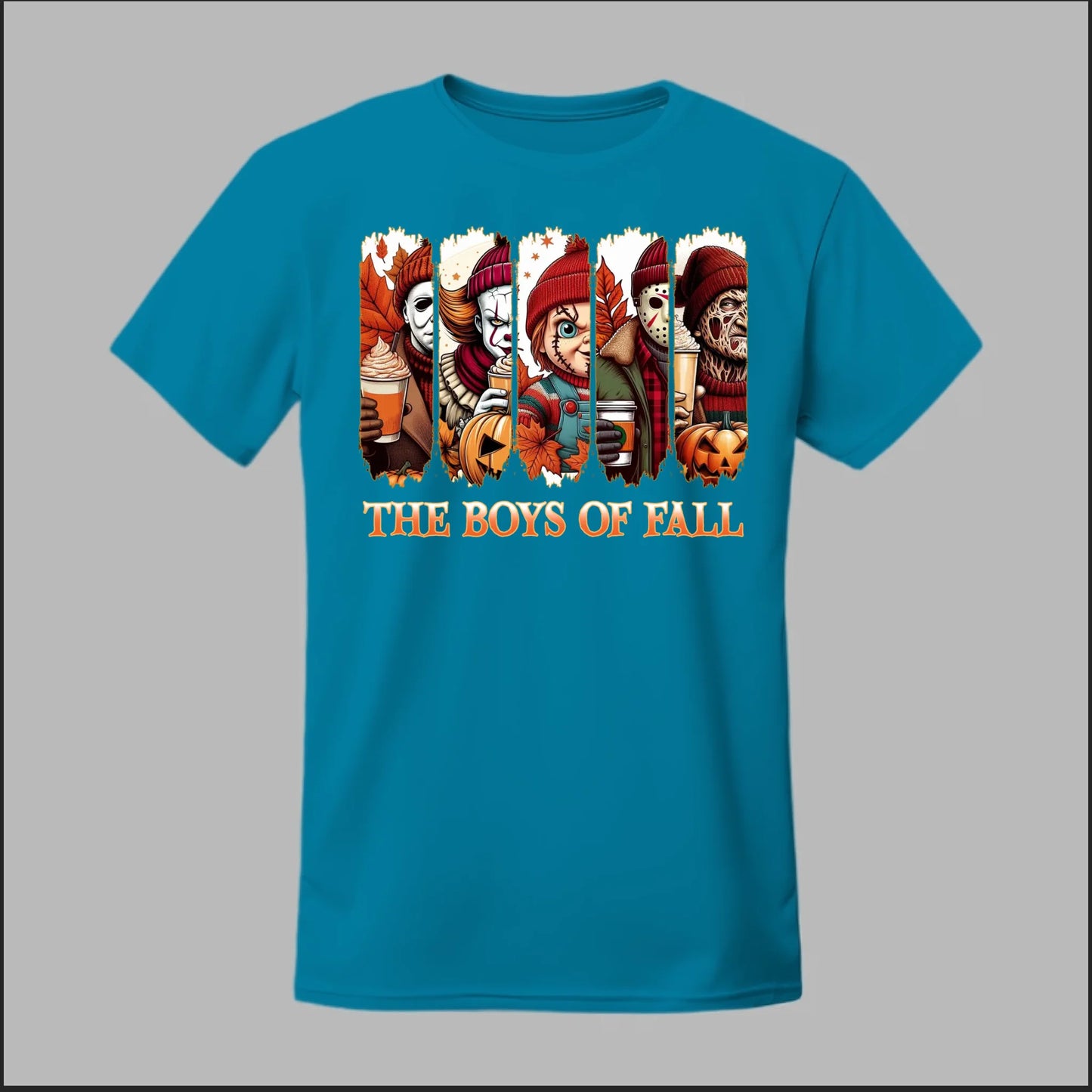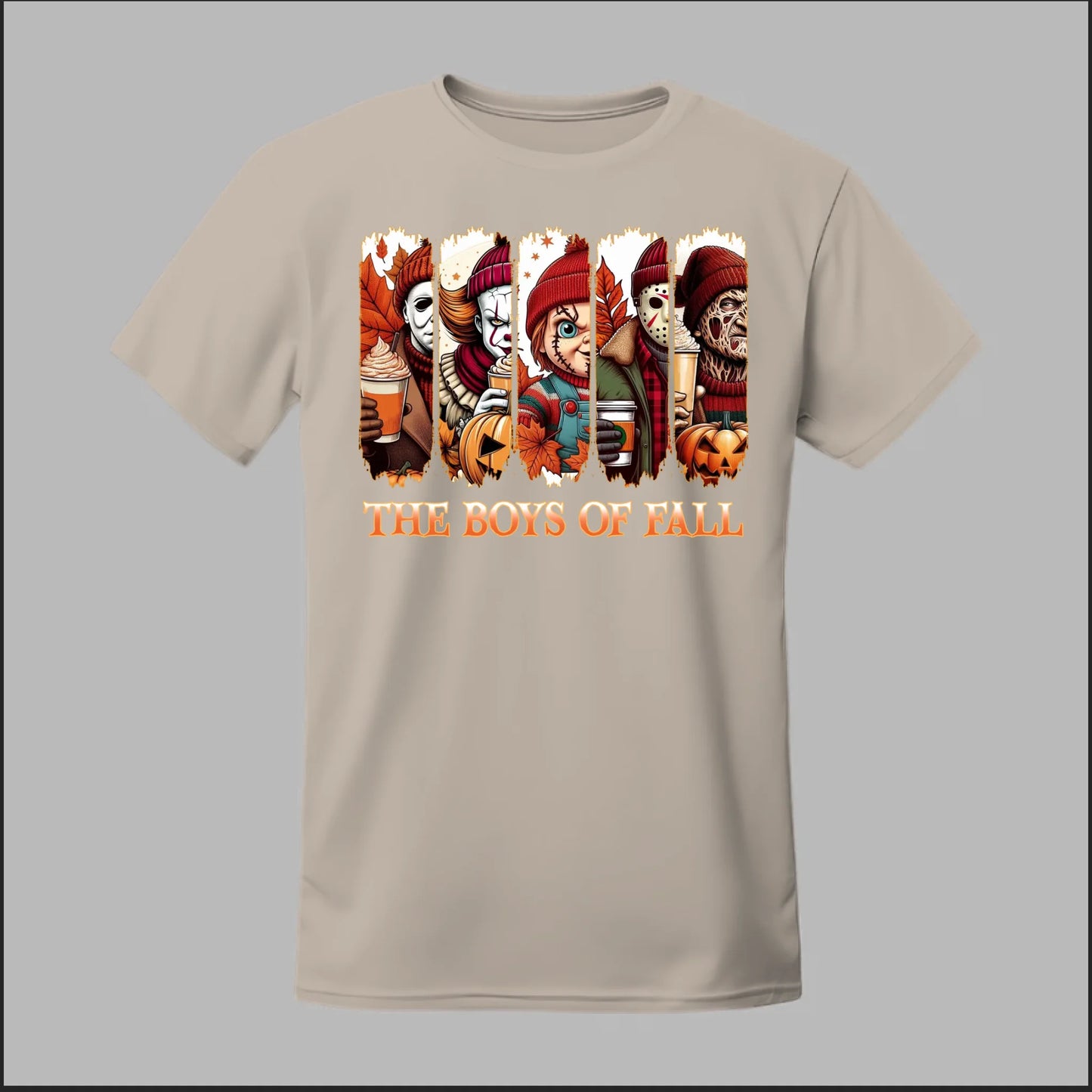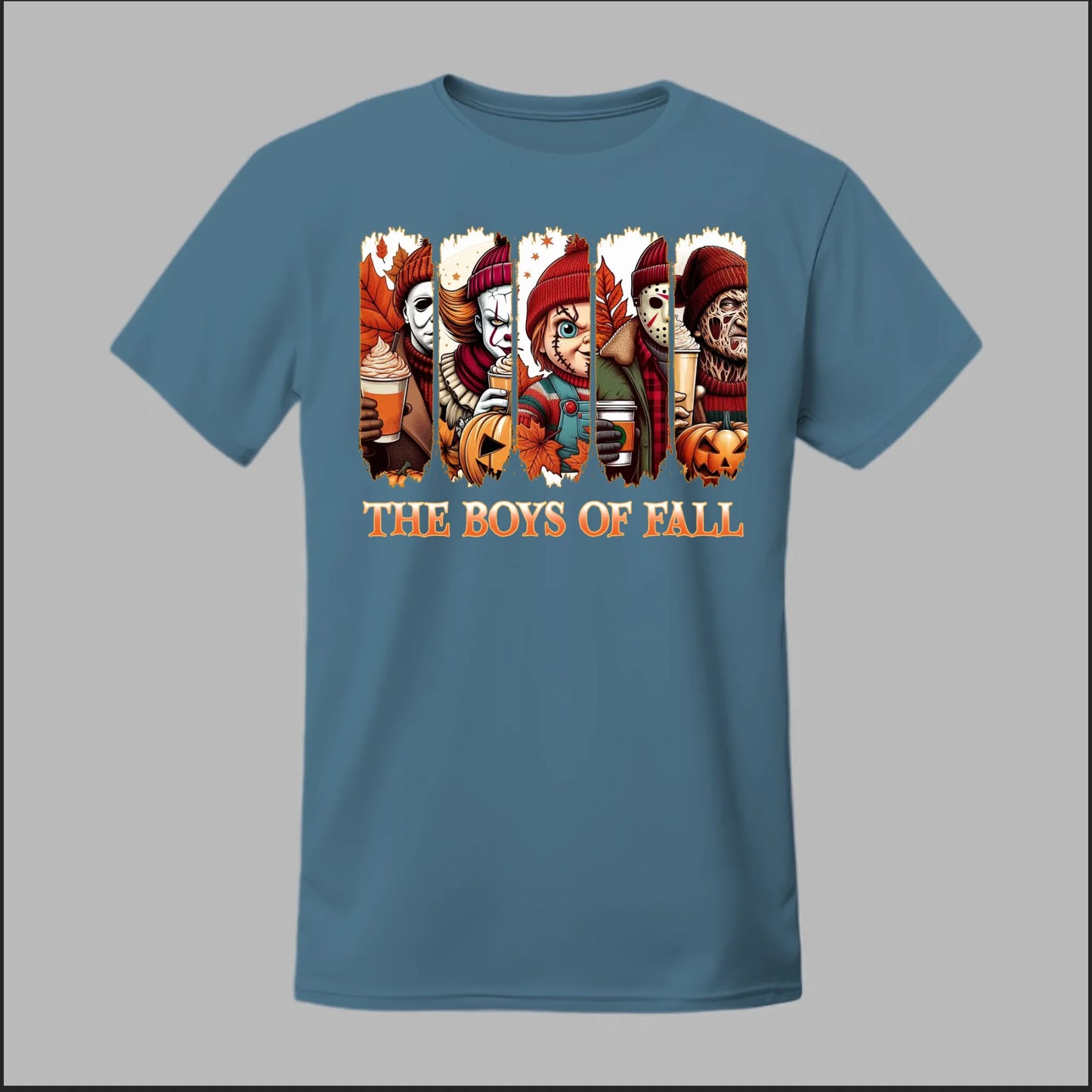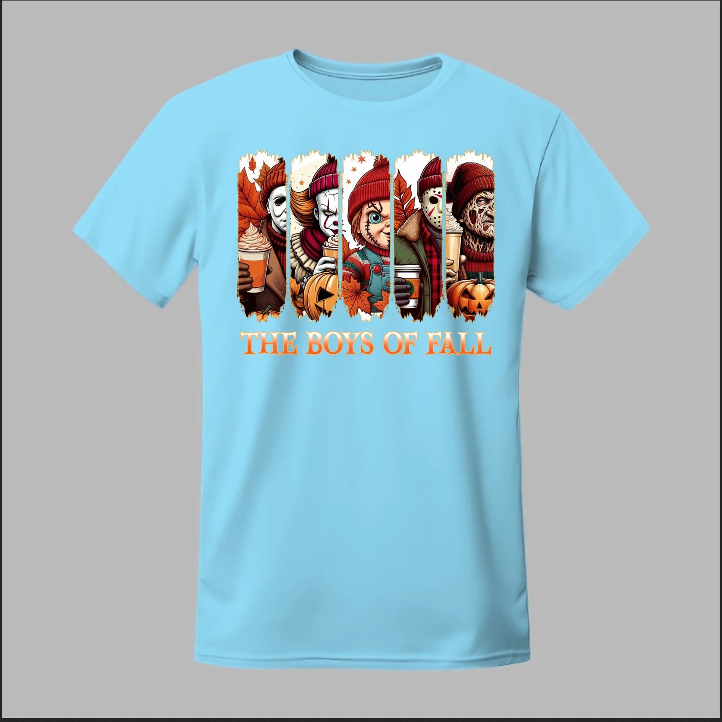 Your favorite horror icons are trading in knives for lattes! This fall-ready design features Michael, Pennywise, Chucky, Jason, and Freddy decked out in cozy autumn gear—pumpkin spice in hand and leaves all around. Equal parts creepy and cozy, it’s the perfect shirt for horror fans who live for spooky season and pumpkin spice vibes.