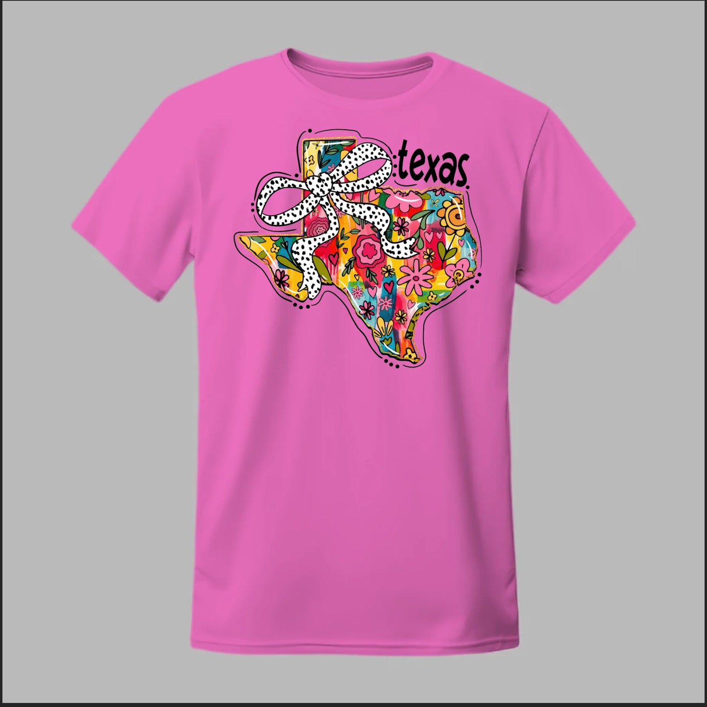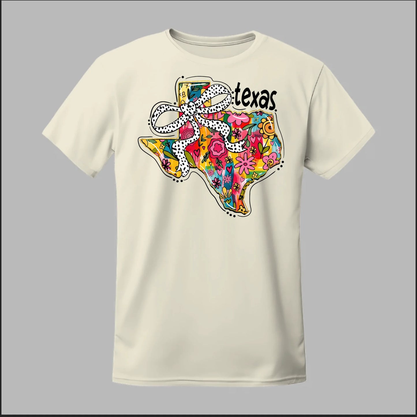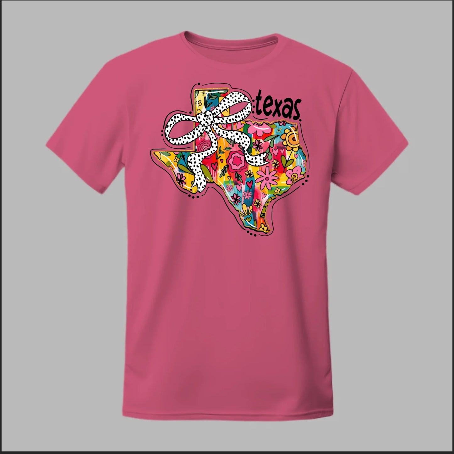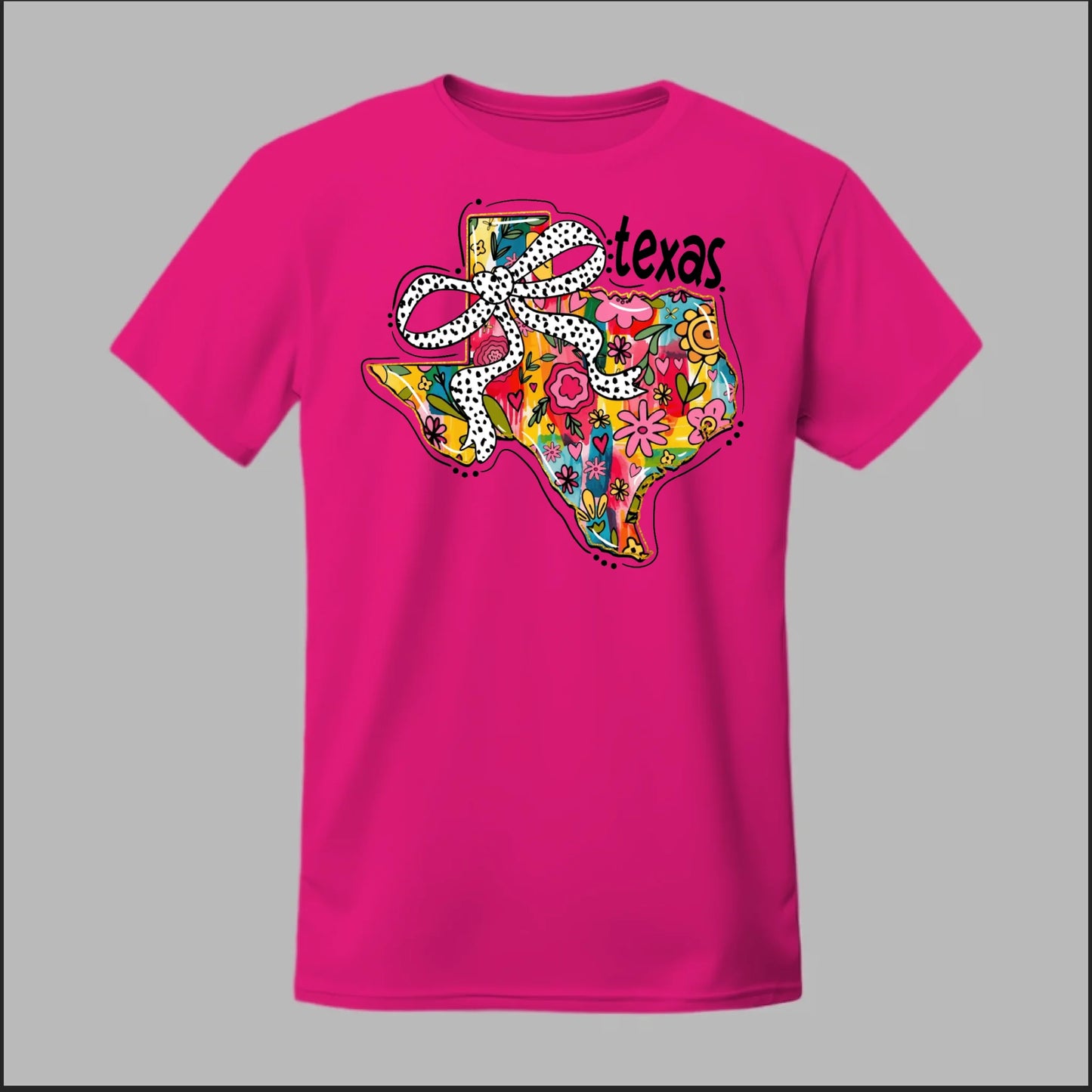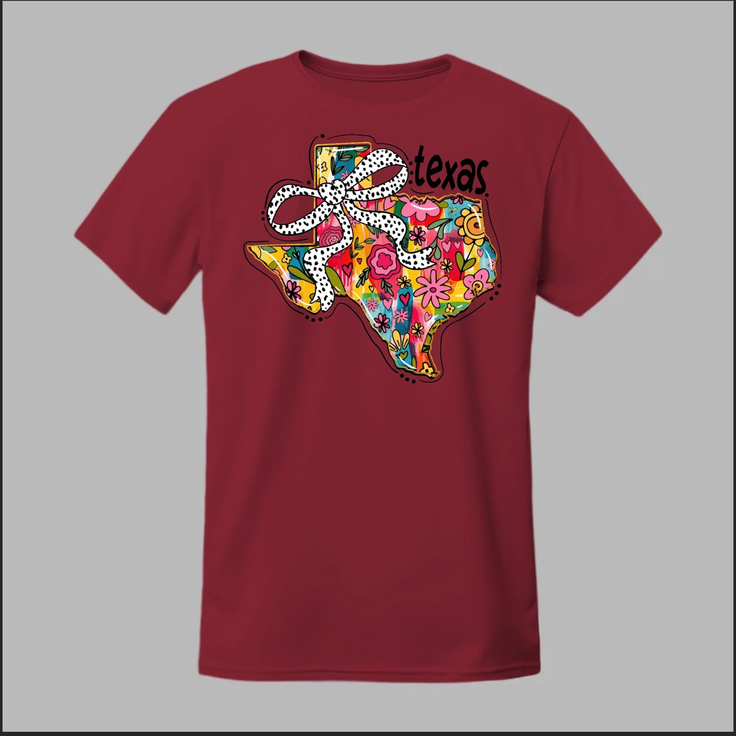 Texas meets feminine flair in this colorful floral design. “Bow’d Up Texas” blends bright hand-drawn flowers, a playful polka-dot bow, and Texas pride into one fun and vibrant look.