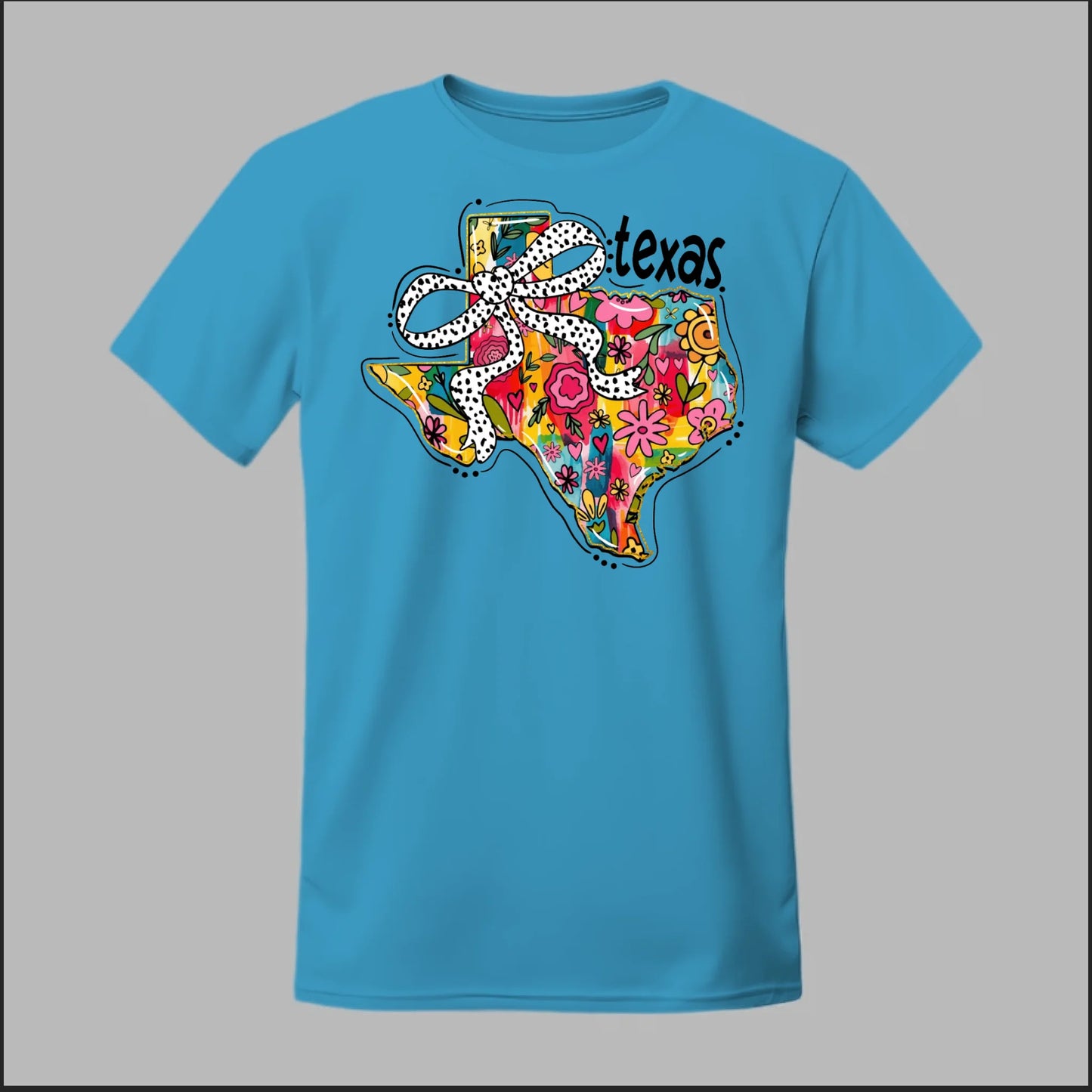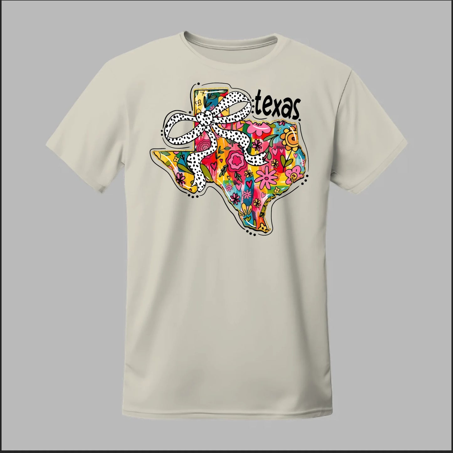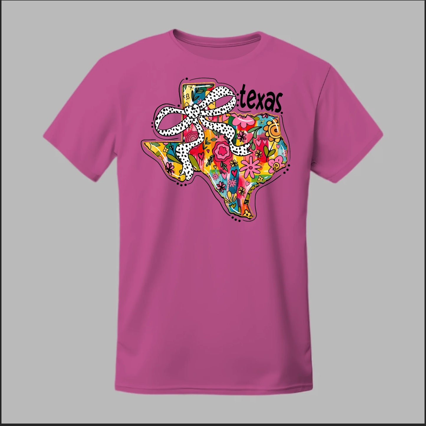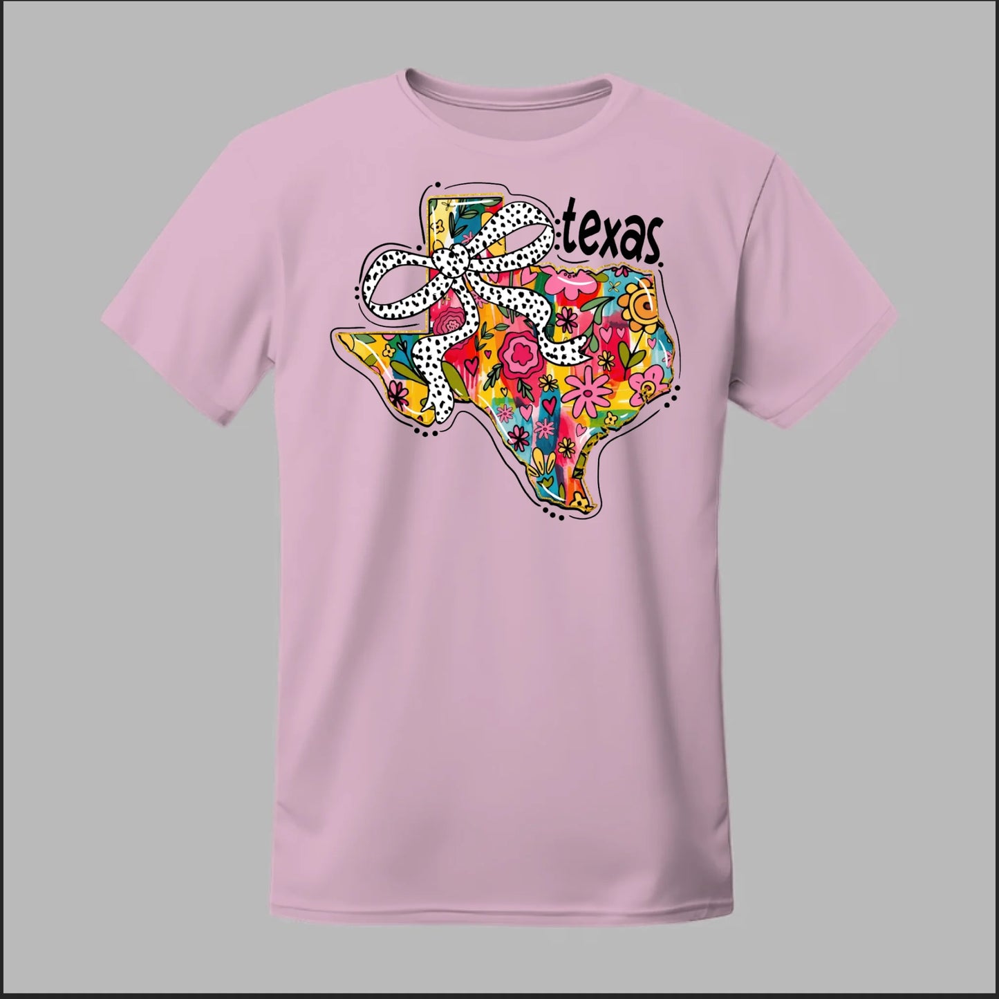 Texas meets feminine flair in this colorful floral design. “Bow’d Up Texas” blends bright hand-drawn flowers, a playful polka-dot bow, and Texas pride into one fun and vibrant look.