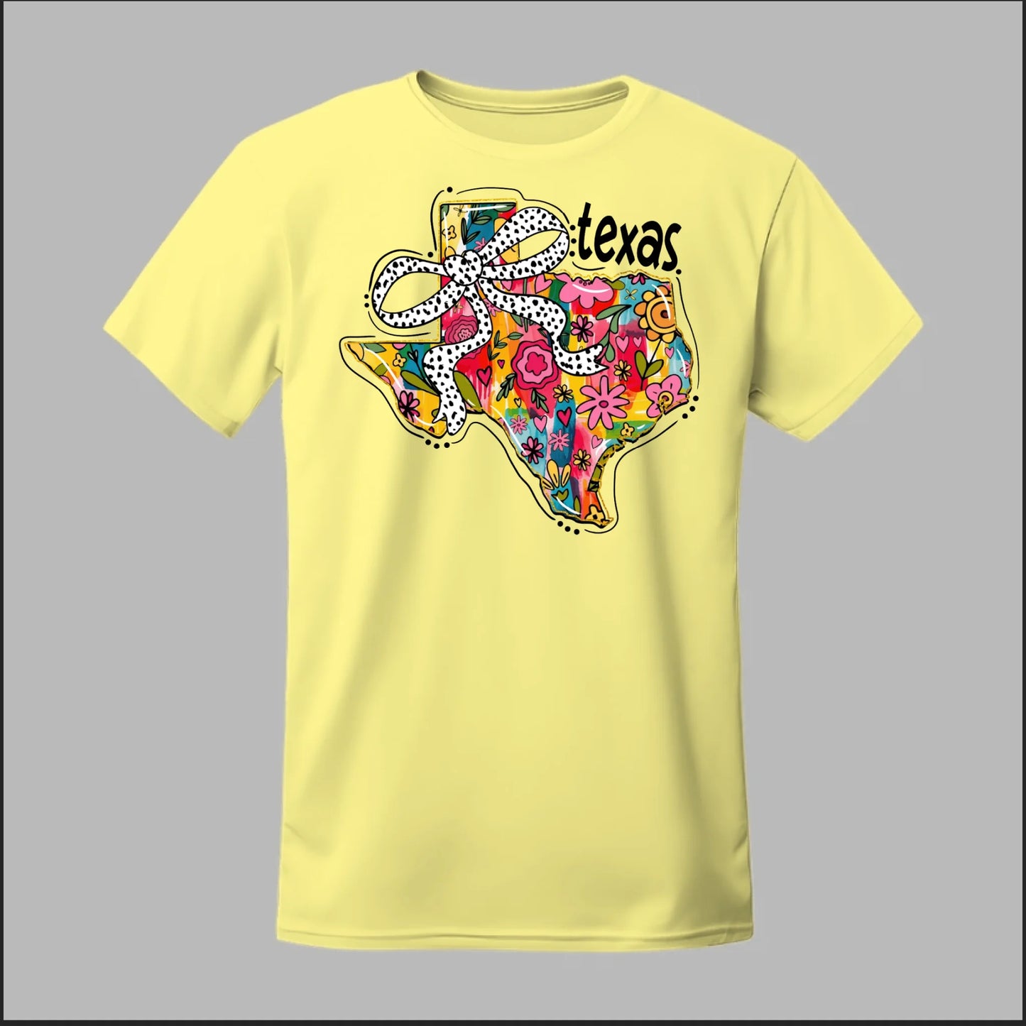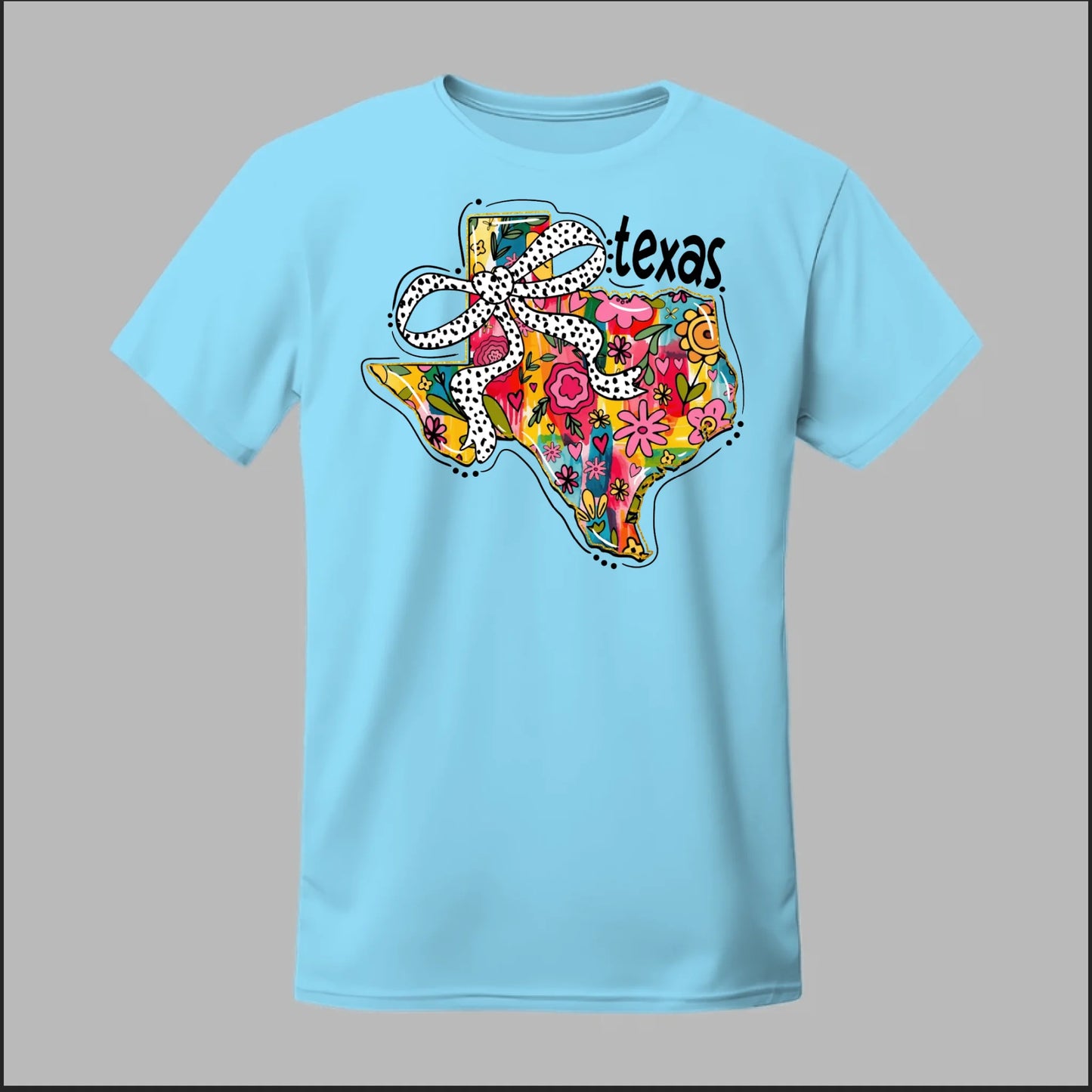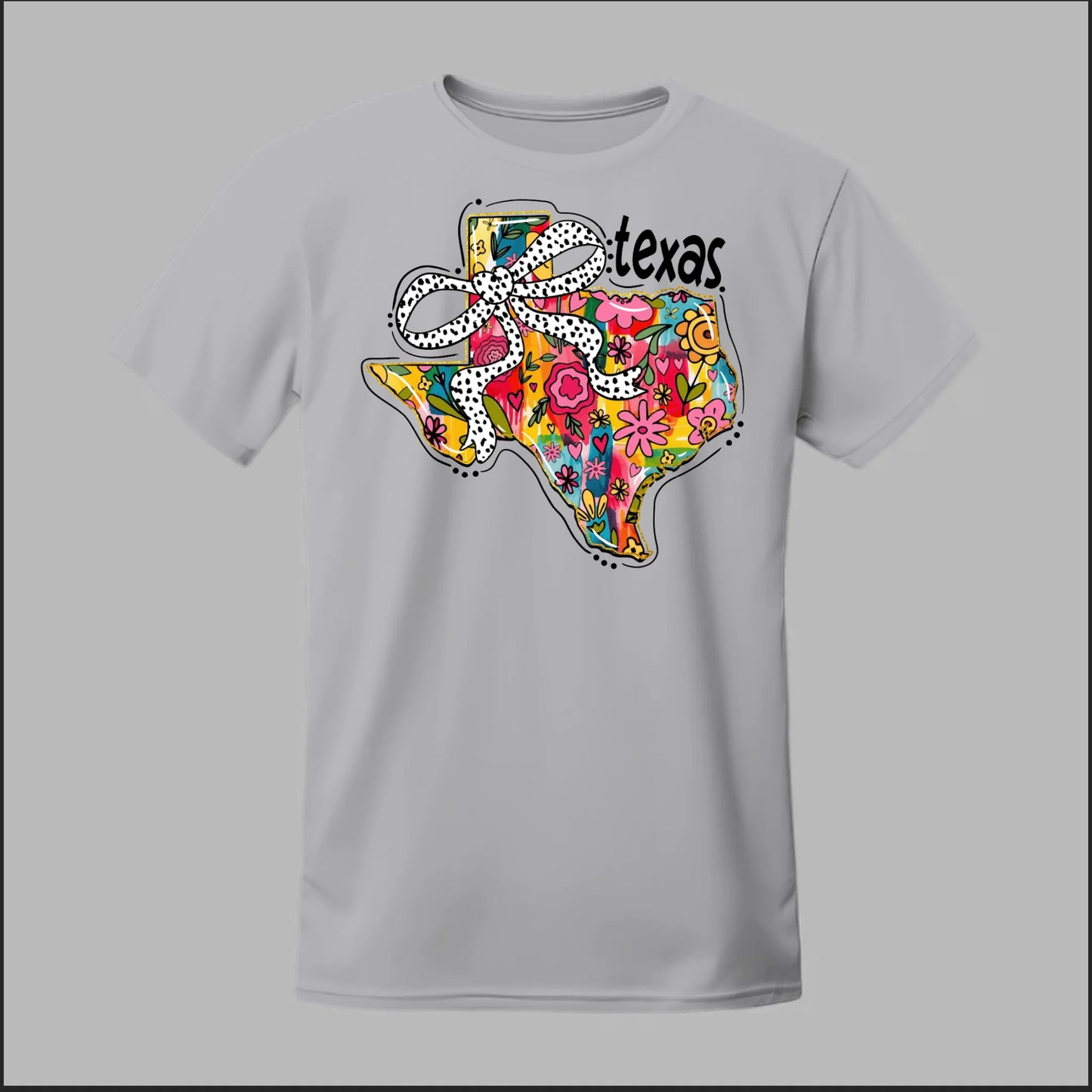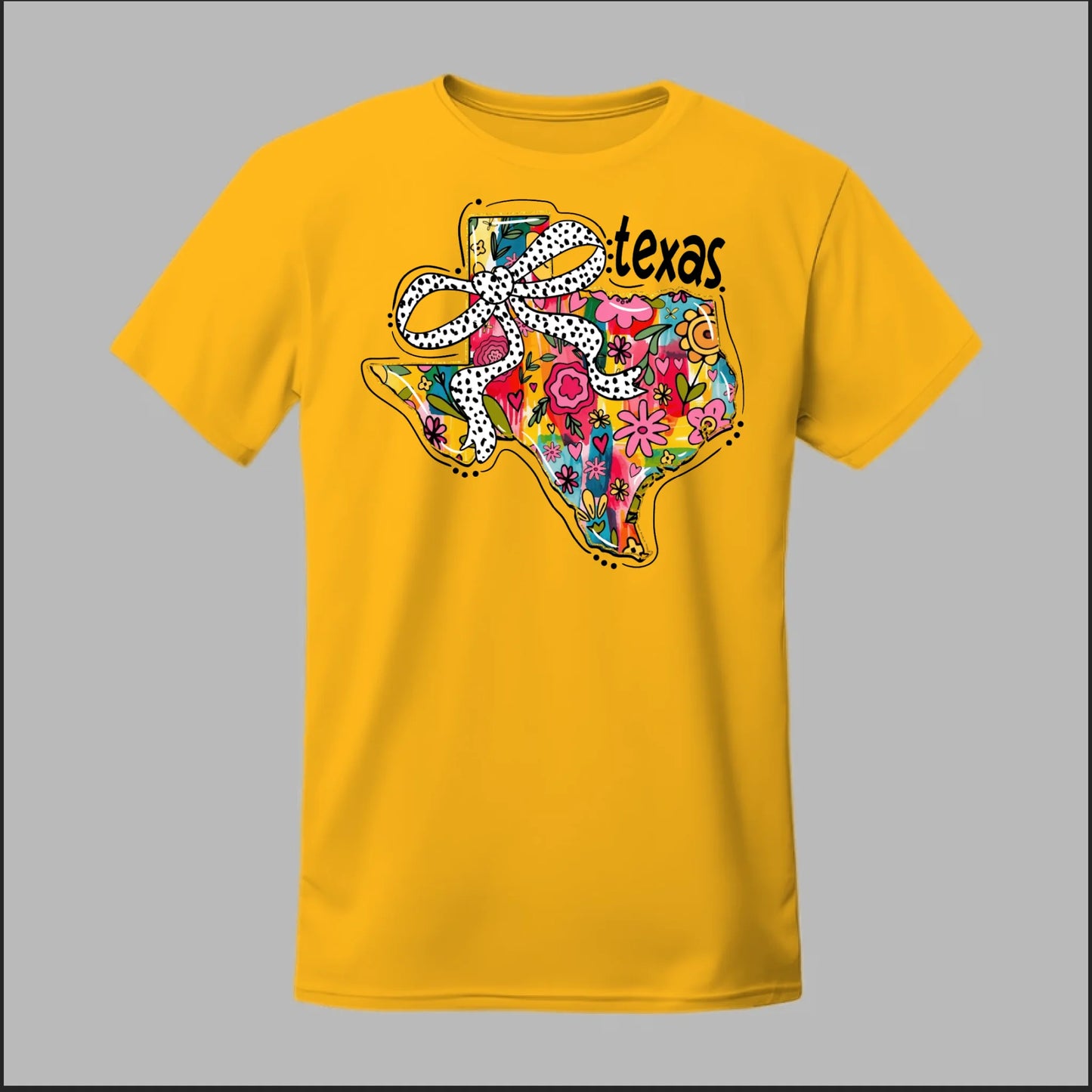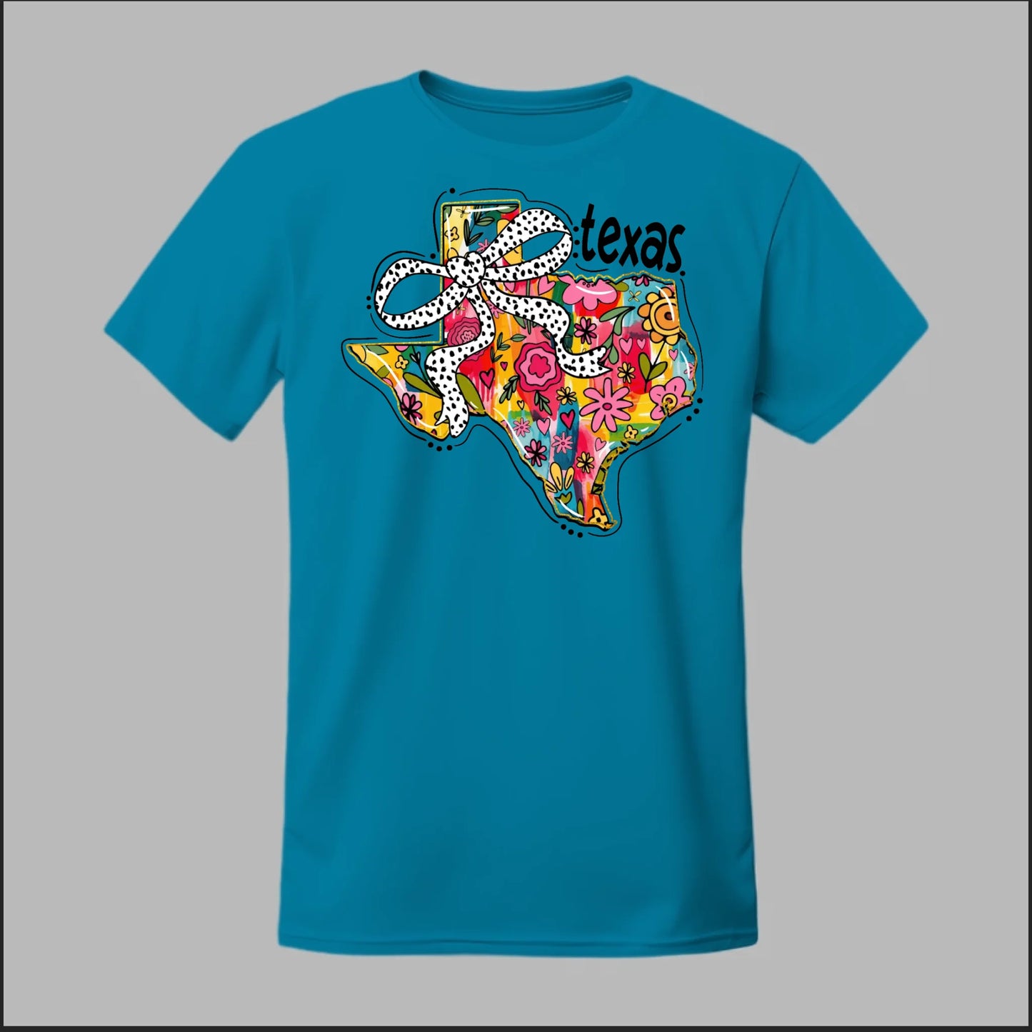 Texas meets feminine flair in this colorful floral design. “Bow’d Up Texas” blends bright hand-drawn flowers, a playful polka-dot bow, and Texas pride into one fun and vibrant look.