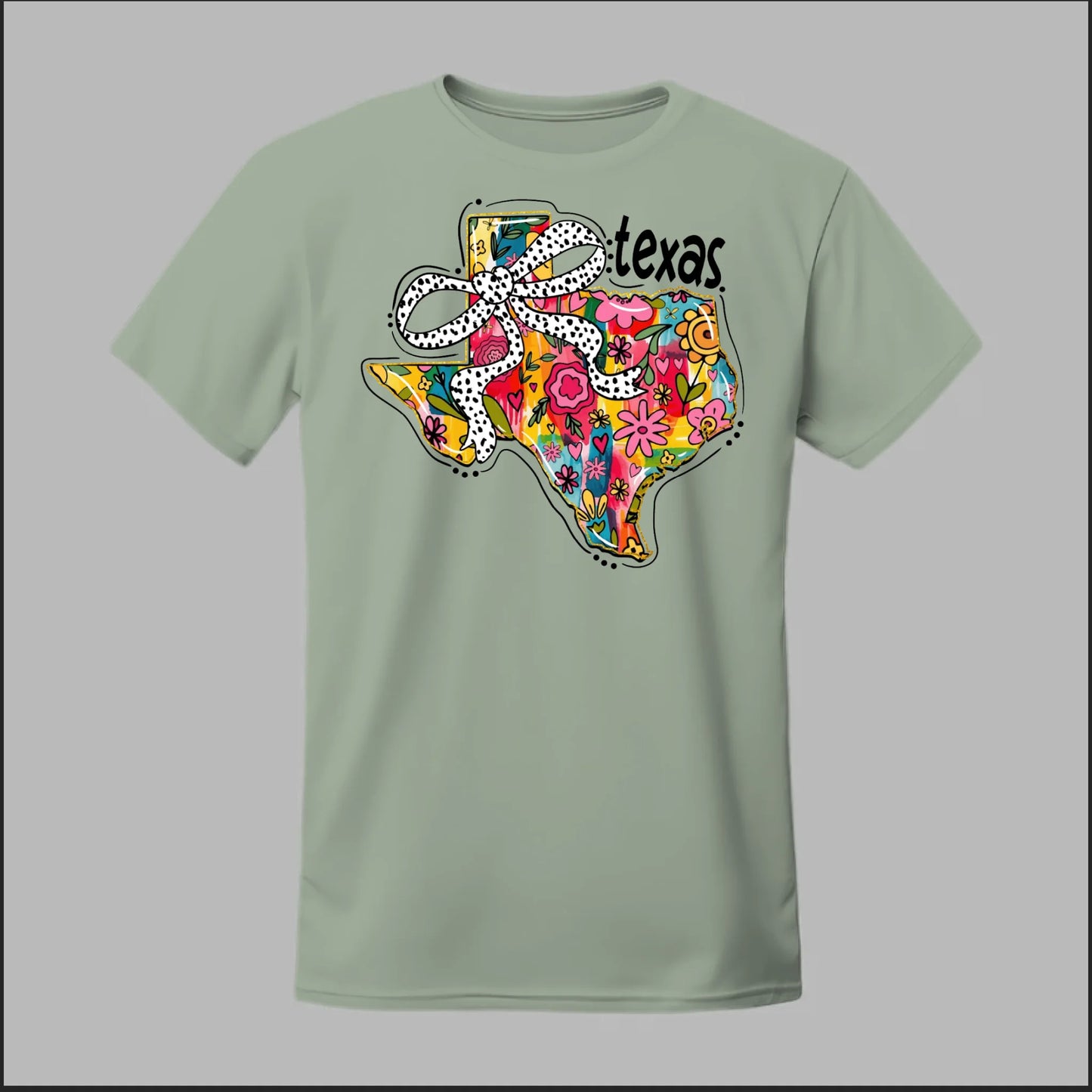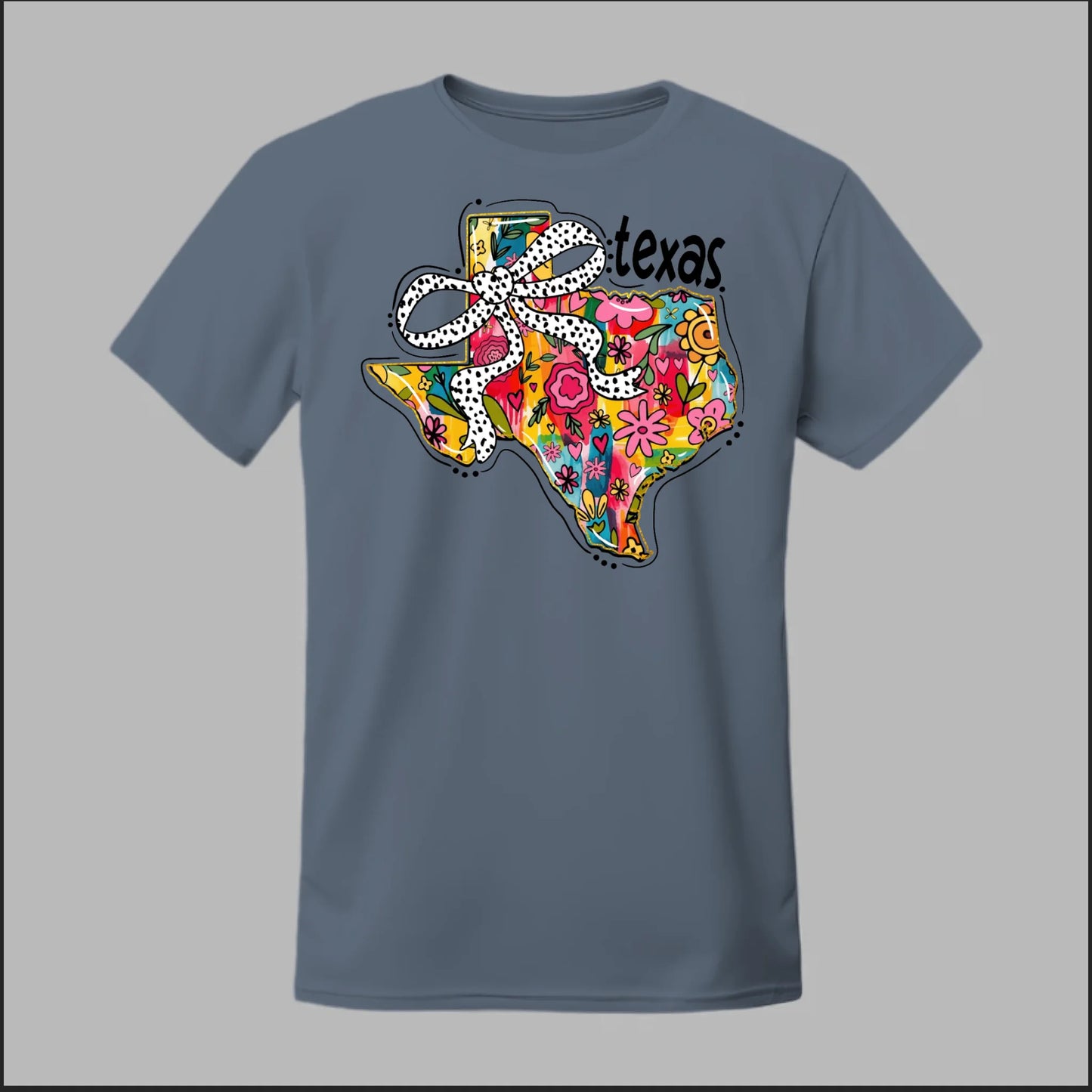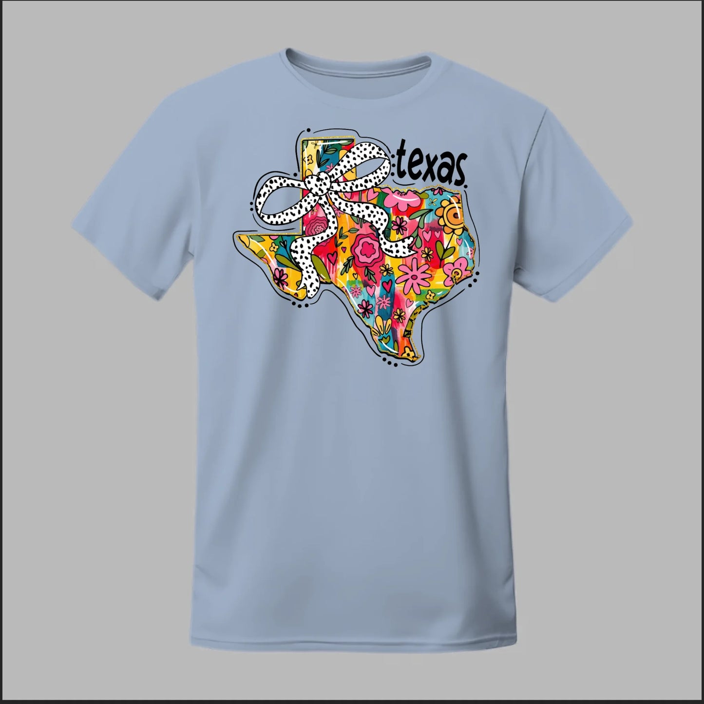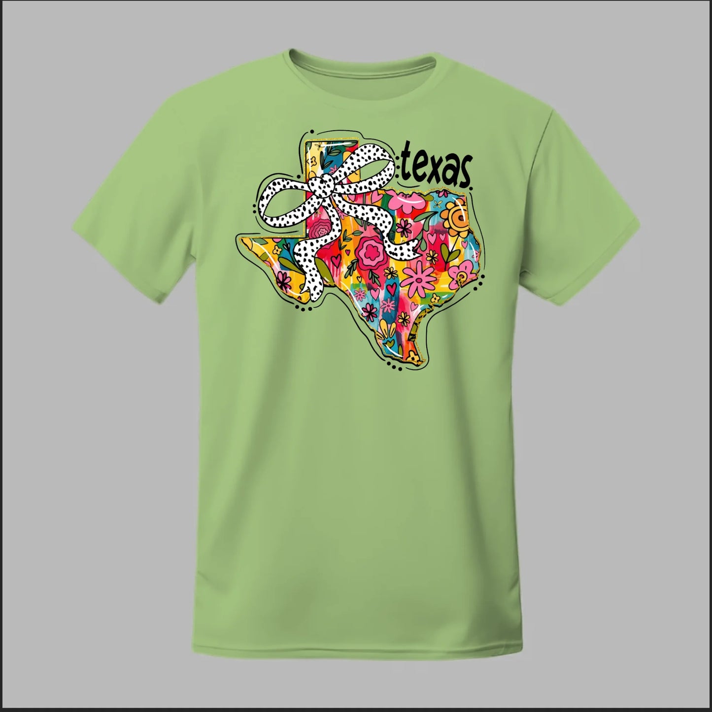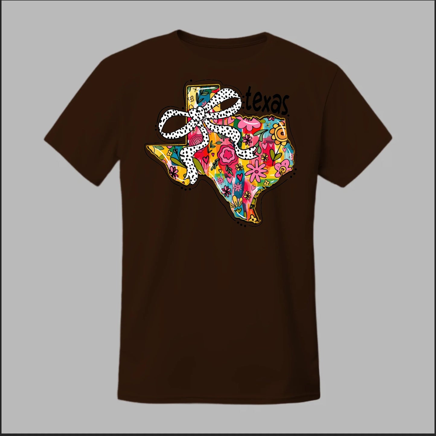 Texas meets feminine flair in this colorful floral design. “Bow’d Up Texas” blends bright hand-drawn flowers, a playful polka-dot bow, and Texas pride into one fun and vibrant look.