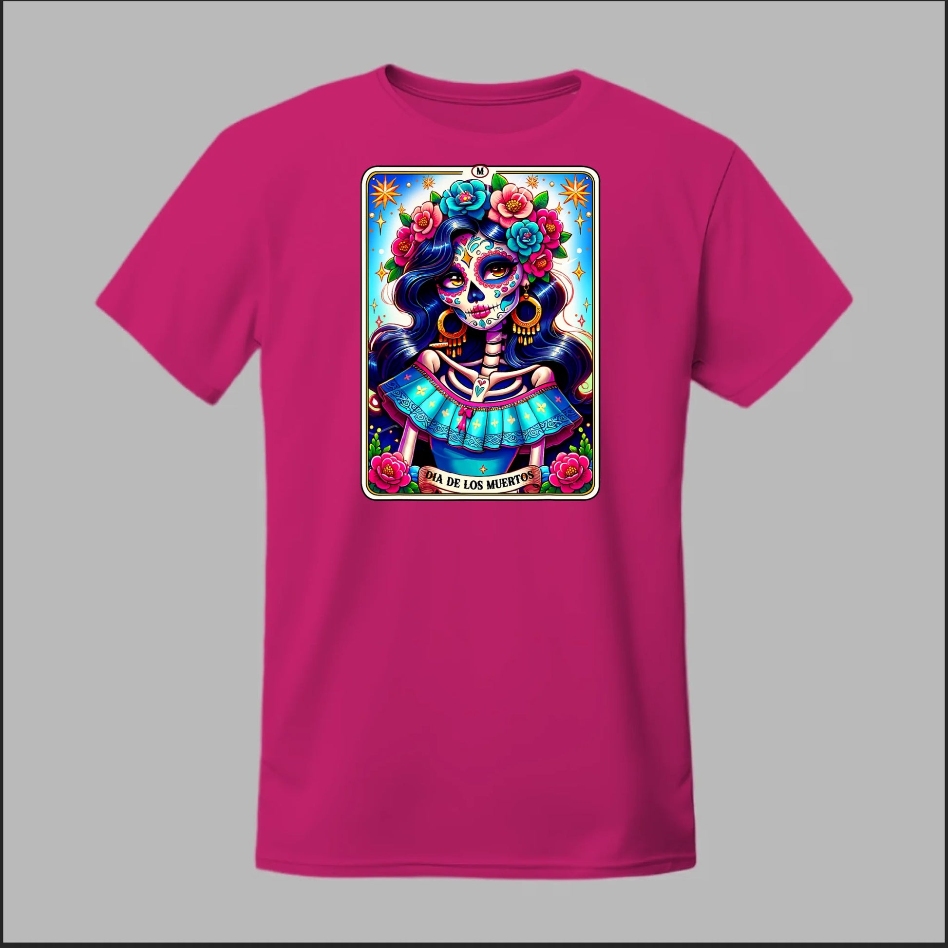 The Catrina Elegante tee brings La Catrina to life in a stunning tarot card style. Adorned with flowers, golden earrings, and intricate sugar skull details, this design captures the elegance and beauty of Mexican tradition, making it a standout piece for any celebration.