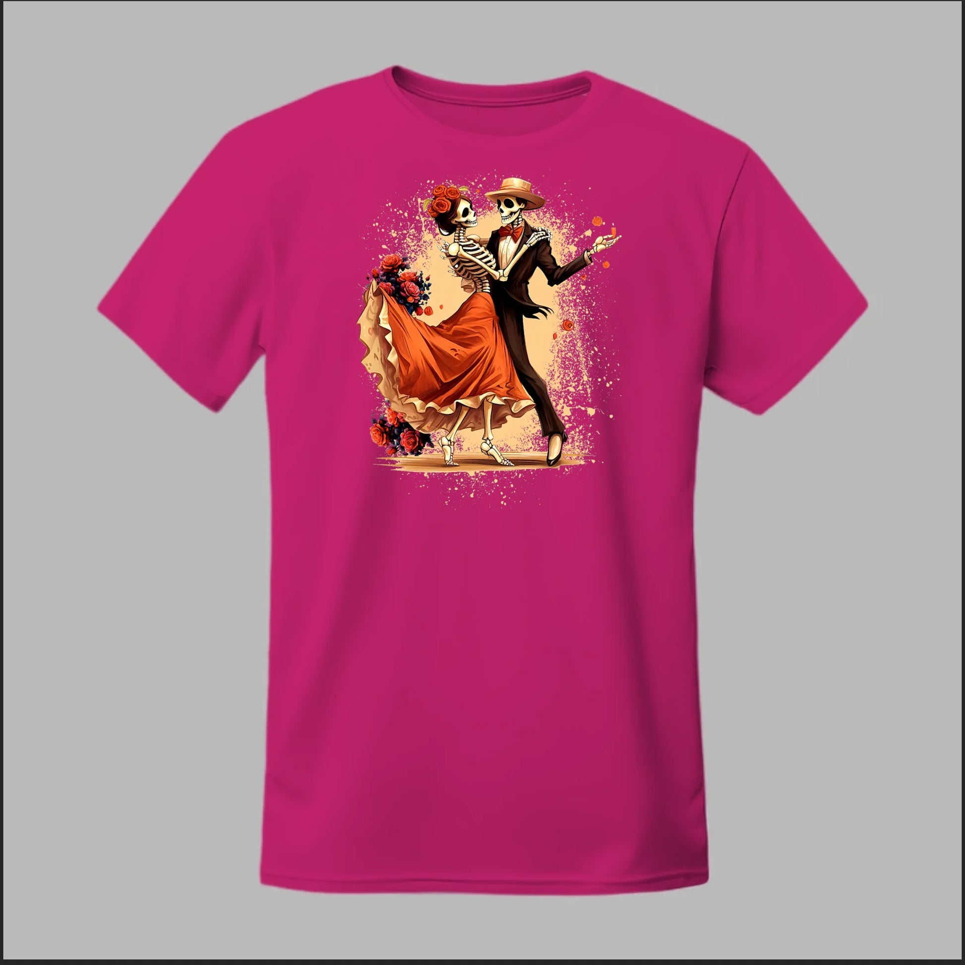 Bring life to tradition with this stunning Día de los Muertos Dancing Skeletons shirt. Featuring a beautifully dressed skeleton couple twirling in style, adorned with roses and elegance, this design celebrates eternal love, culture, and the vibrancy of Mexican heritage. Perfect for honoring the holiday with grace and flair, it’s a must-have for Día de los Muertos celebrations or anyone who loves timeless romance with a bold artistic twist.