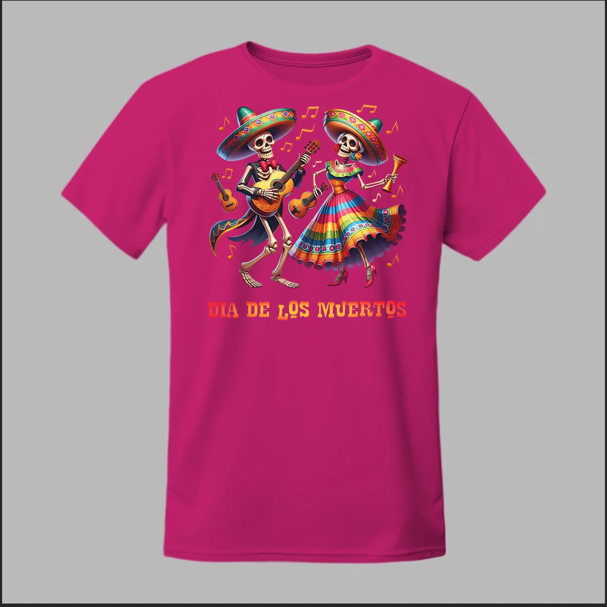 Celebrate culture in style with this Día de los Muertos shirt featuring dancing skeletons in sombreros and vibrant folklórico attire. A lively tribute to music, tradition, and Mexican heritage — perfect for Day of the Dead festivities or year-round pride.