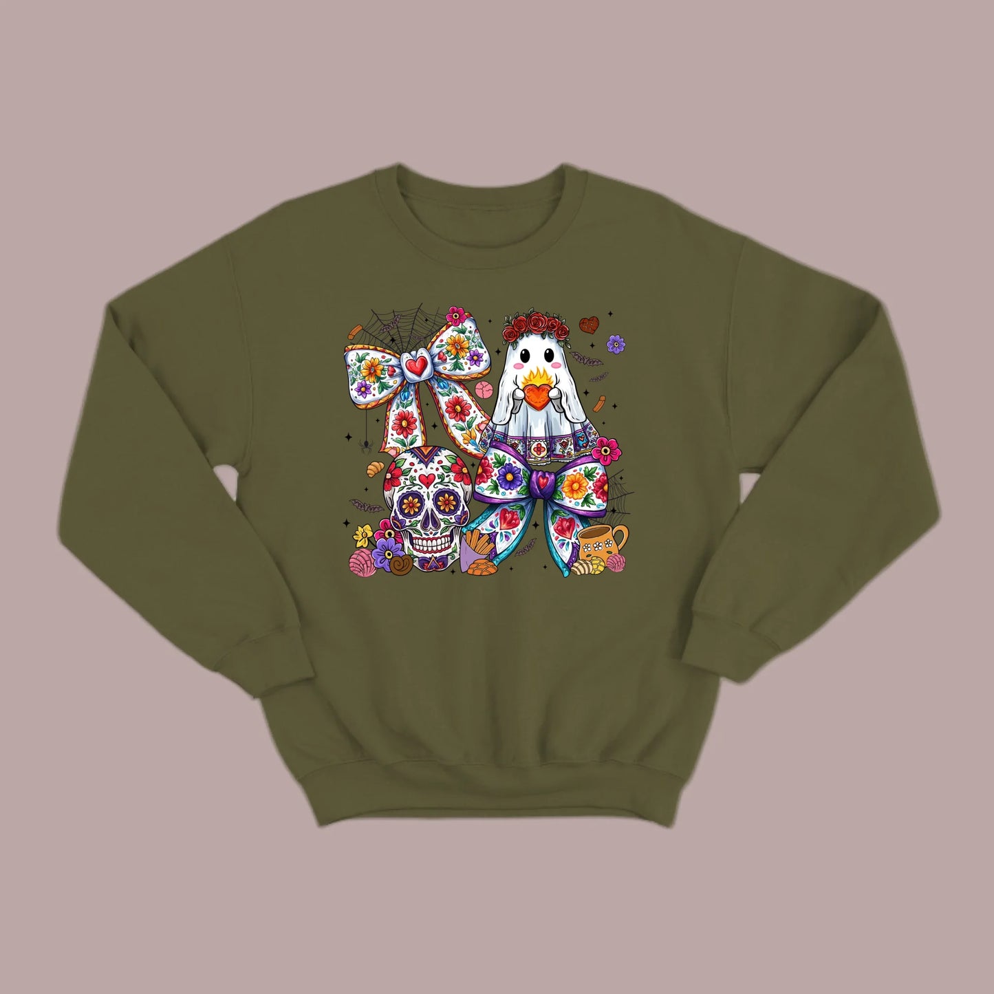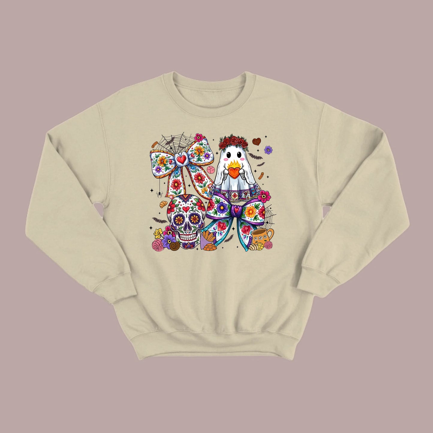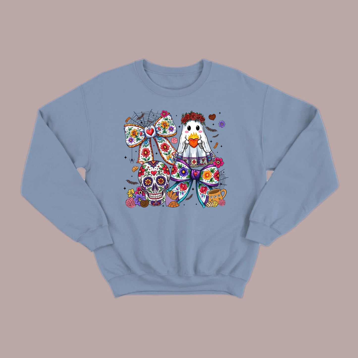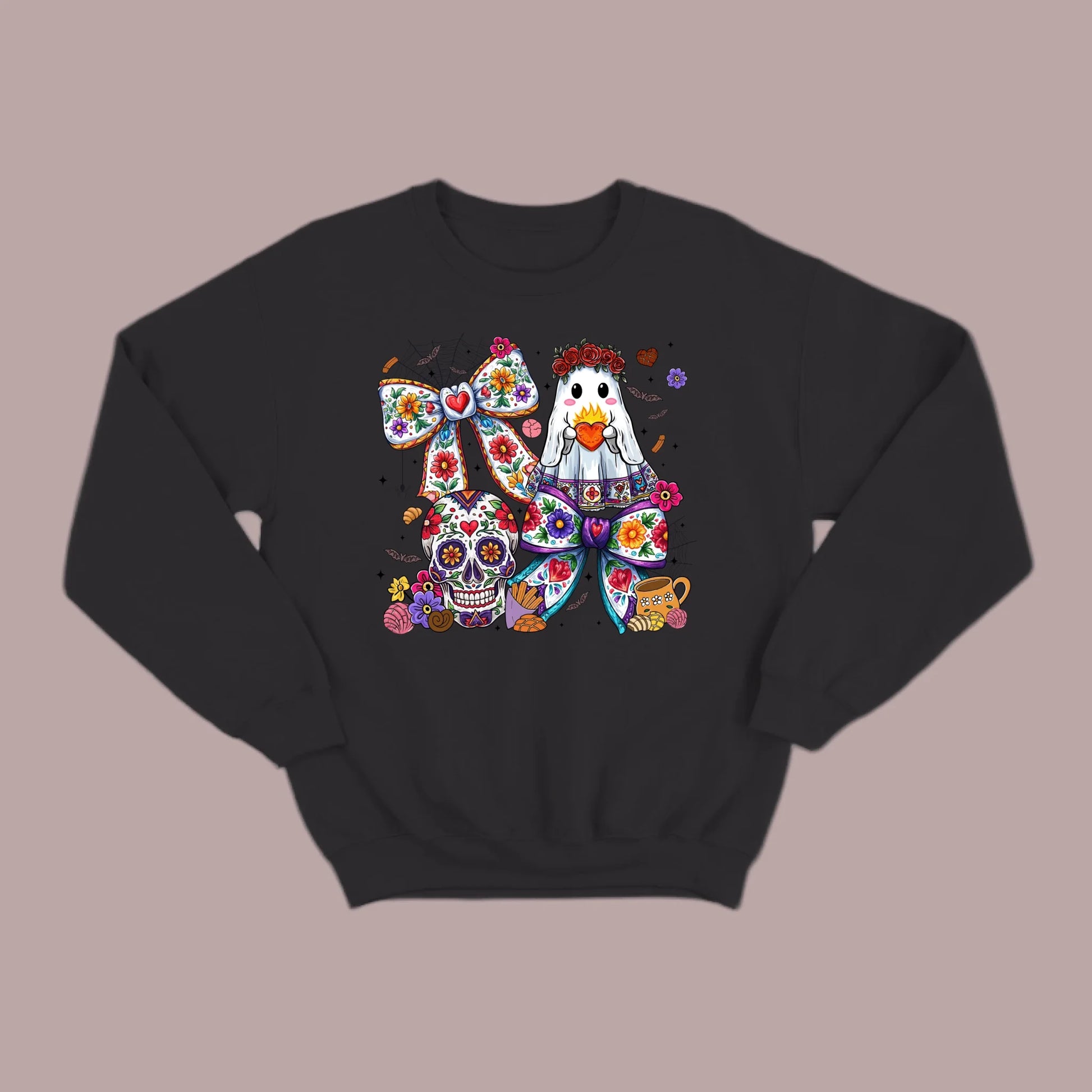 Stay warm and festive with the Día de los Muertos sweatshirt. Featuring a ghost holding a heart, a sugar skull, and bold floral details, this design blends Halloween fun with rich cultural artistry. A cozy and stylish way to honor tradition while keeping your look unique and eye-catching.