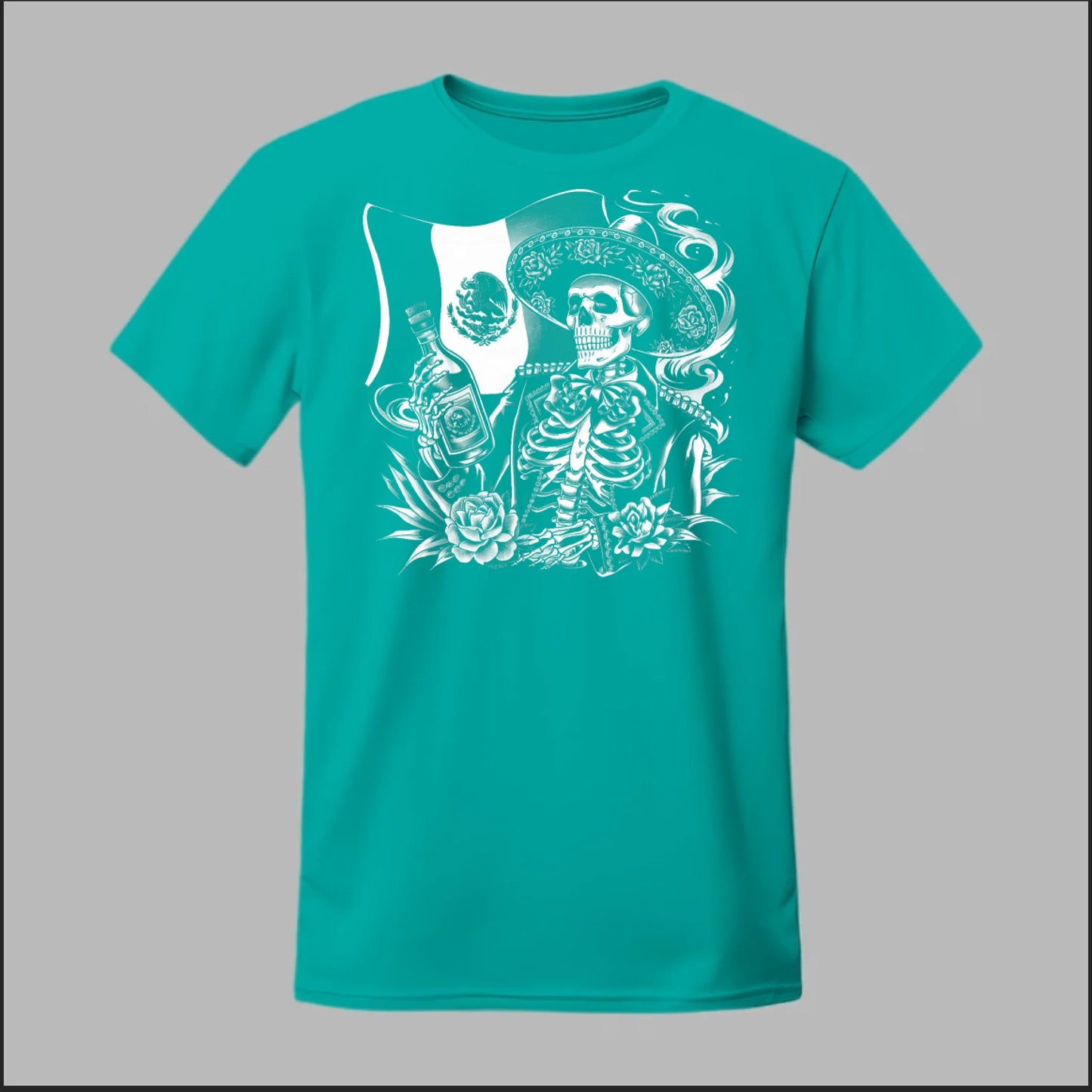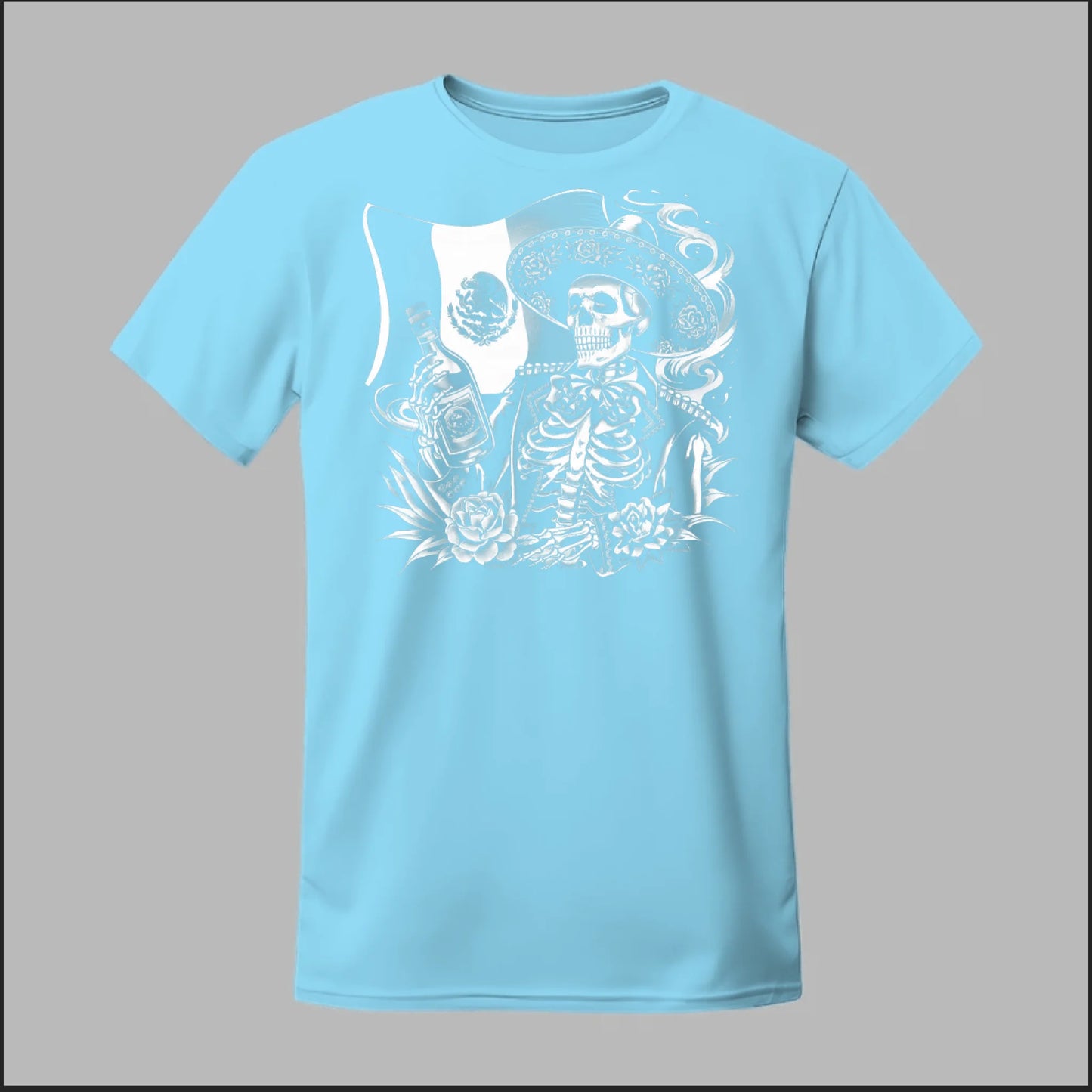 Celebrate life and honor tradition with this striking “El Brindis del Alma” tee. Featuring a skeleton mariachi raising a tequila bottle against the Mexican flag, surrounded by agave and roses, this design captures the fiery spirit of Mexico. Perfect for Día de los Muertos, fiestas, or anyone who loves bold cultural style.