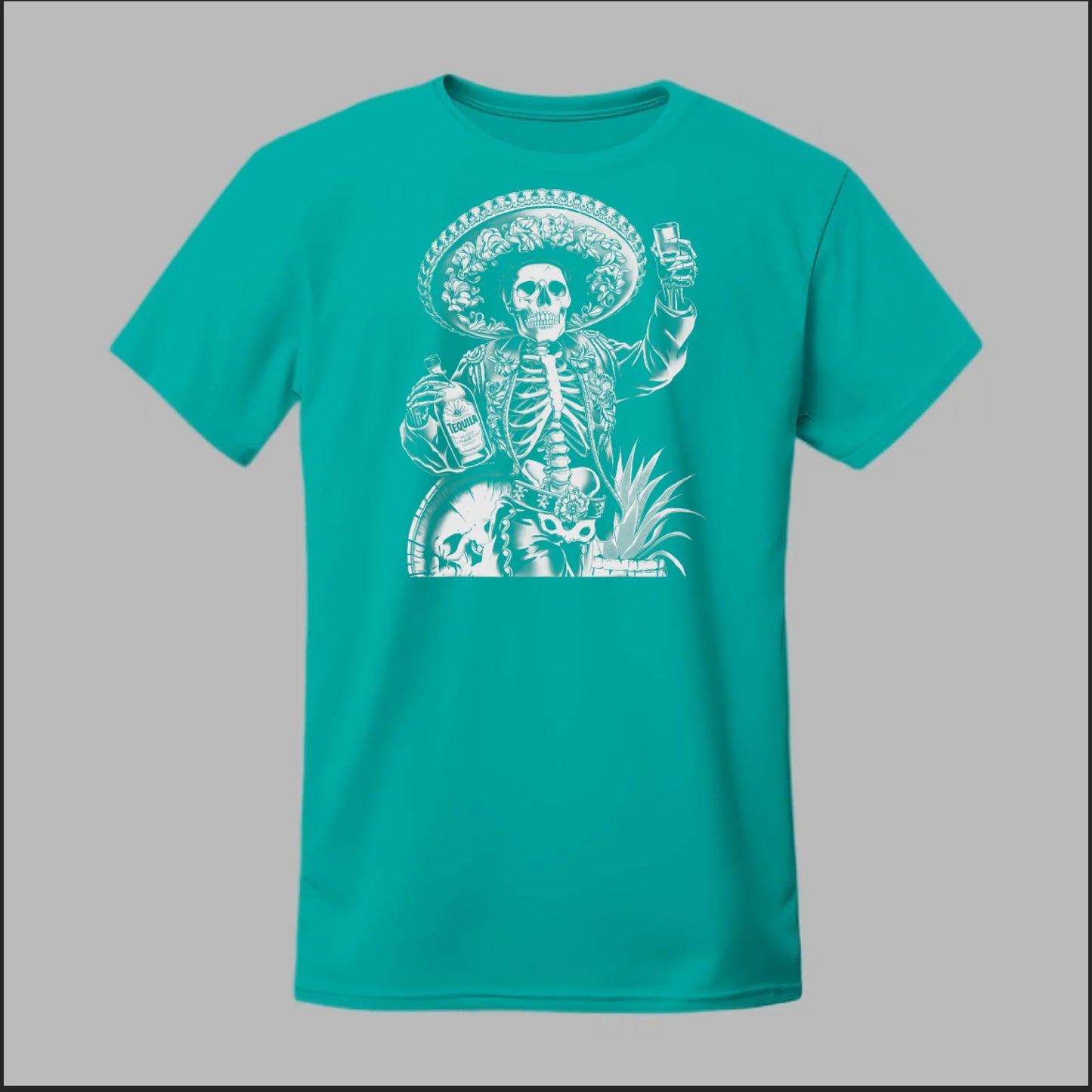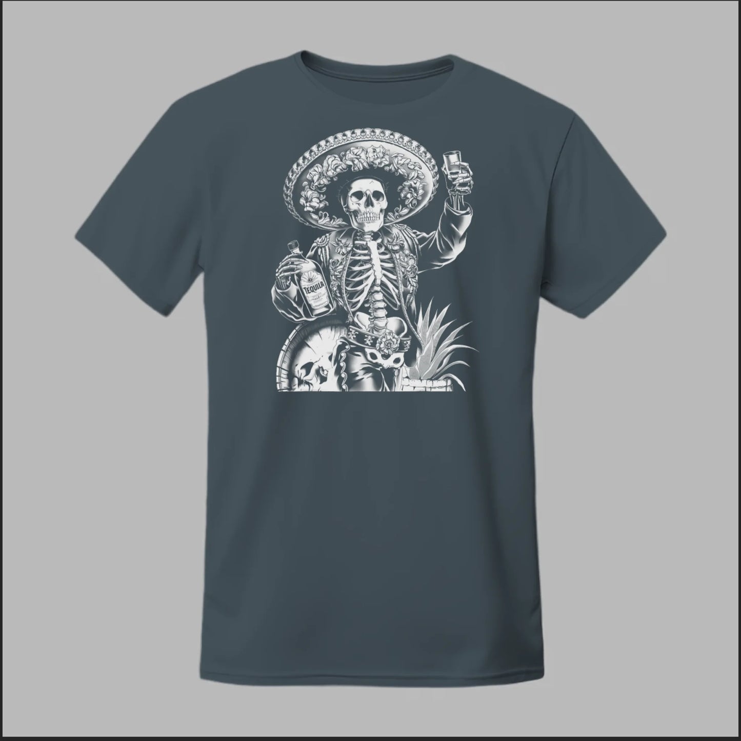 Raise your glass with “El Grito de Tequila.” This bold tee features a skeleton mariachi holding both a tequila bottle and a raised shot glass, framed by roses, agave, and ornate sombrero details. A design that captures the energy of Mexico’s proud heritage and the spirit of the toast — ¡Salud!