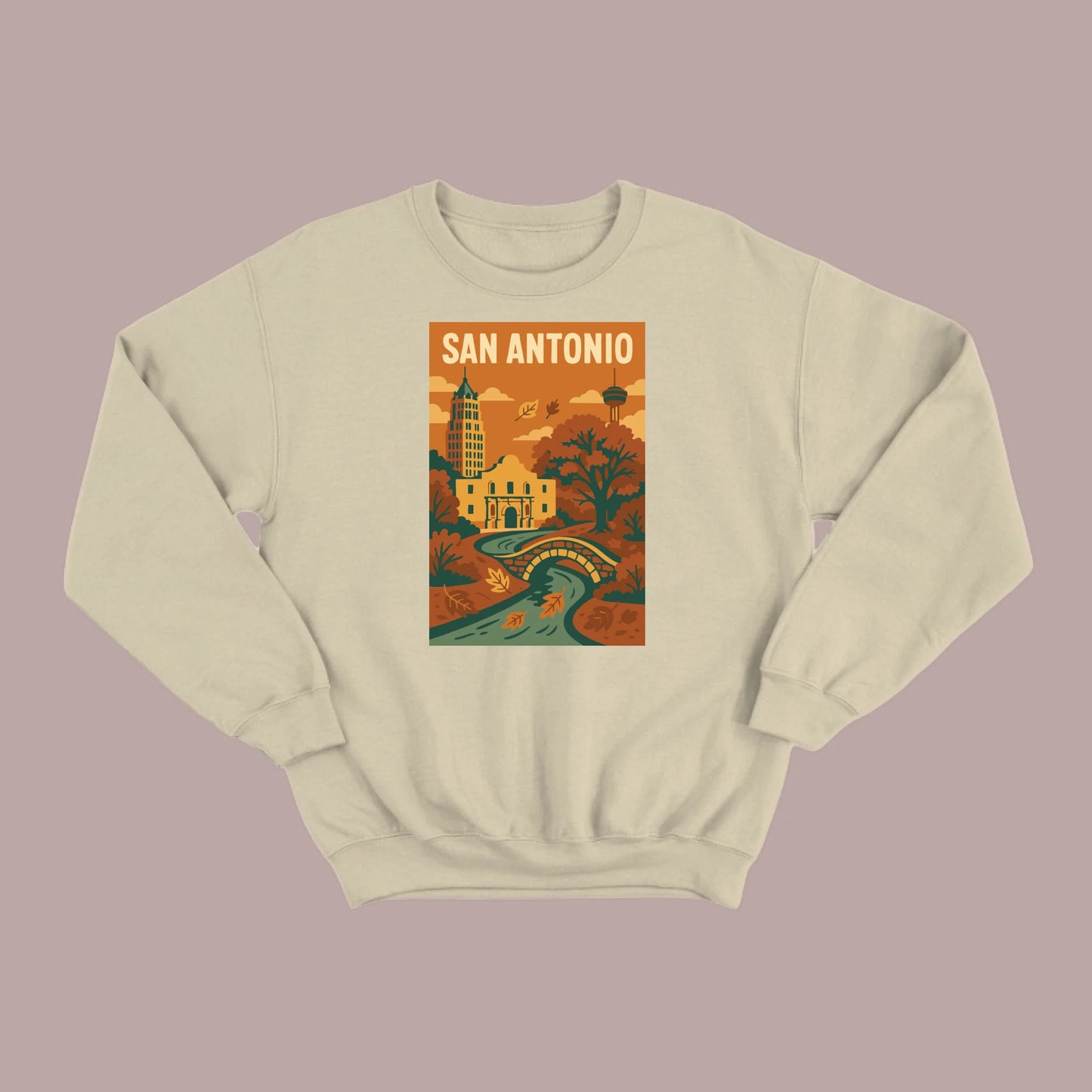 Celebrate the charm of San Antonio in the fall with this beautifully illustrated design. Featuring iconic landmarks like the Alamo, the Tower of the Americas, and the city’s skyline surrounded by autumn leaves and warm seasonal colors, it’s the perfect piece for locals, visitors, and anyone who loves San Antonio’s unique vibe. Whether you’re strolling the River Walk or cozying up for fall, this shirt/sweatshirt is a must-have.