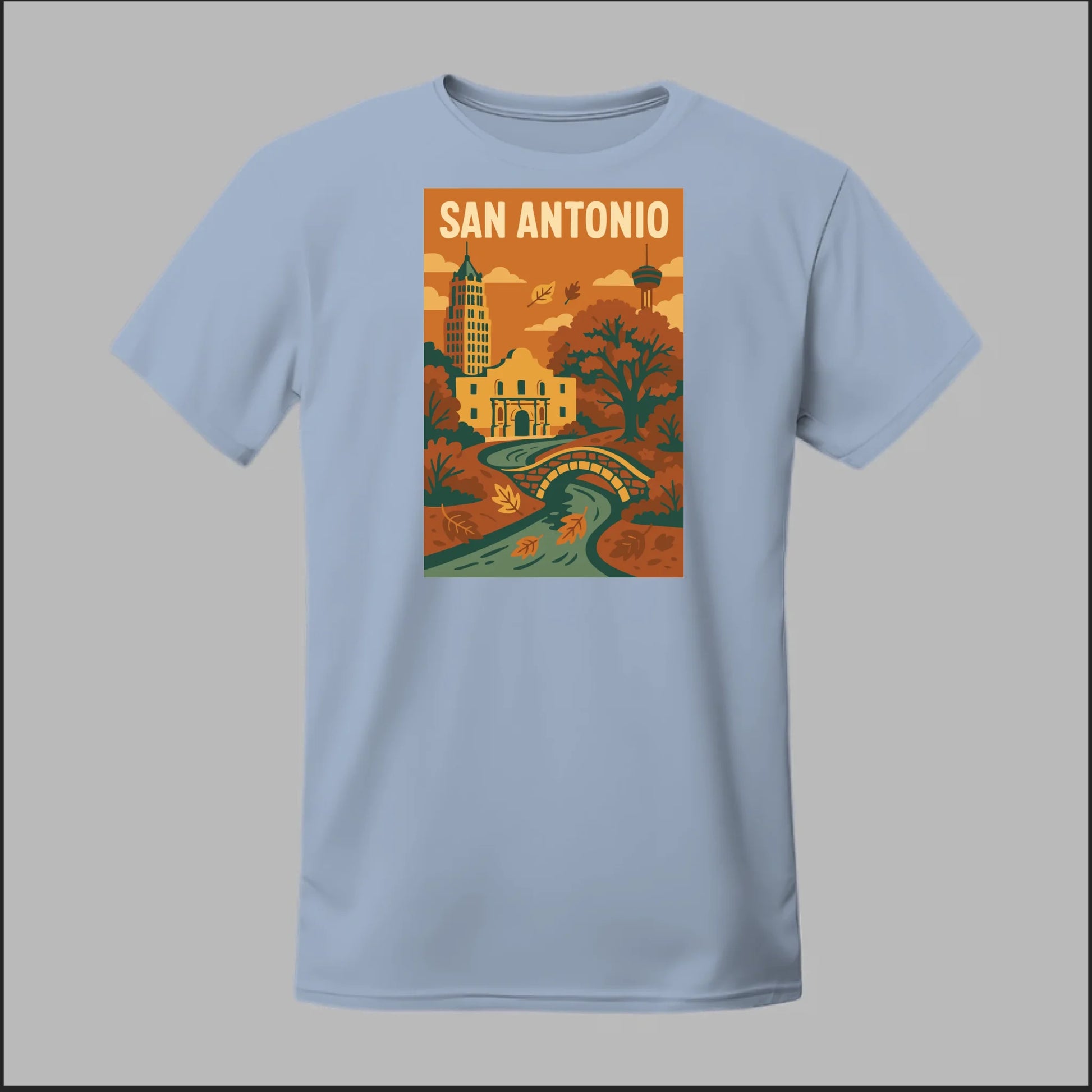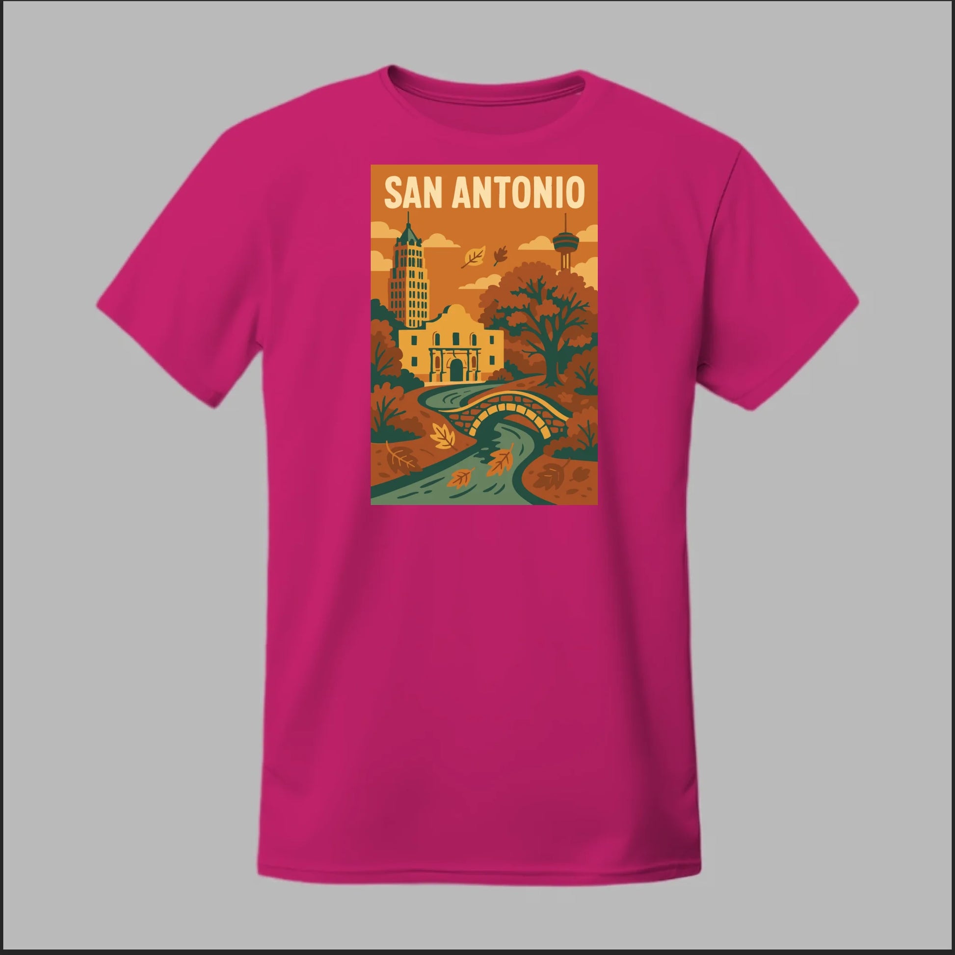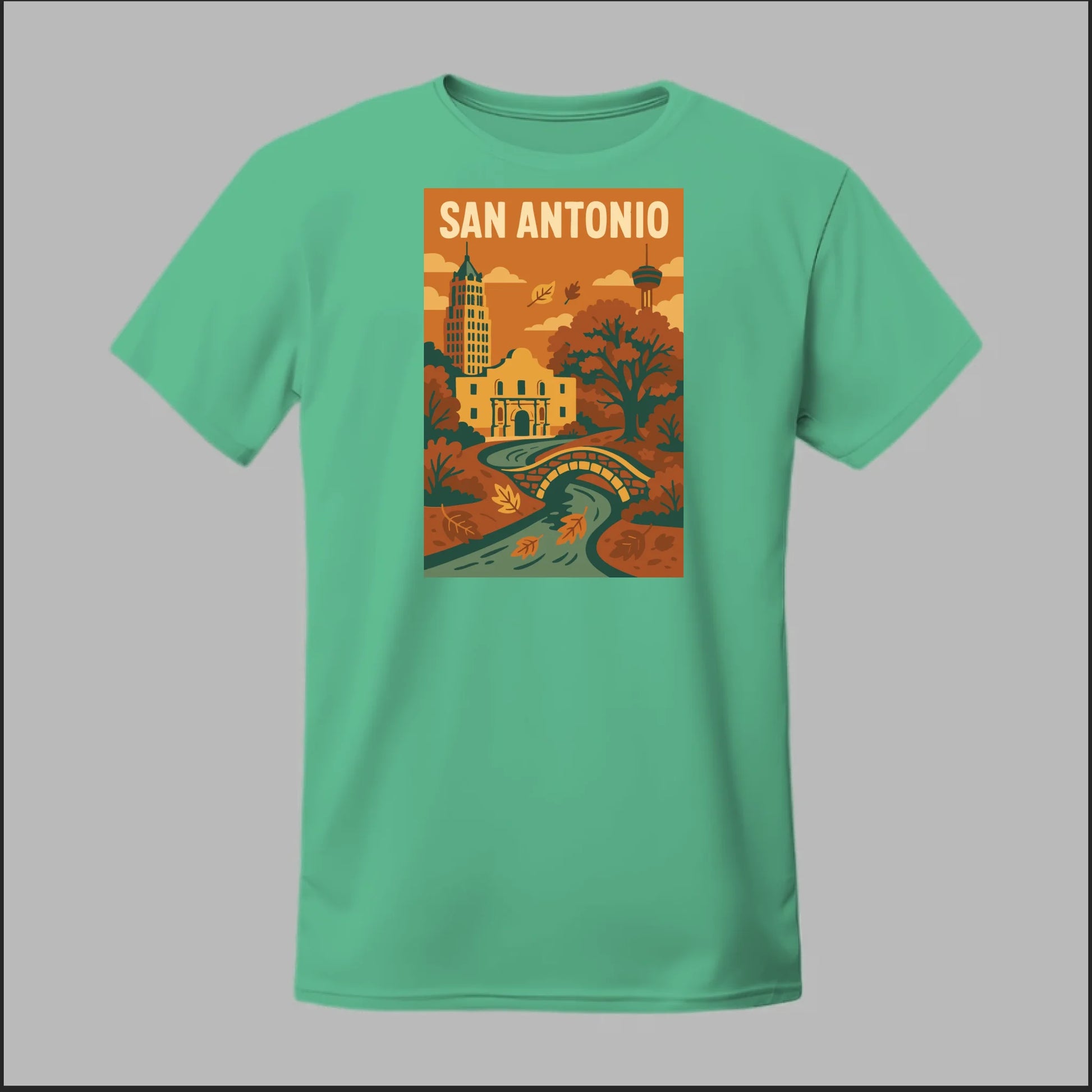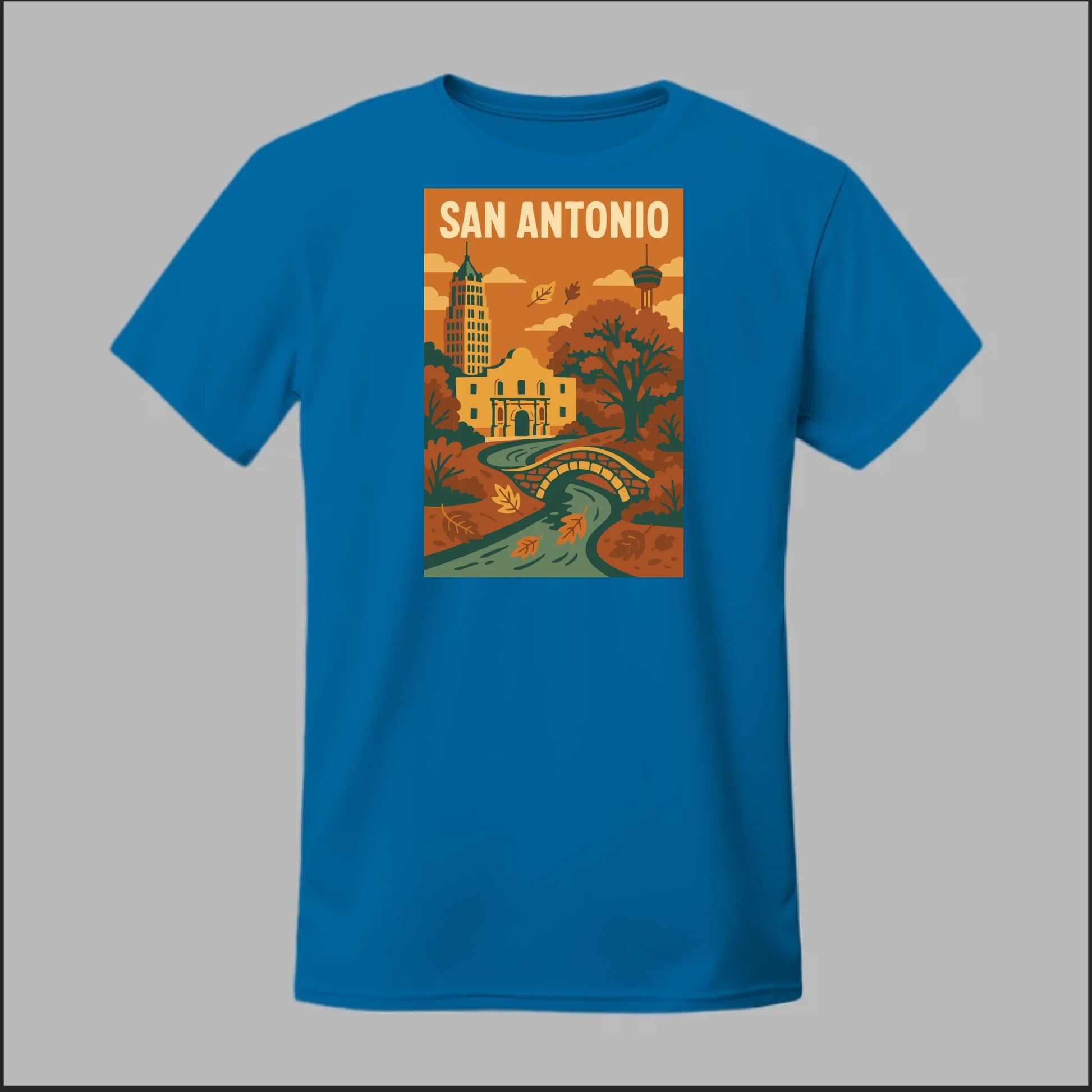 Celebrate the charm of San Antonio in the fall with this beautifully illustrated design. Featuring iconic landmarks like the Alamo, the Tower of the Americas, and the city’s skyline surrounded by autumn leaves and warm seasonal colors, it’s the perfect piece for locals, visitors, and anyone who loves San Antonio’s unique vibe. Whether you’re strolling the River Walk or cozying up for fall, this shirt/sweatshirt is a must-have.