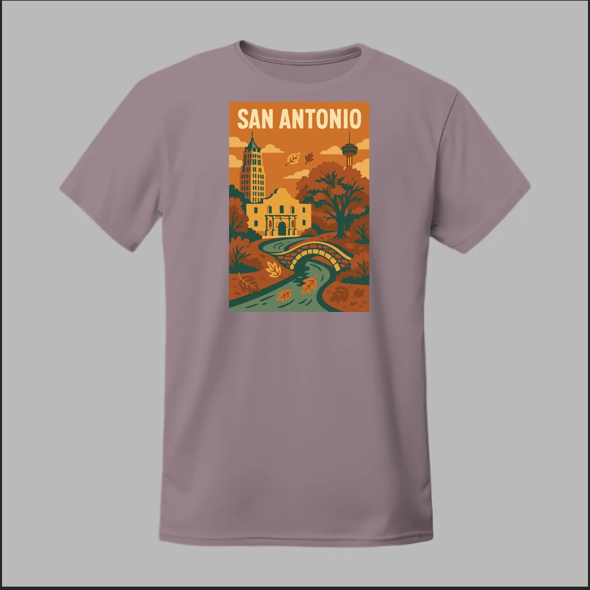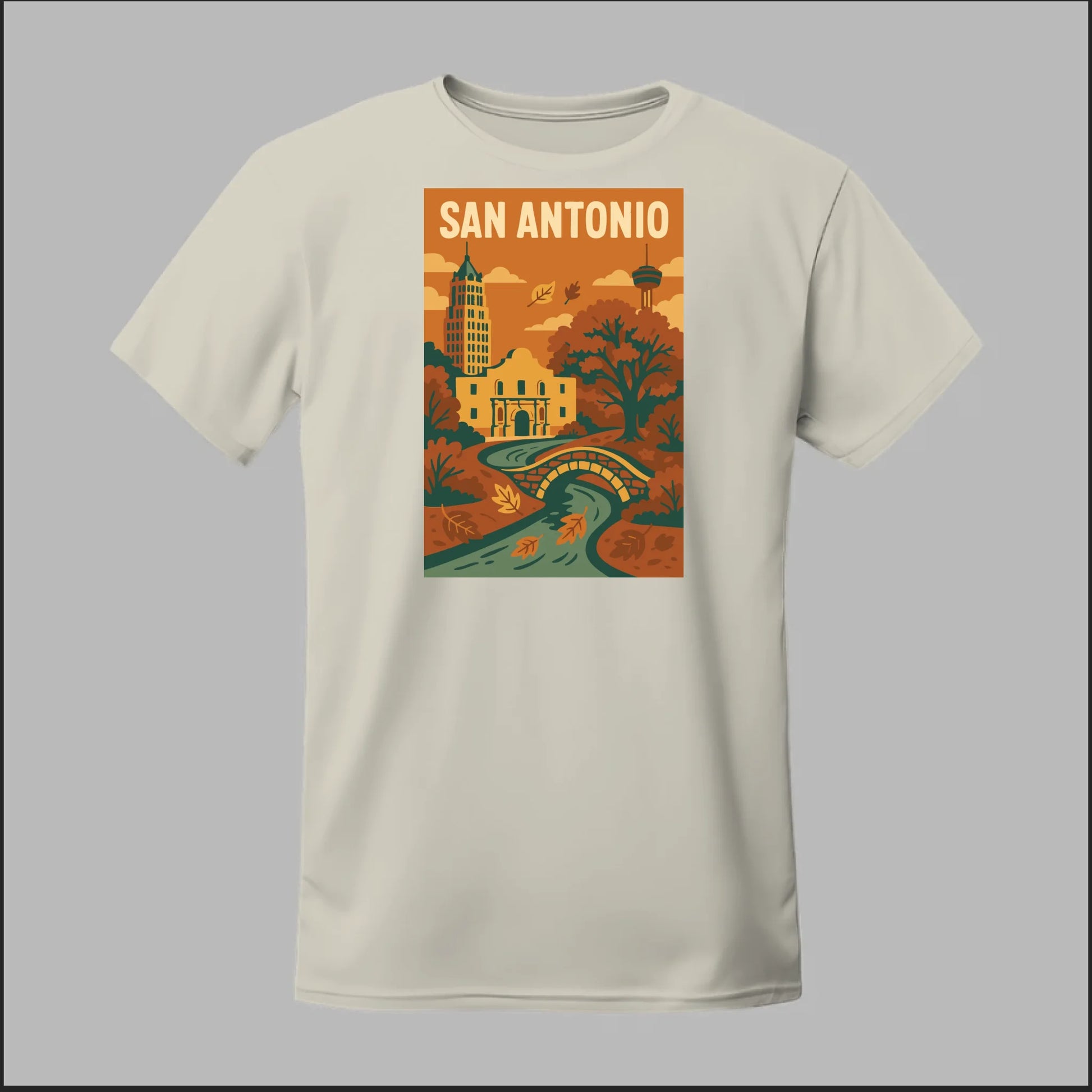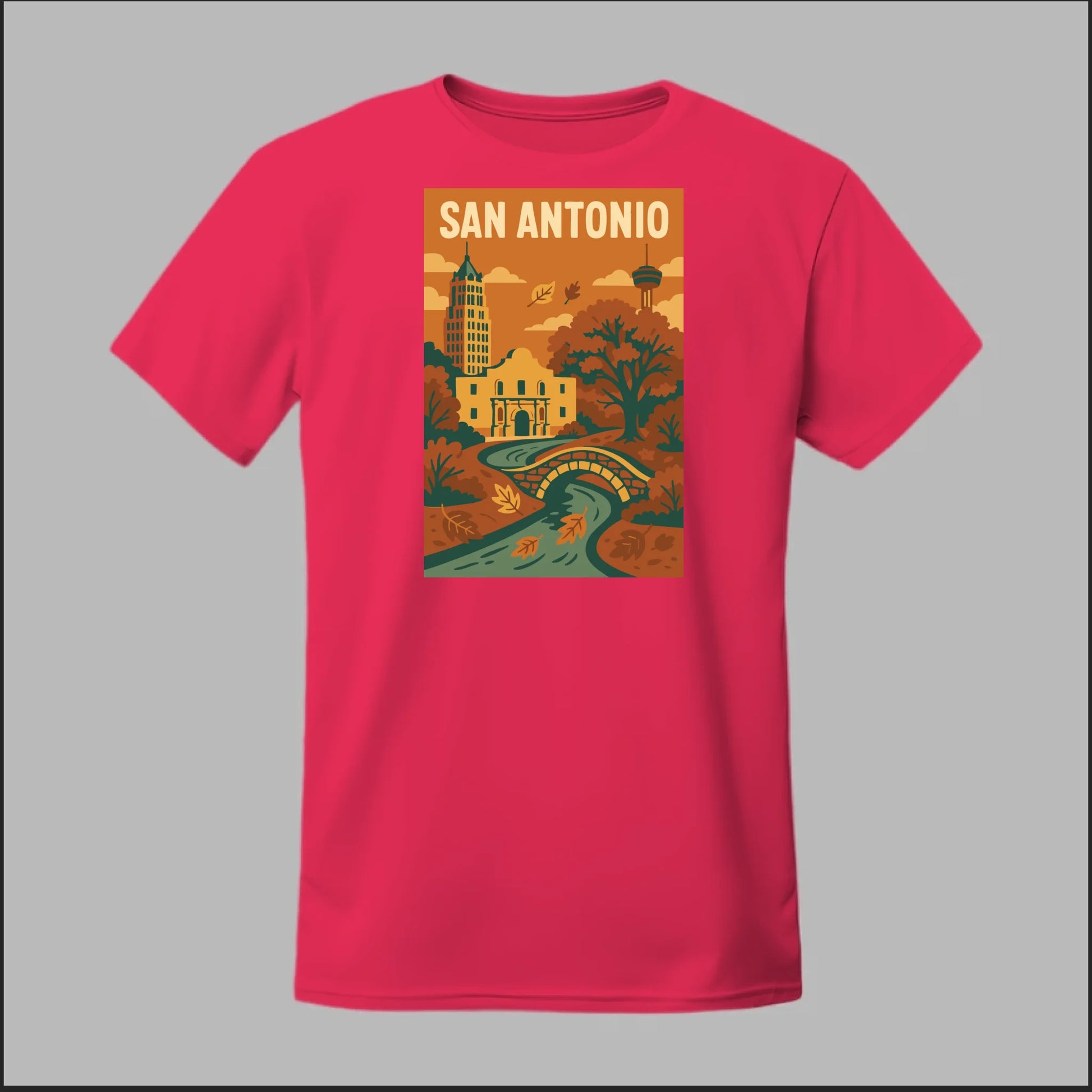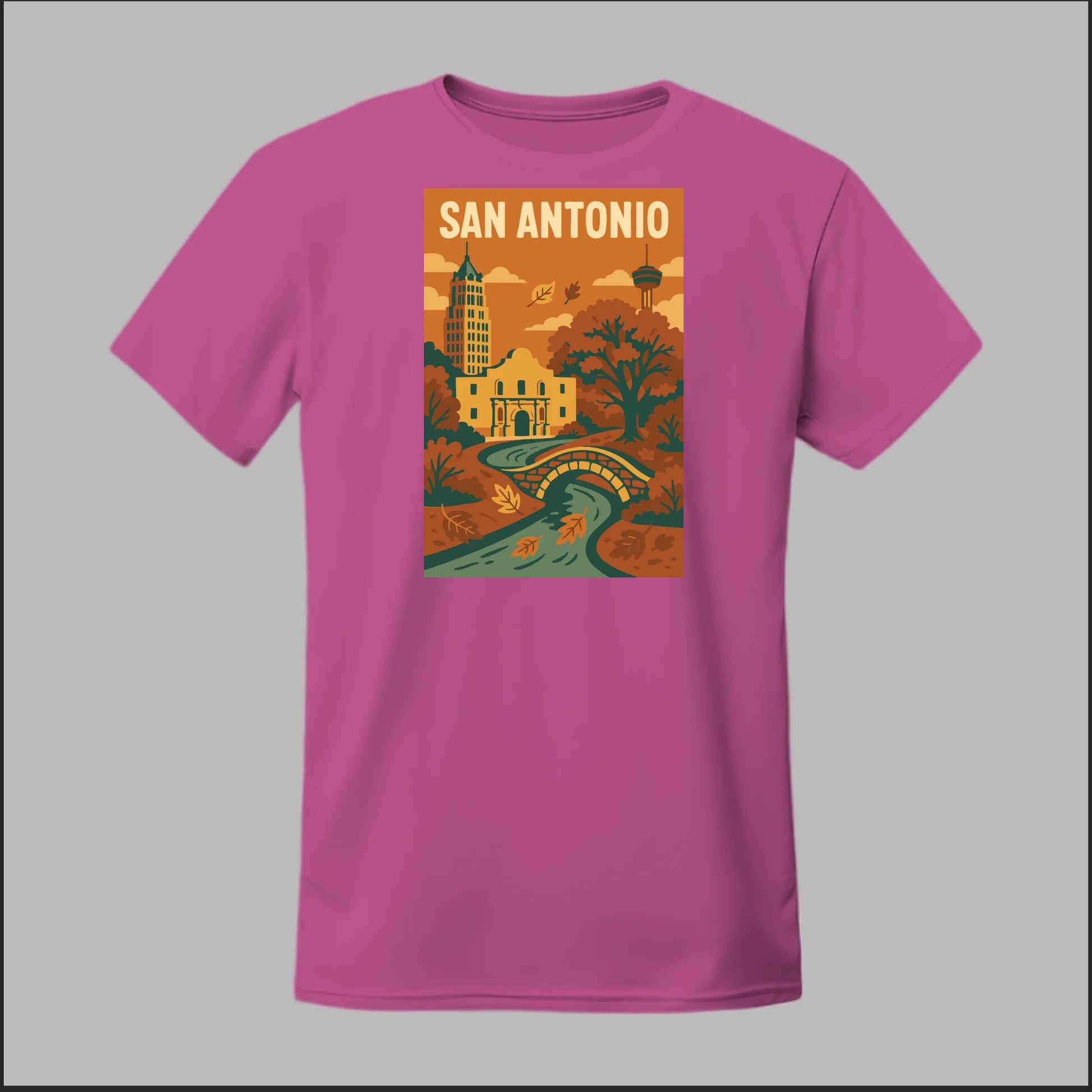 Celebrate the charm of San Antonio in the fall with this beautifully illustrated design. Featuring iconic landmarks like the Alamo, the Tower of the Americas, and the city’s skyline surrounded by autumn leaves and warm seasonal colors, it’s the perfect piece for locals, visitors, and anyone who loves San Antonio’s unique vibe. Whether you’re strolling the River Walk or cozying up for fall, this shirt/sweatshirt is a must-have.