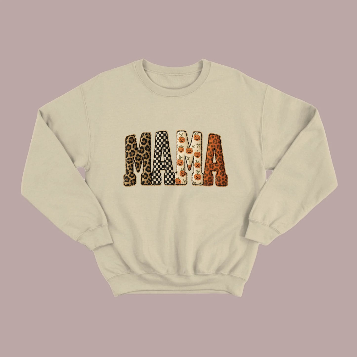 Cozy up in fall vibes with this playful “MAMA” sweatshirt! The patchwork letters mix leopard print, checkered style, and smiling pumpkins, making it the perfect comfy layer for school games, pumpkin spice runs, or family movie nights.