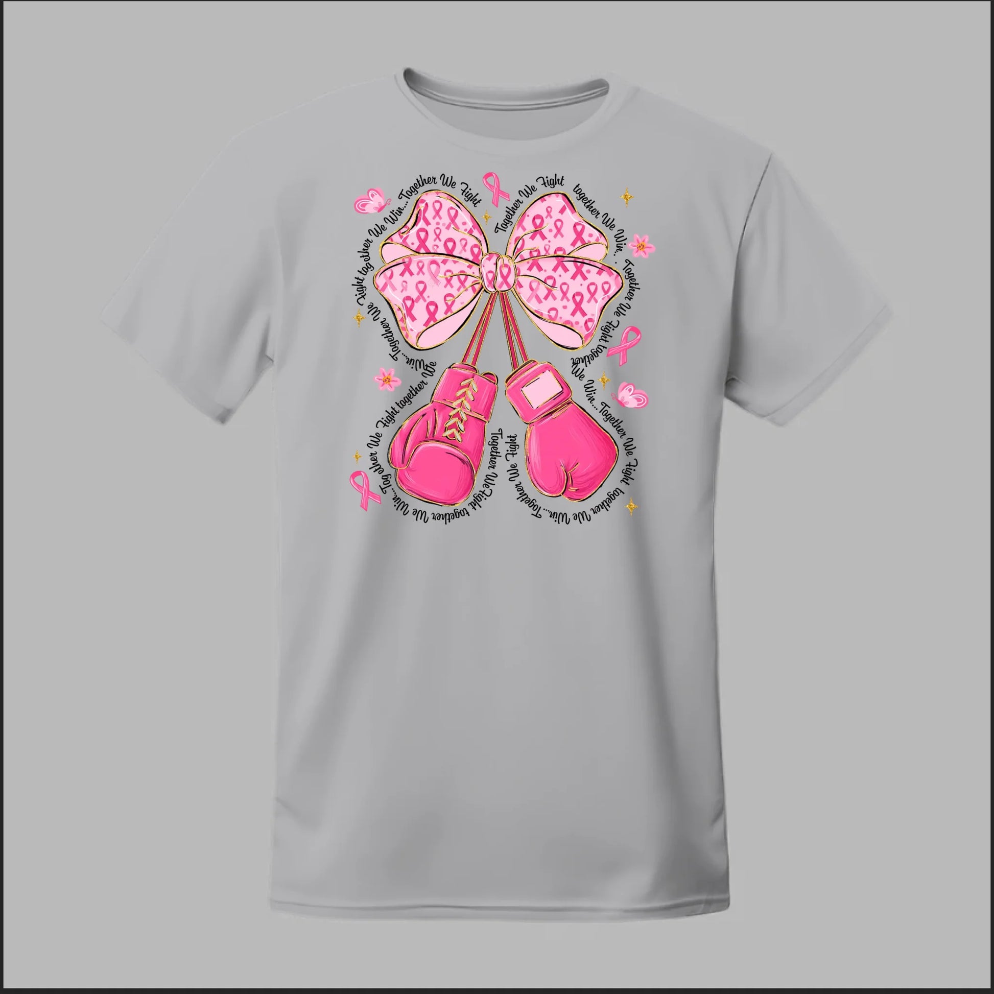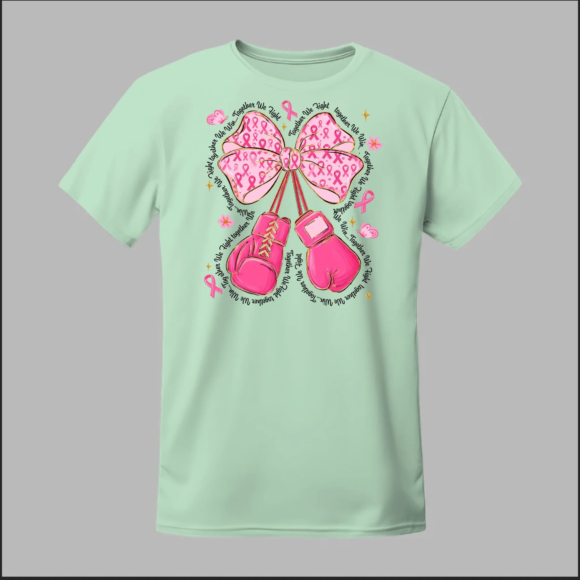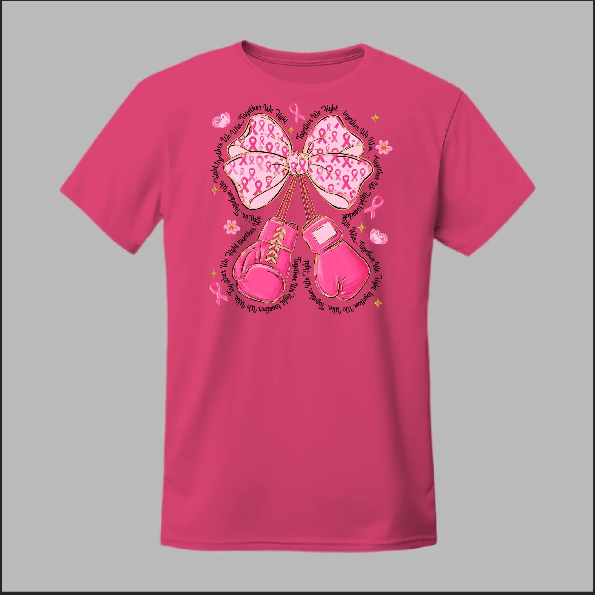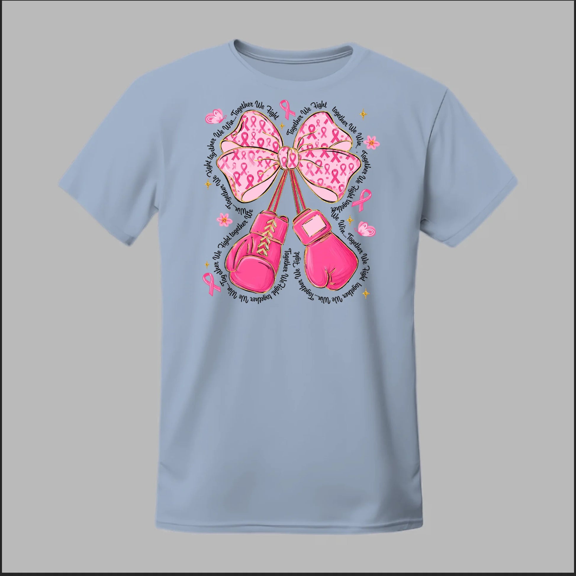 The Fight with Strength & Style Tee blends toughness and elegance, featuring bold pink boxing gloves tied with a breast cancer ribbon bow. Surrounded by ribbons, stars, and butterflies, this design symbolizes resilience, hope, and the unbreakable spirit of those battling breast cancer. Perfect for showing your support and standing strong in the fight.