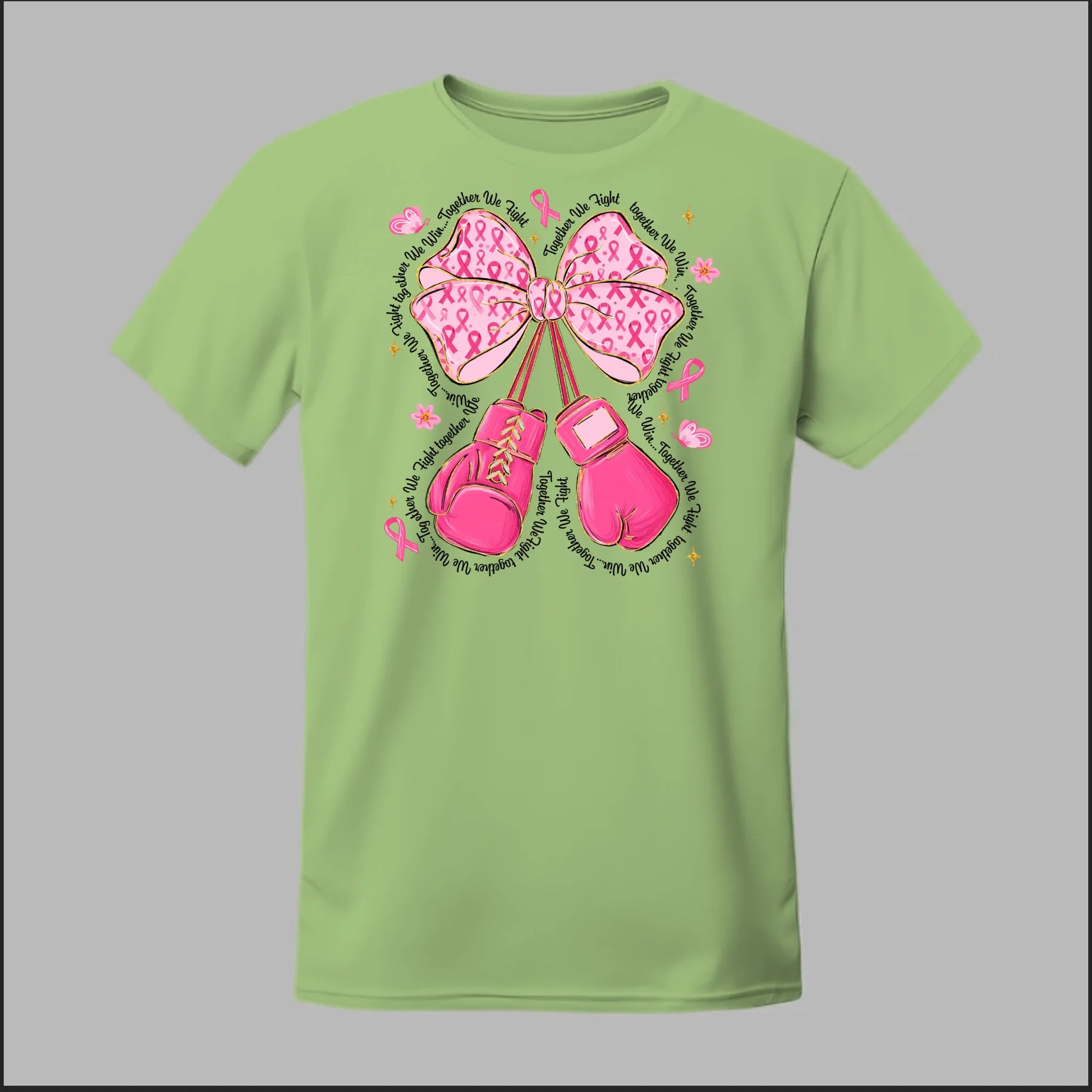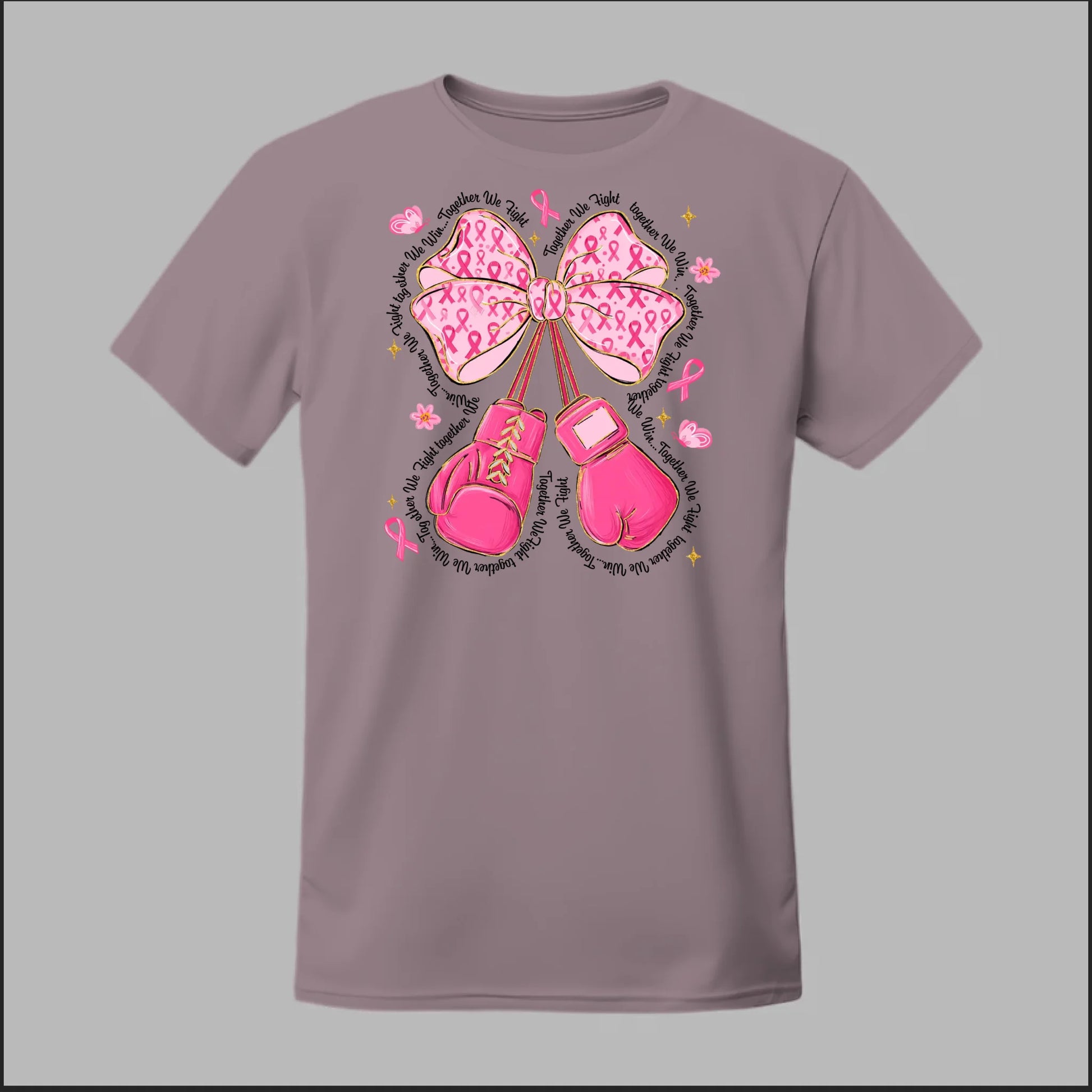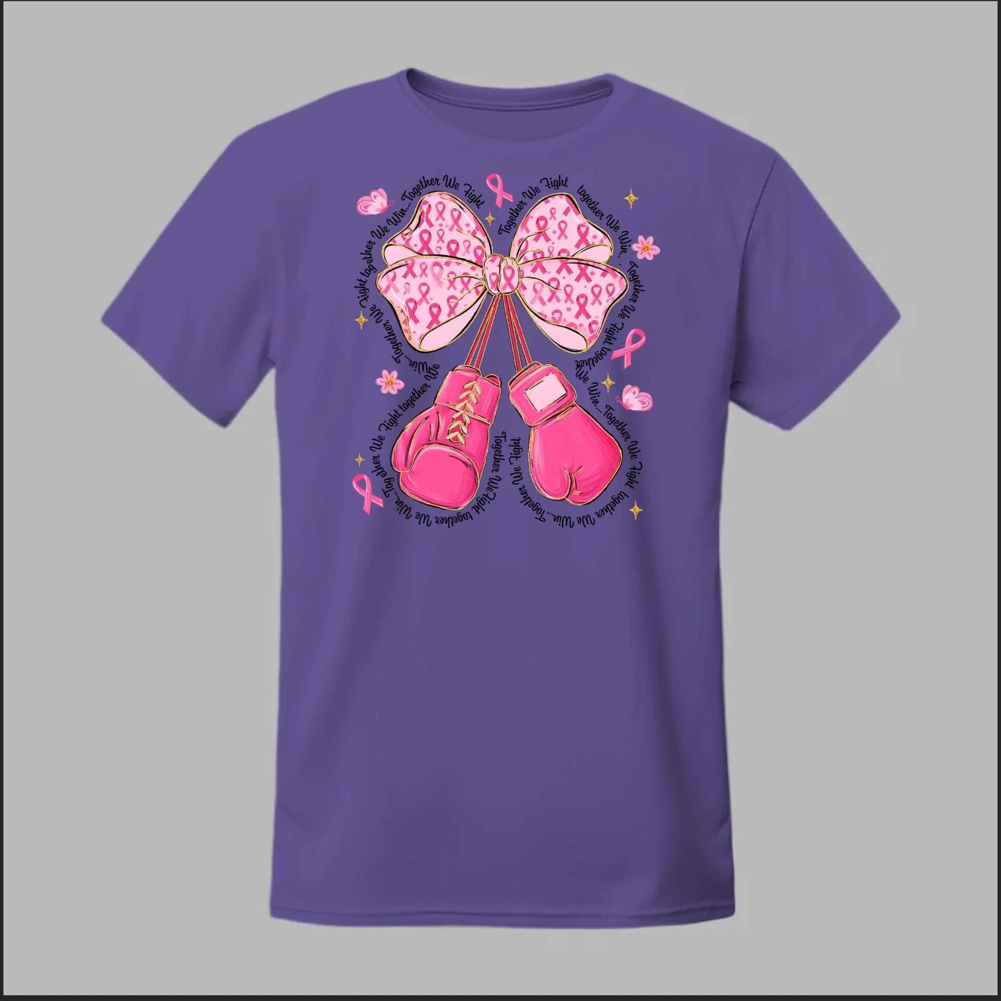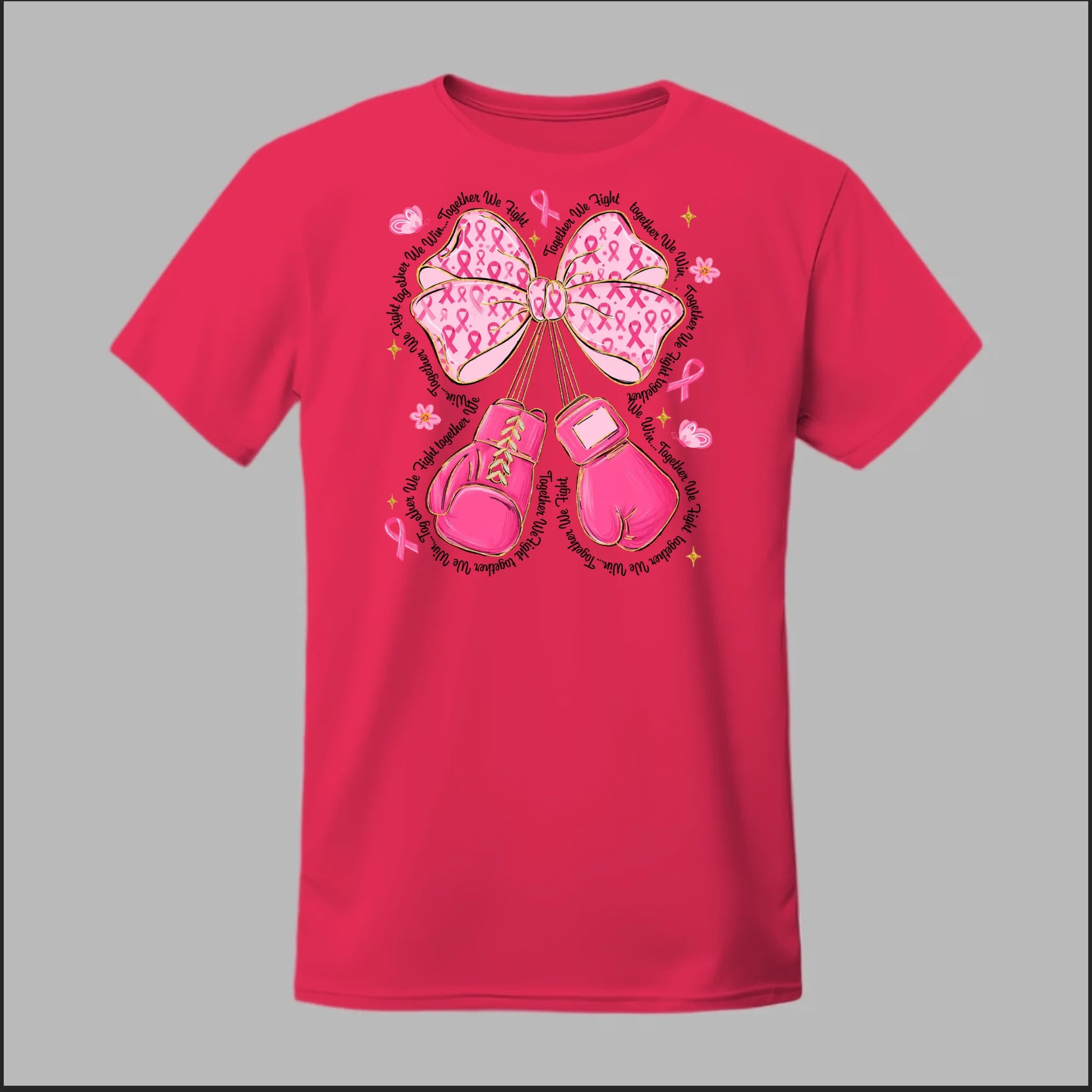 The Fight with Strength & Style Tee blends toughness and elegance, featuring bold pink boxing gloves tied with a breast cancer ribbon bow. Surrounded by ribbons, stars, and butterflies, this design symbolizes resilience, hope, and the unbreakable spirit of those battling breast cancer. Perfect for showing your support and standing strong in the fight.