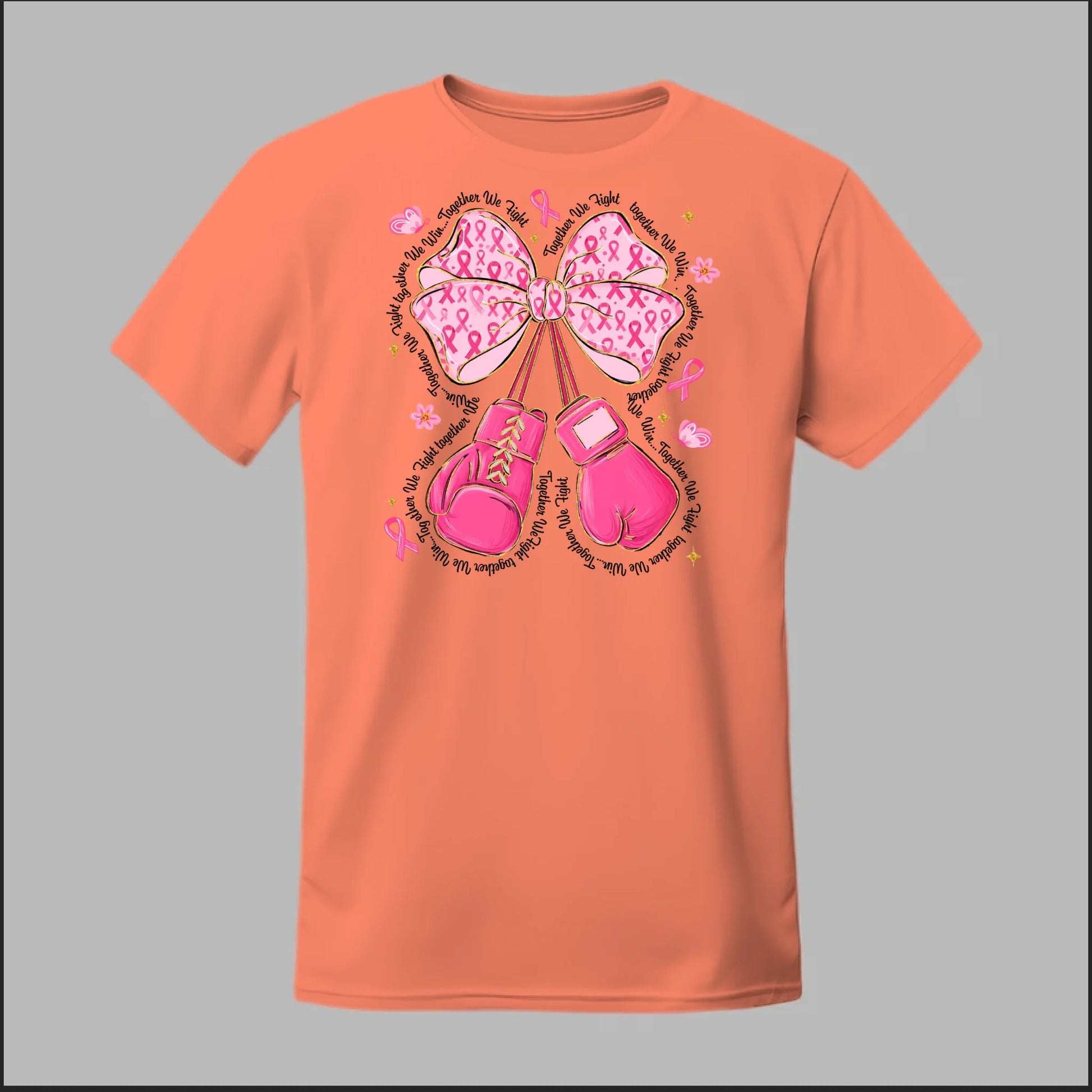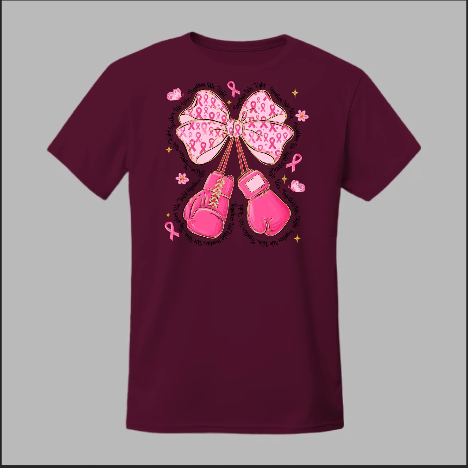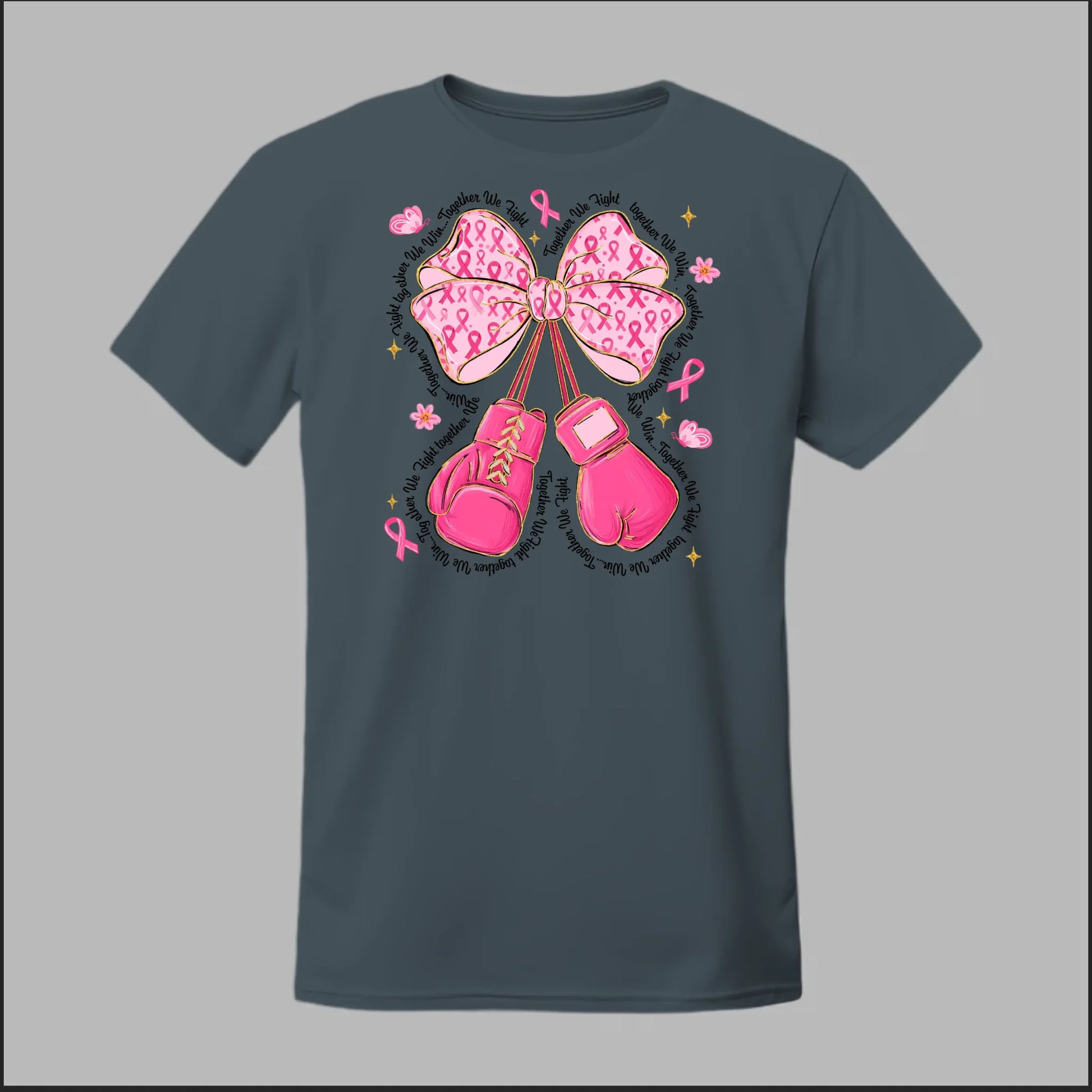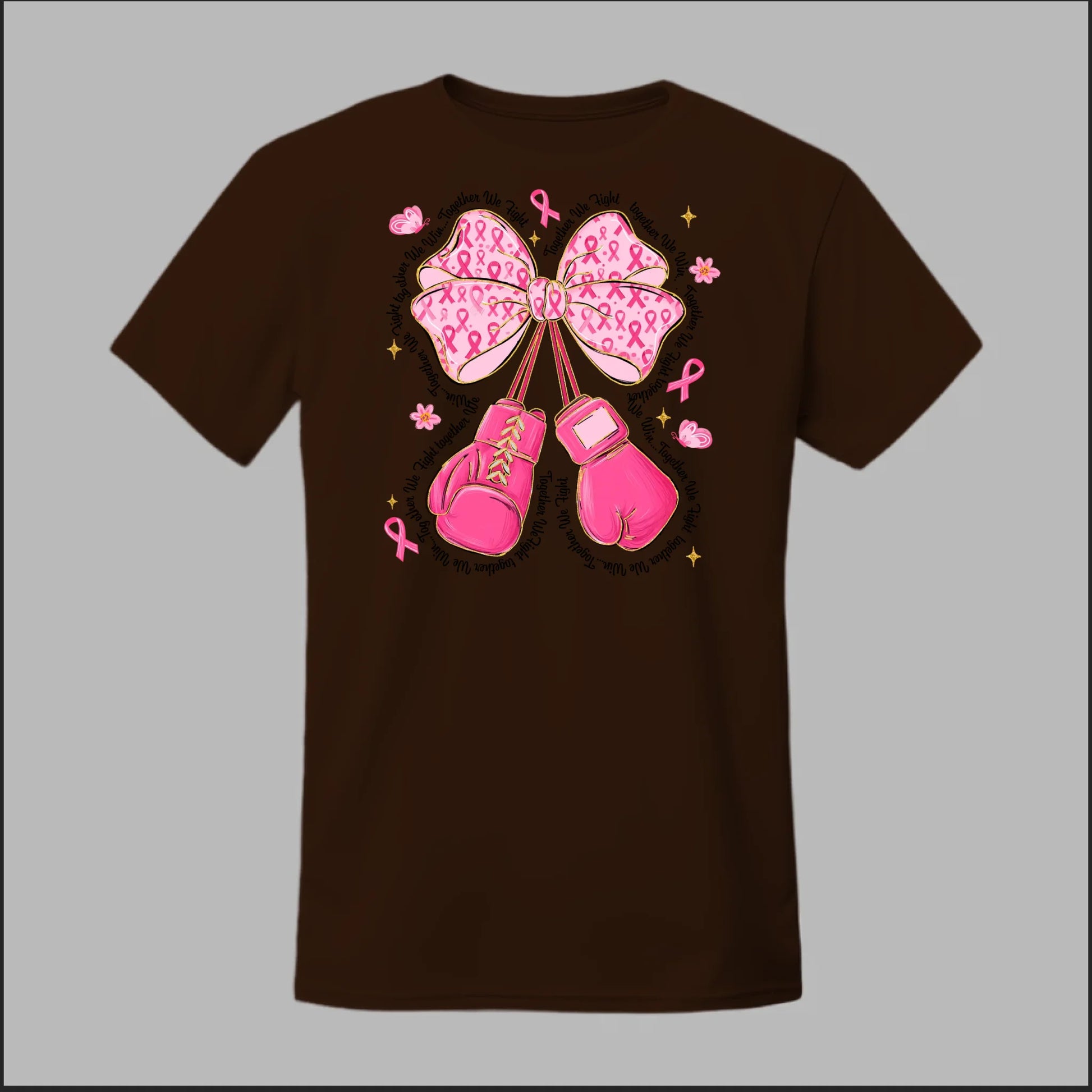 The Fight with Strength & Style Tee blends toughness and elegance, featuring bold pink boxing gloves tied with a breast cancer ribbon bow. Surrounded by ribbons, stars, and butterflies, this design symbolizes resilience, hope, and the unbreakable spirit of those battling breast cancer. Perfect for showing your support and standing strong in the fight.