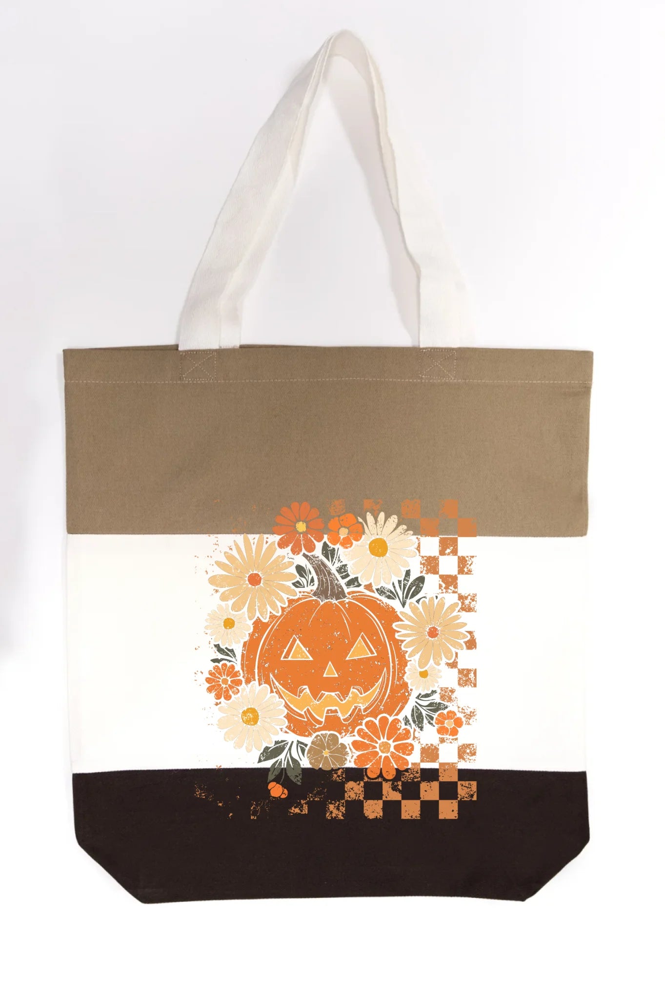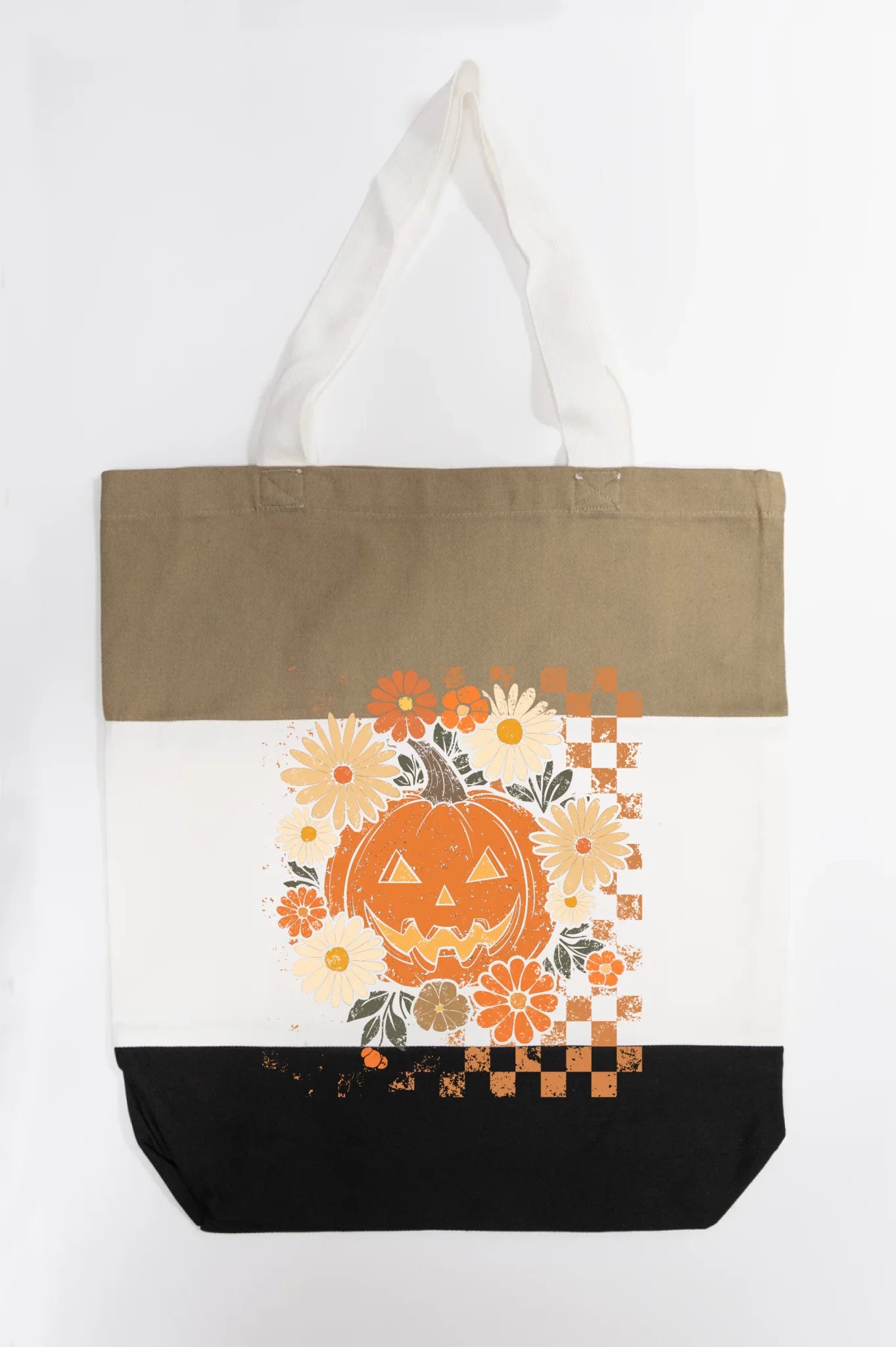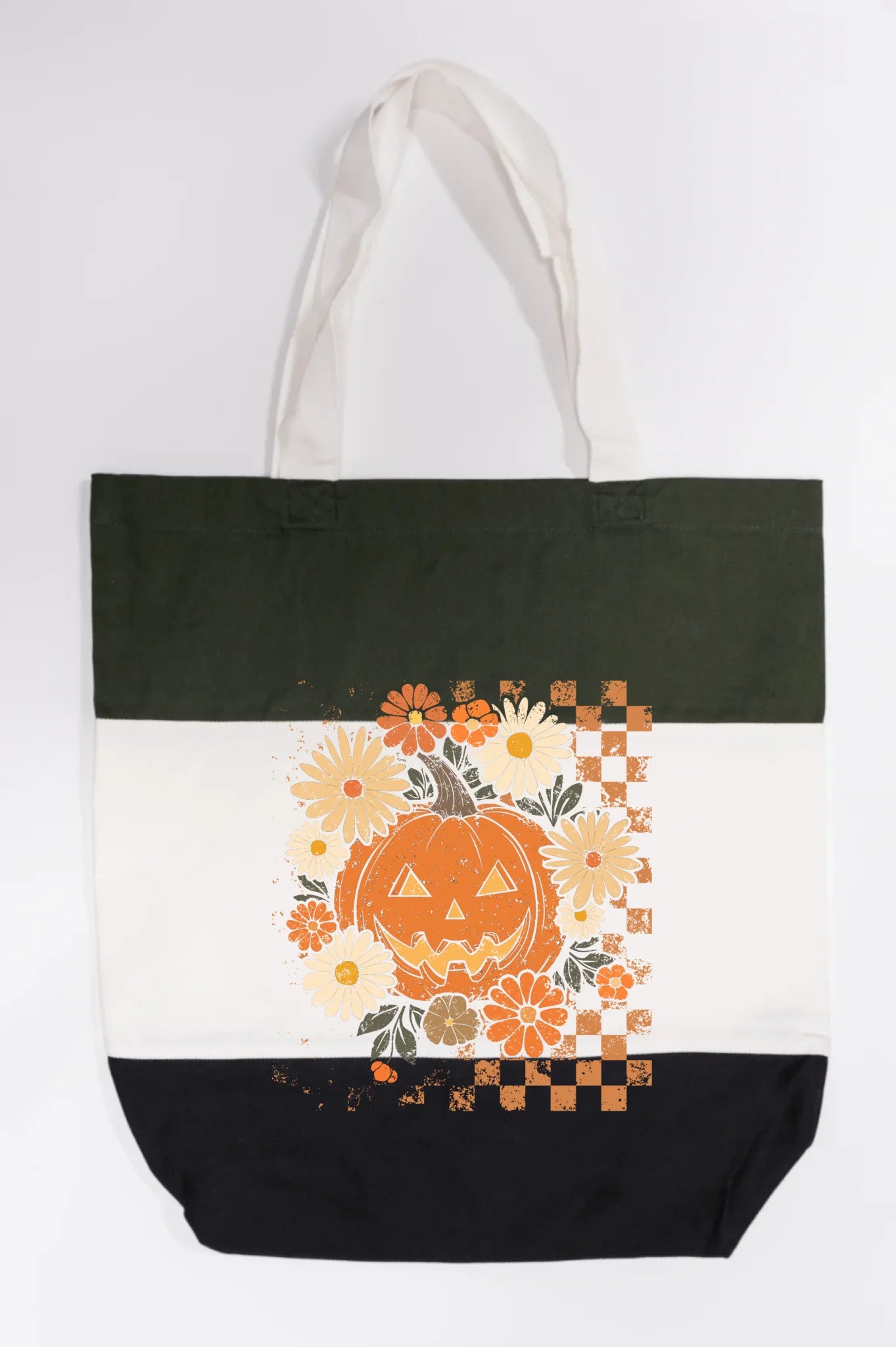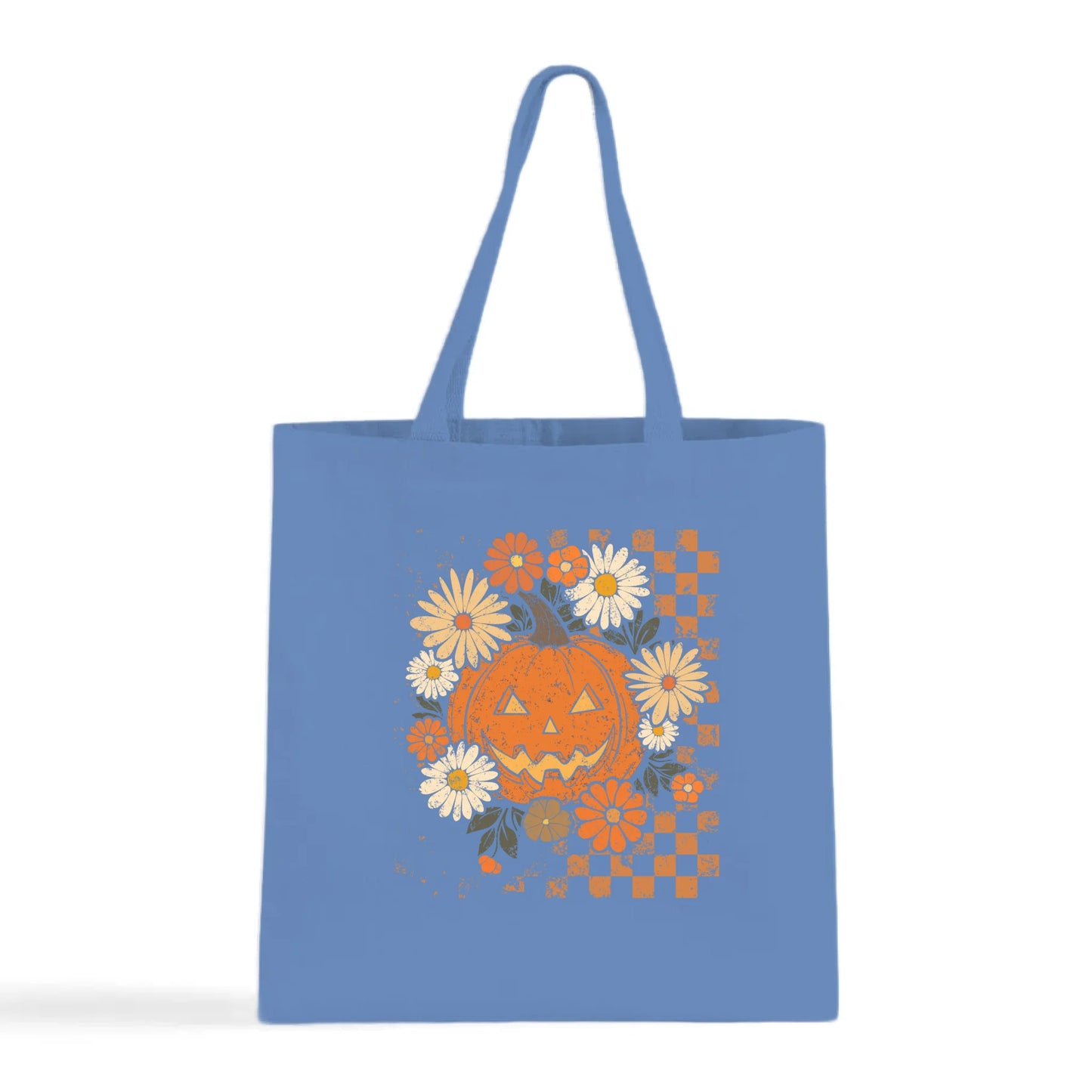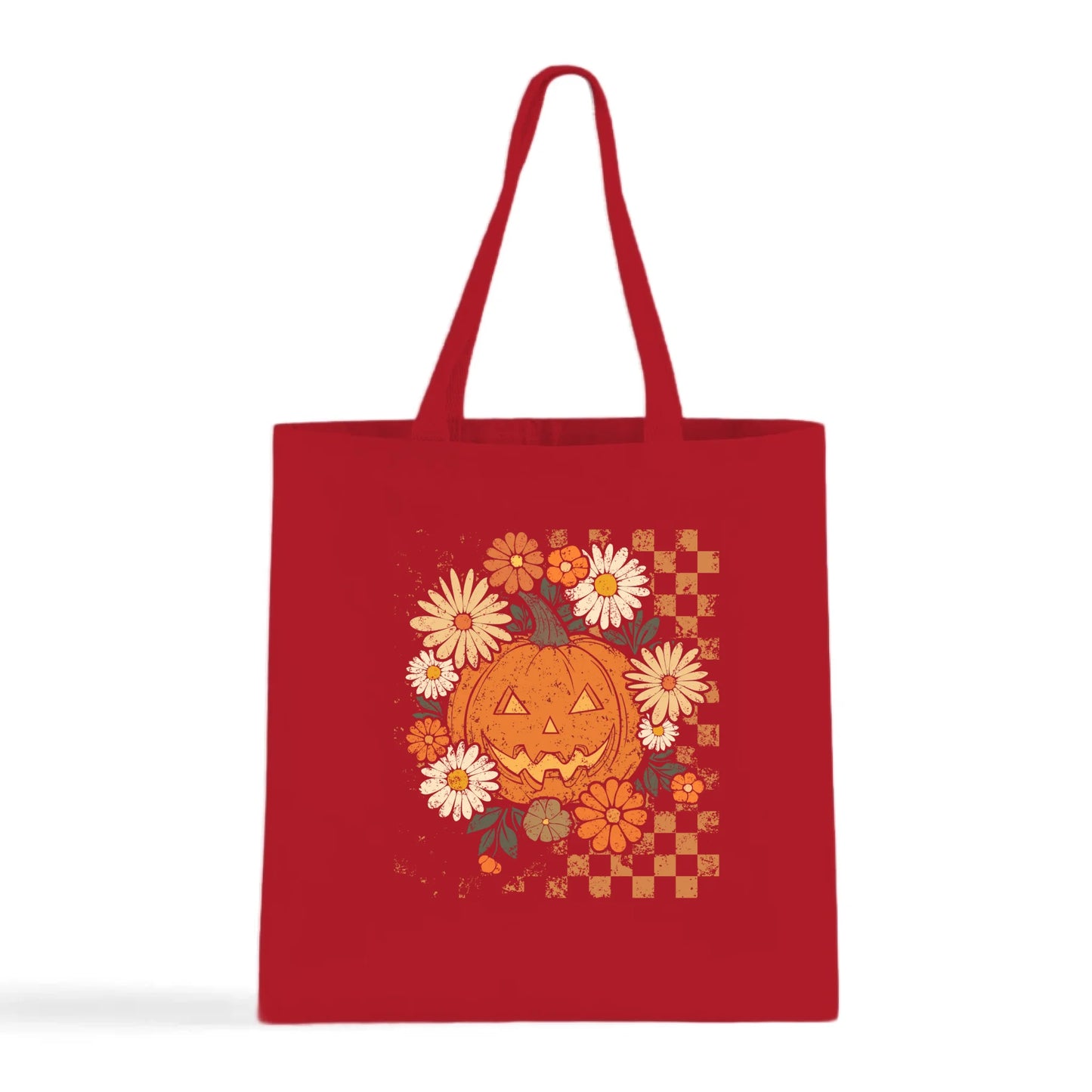 Carry a little Halloween magic with the Floral Checkered Pumpkin Tote. This eye-catching design combines a smiling jack-o’-lantern with whimsical daisies and bold checkered accents—perfect for adding a seasonal touch to your everyday errands.