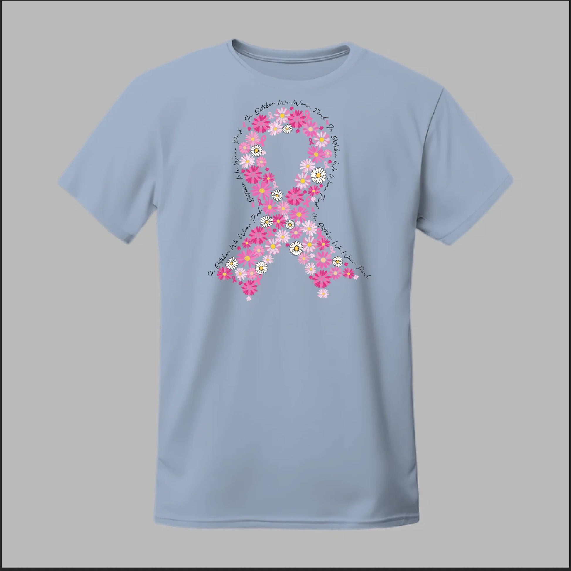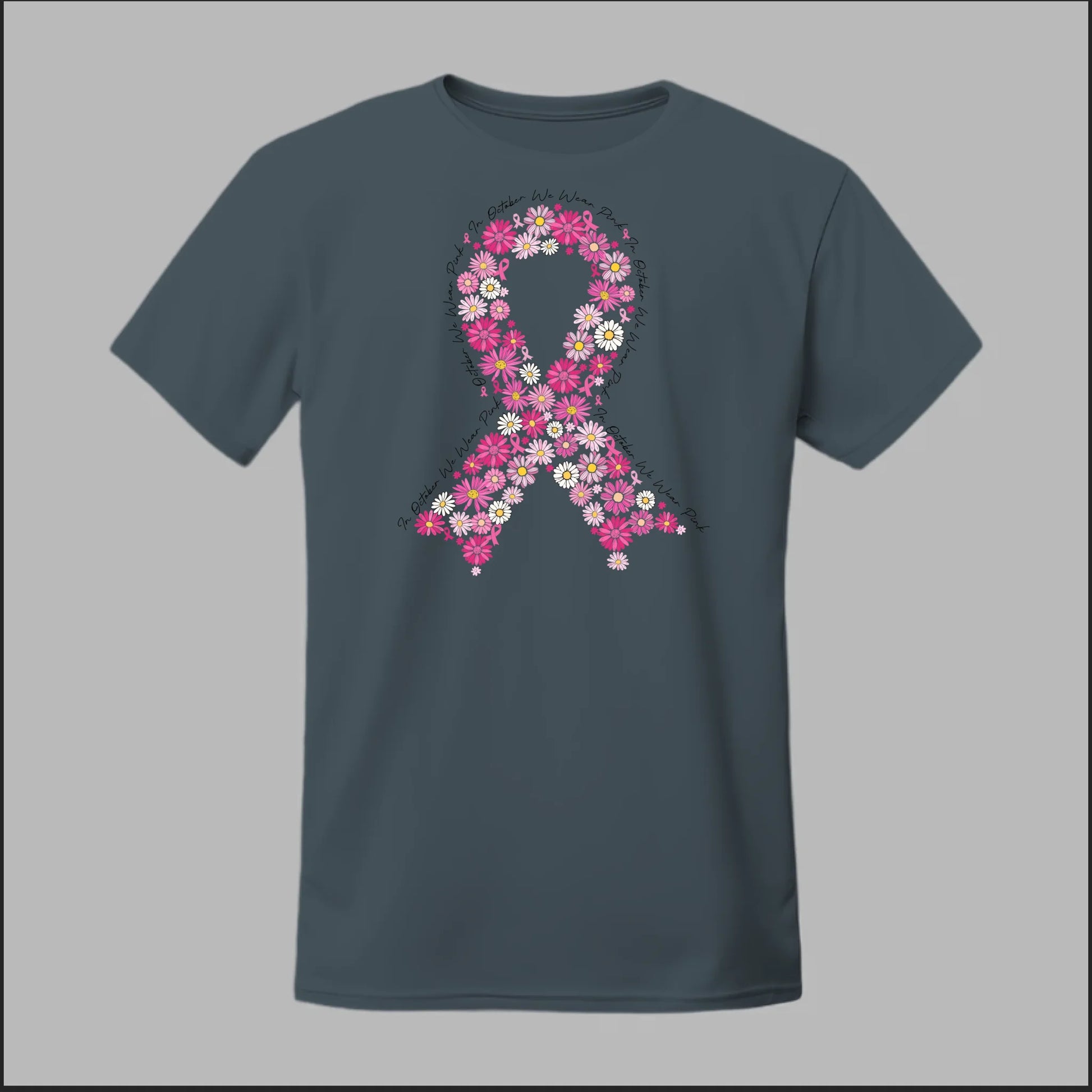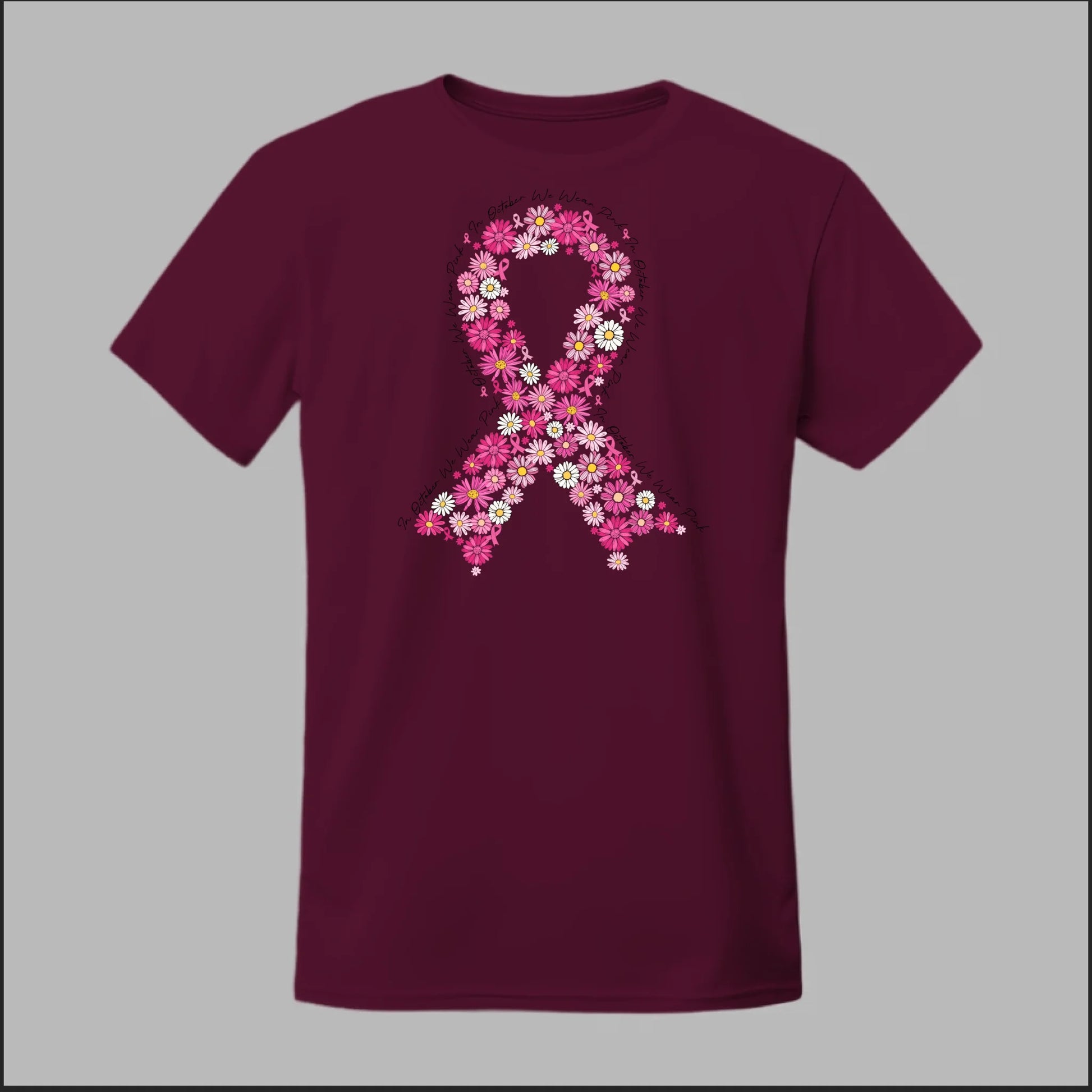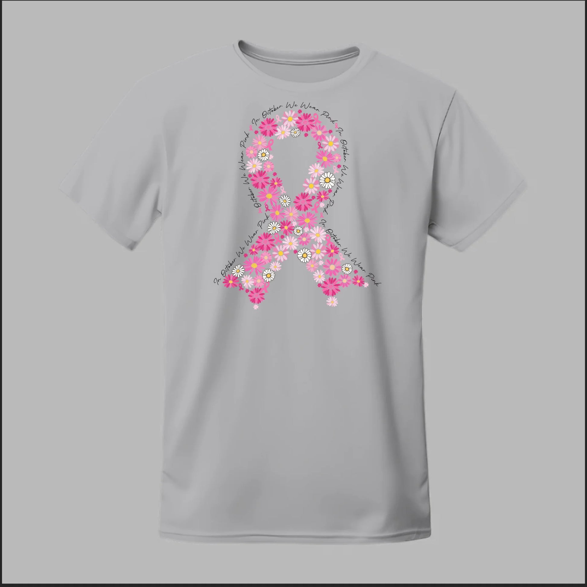 A striking pink floral ribbon design set against a bold black background. This tee is perfect for making a powerful Breast Cancer Awareness statement while showing your unwavering support.