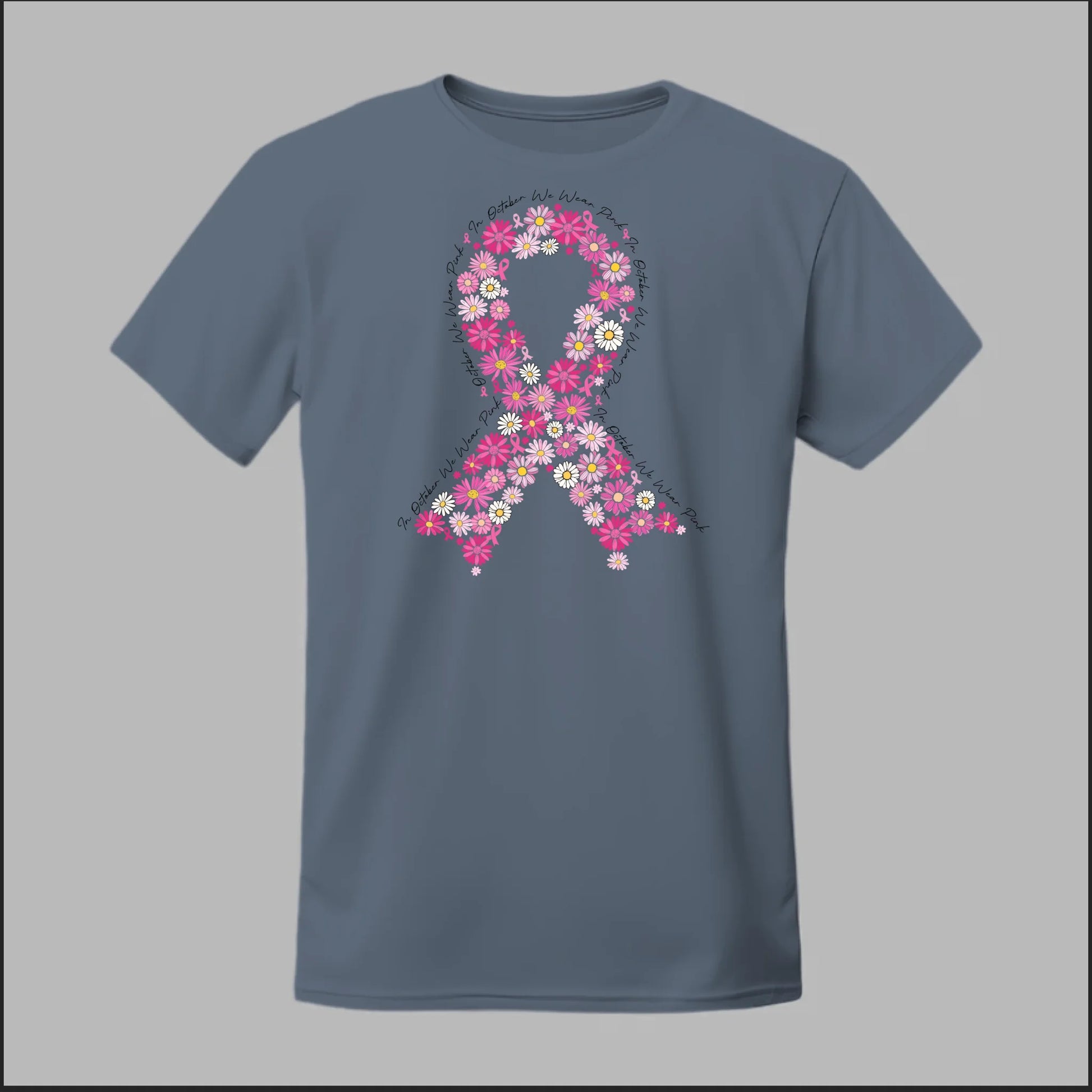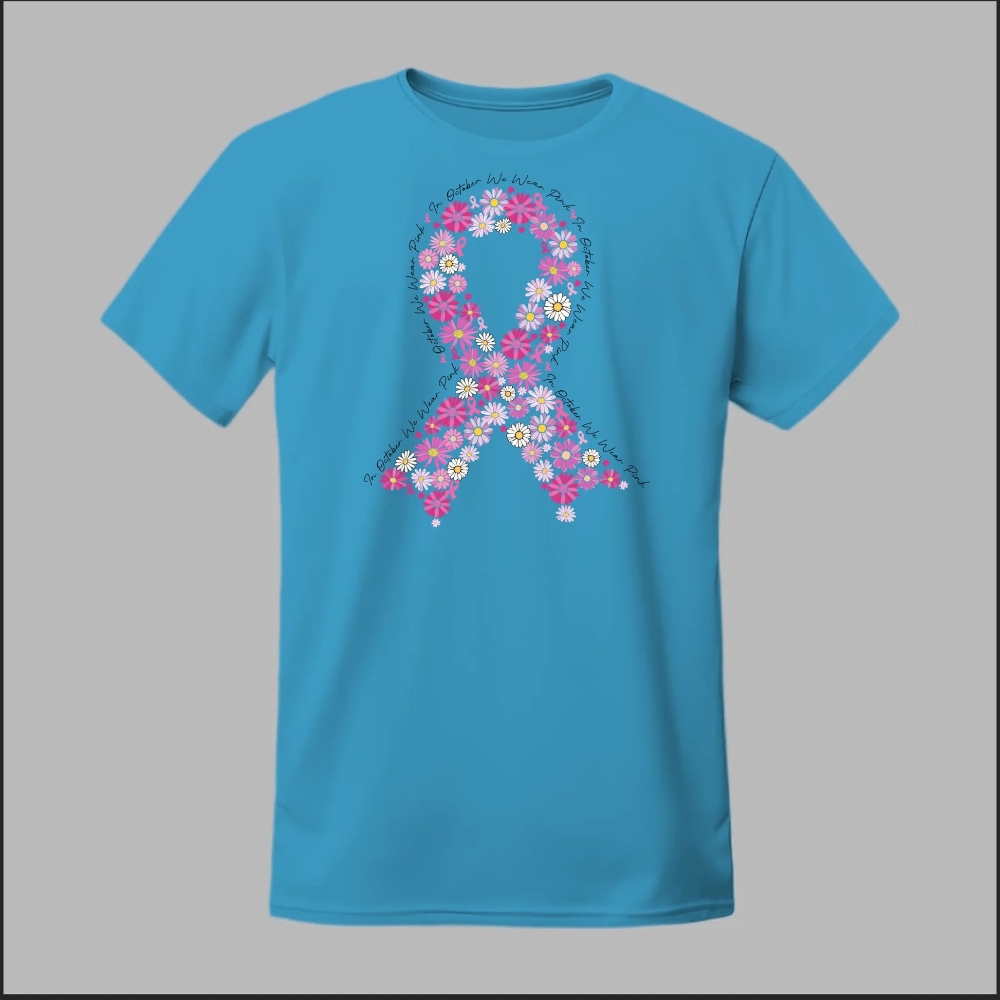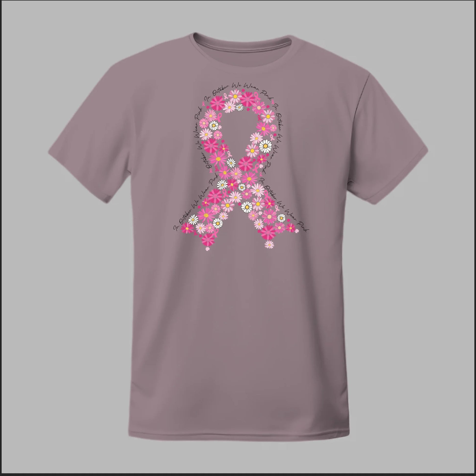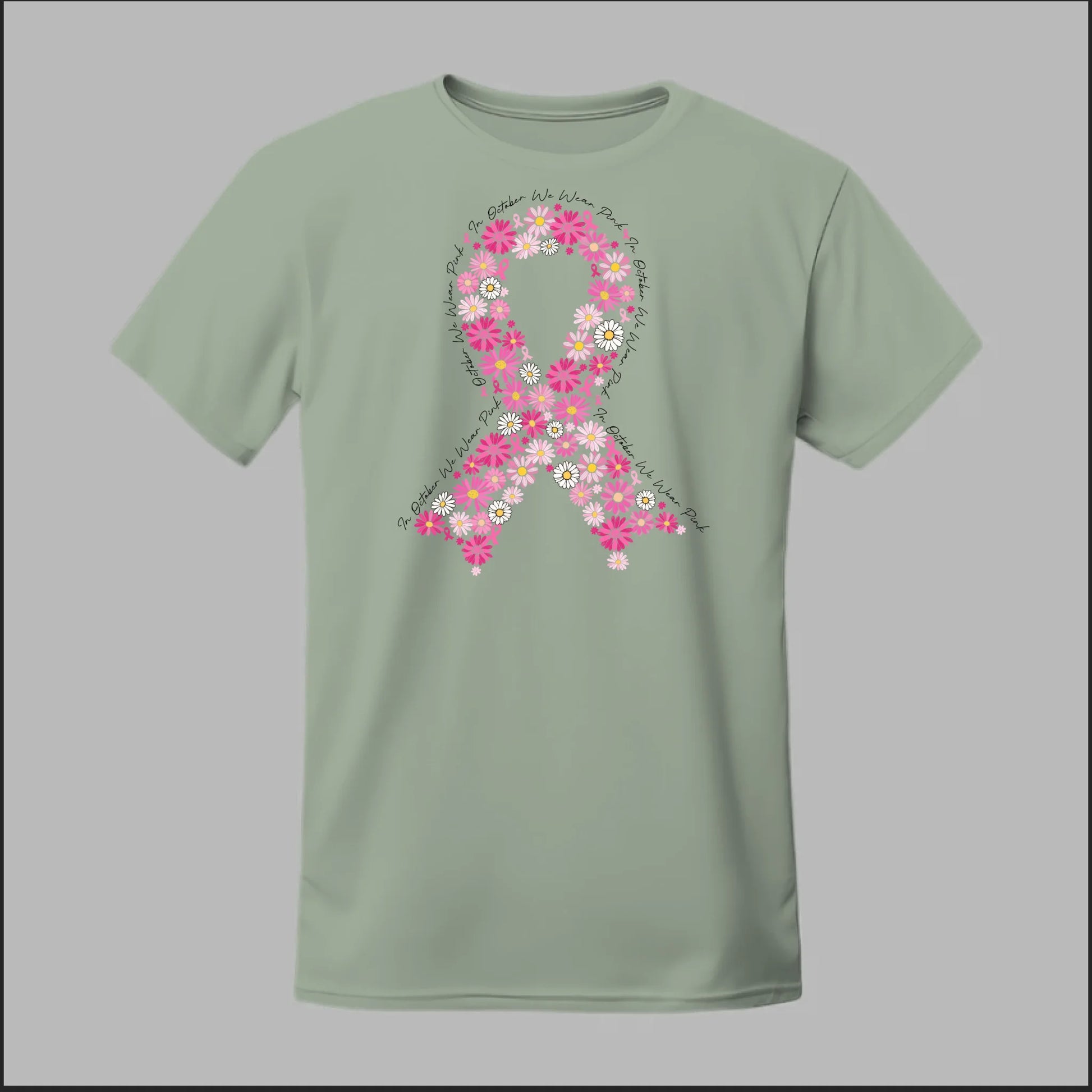 A striking pink floral ribbon design set against a bold black background. This tee is perfect for making a powerful Breast Cancer Awareness statement while showing your unwavering support.
