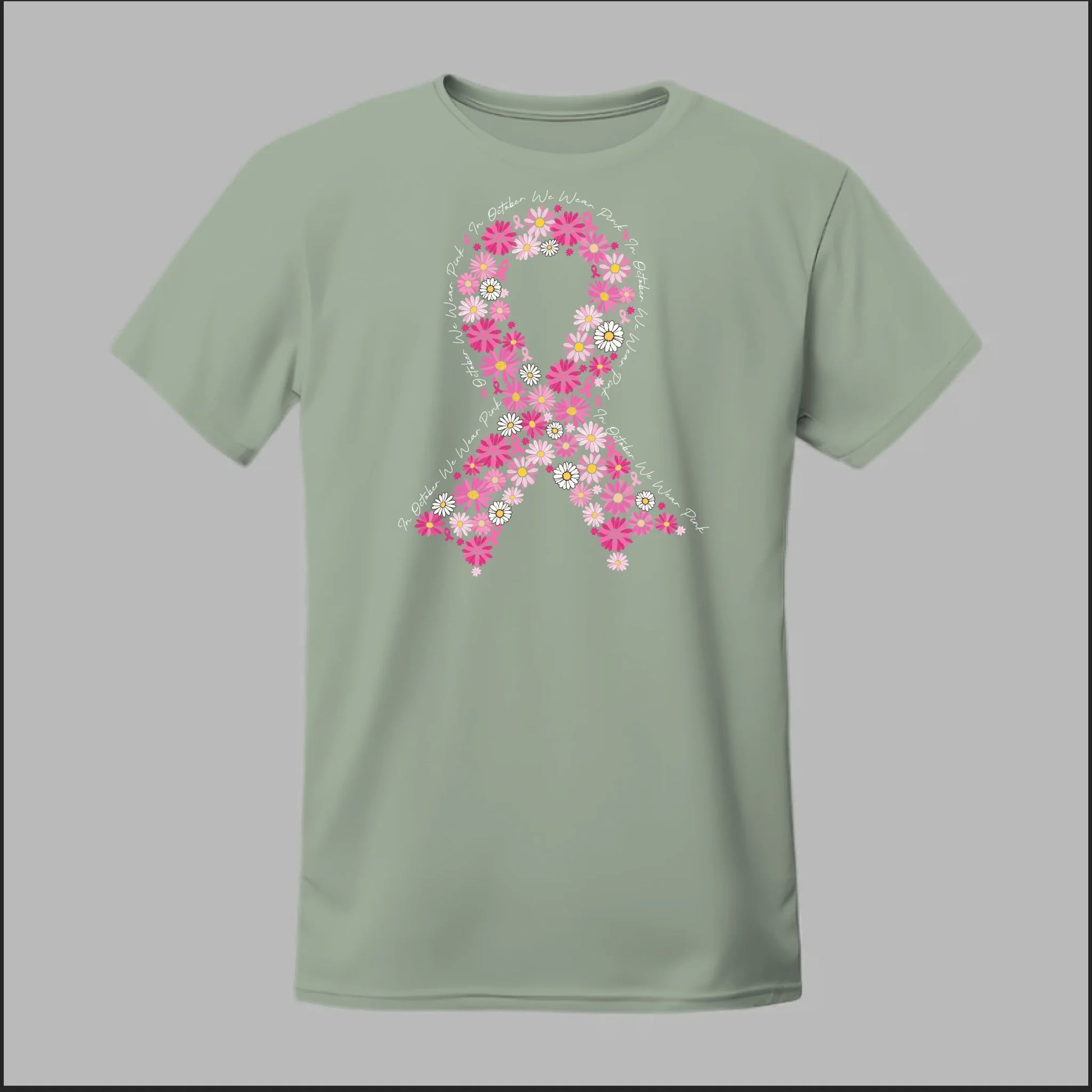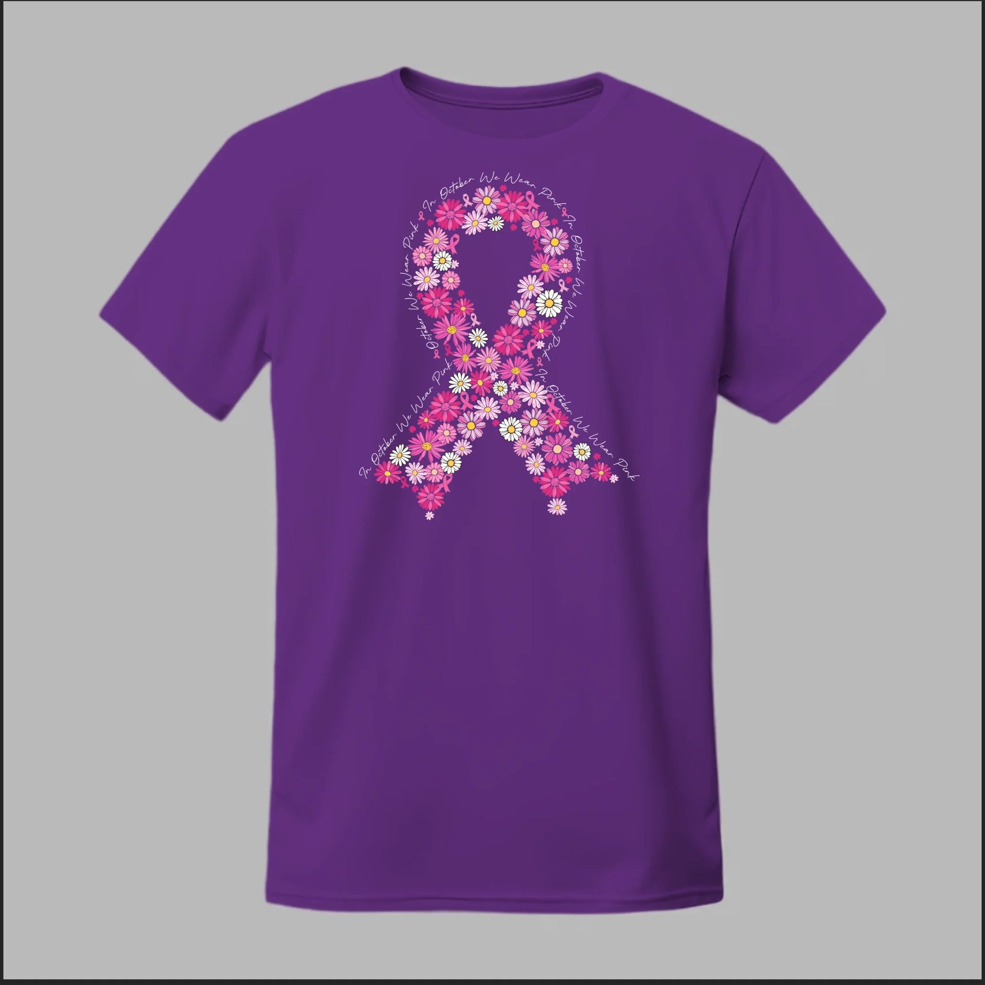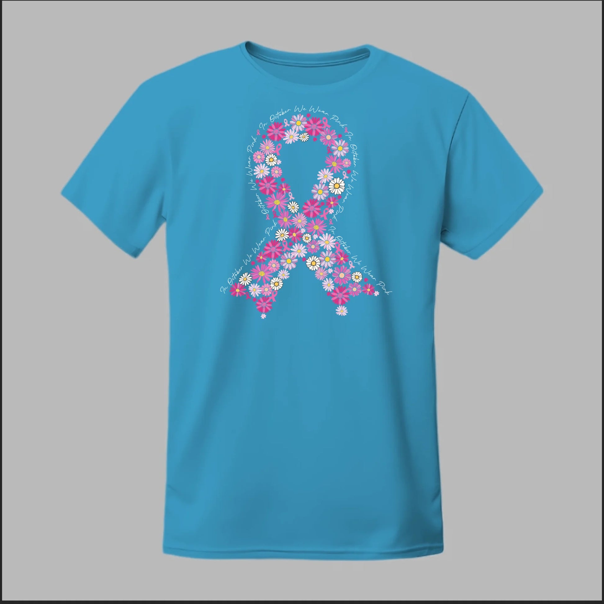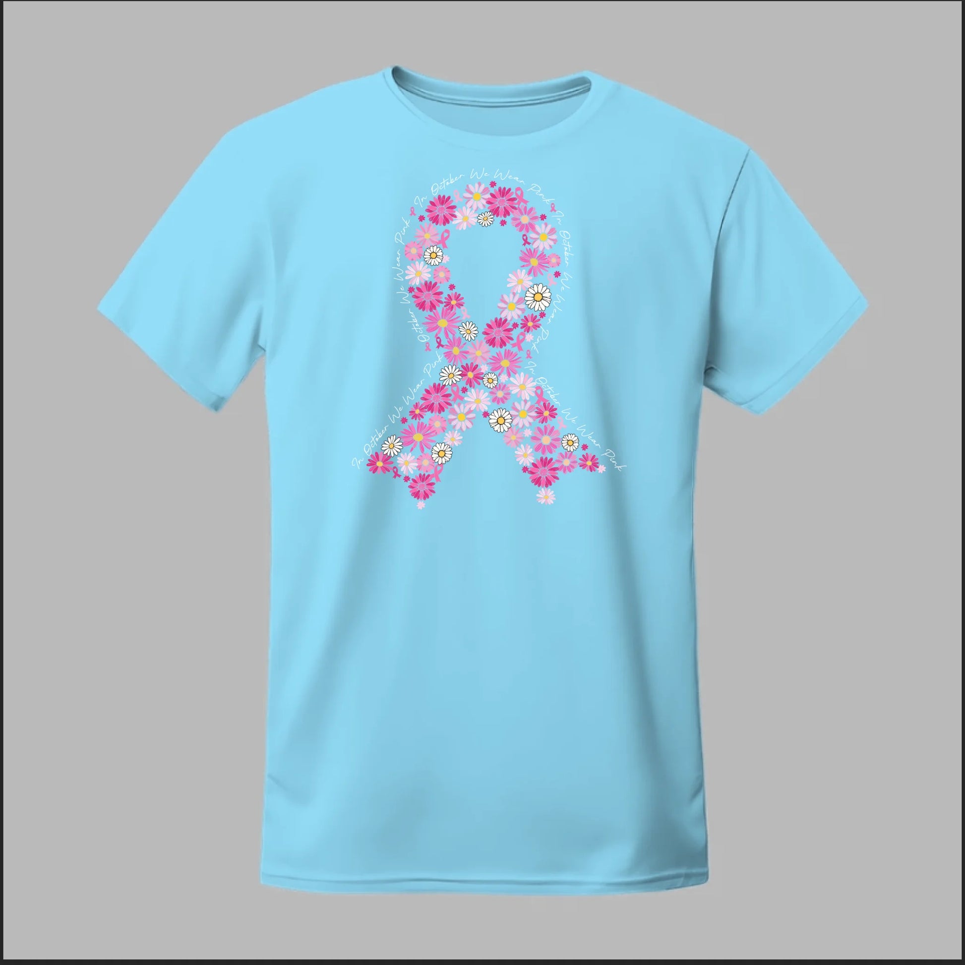 A beautiful floral pink ribbon encircled by the phrase “In October We Wear Pink”. This tee is a heartfelt way to spread awareness and solidarity all month long.