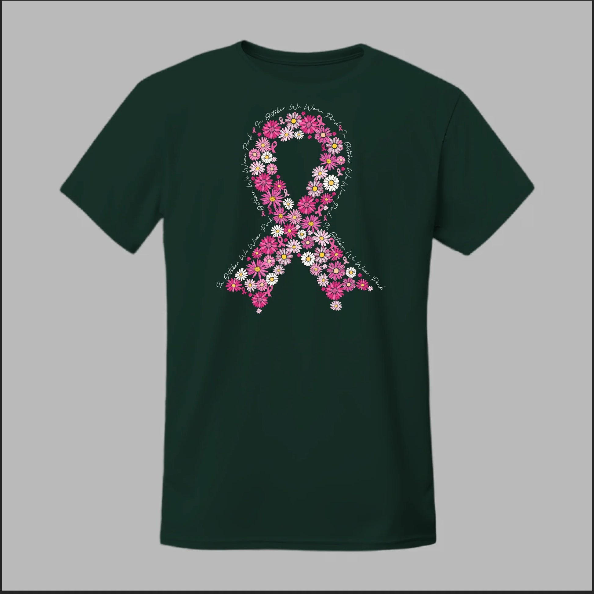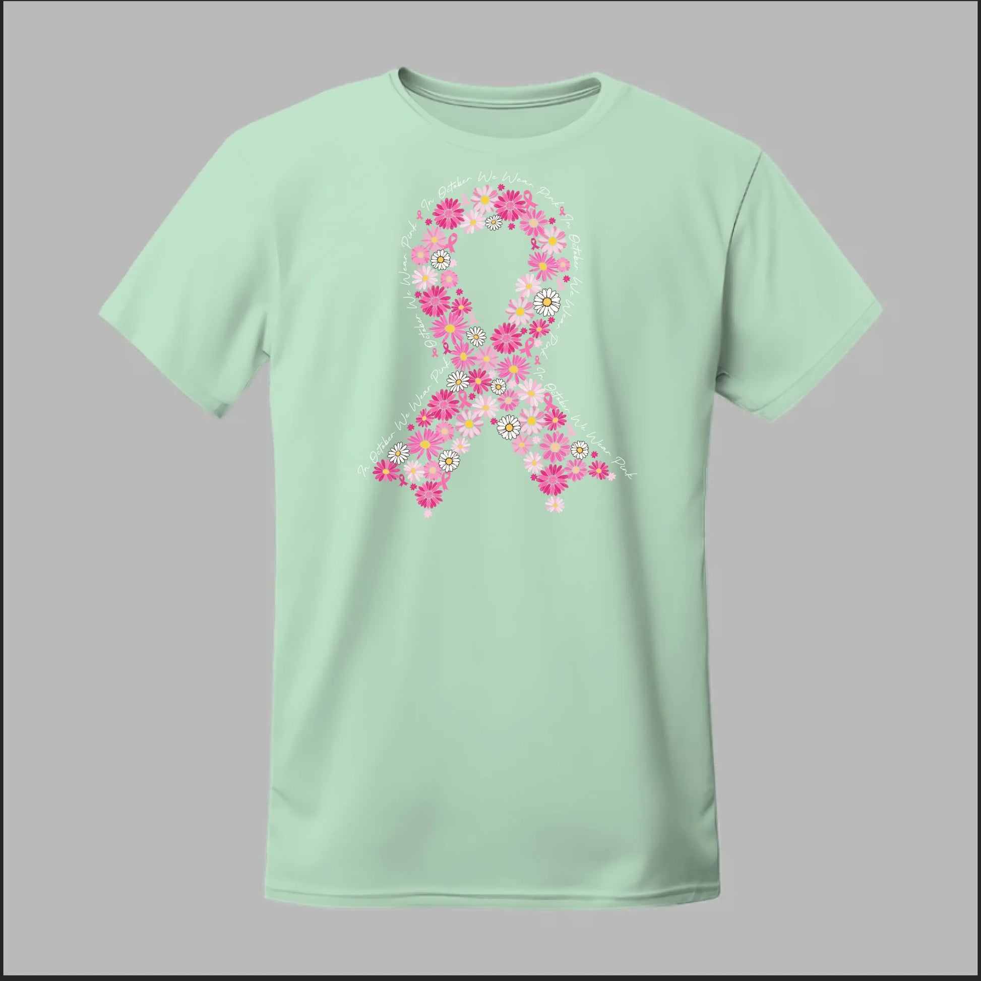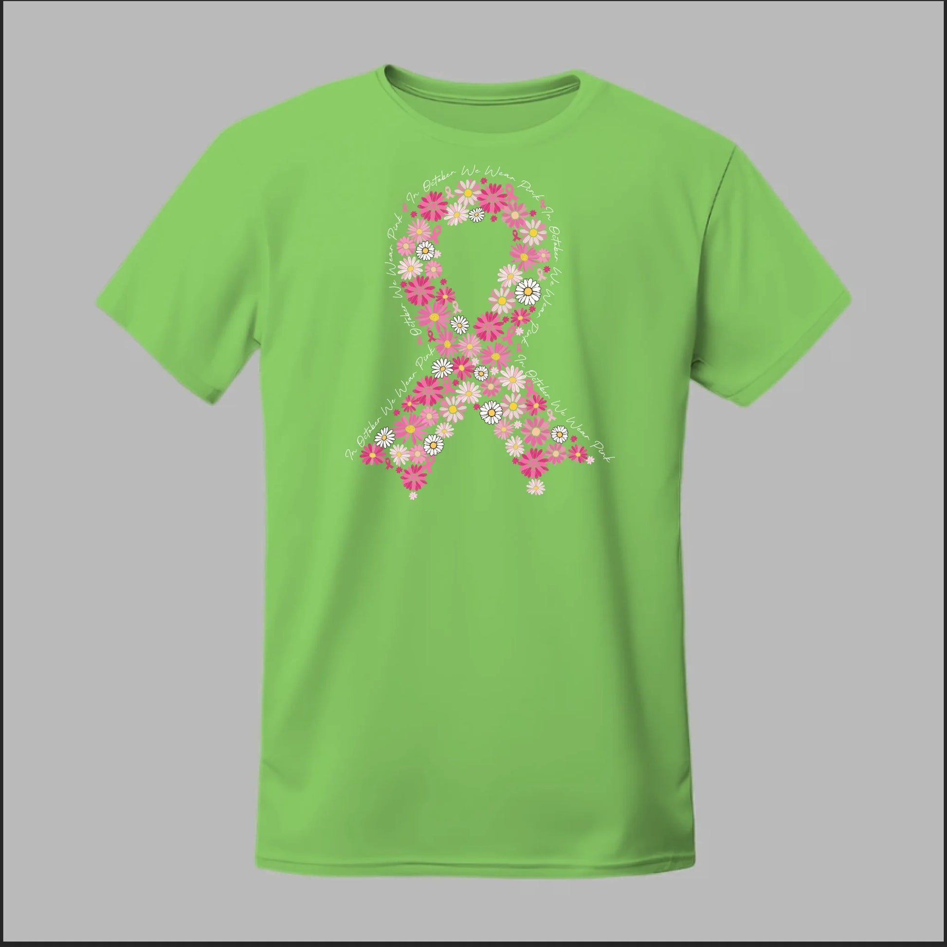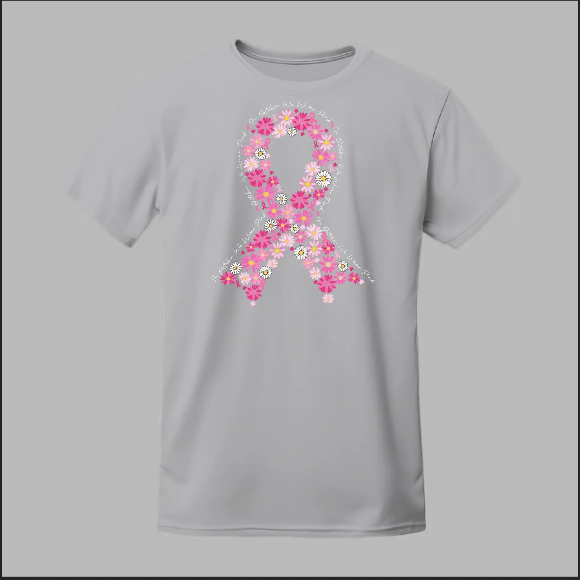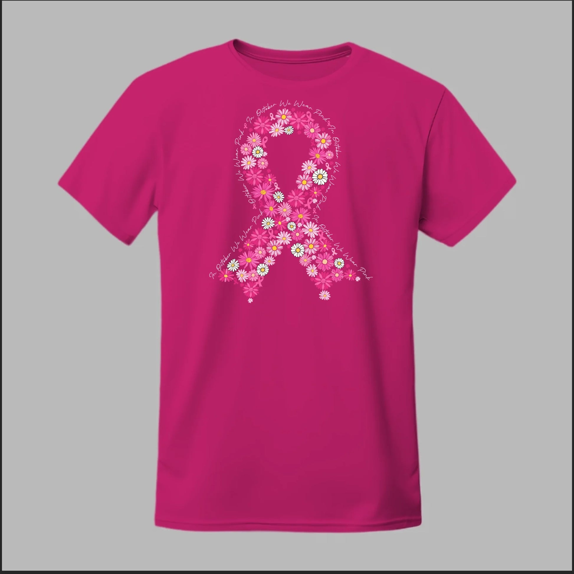 A beautiful floral pink ribbon encircled by the phrase “In October We Wear Pink”. This tee is a heartfelt way to spread awareness and solidarity all month long.