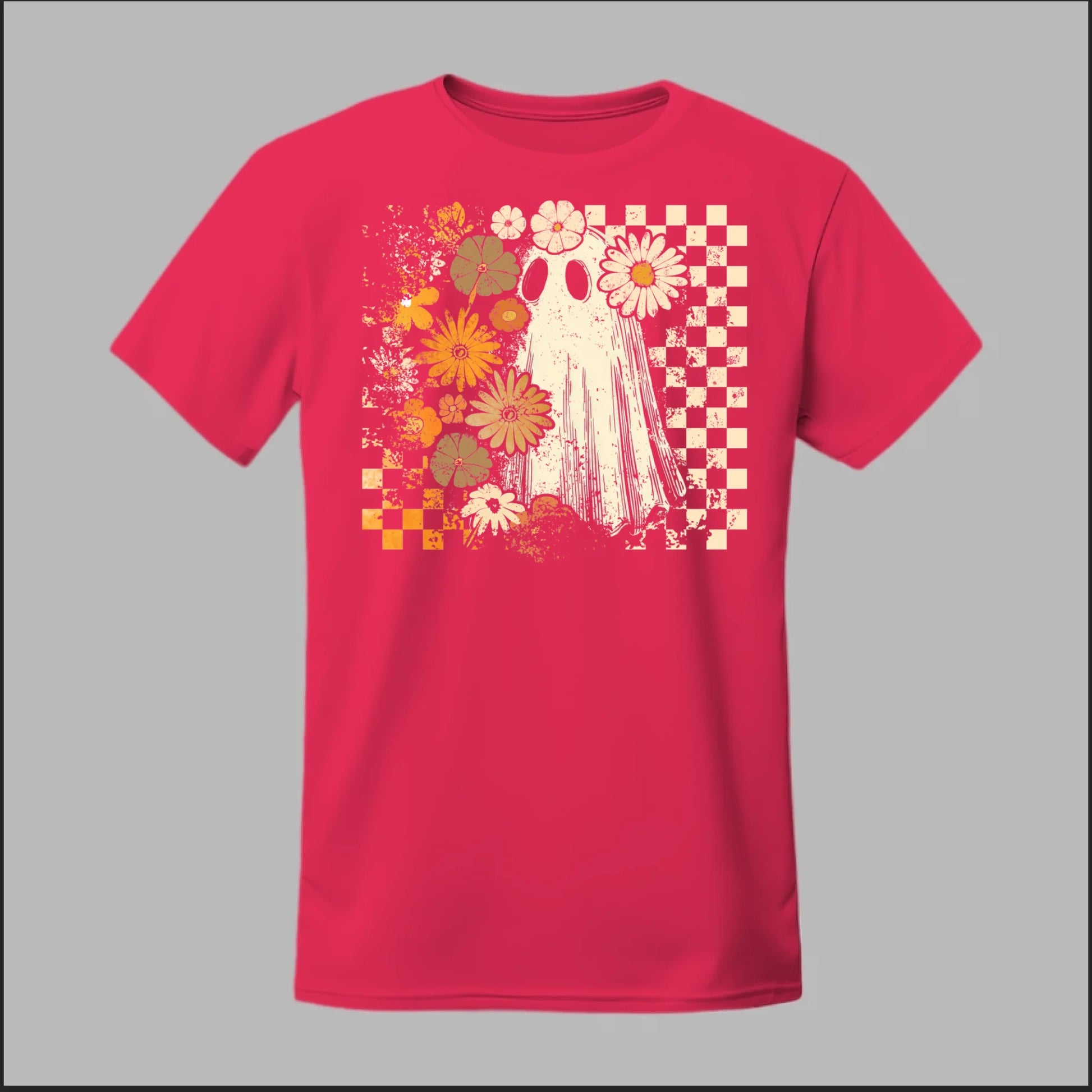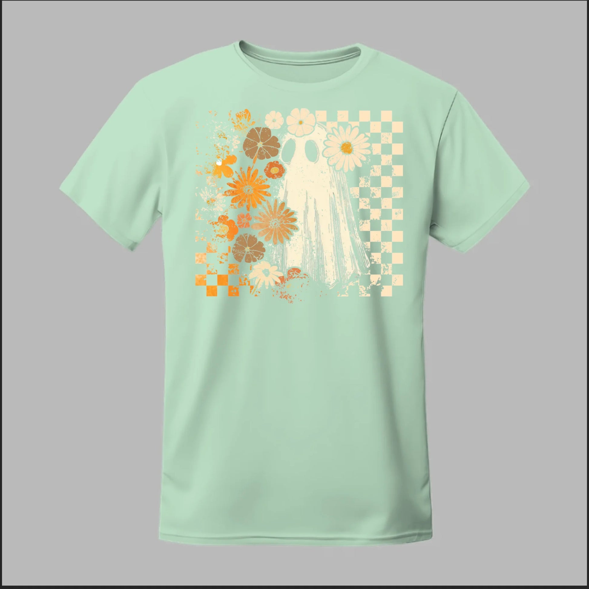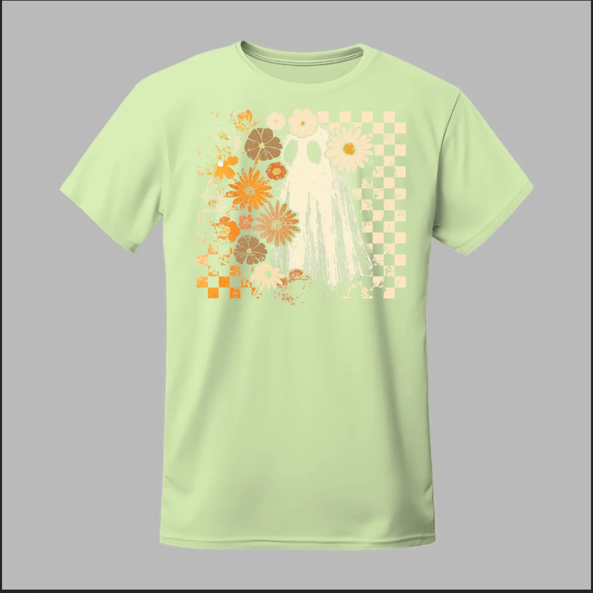 Add some vintage vibes to your spooky season with this Groovy Ghost shirt. Featuring a playful ghost surrounded by retro-inspired flowers and a distressed checkerboard backdrop, this tee is perfect for fall, Halloween, or anyone who loves a little funky flair year-round.
