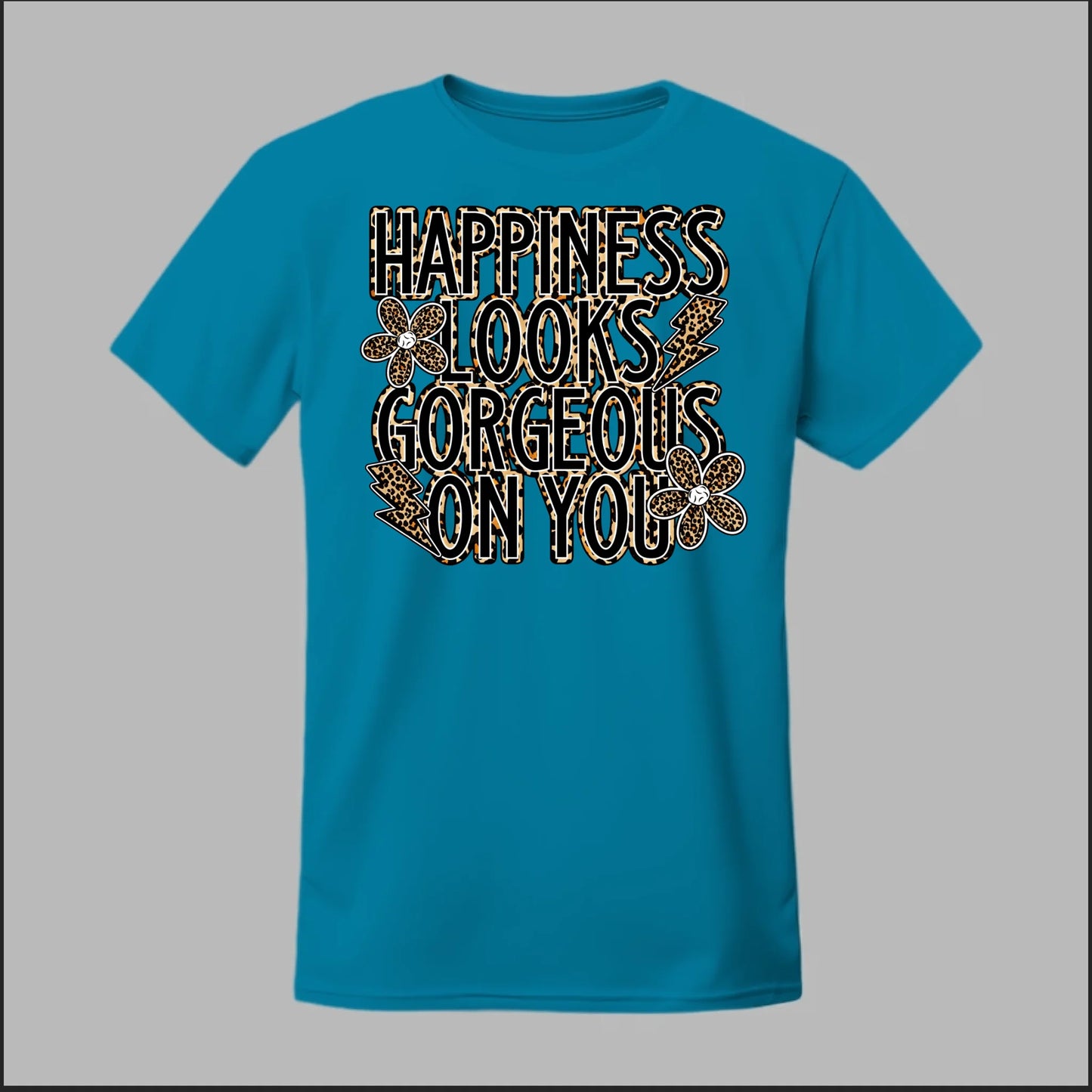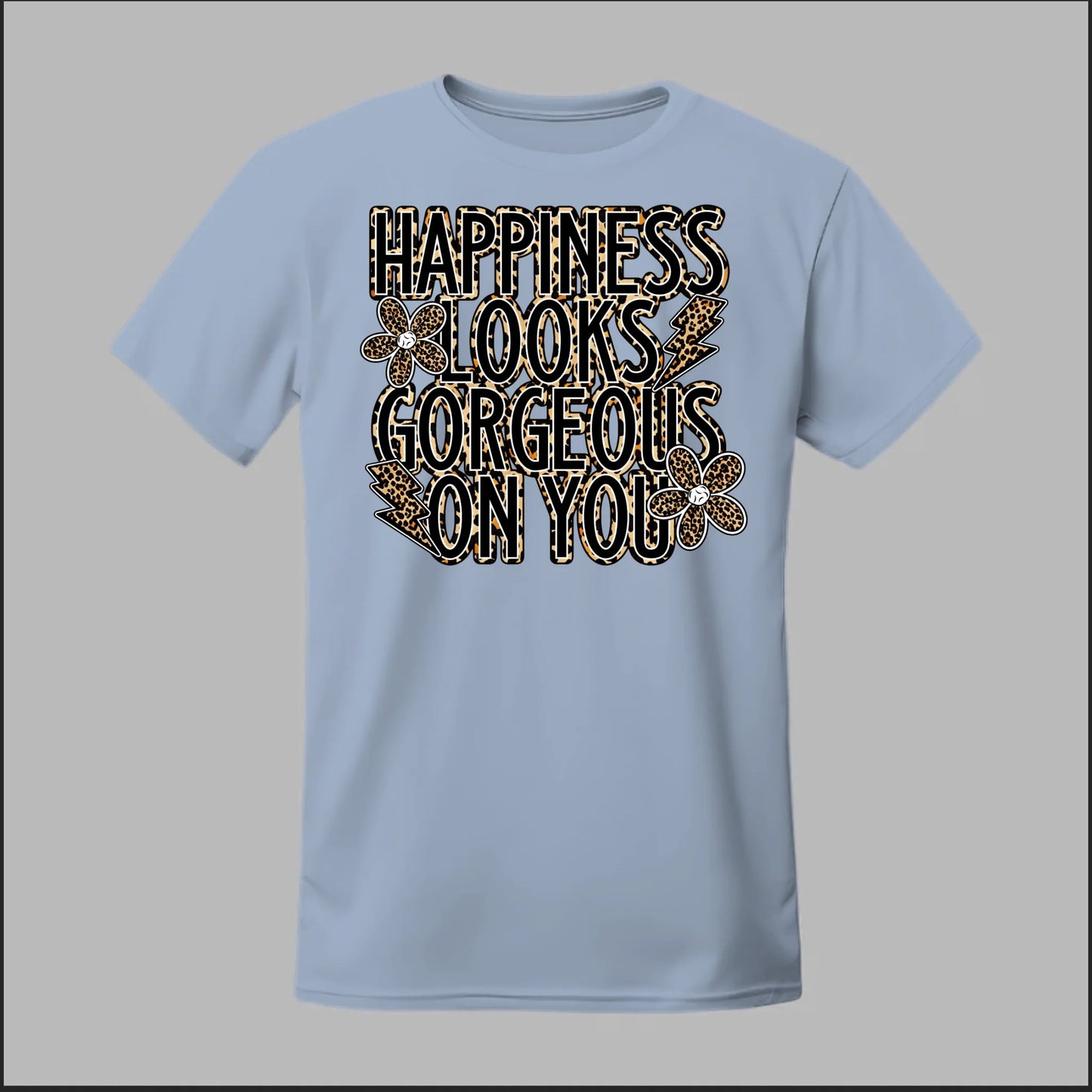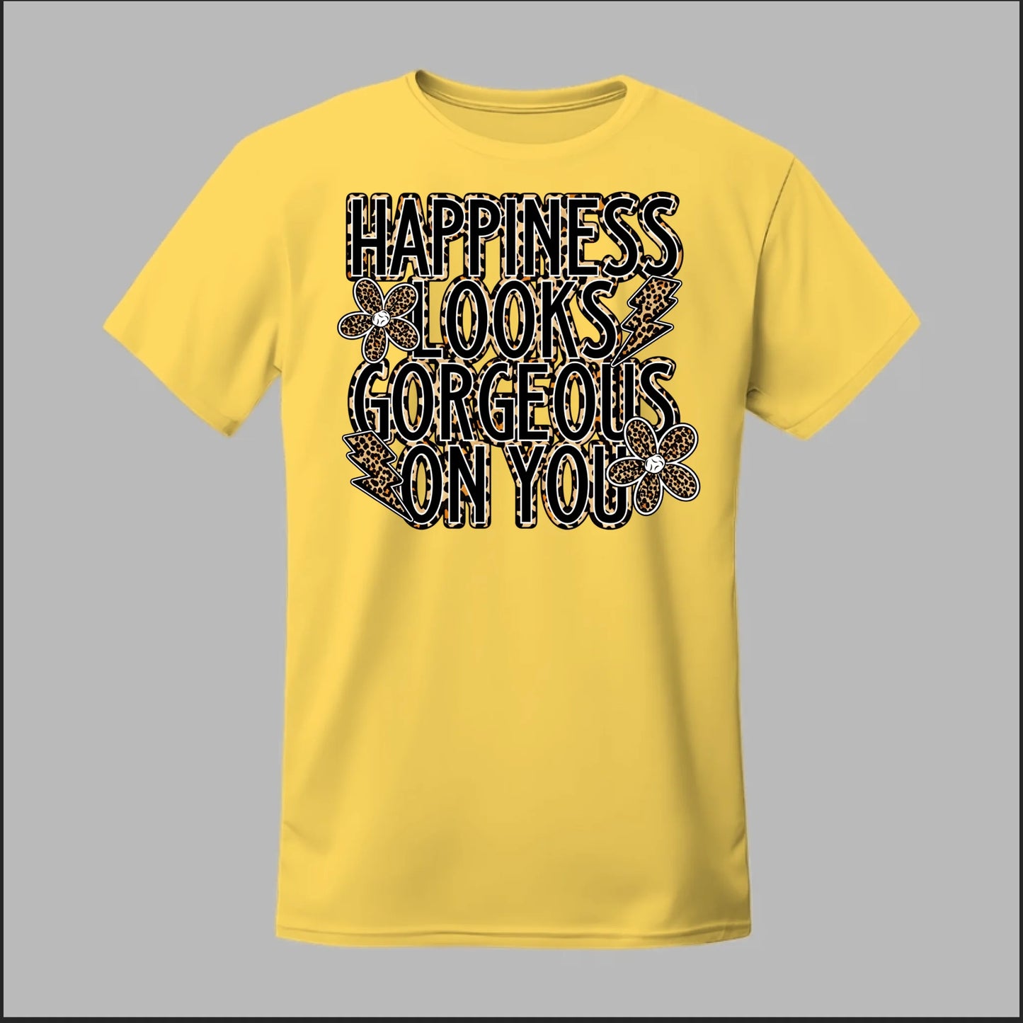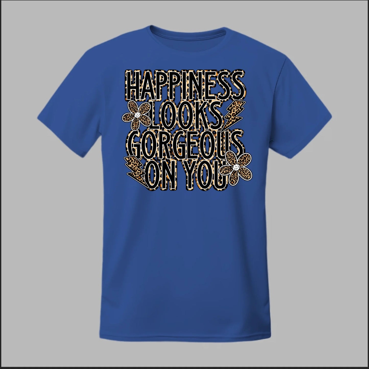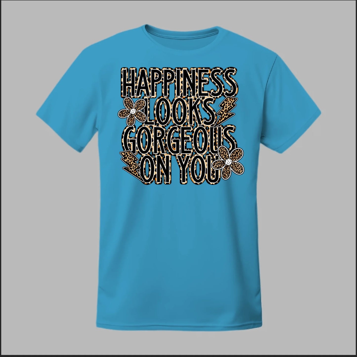 Confidence never goes out of style! This vibrant design features the empowering phrase “Happiness Looks Gorgeous on You” in bold block lettering with leopard print accents, lightning bolts, and flowers for a fun and fierce touch. It’s the perfect tee for spreading good vibes wherever you go.