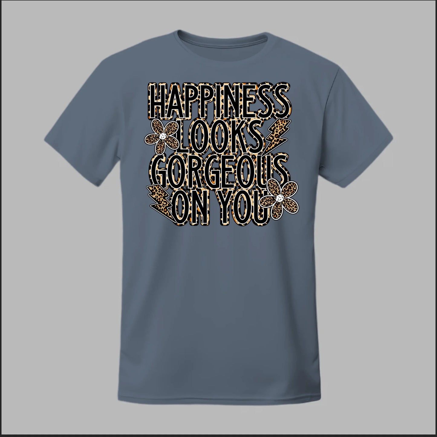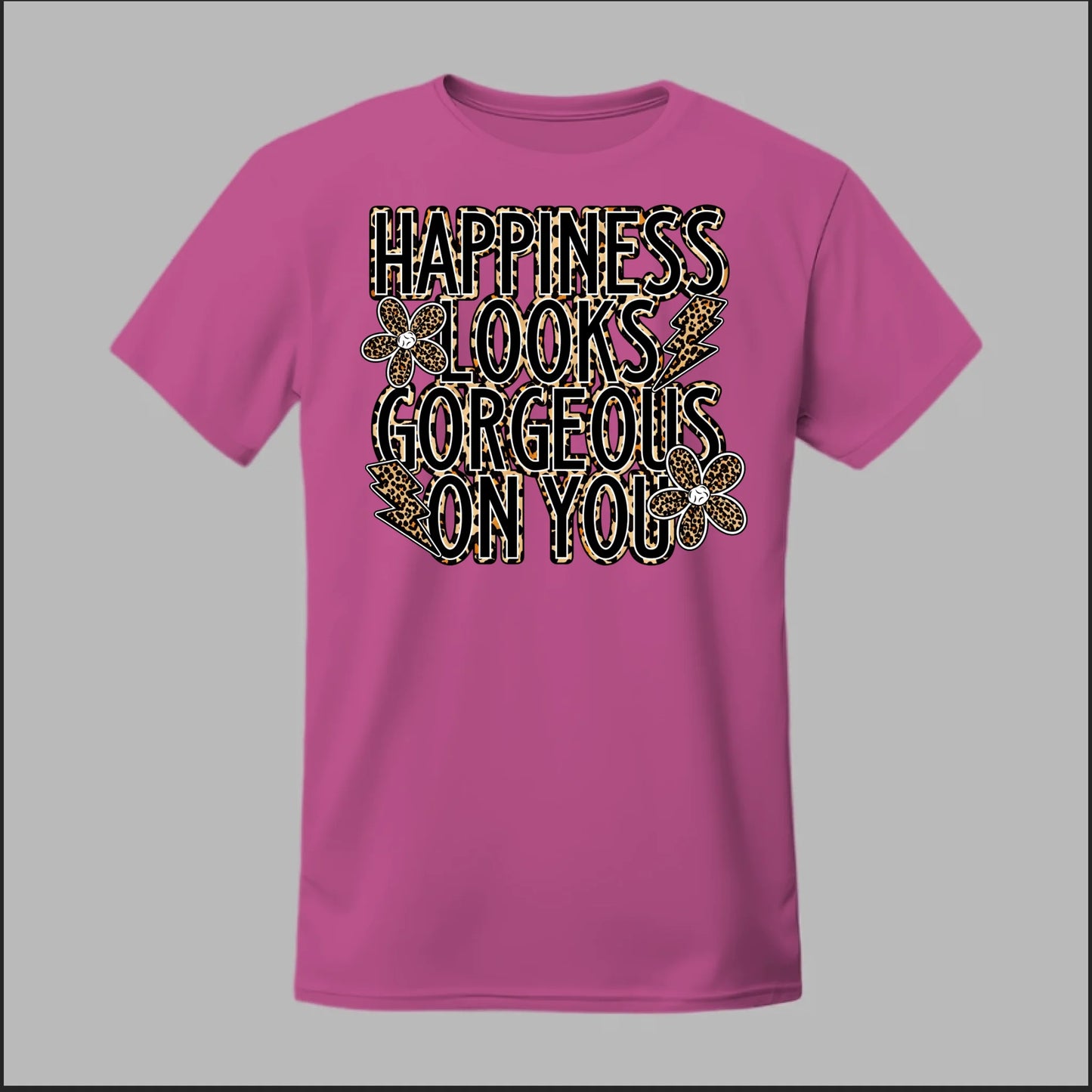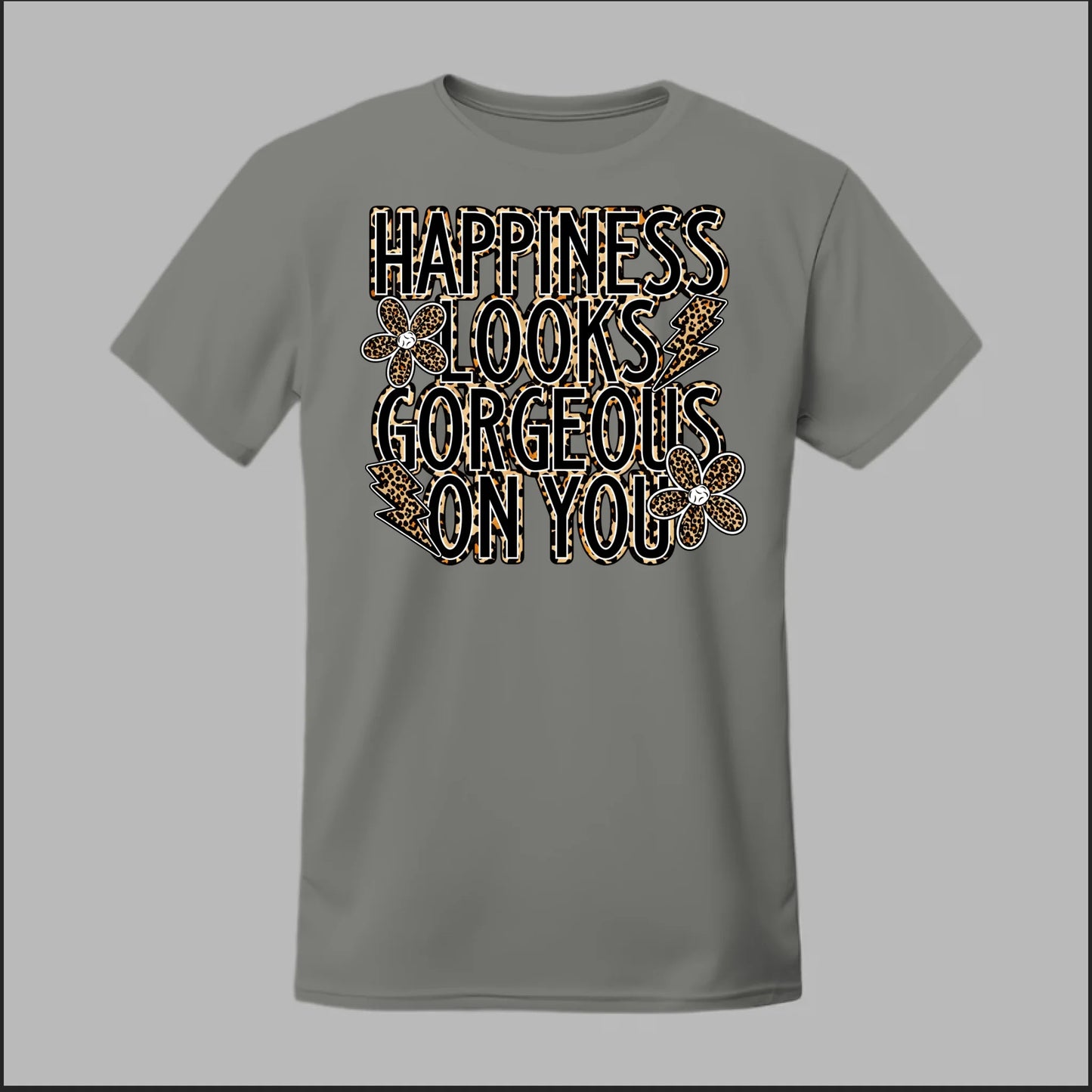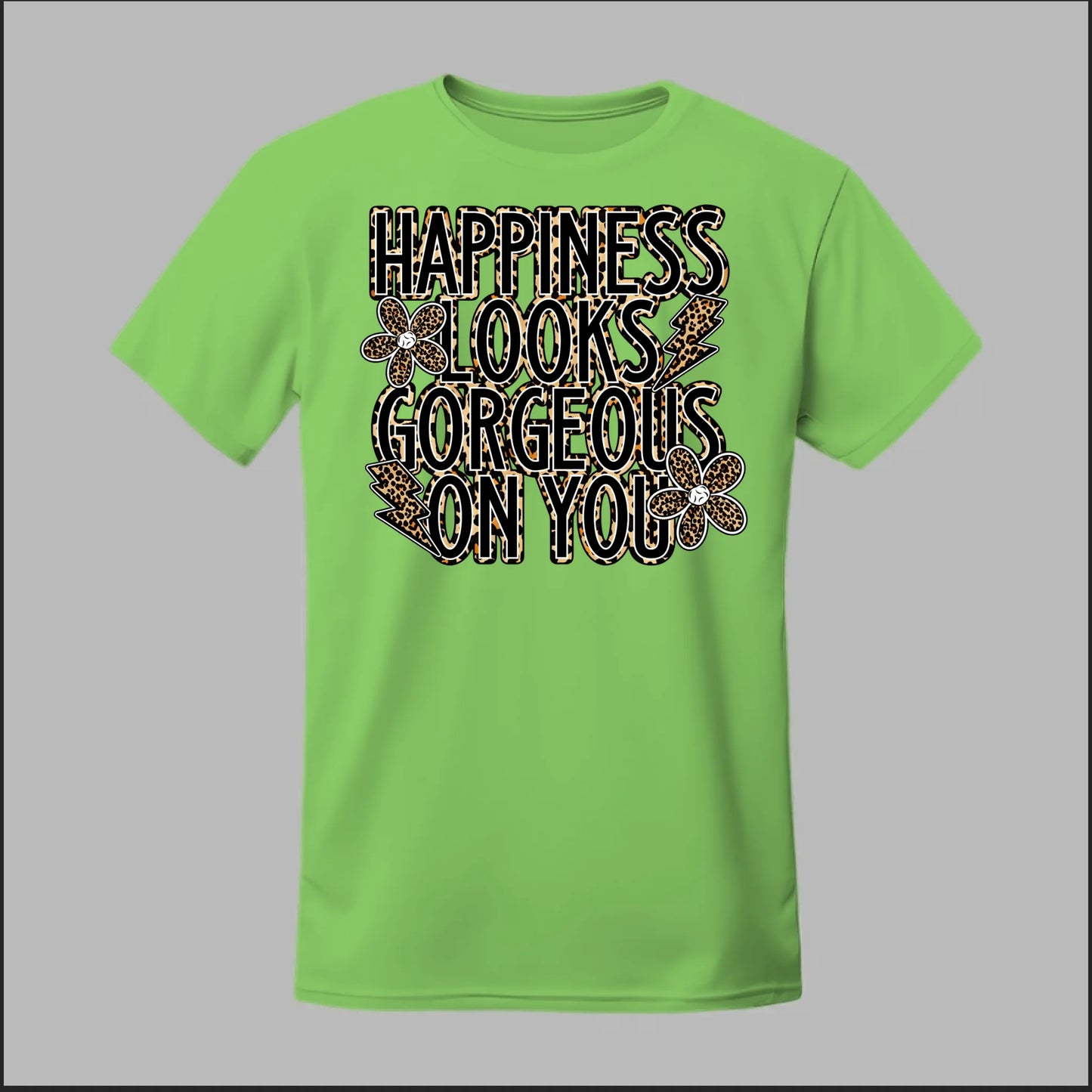 Confidence never goes out of style! This vibrant design features the empowering phrase “Happiness Looks Gorgeous on You” in bold block lettering with leopard print accents, lightning bolts, and flowers for a fun and fierce touch. It’s the perfect tee for spreading good vibes wherever you go.