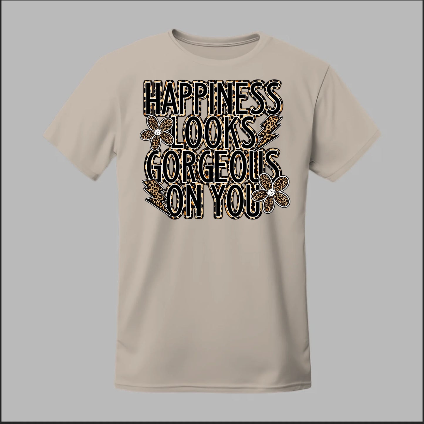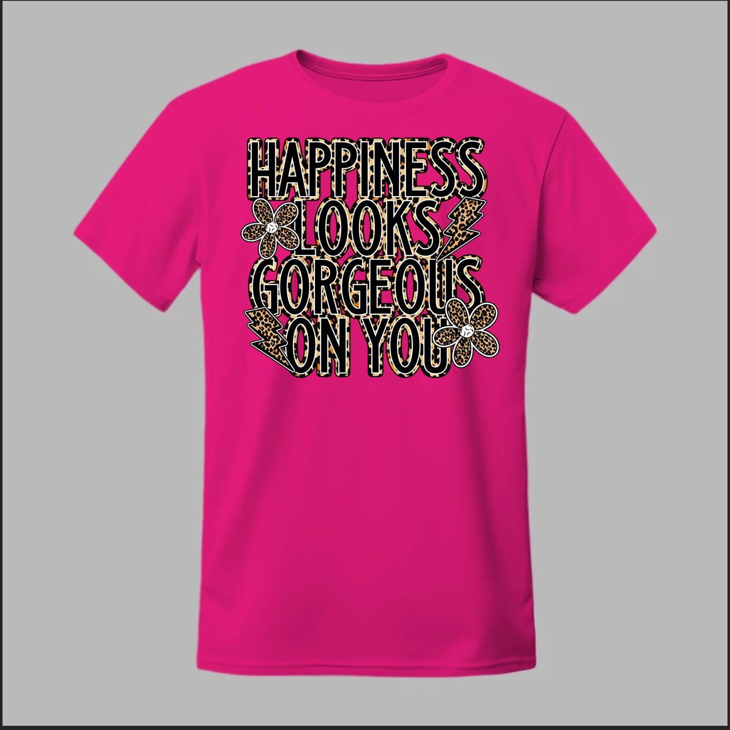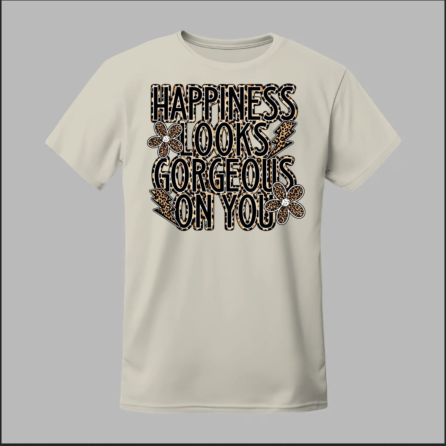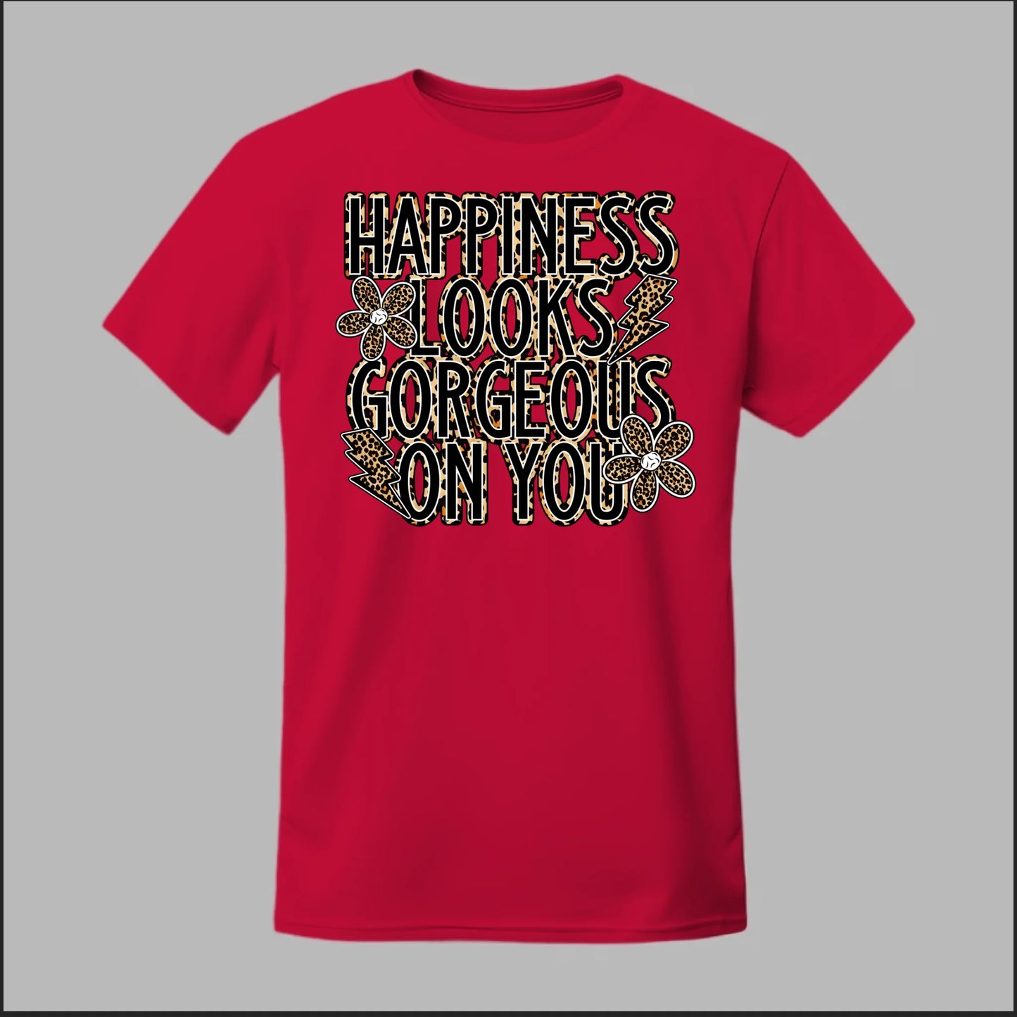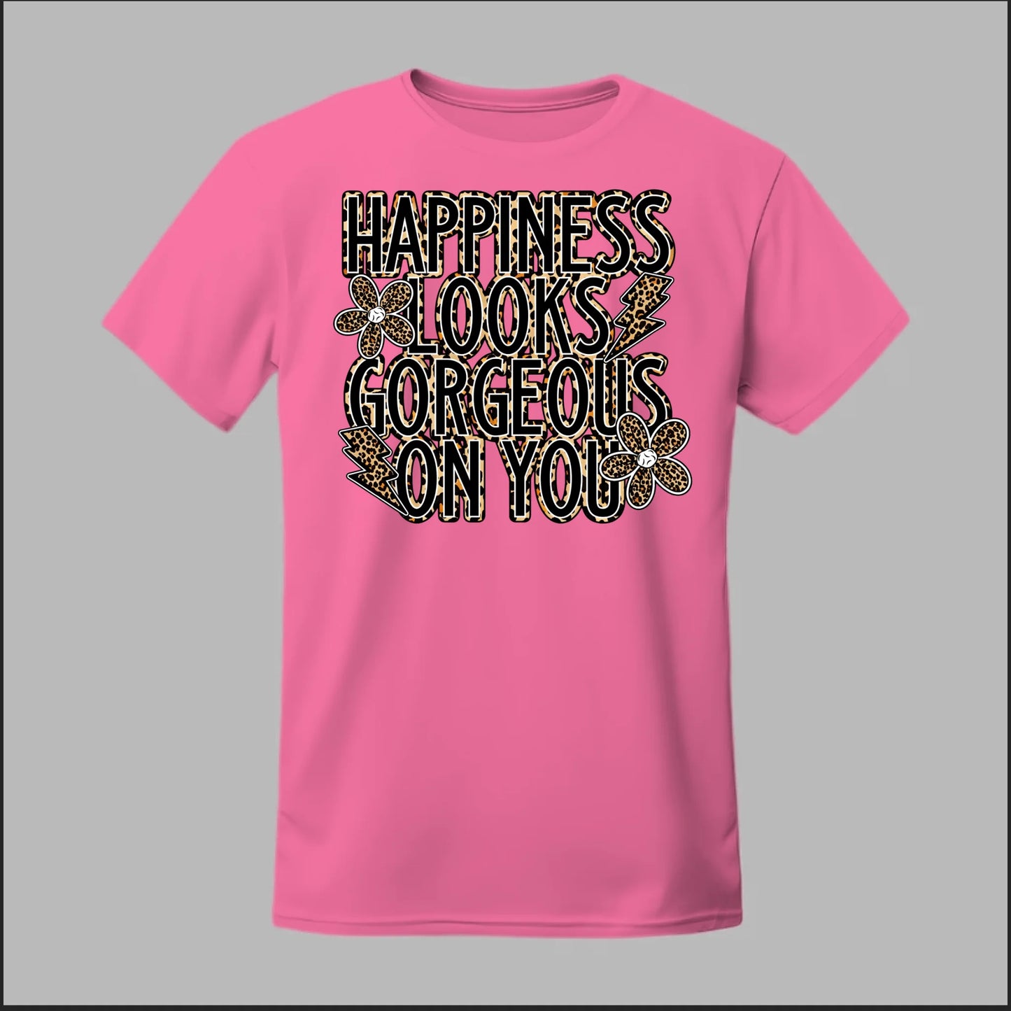 Confidence never goes out of style! This vibrant design features the empowering phrase “Happiness Looks Gorgeous on You” in bold block lettering with leopard print accents, lightning bolts, and flowers for a fun and fierce touch. It’s the perfect tee for spreading good vibes wherever you go.