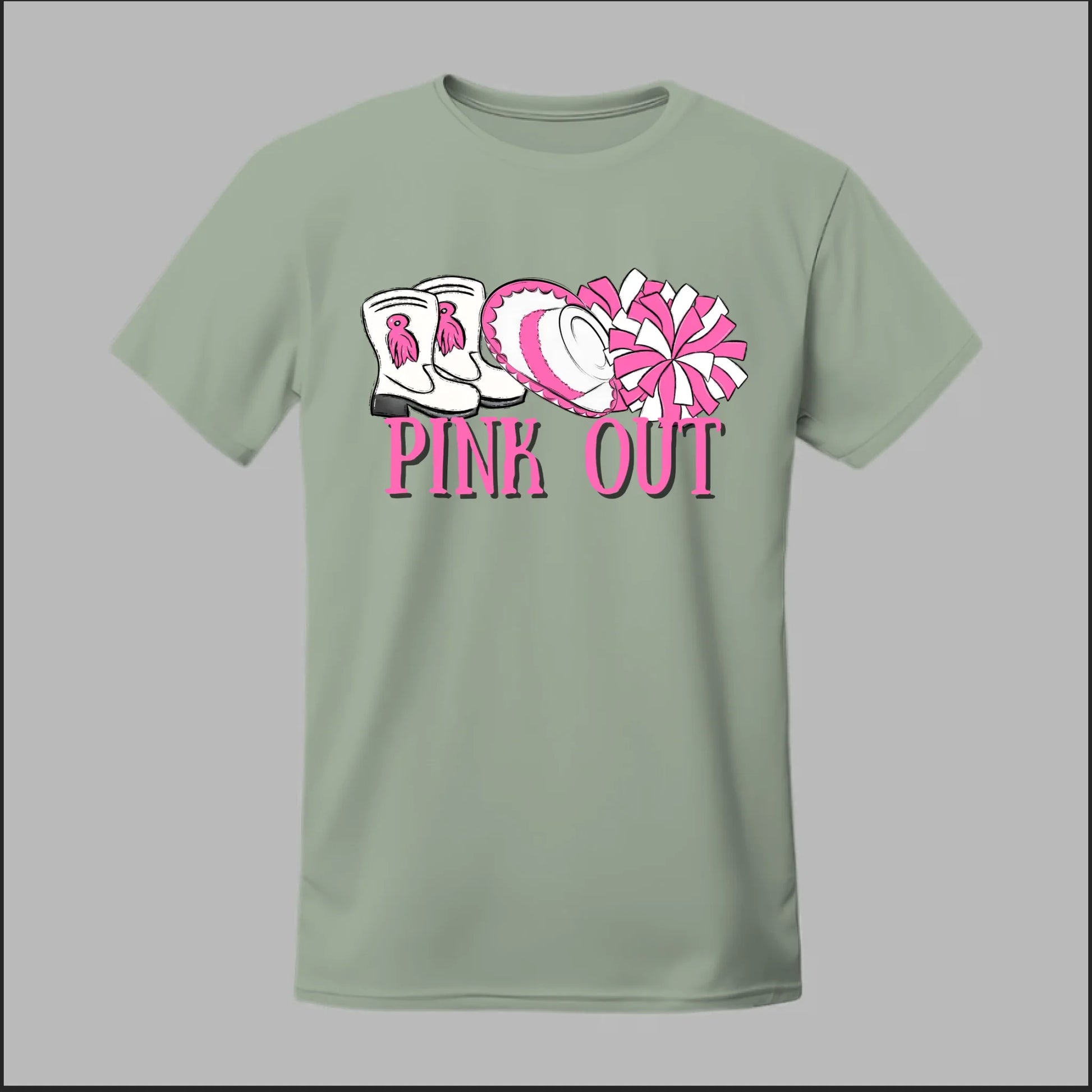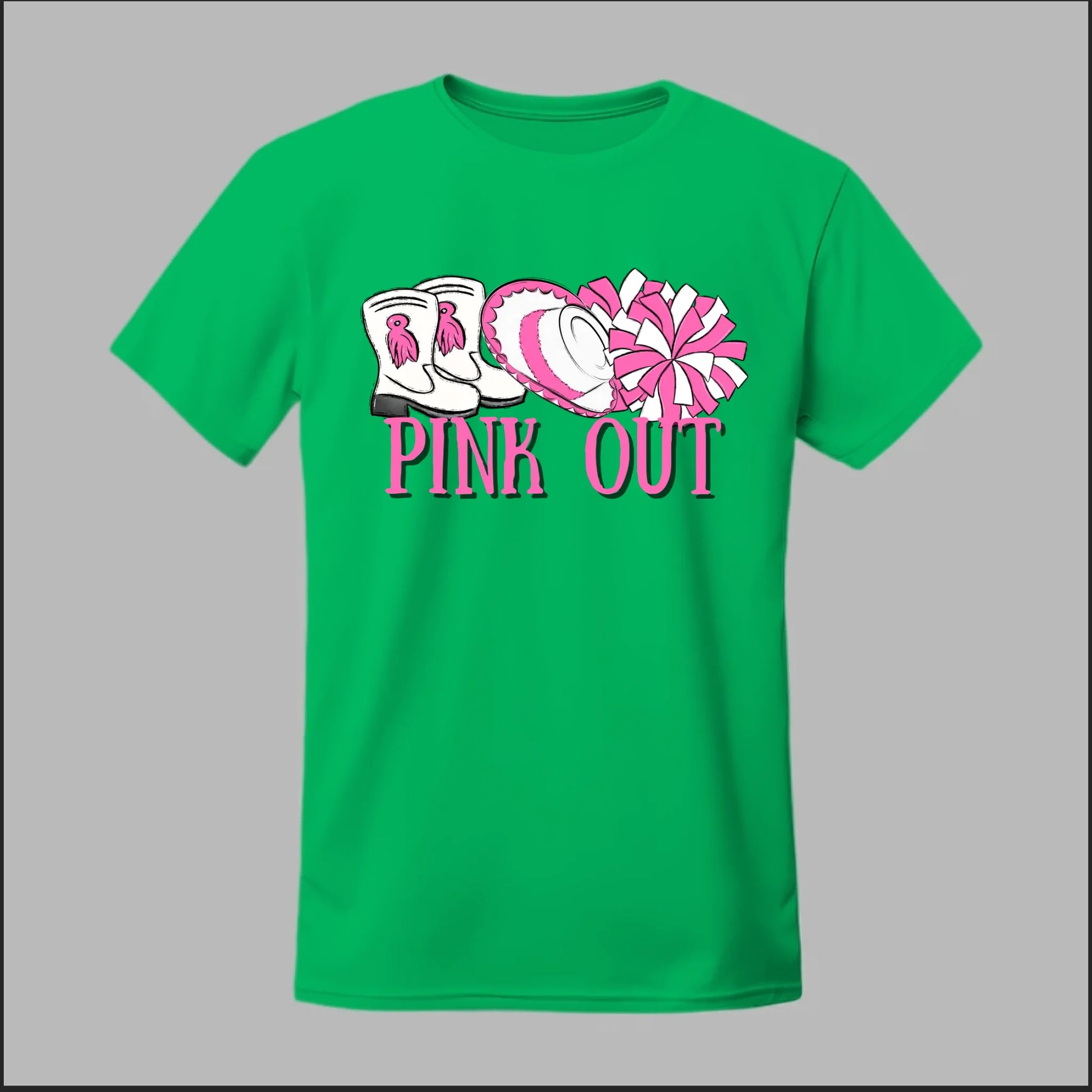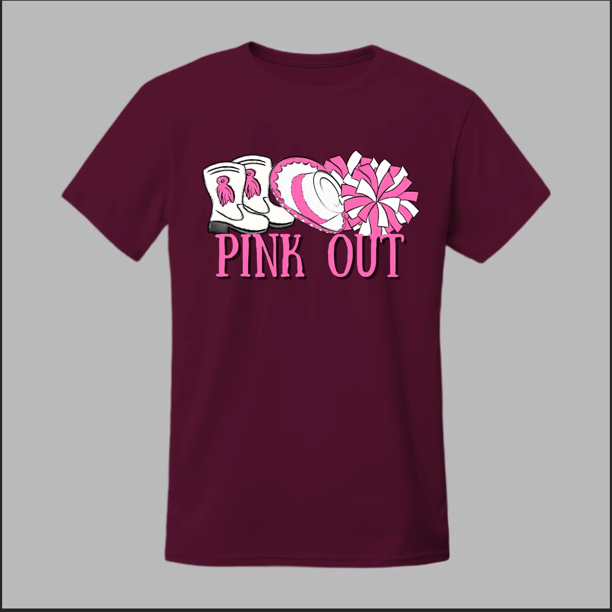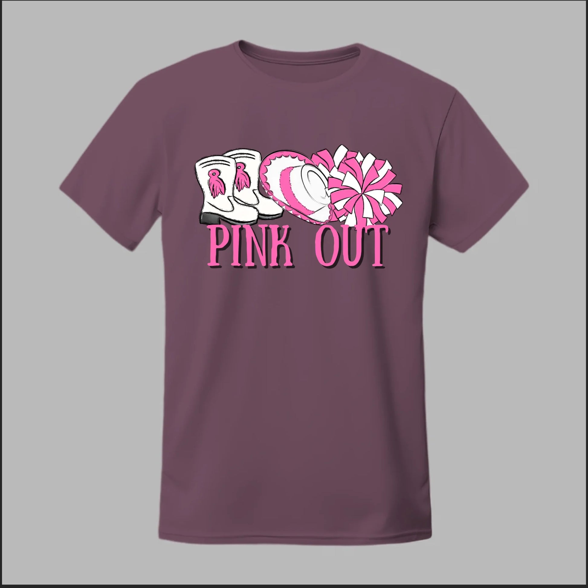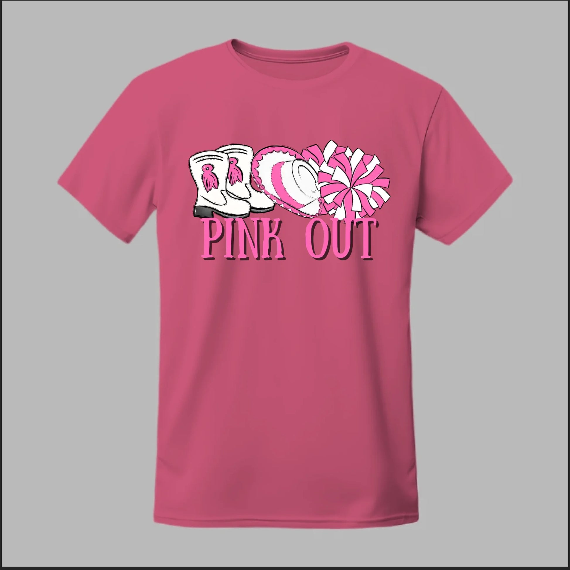 Show your spirit and support with this Hi-Stepper Pink Out tee. Featuring boots, a sombrero, and pom-poms in bold pink, this design celebrates both tradition and Breast Cancer Awareness with style.