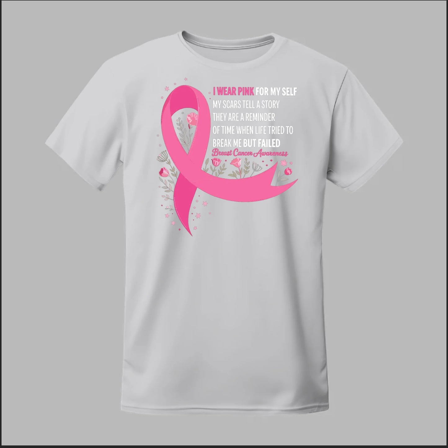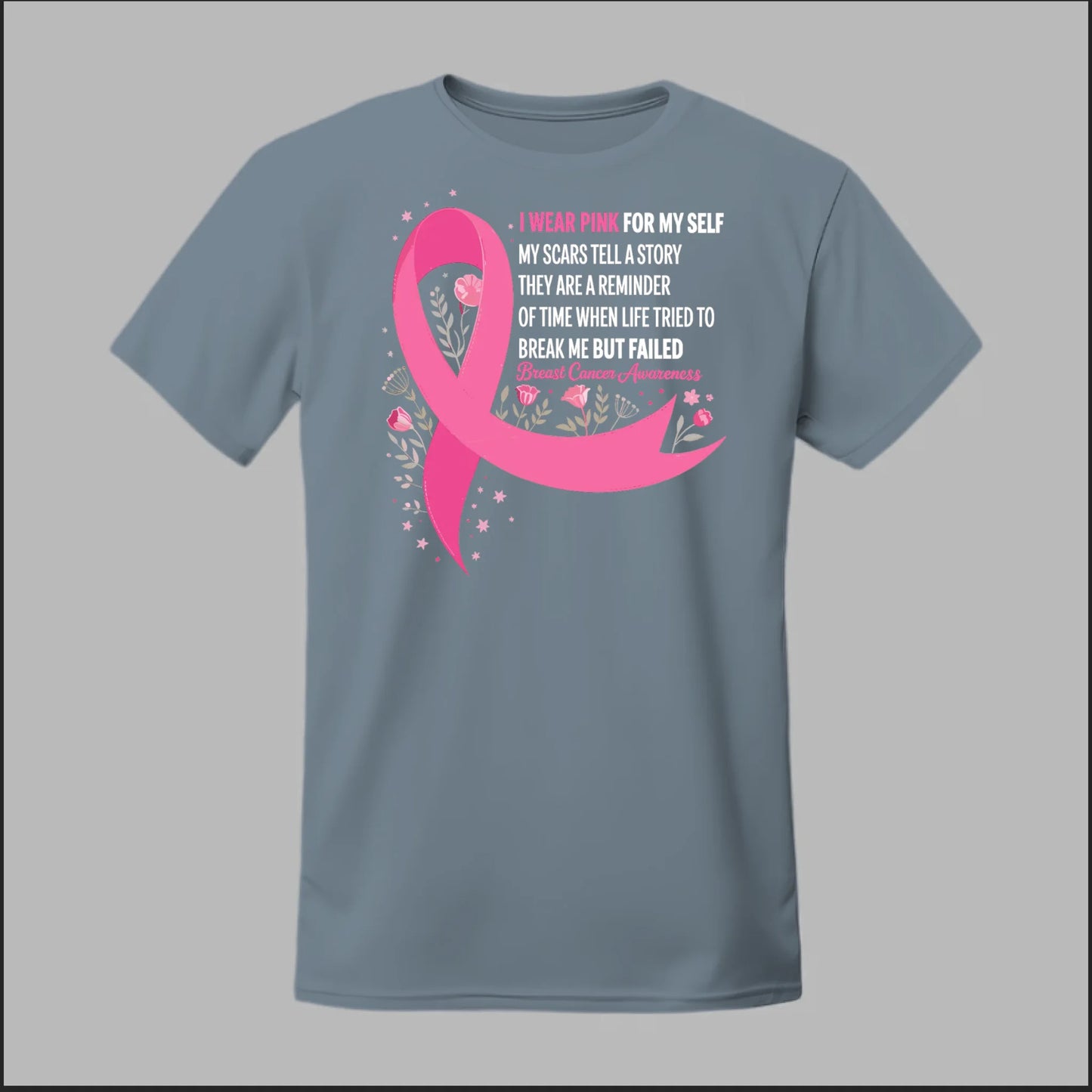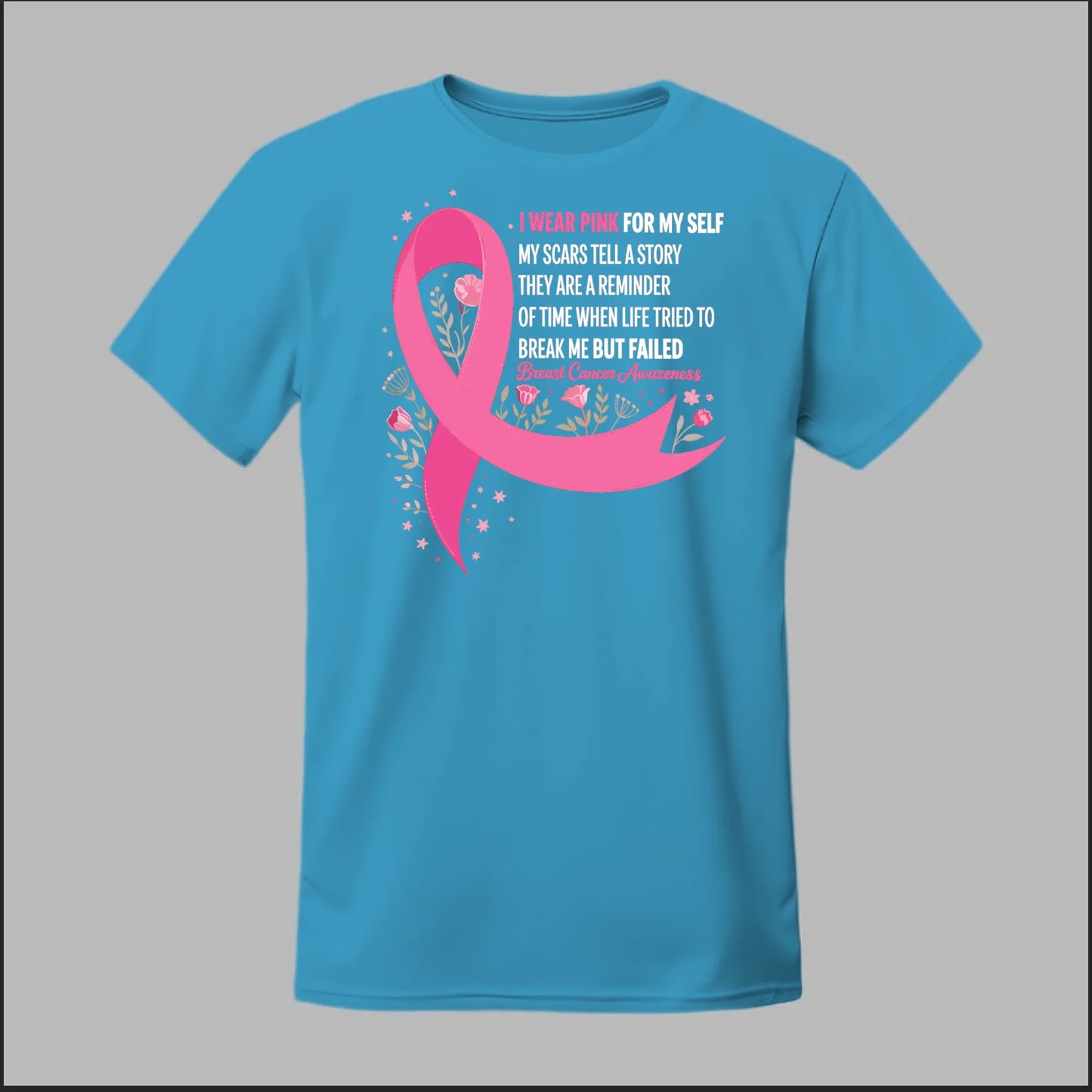Empower yourself with this heartfelt tee. Featuring a pink ribbon with floral accents and the inspiring words, “My scars tell a story… a reminder of when life tried to break me but failed,” this shirt honors strength and survival. Made for comfort and pride.