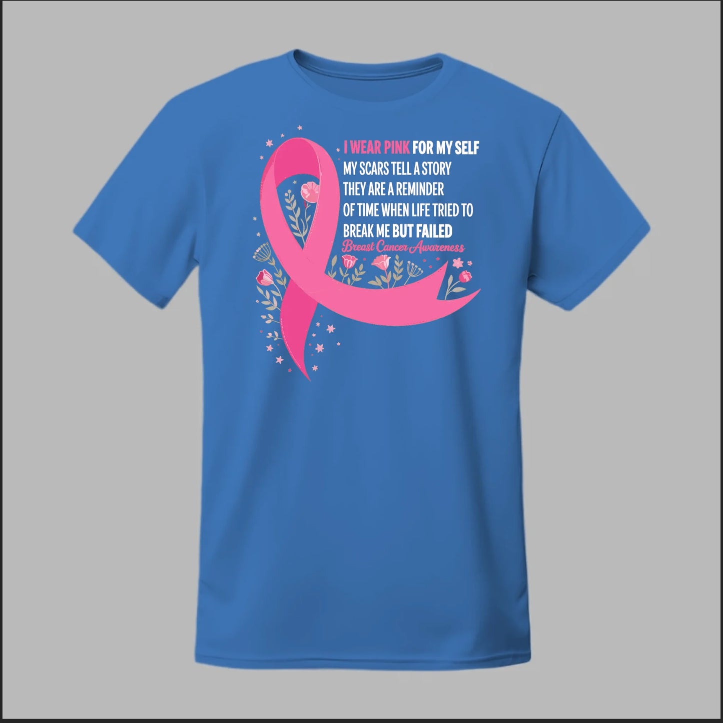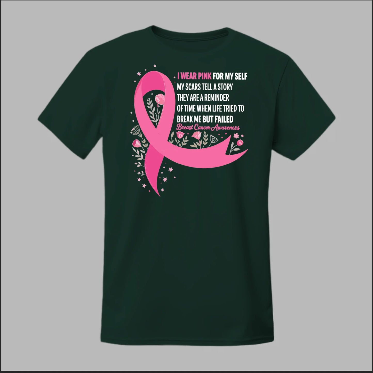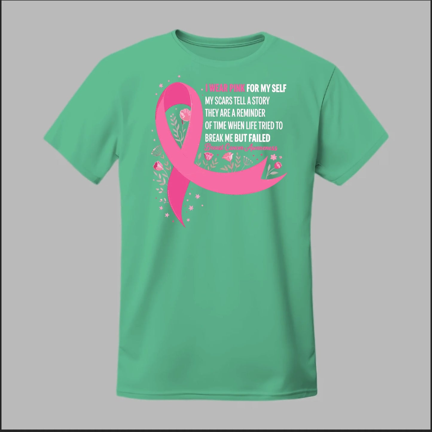 Empower yourself with this heartfelt tee. Featuring a pink ribbon with floral accents and the inspiring words, “My scars tell a story… a reminder of when life tried to break me but failed,” this shirt honors strength and survival. Made for comfort and pride.