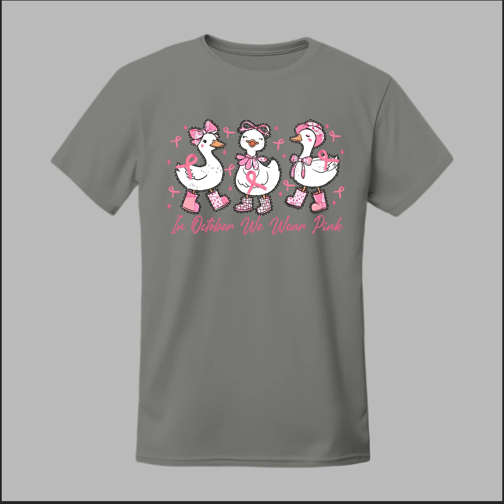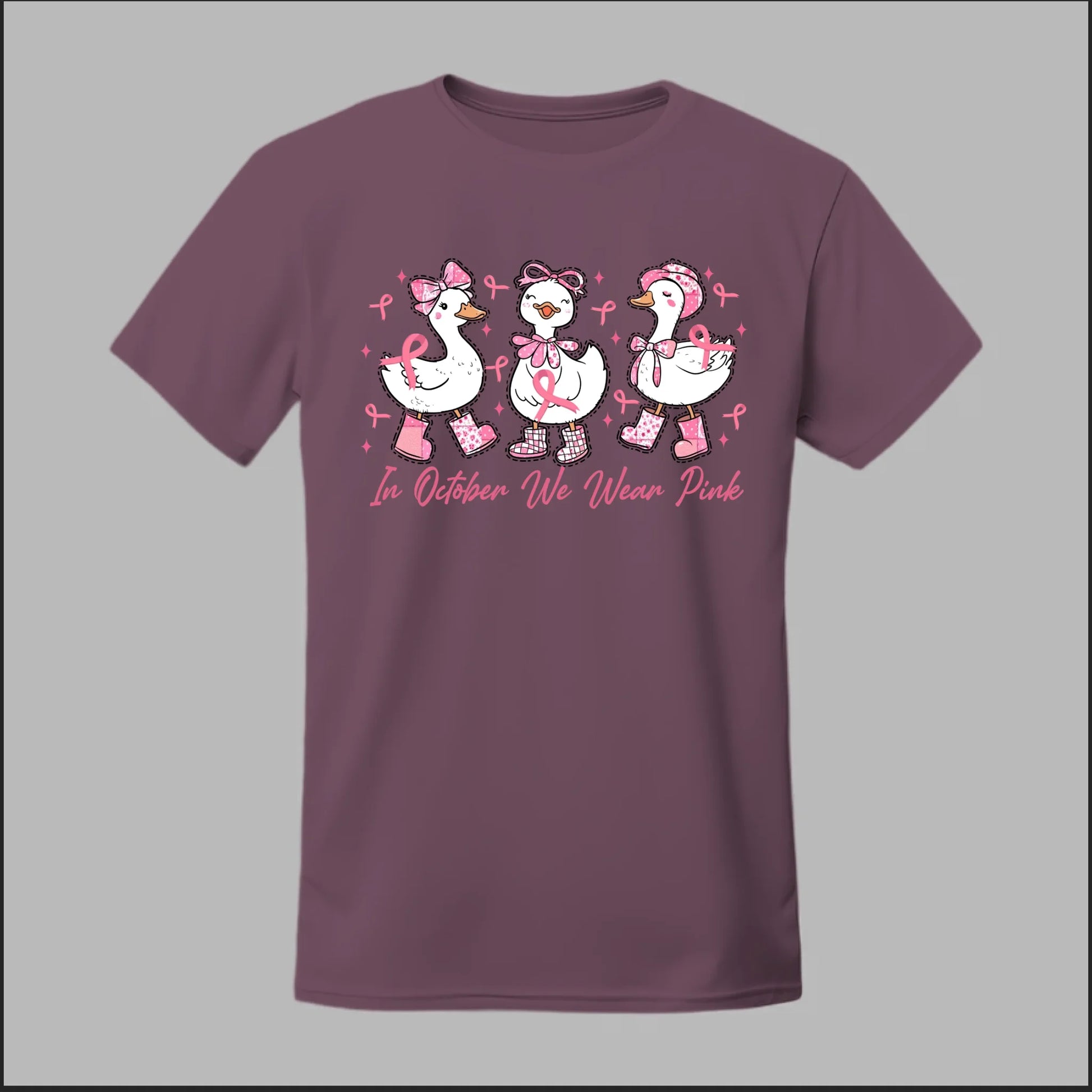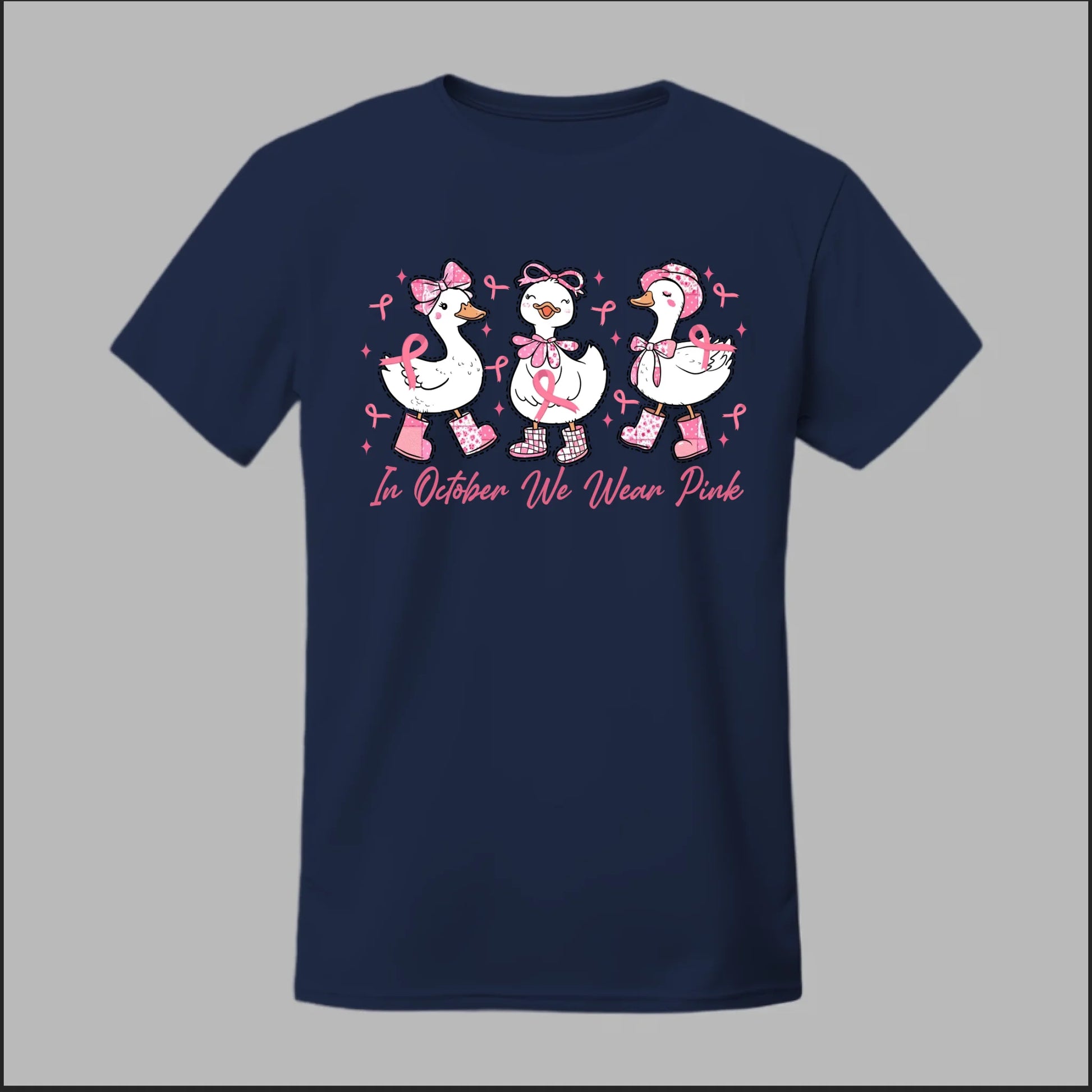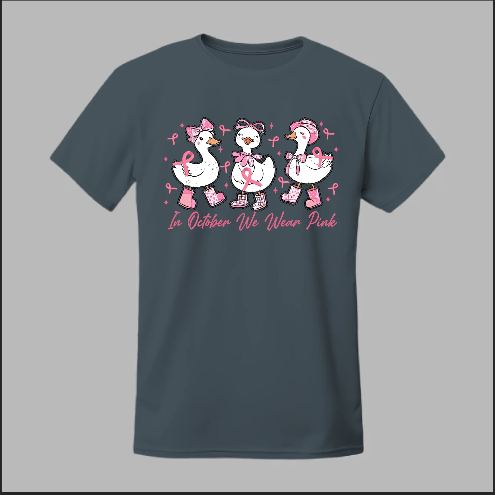 The In October We Wear Pink Geese Tee brings charm and awareness together with three stylish geese dressed in pink bows and boots, surrounded by ribbons of support. This playful yet powerful design is perfect for showing solidarity during Breast Cancer Awareness Month while adding a fun and fashionable twist to your outfit.