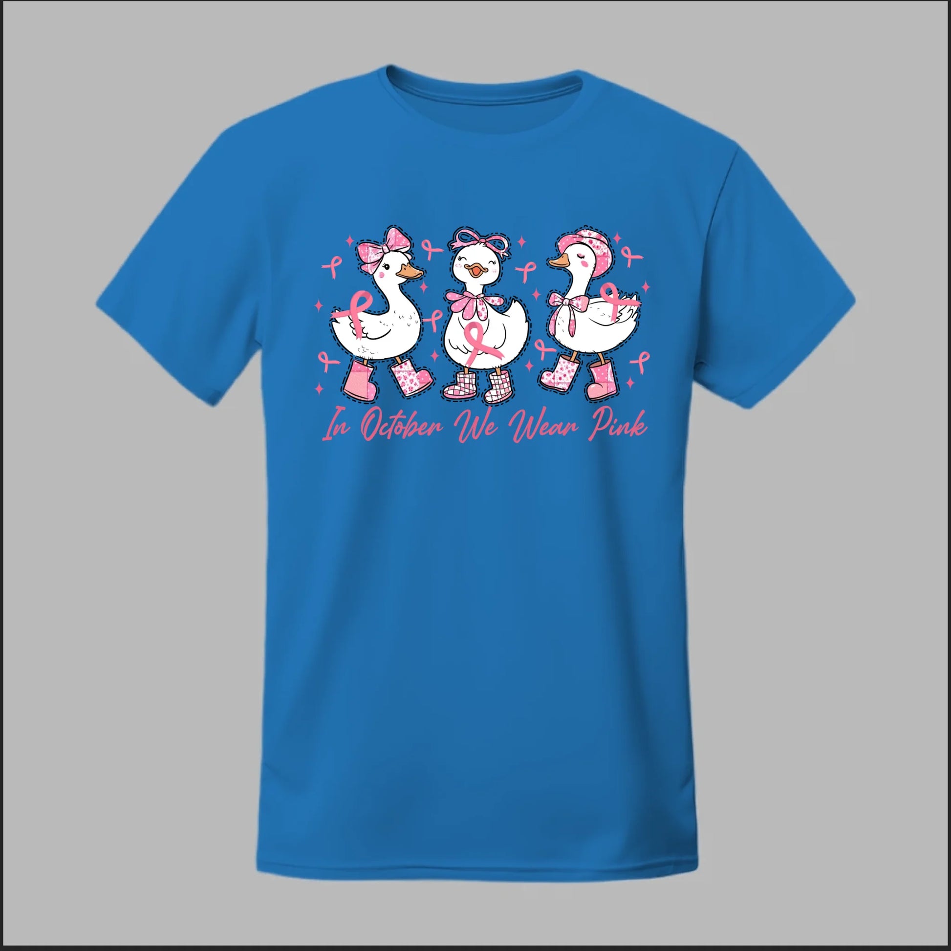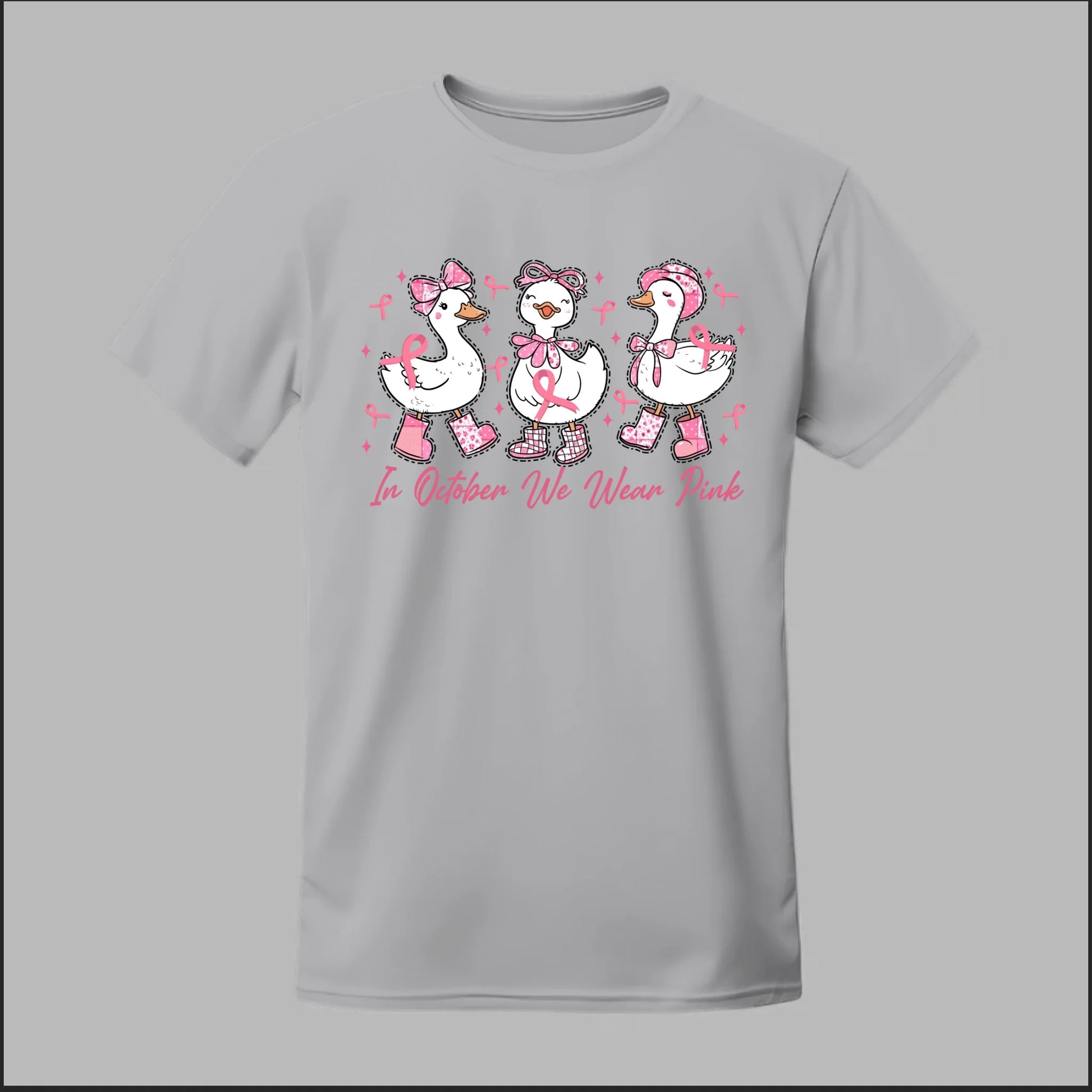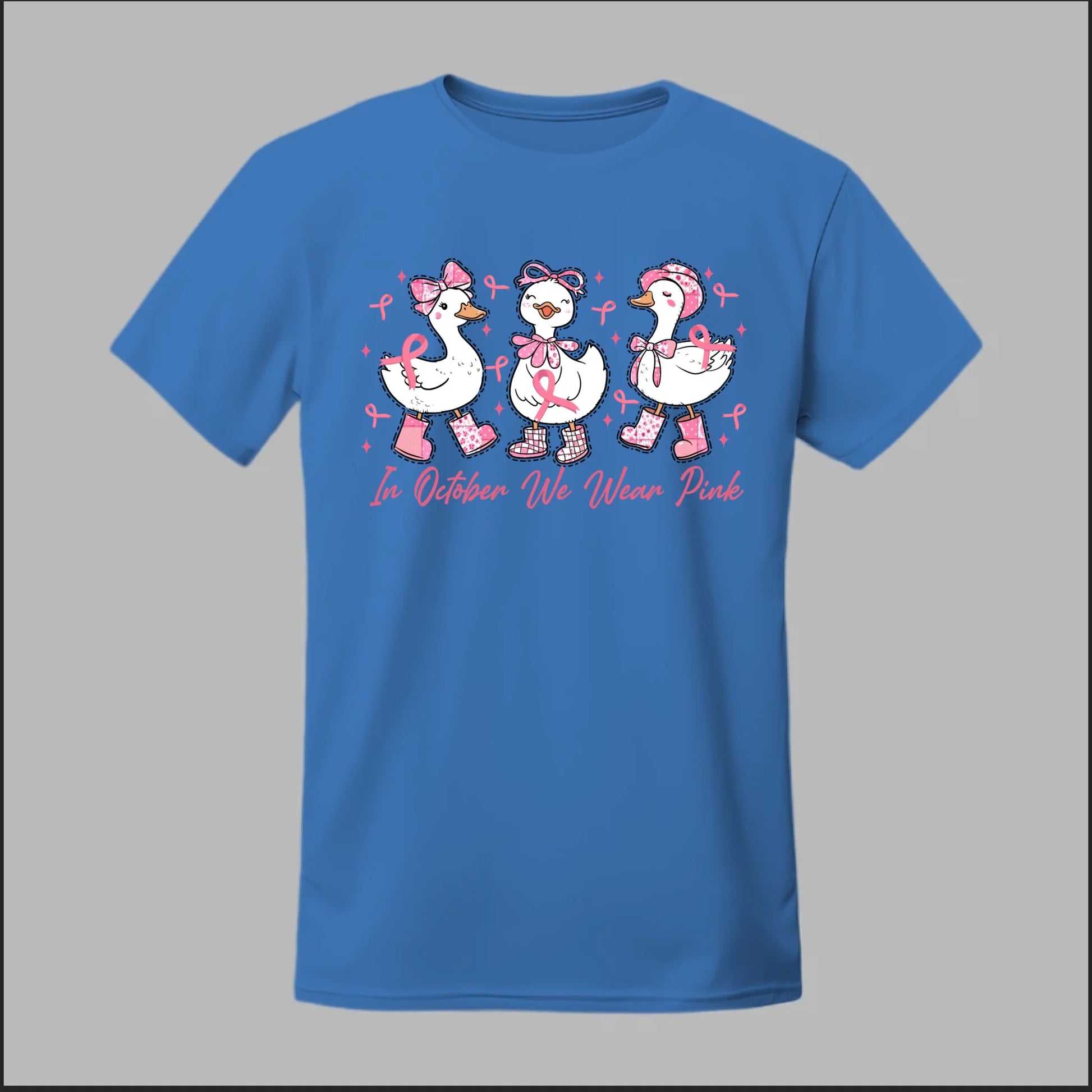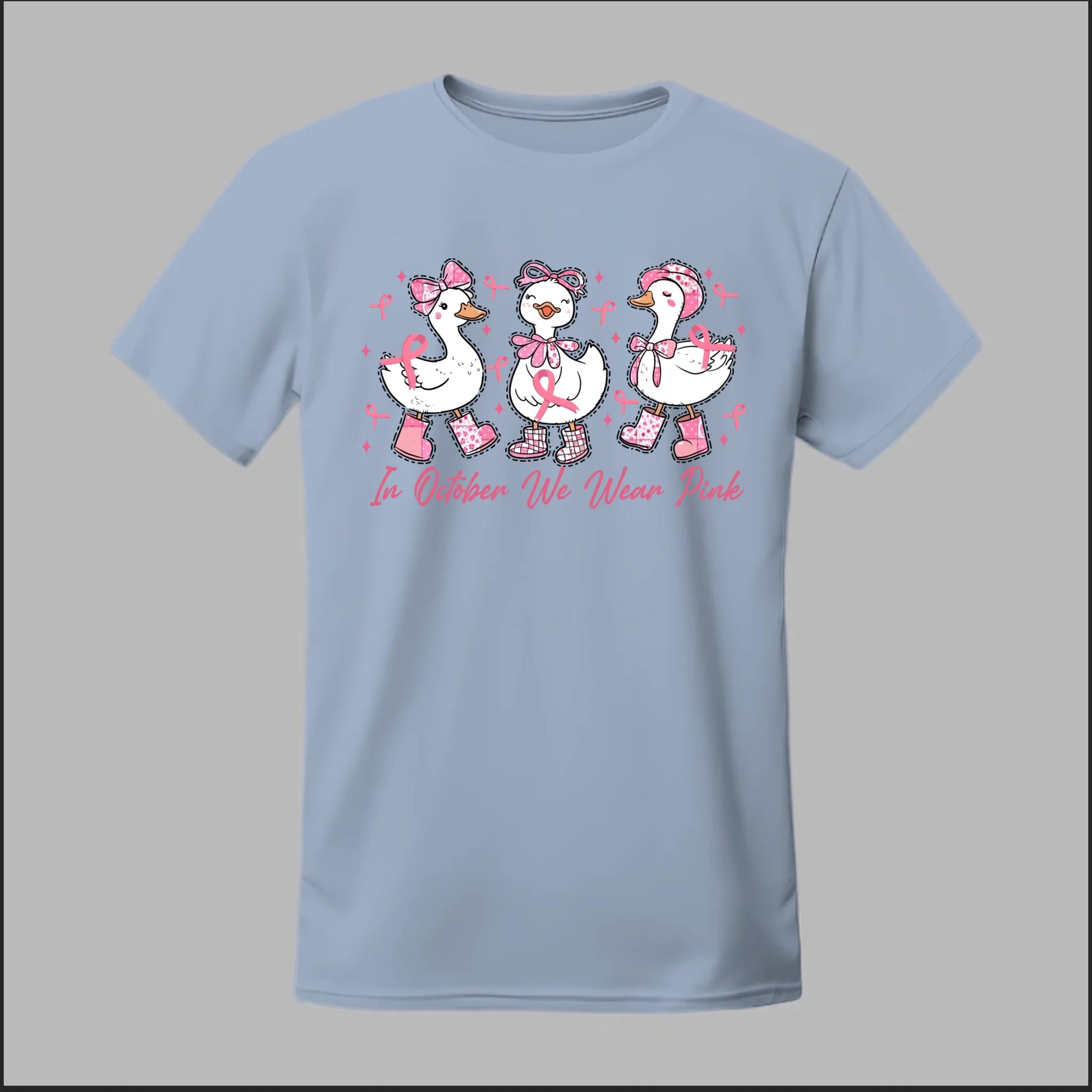 The In October We Wear Pink Geese Tee brings charm and awareness together with three stylish geese dressed in pink bows and boots, surrounded by ribbons of support. This playful yet powerful design is perfect for showing solidarity during Breast Cancer Awareness Month while adding a fun and fashionable twist to your outfit.