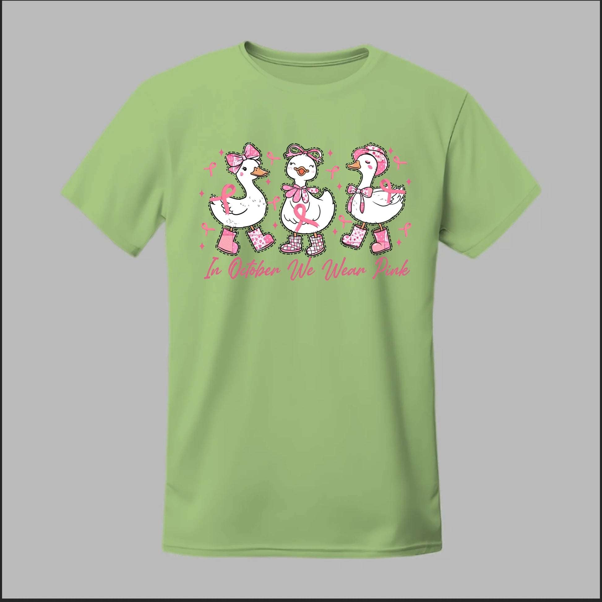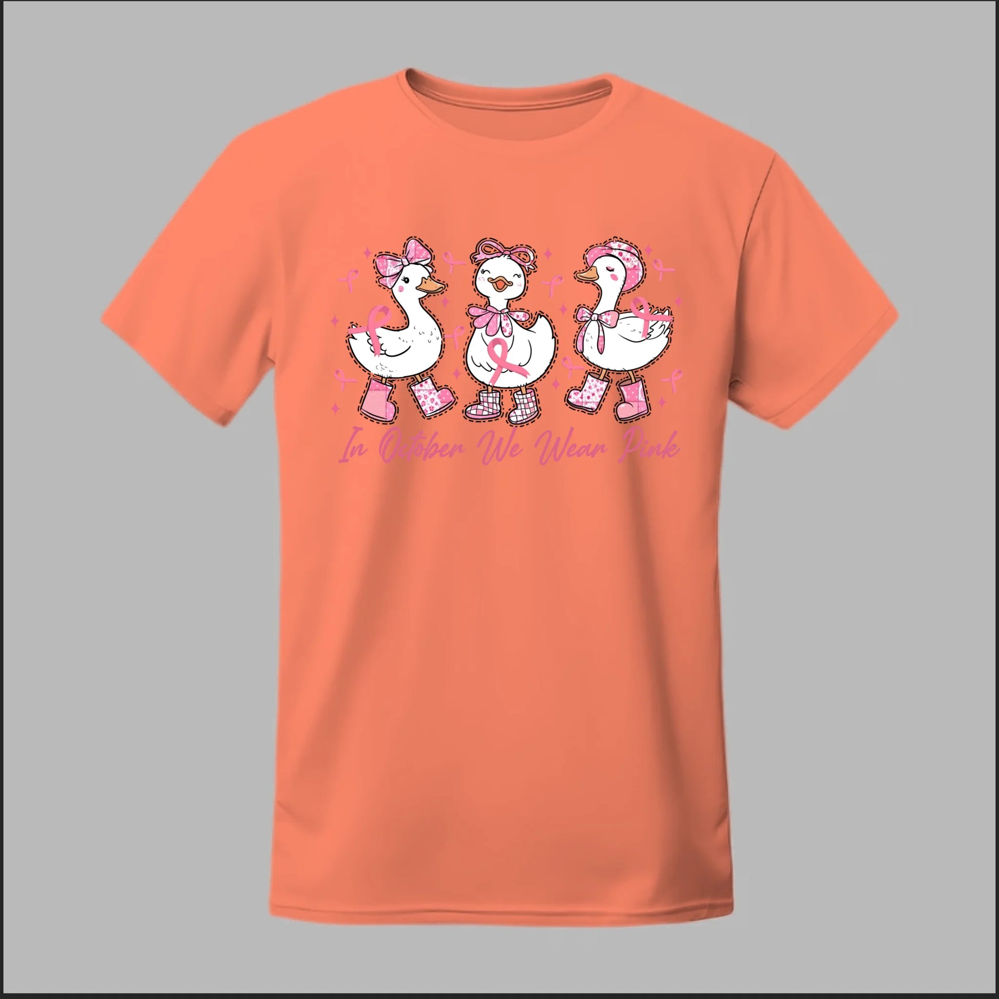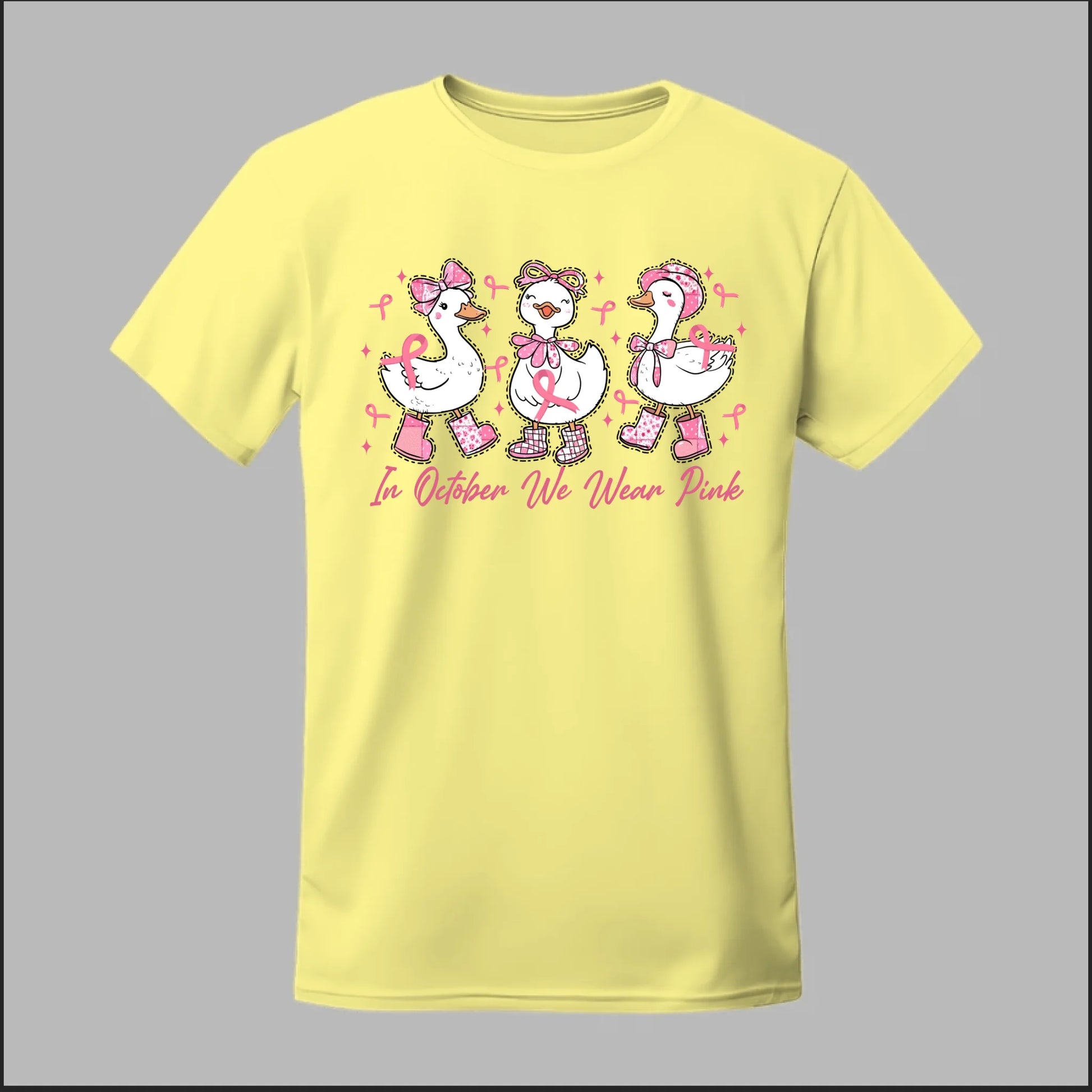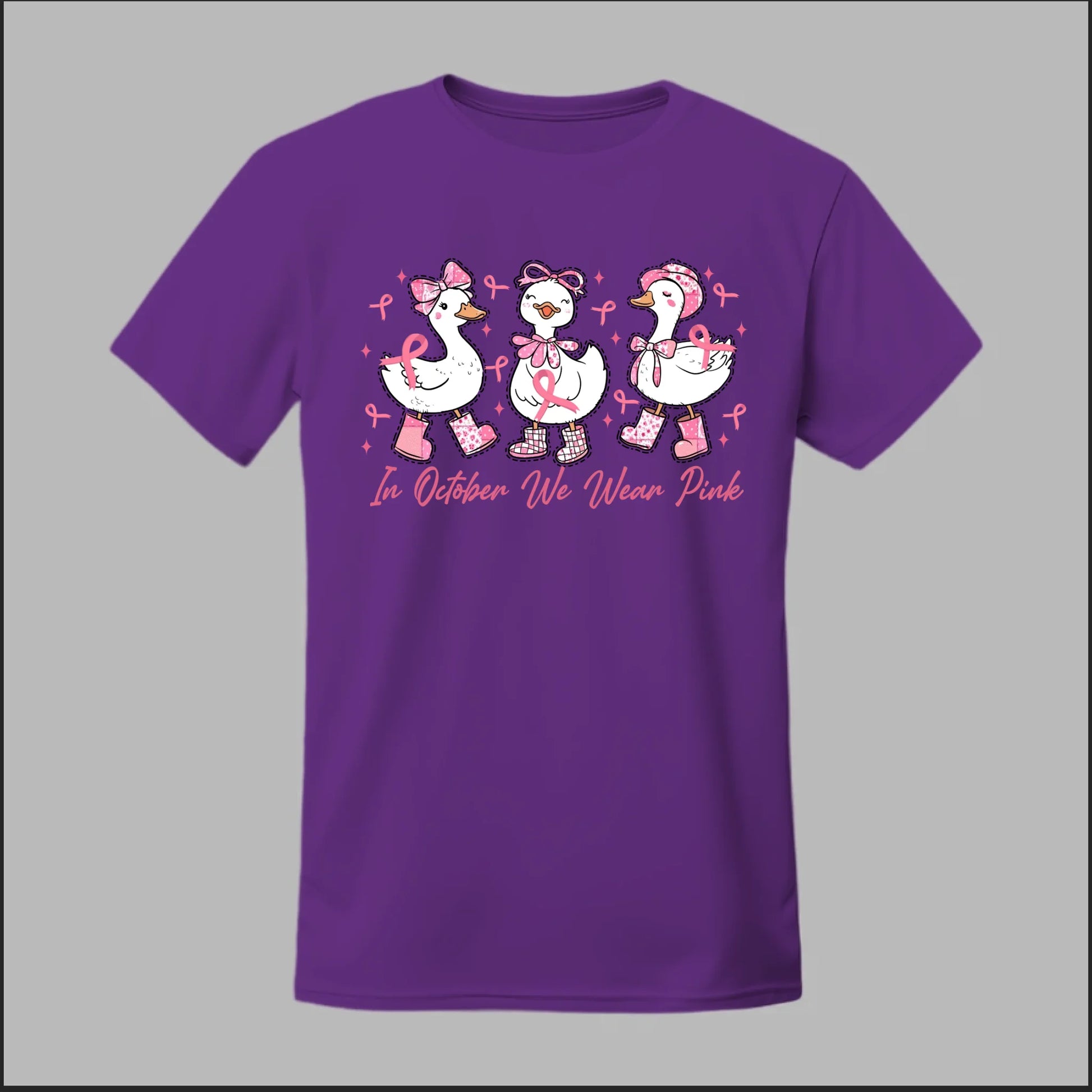 The In October We Wear Pink Geese Tee brings charm and awareness together with three stylish geese dressed in pink bows and boots, surrounded by ribbons of support. This playful yet powerful design is perfect for showing solidarity during Breast Cancer Awareness Month while adding a fun and fashionable twist to your outfit.