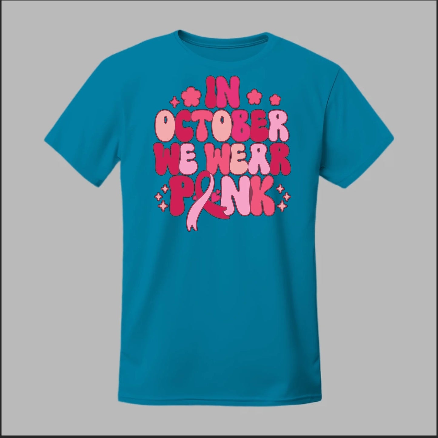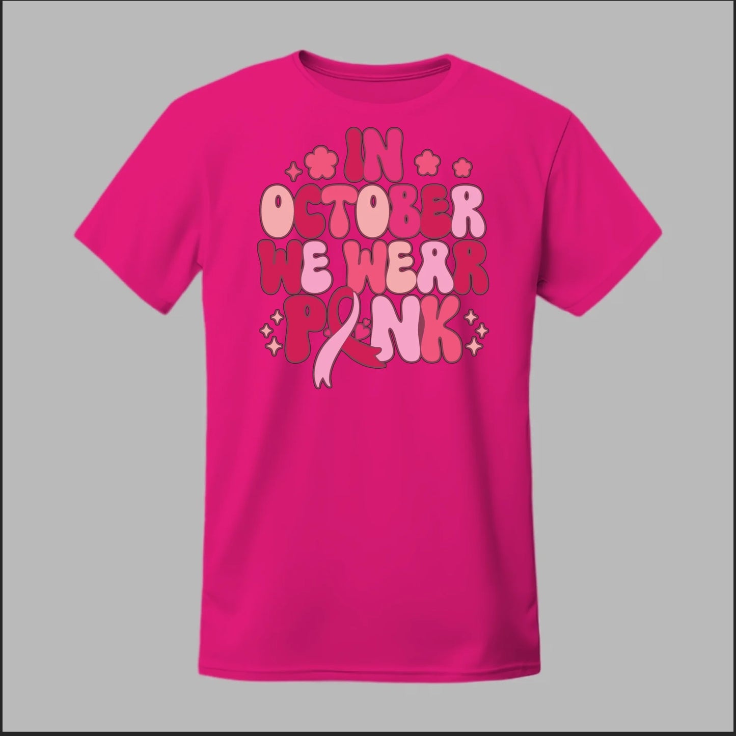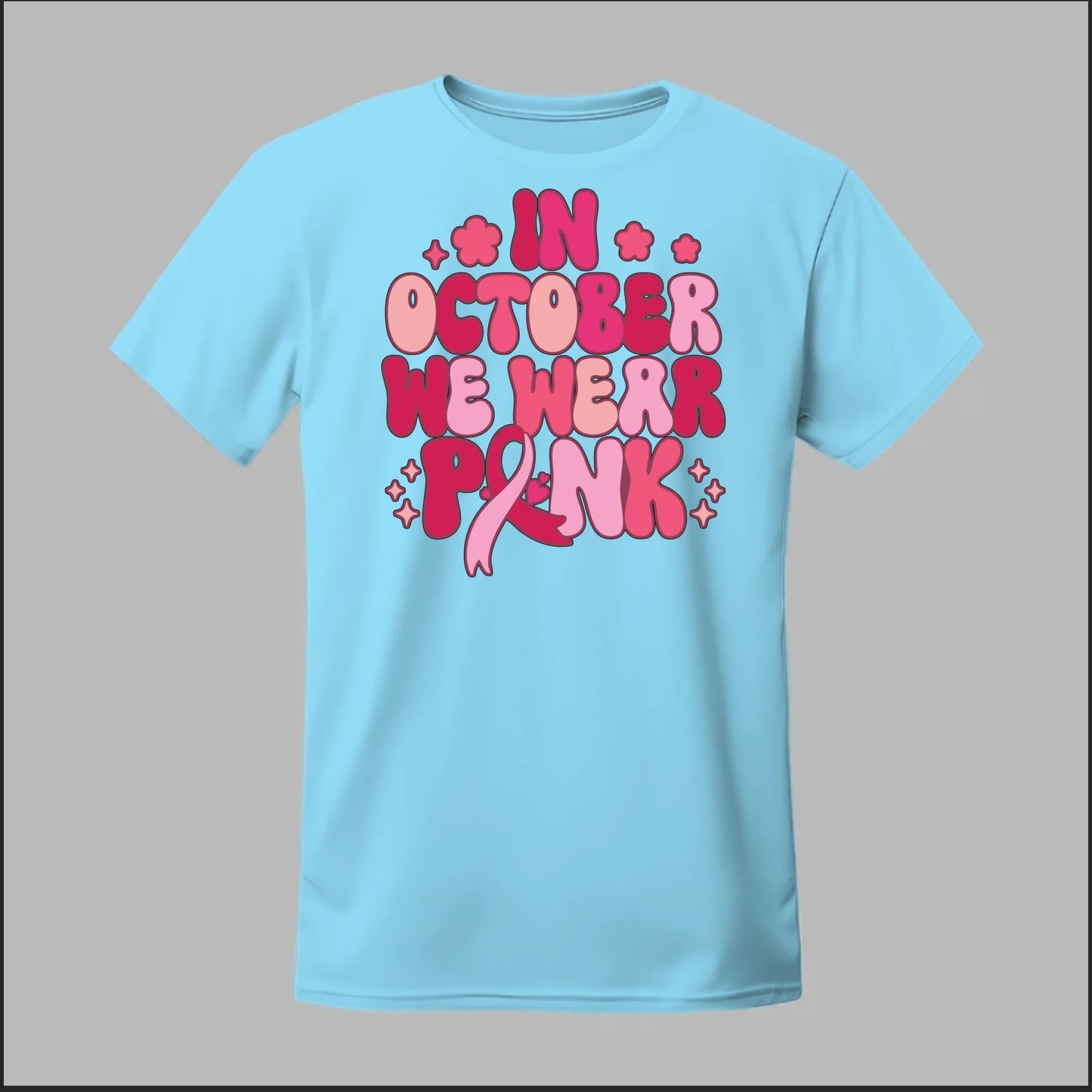 Show your support in style with the In October We Wear Pink Tee. Featuring bold, retro-inspired bubble letters in shades of pink and the iconic breast cancer awareness ribbon, this tee is the perfect way to spread hope and strength during Breast Cancer Awareness Month.