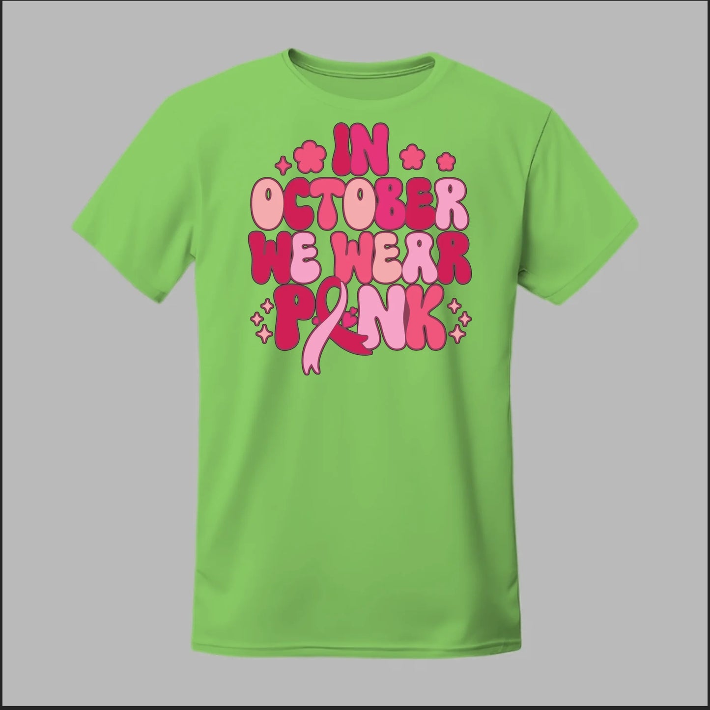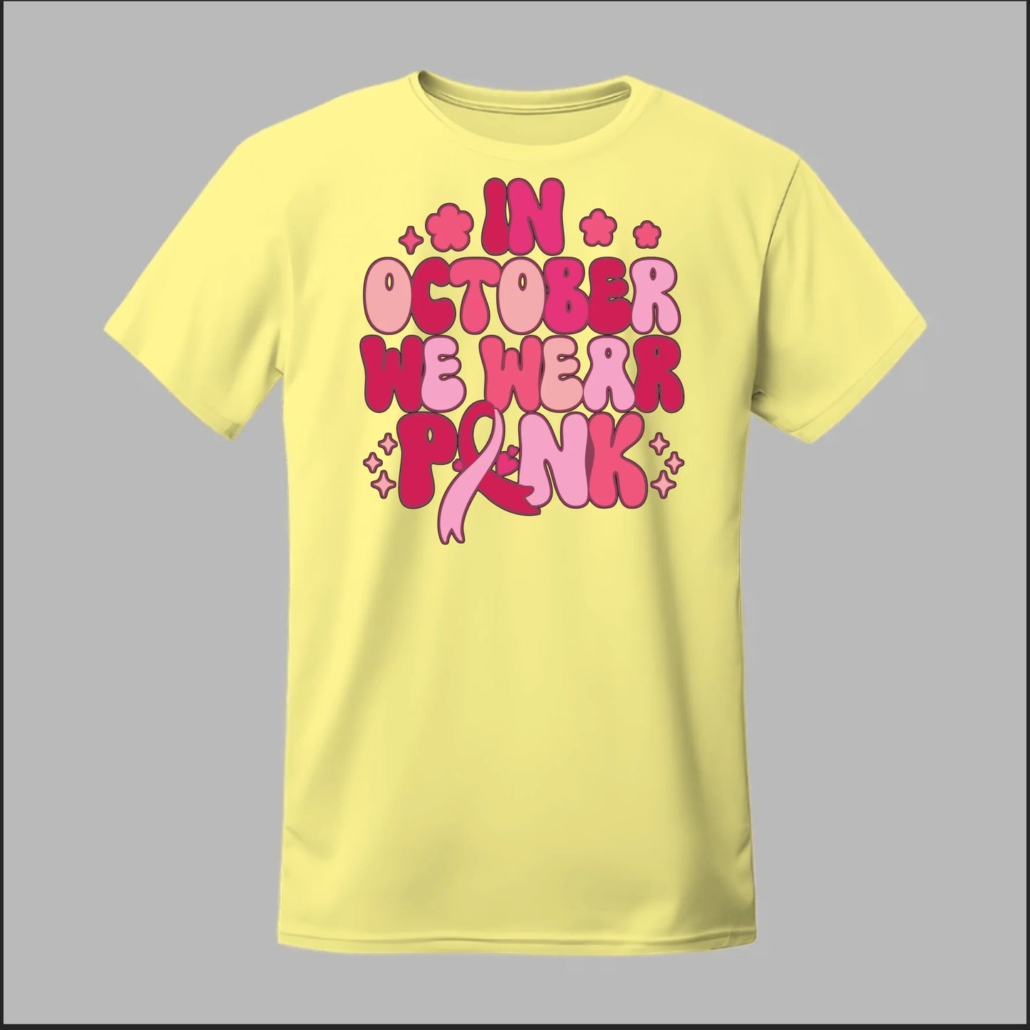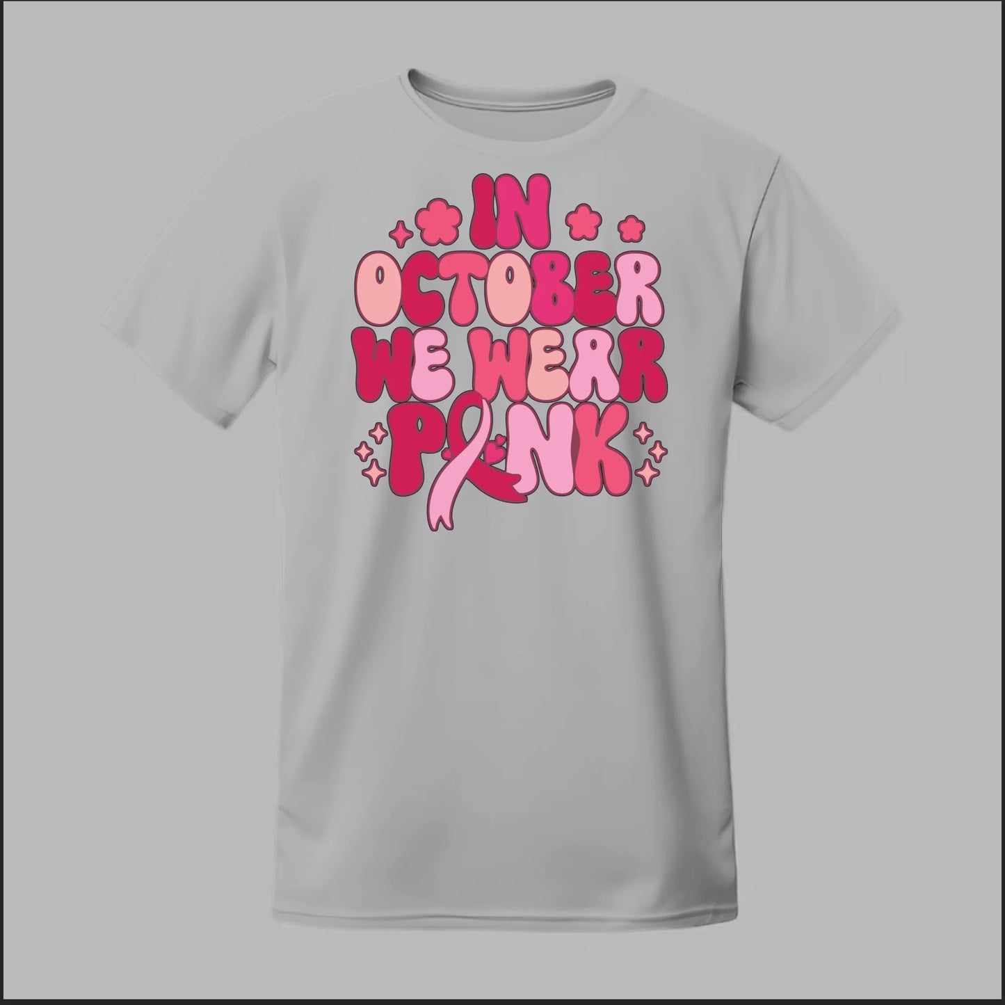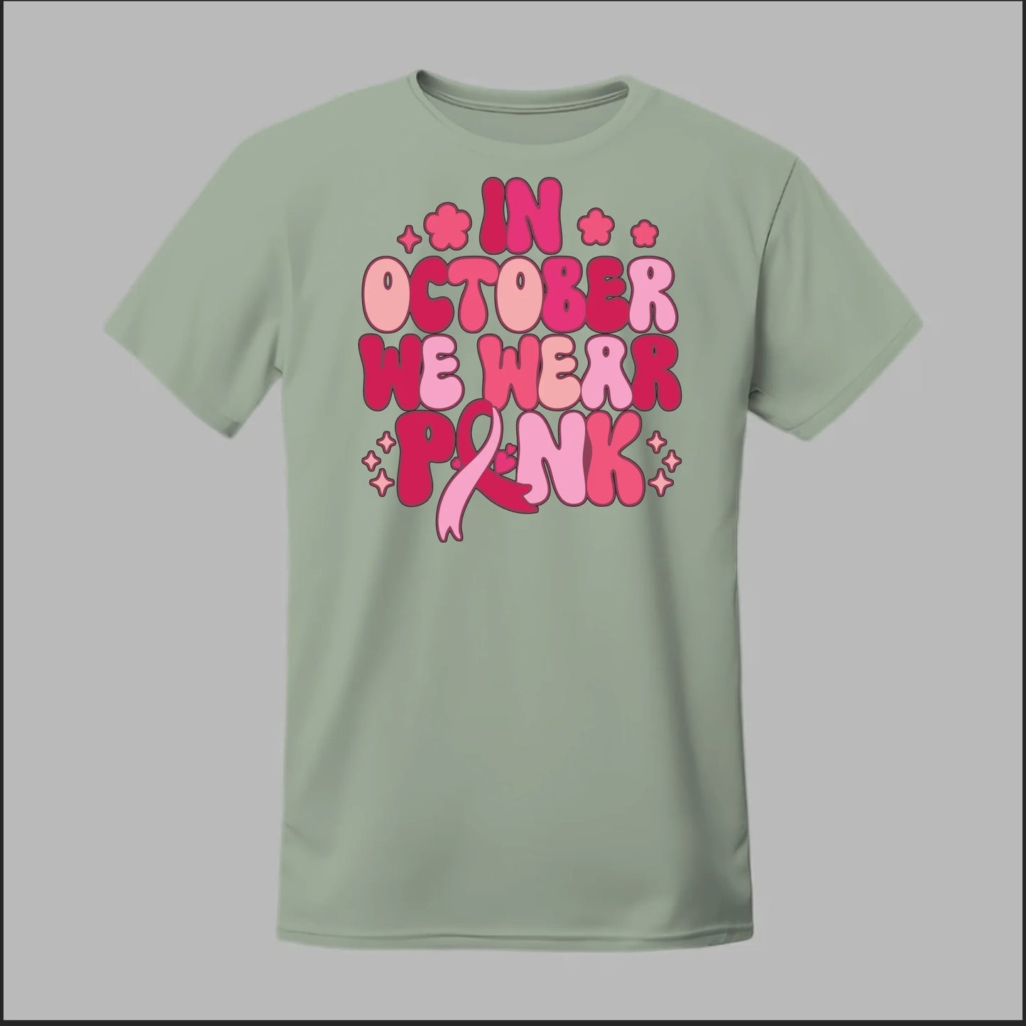 Show your support in style with the In October We Wear Pink Tee. Featuring bold, retro-inspired bubble letters in shades of pink and the iconic breast cancer awareness ribbon, this tee is the perfect way to spread hope and strength during Breast Cancer Awareness Month.