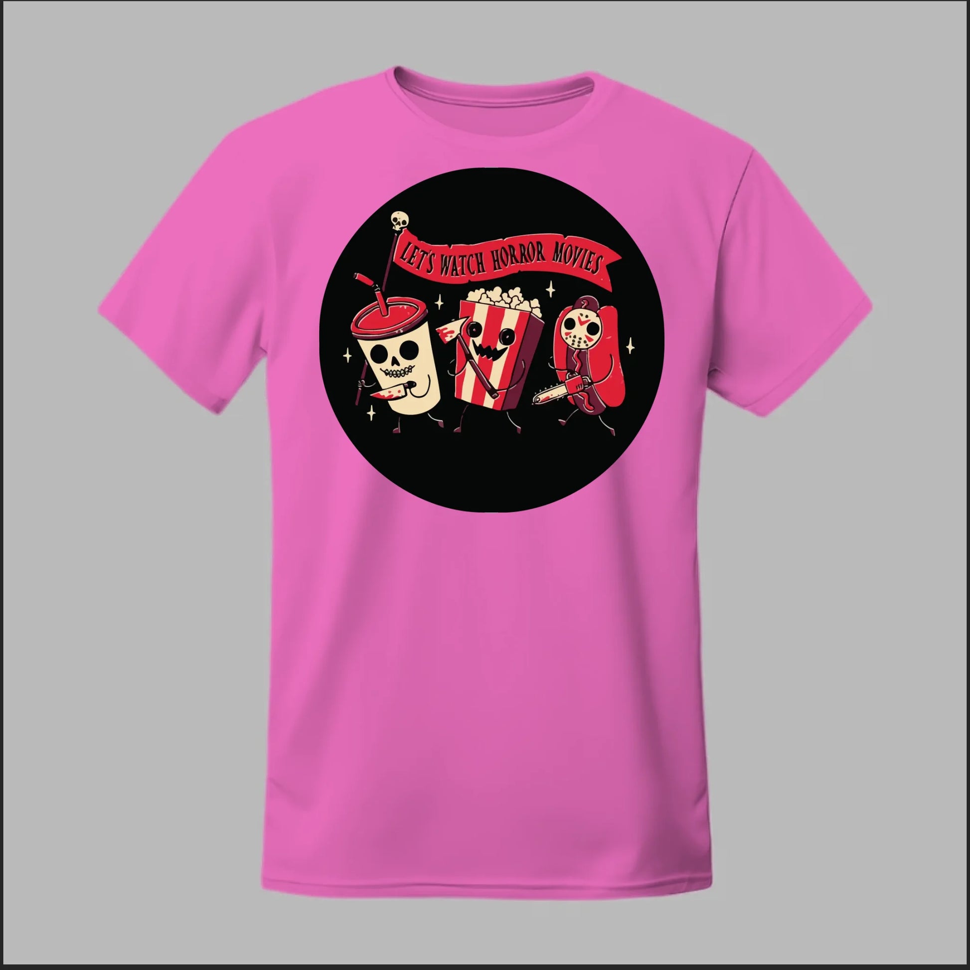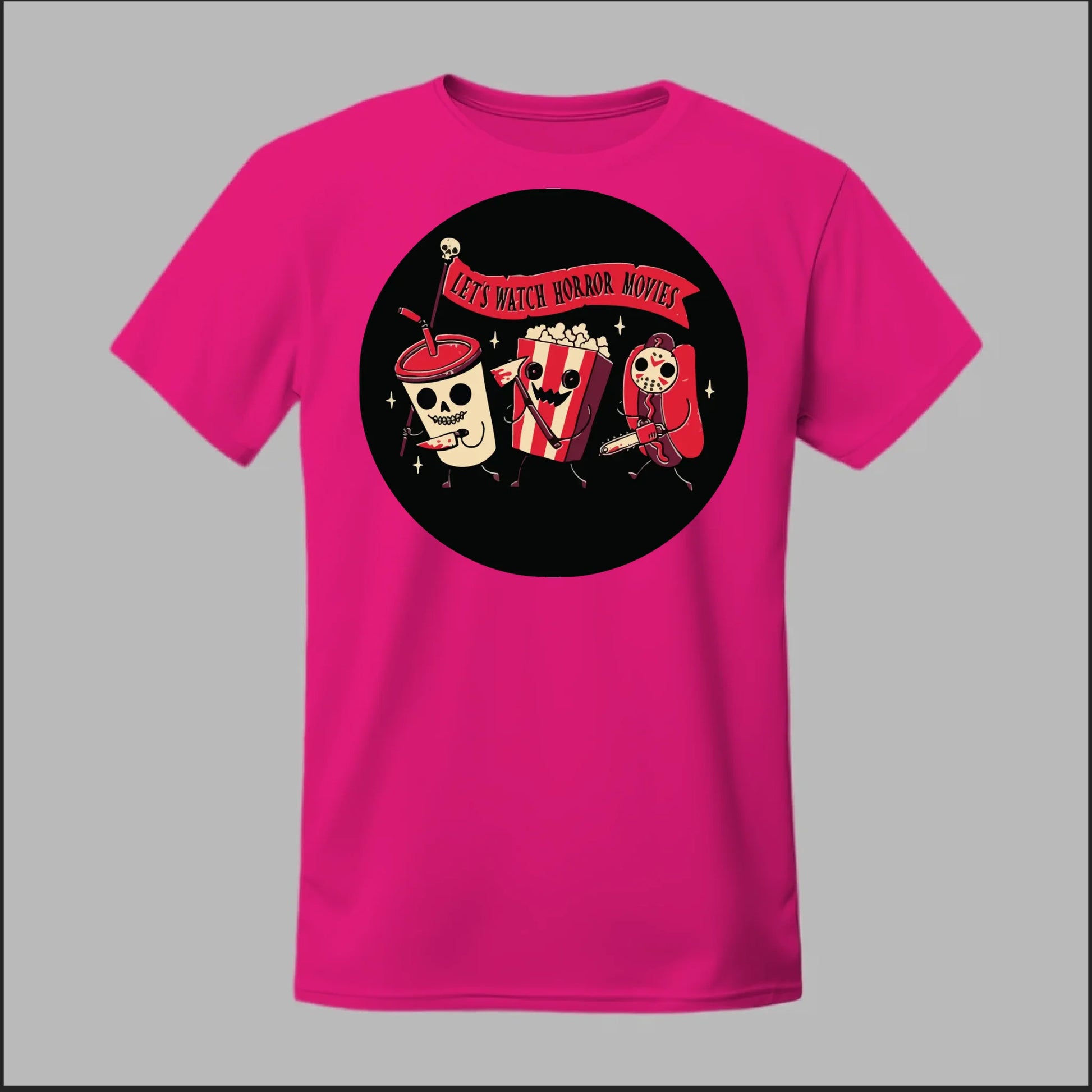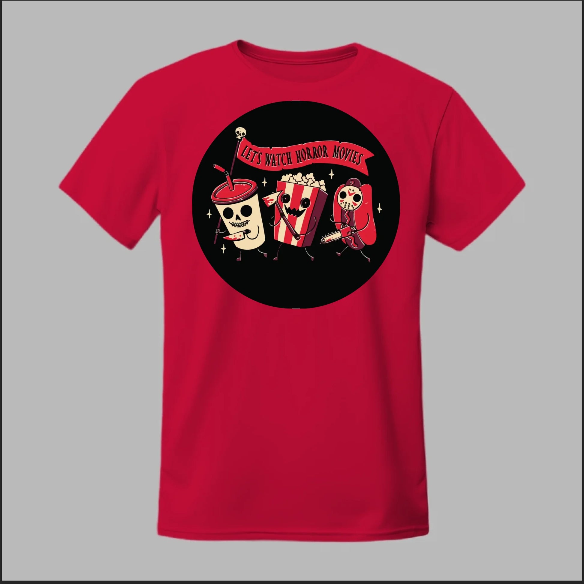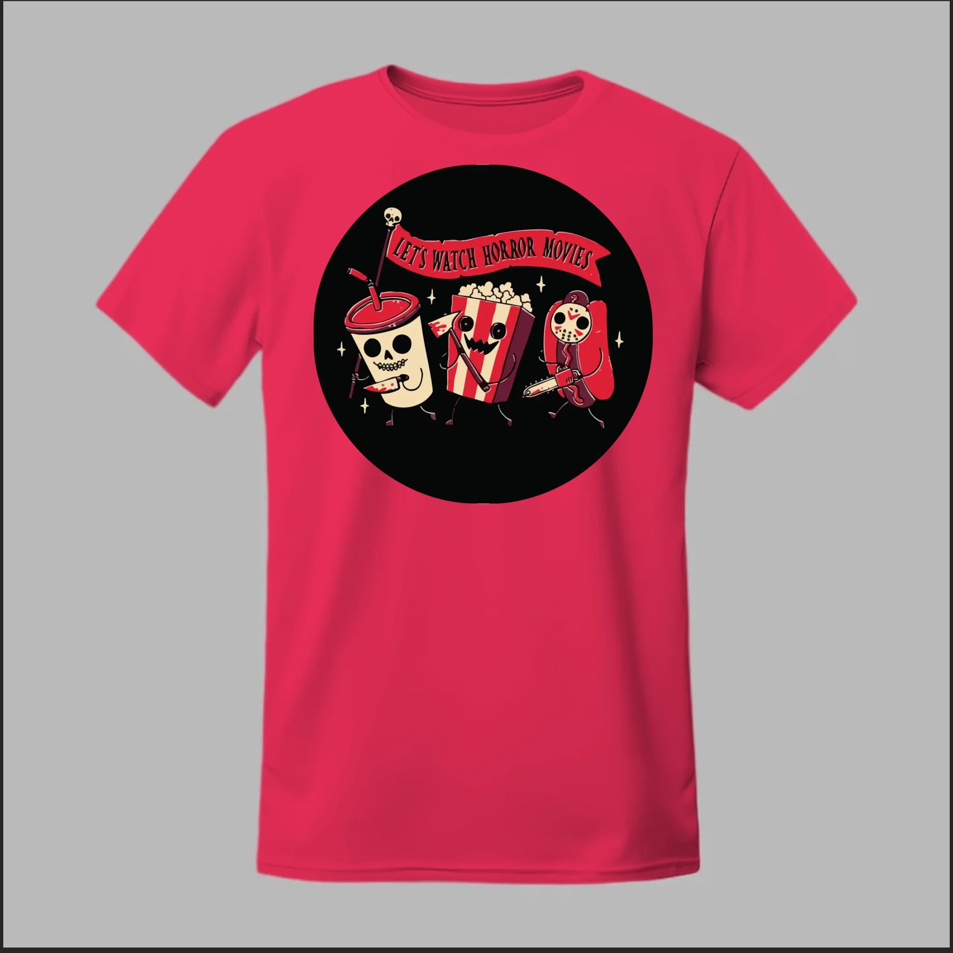 Grab your popcorn, soda, and hot dog—because it’s time for a horror movie marathon! Our Let’s Watch Horror Movies is perfect for anyone who loves spooky flicks and slasher vibes. Fun cartoon design featuring creepy popcorn, soda, and hotdog characters. Perfect for horror fans, Halloween parties, or scary movie nights.
