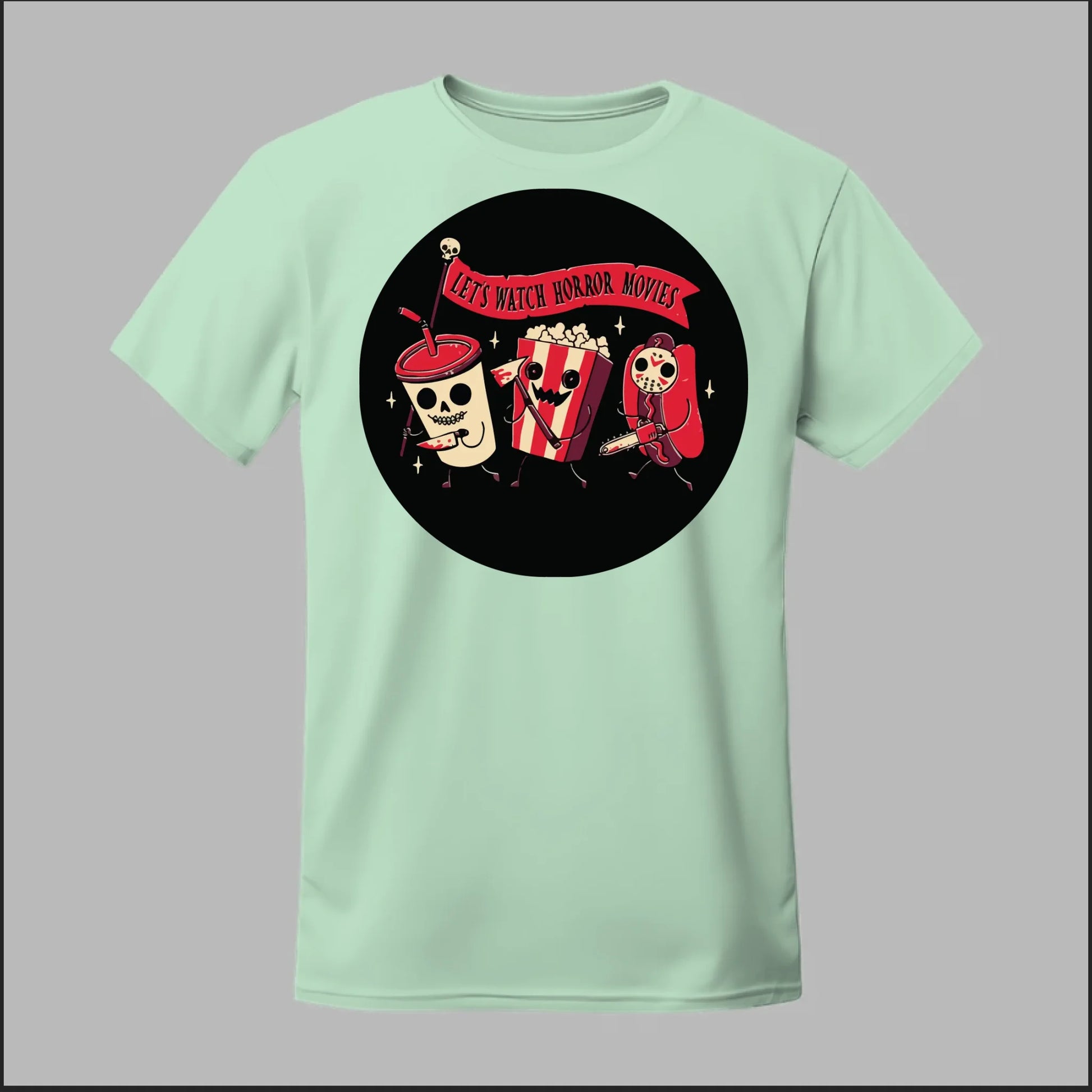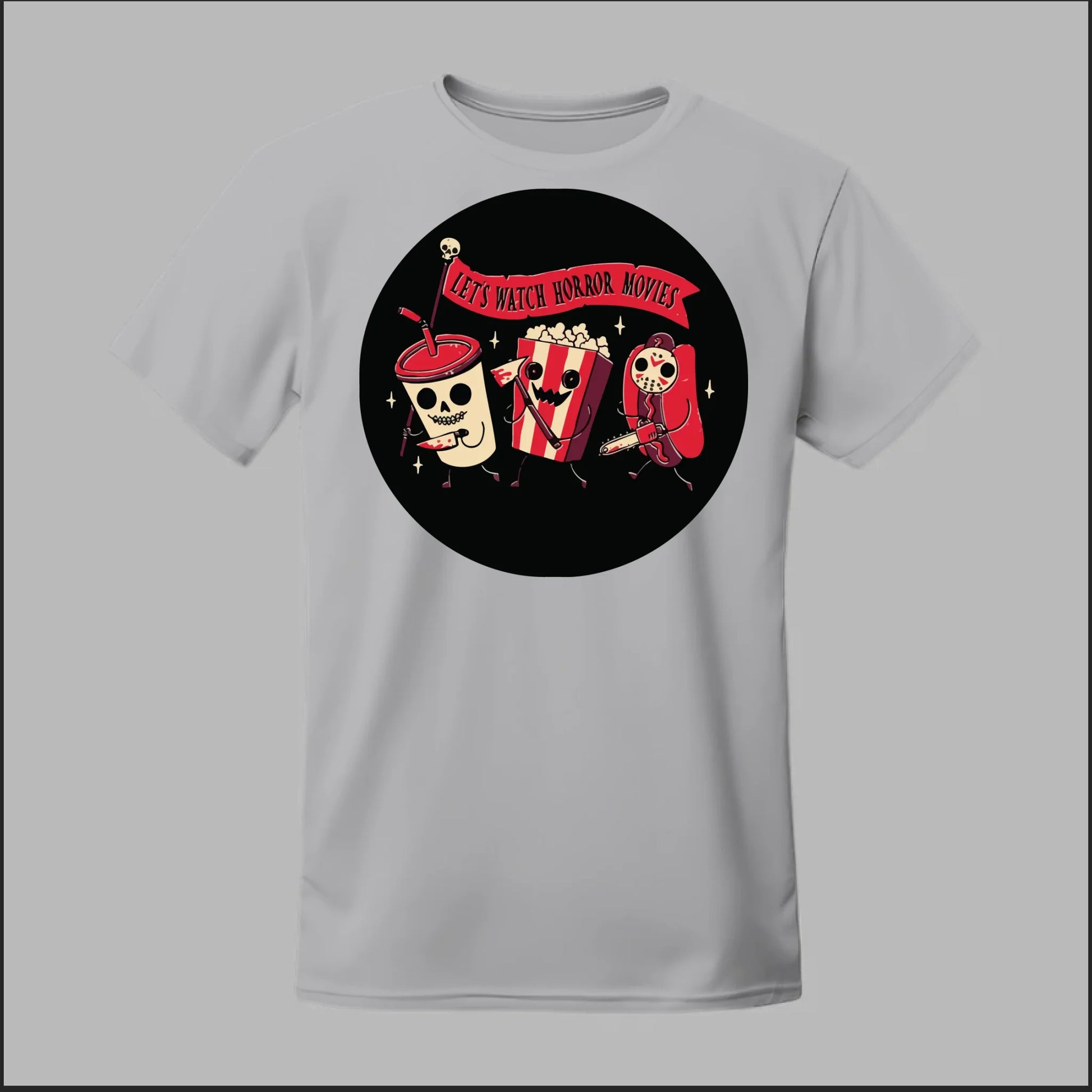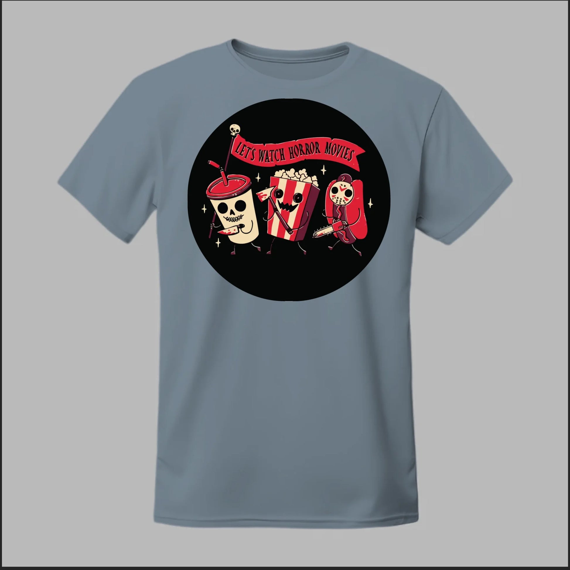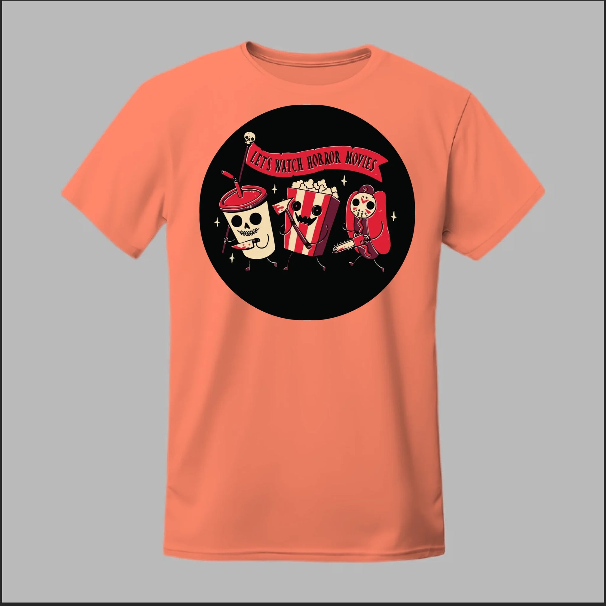 Grab your popcorn, soda, and hot dog—because it’s time for a horror movie marathon! Our Let’s Watch Horror Movies is perfect for anyone who loves spooky flicks and slasher vibes. Fun cartoon design featuring creepy popcorn, soda, and hotdog characters. Perfect for horror fans, Halloween parties, or scary movie nights.