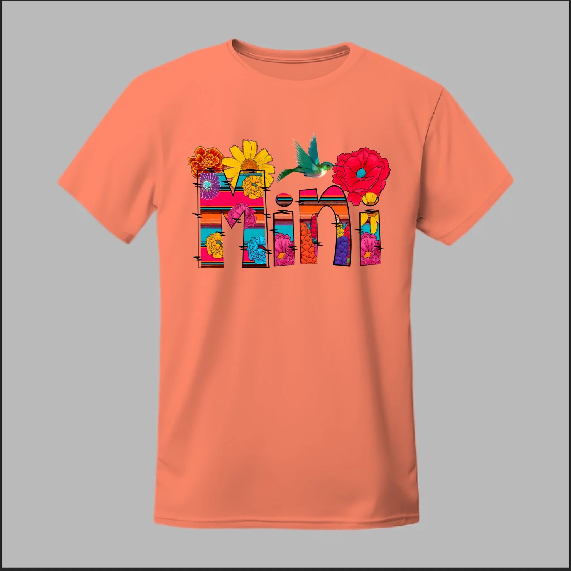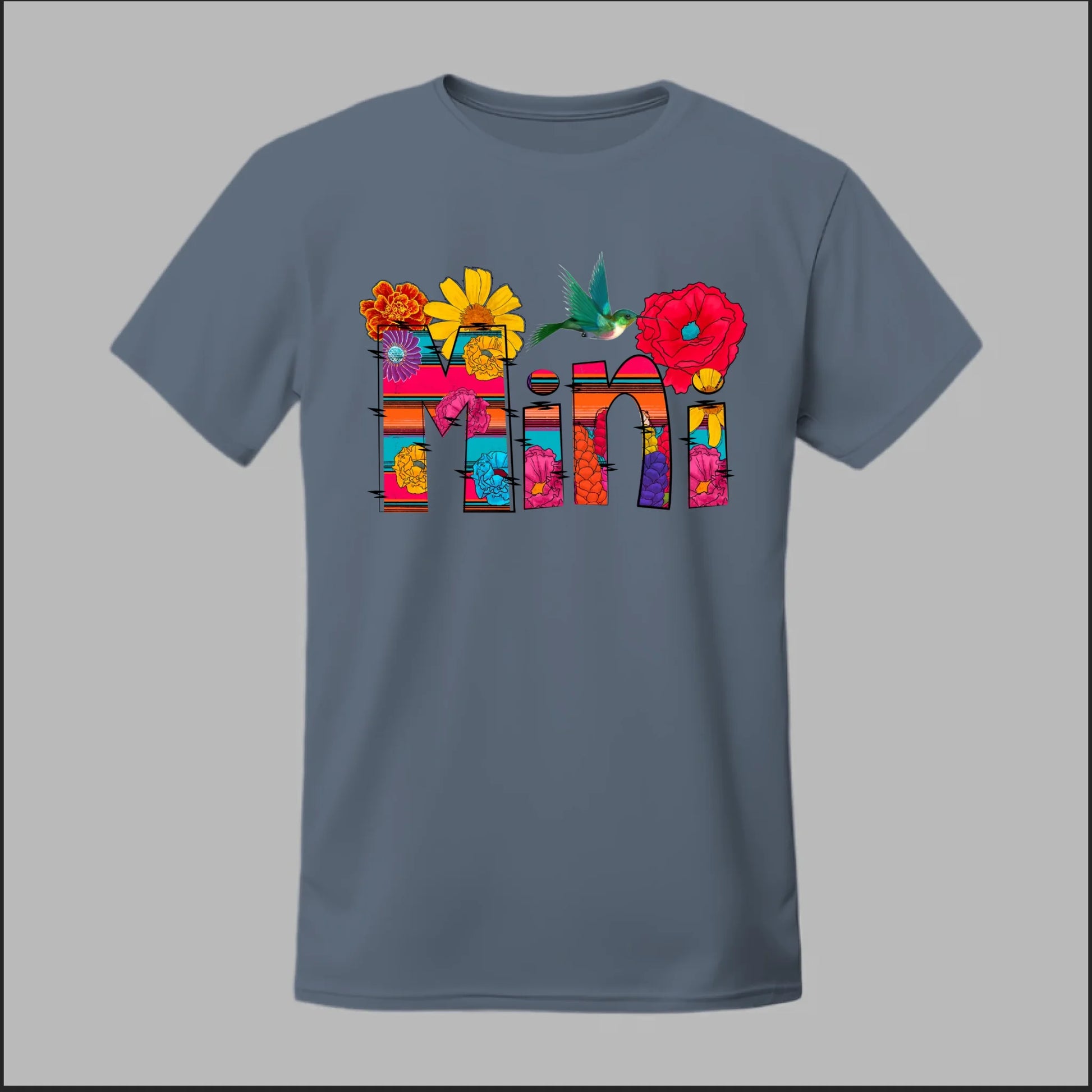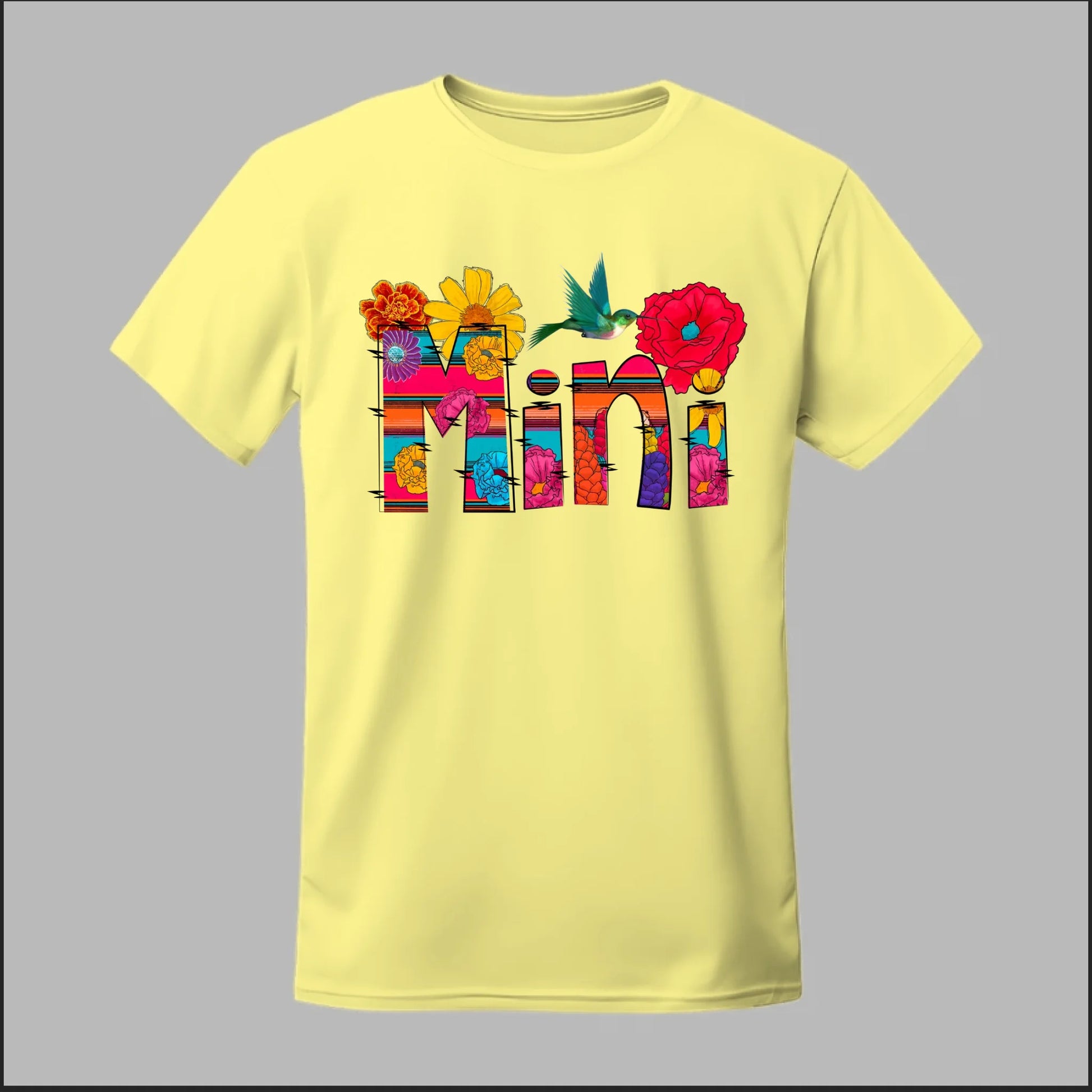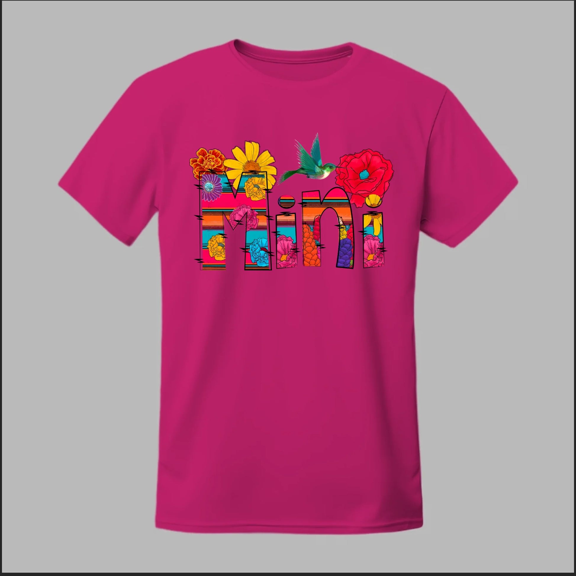 Celebrate culture and color with the Mini Serape Bloom Tee! This playful design features the word "Mini" decorated in bold serape stripes, vibrant florals, and a sweet hummingbird touch, making it a standout for little ones or those with big personality in a small package. Perfect for family matching sets or anyone who loves a burst of Mexican-inspired style.