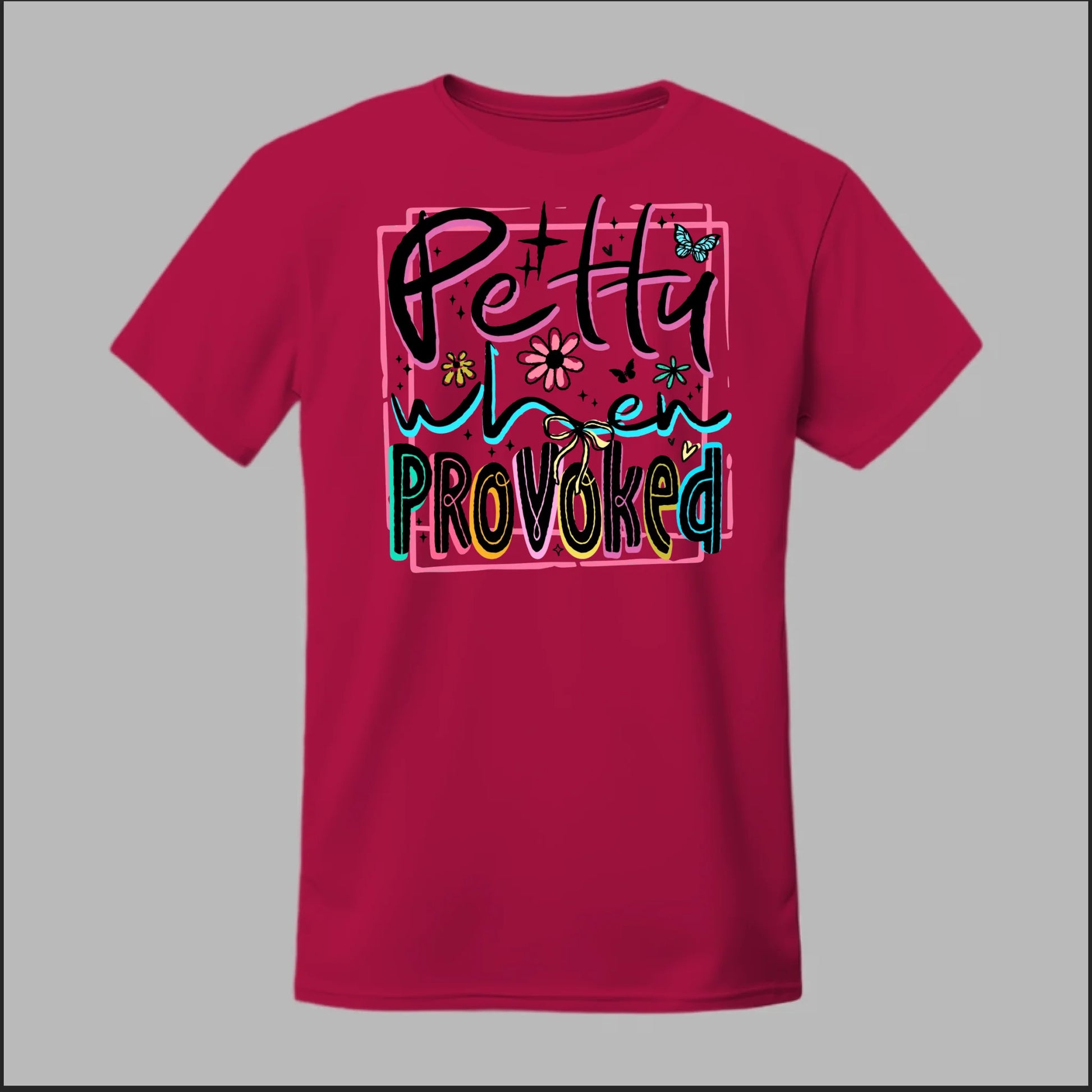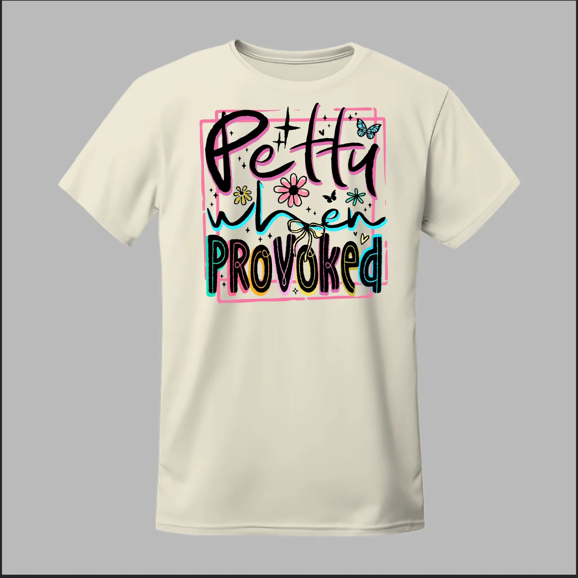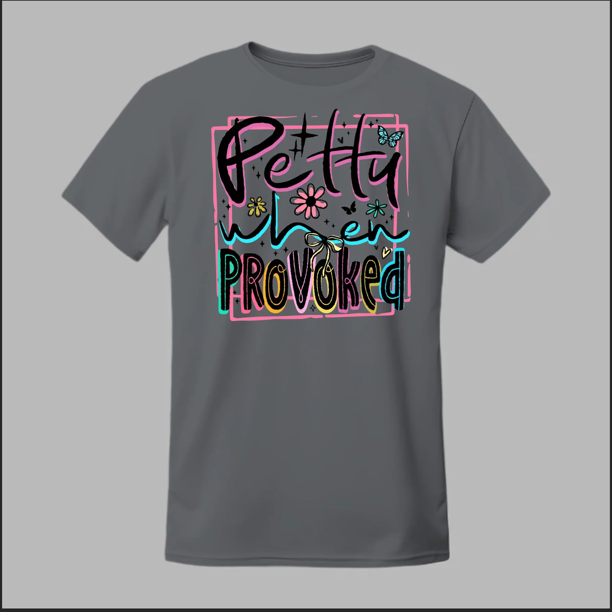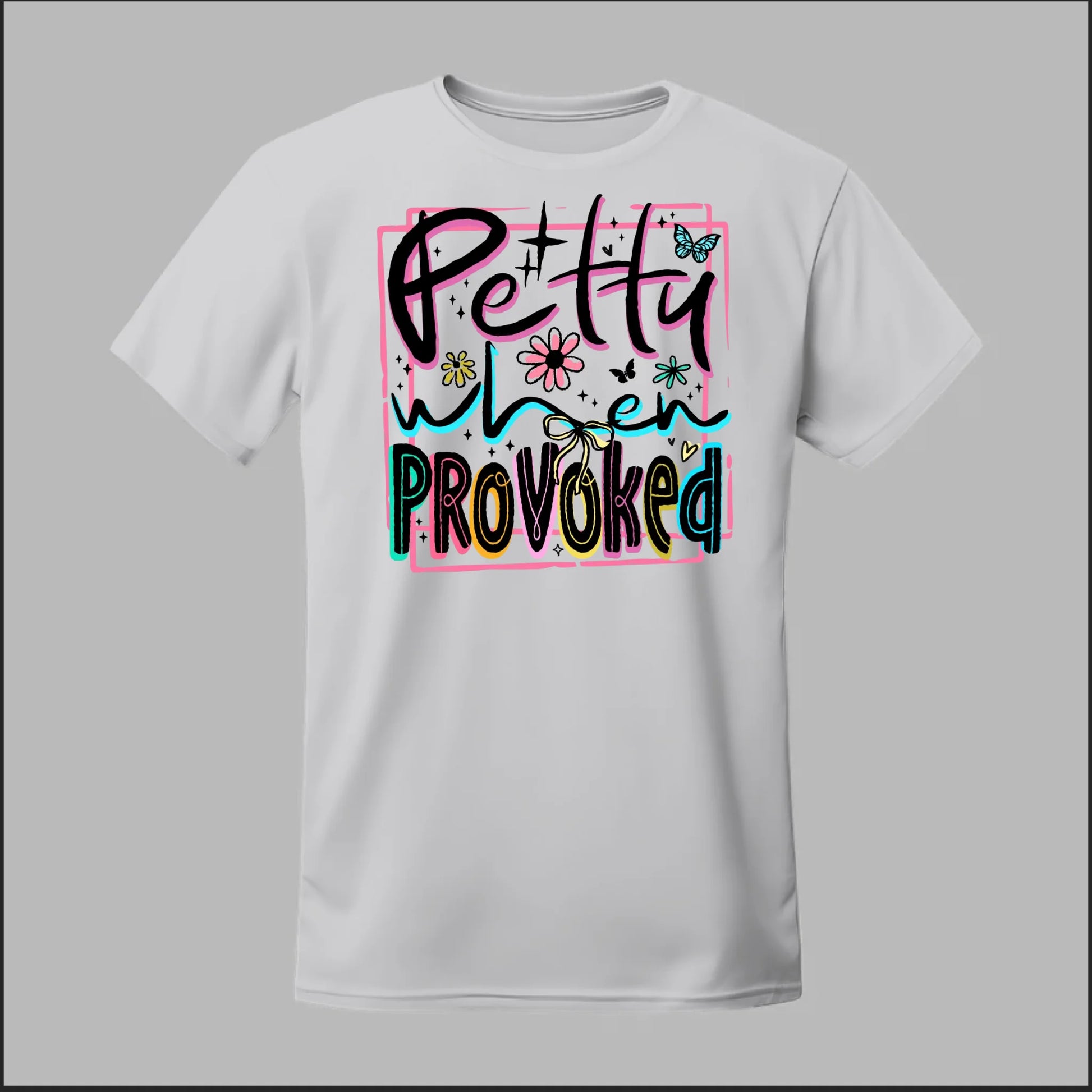 Turn sass into style with our Petty When Provoked tee. Featuring bold neon-inspired lettering with playful accents of flowers, butterflies, and bows, this shirt brings just the right mix of cute and feisty. Perfect for when you want to let the world know you can be sweet—but you’ve got a sharp edge when pushed too far.
