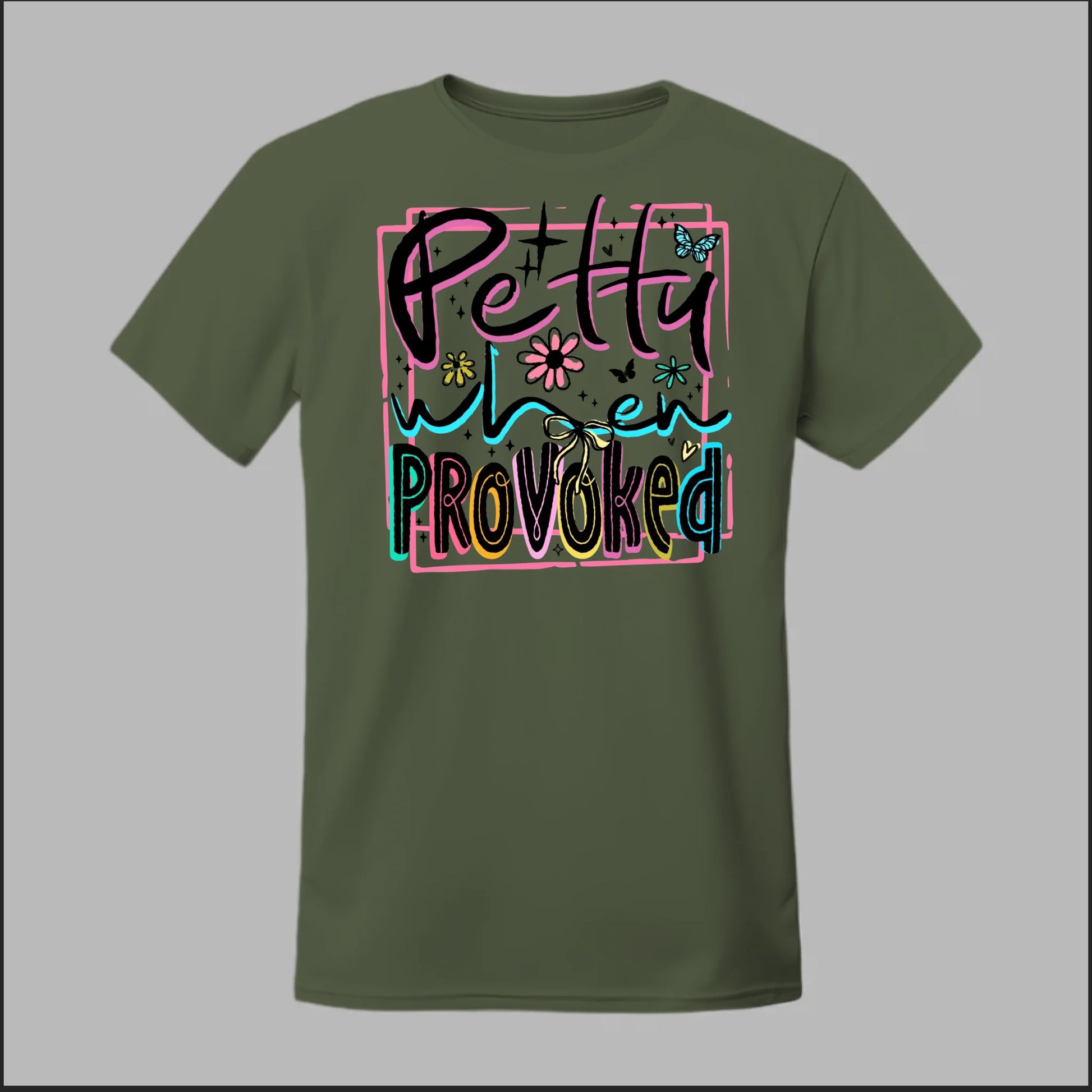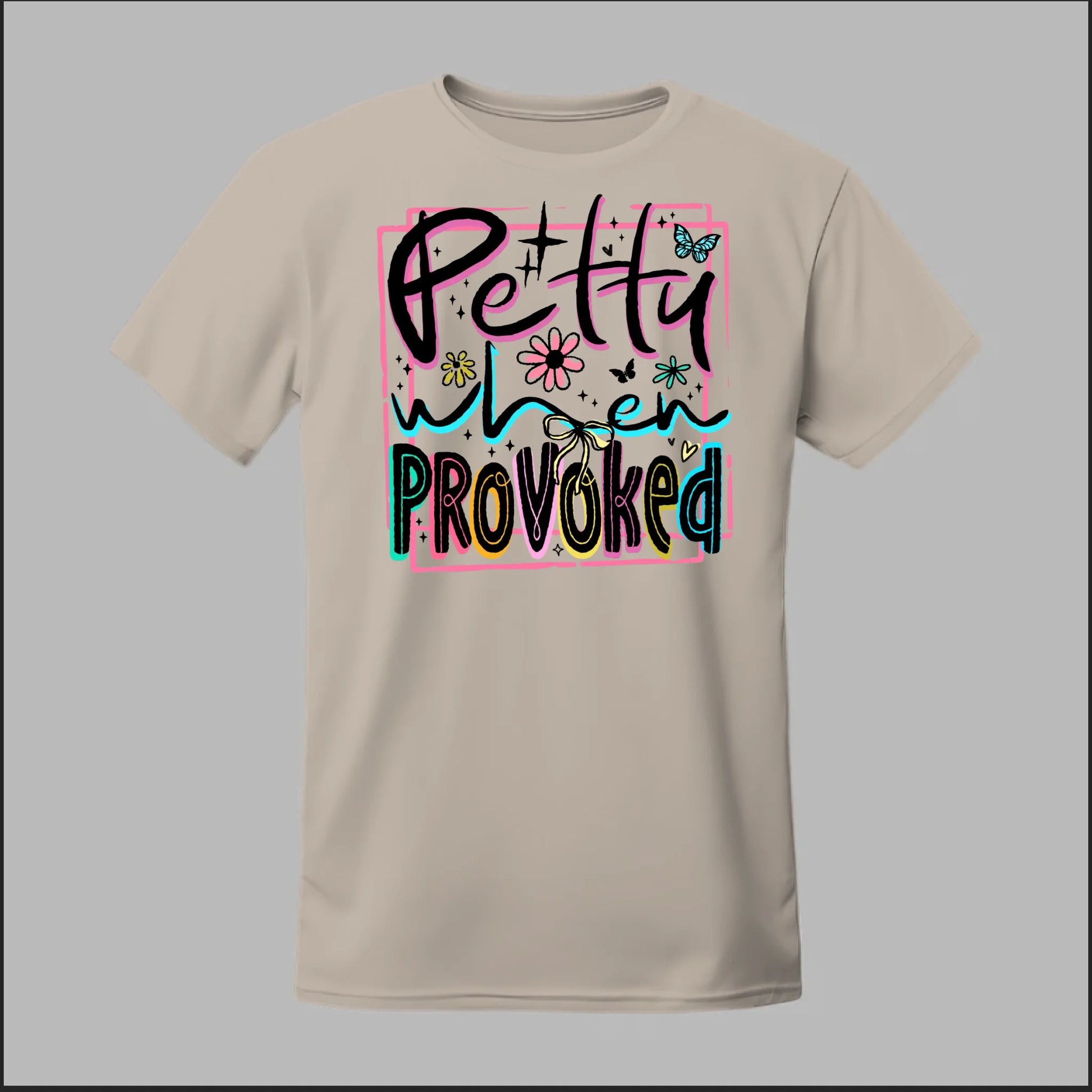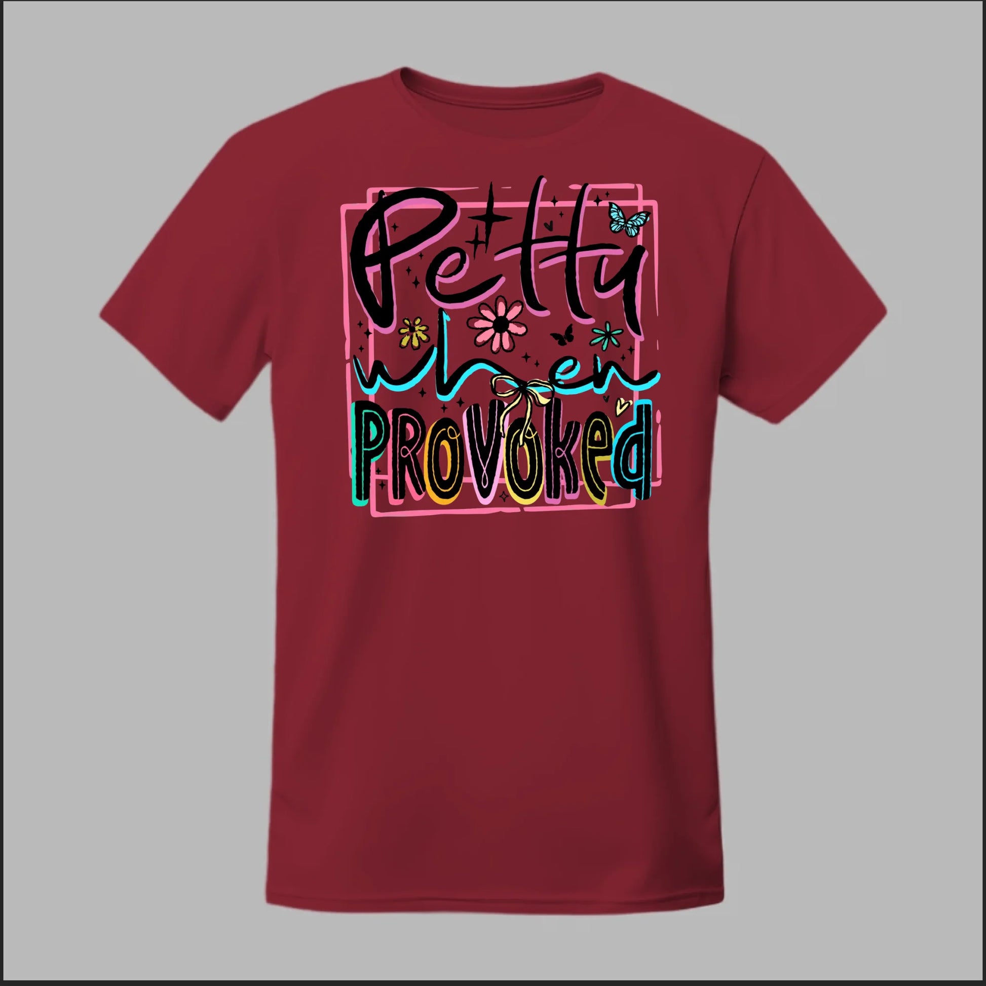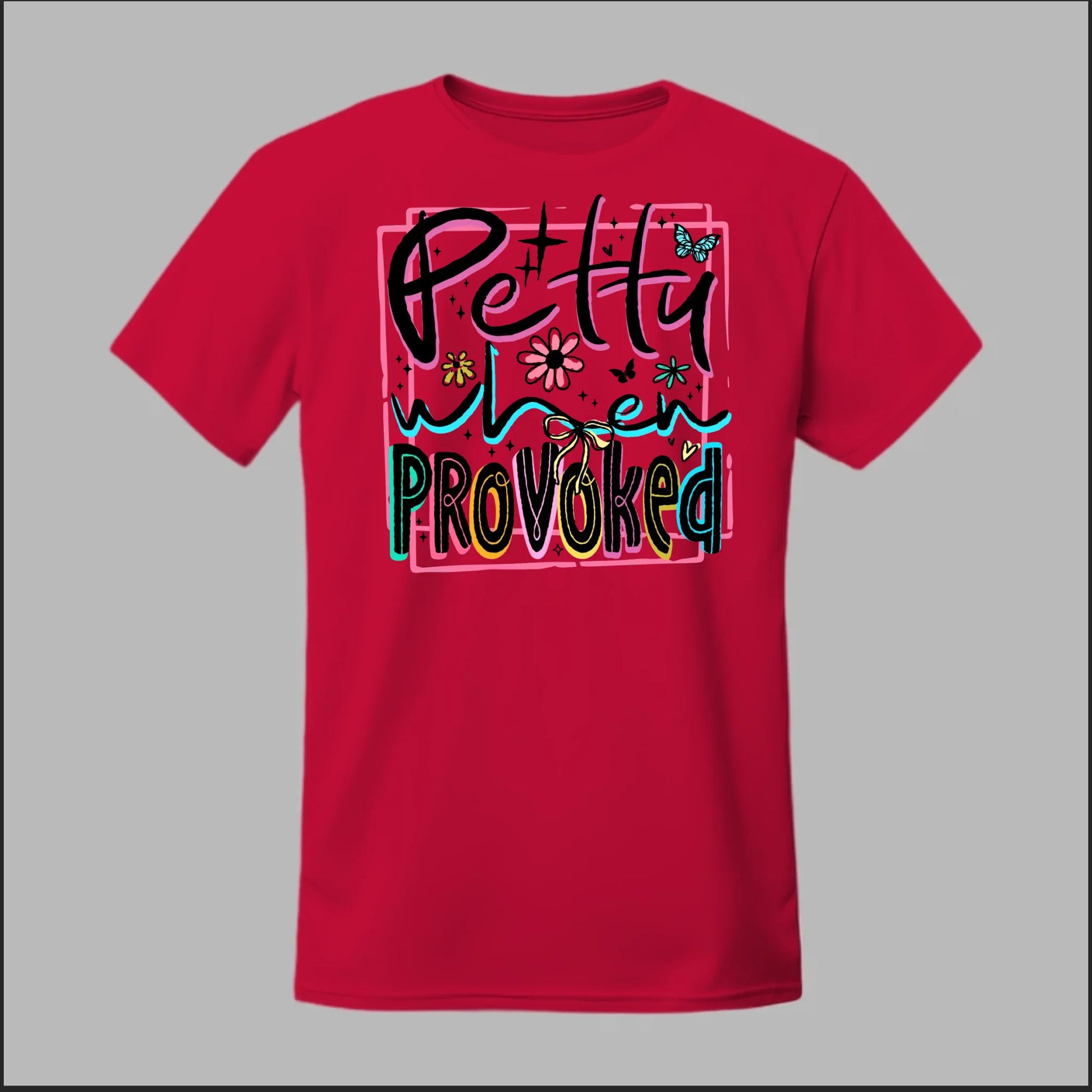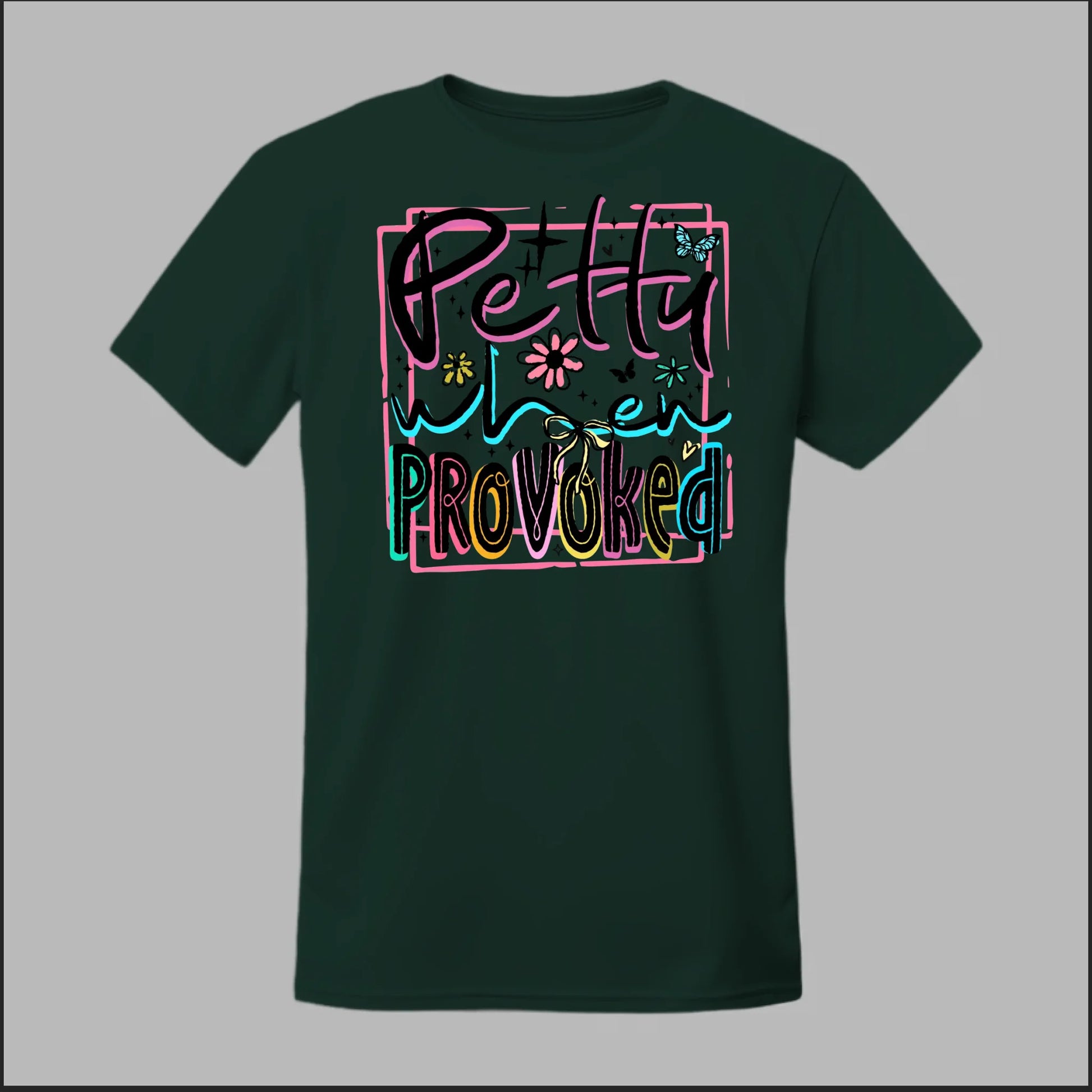 Turn sass into style with our Petty When Provoked tee. Featuring bold neon-inspired lettering with playful accents of flowers, butterflies, and bows, this shirt brings just the right mix of cute and feisty. Perfect for when you want to let the world know you can be sweet—but you’ve got a sharp edge when pushed too far.